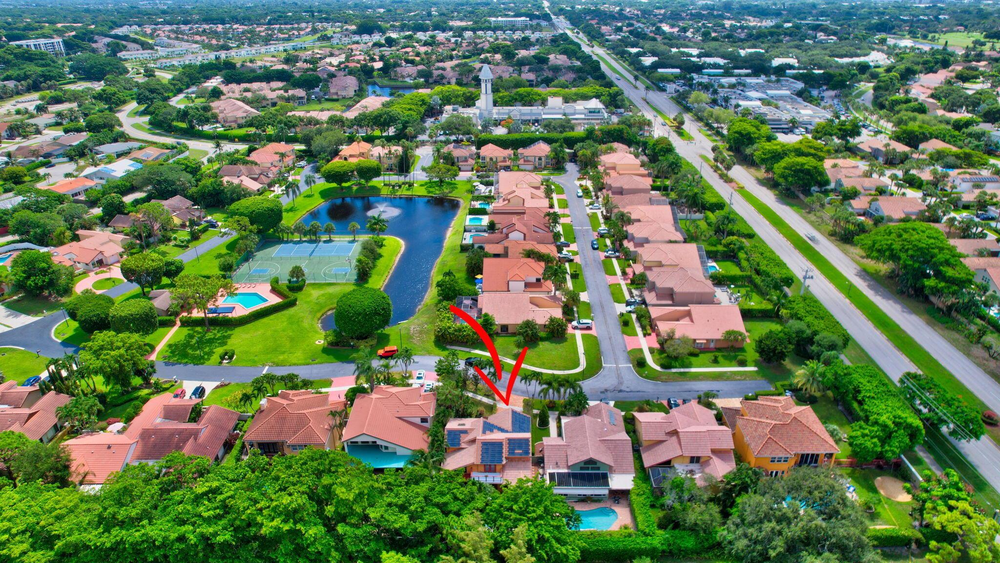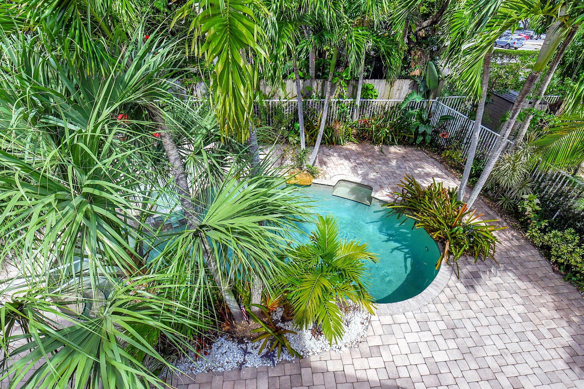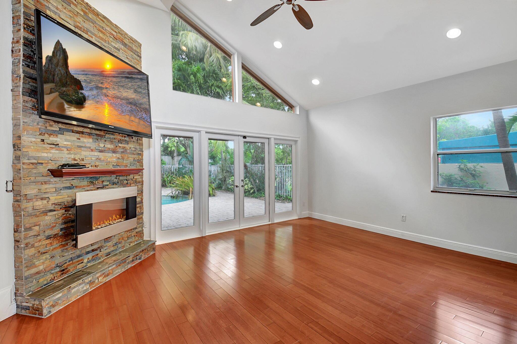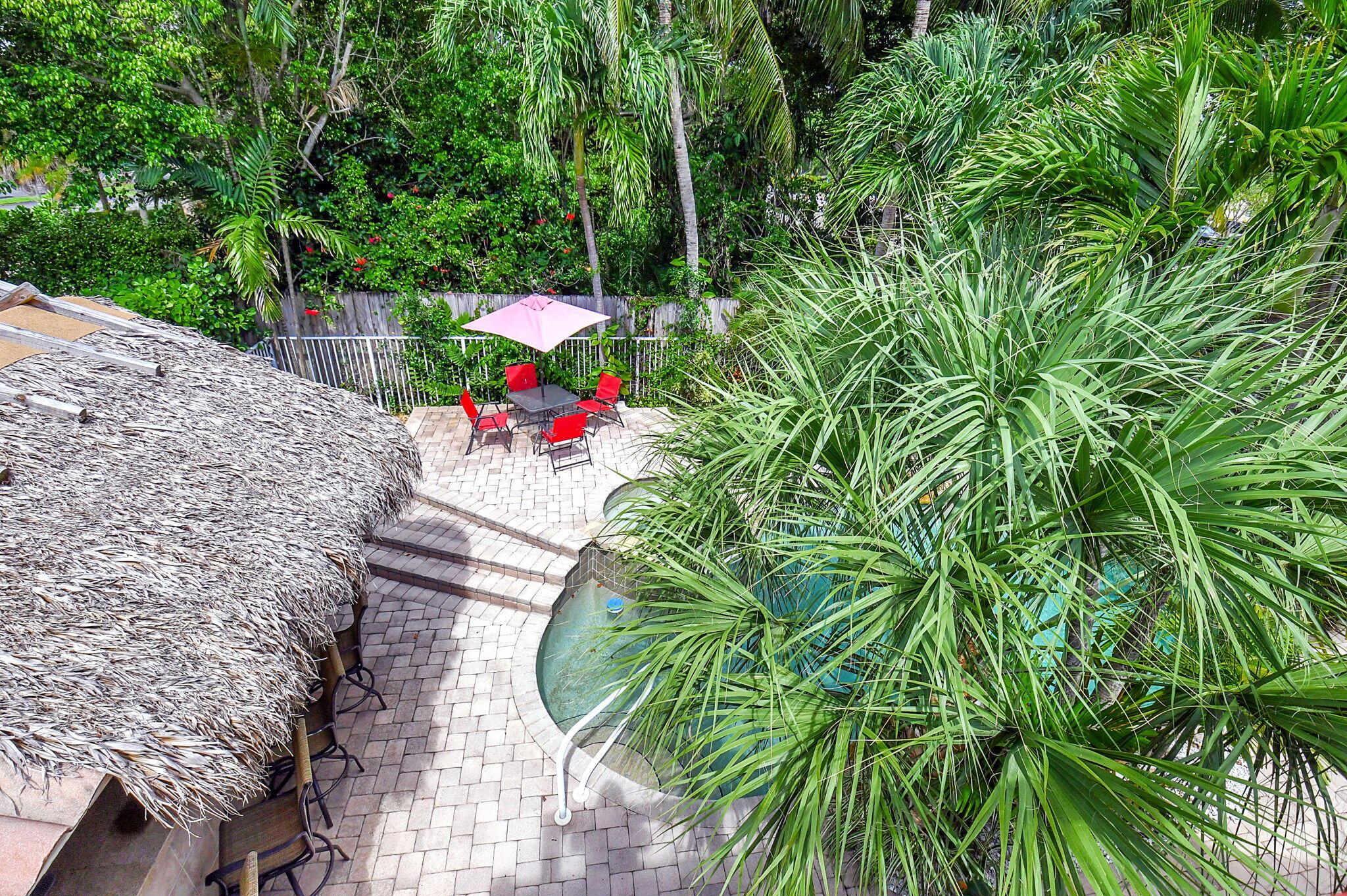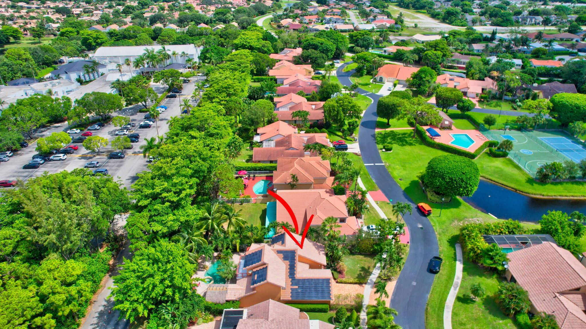 Fantastic home in a prime location! Features include Chicago brick driveway, tropical landscape, S Tile roof (2015), 2 A/C units (2016/17) Certainteed Residential Solar Tiles, large front yard, vaulted ceilings, tile and bamboo floors, fresh paint, stone fireplace with electric insert, kitchen cabinets were professionally painted, GE monogram refrigerator, Jenn Air double ovens, built in wine fridge, decorative glass cabinets, open floorplan with a ton of space, great for entertaining, Good size primary bedroom with large bathroom, walk in closet, and a balcony. The back yard is a tropical paradise with a kidney shaped pool with tropical landscape, pavers, tiki bar, pool and spa are heated. All of this within walking distance to shops, restaurants, and place of worship.