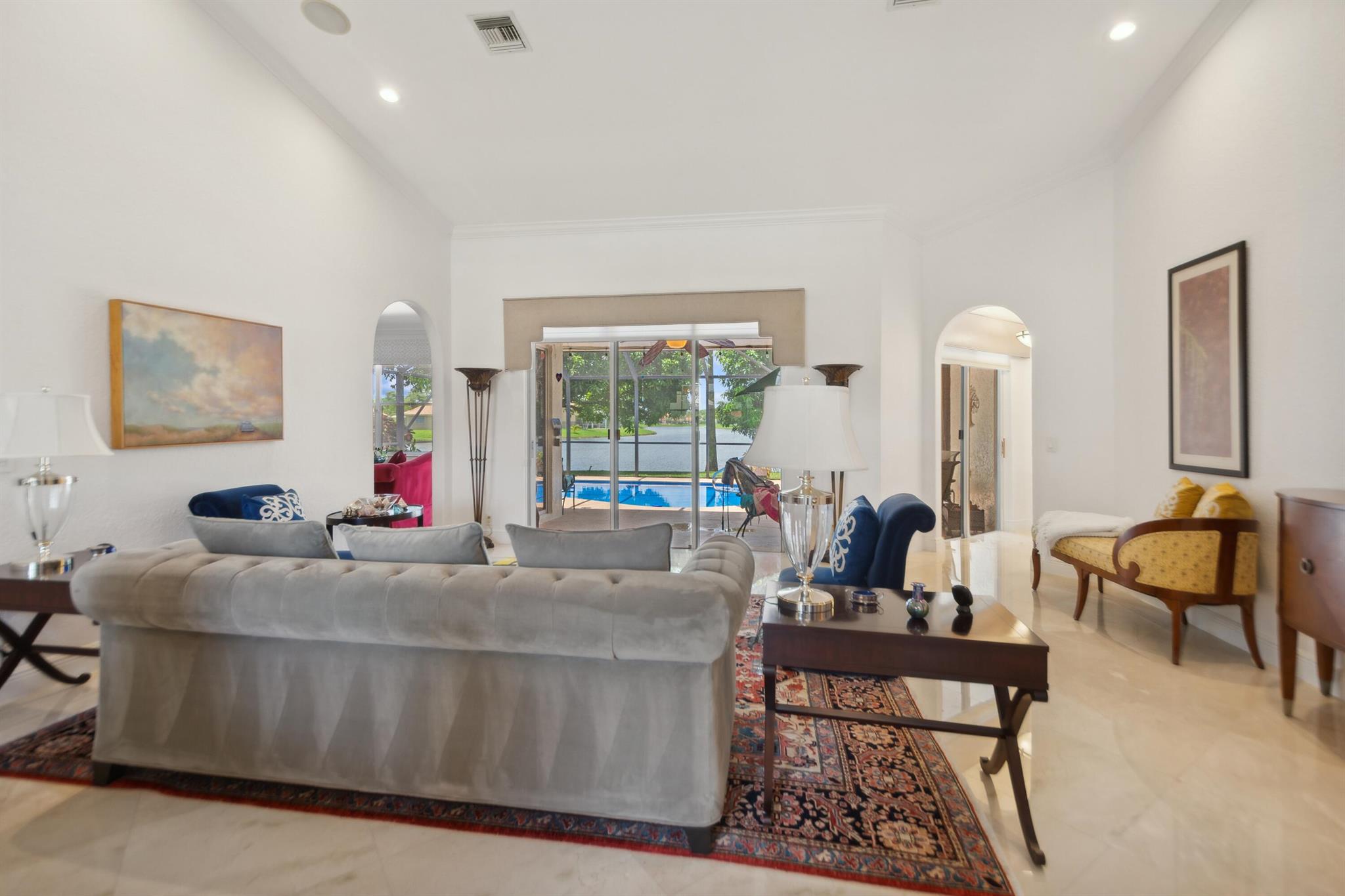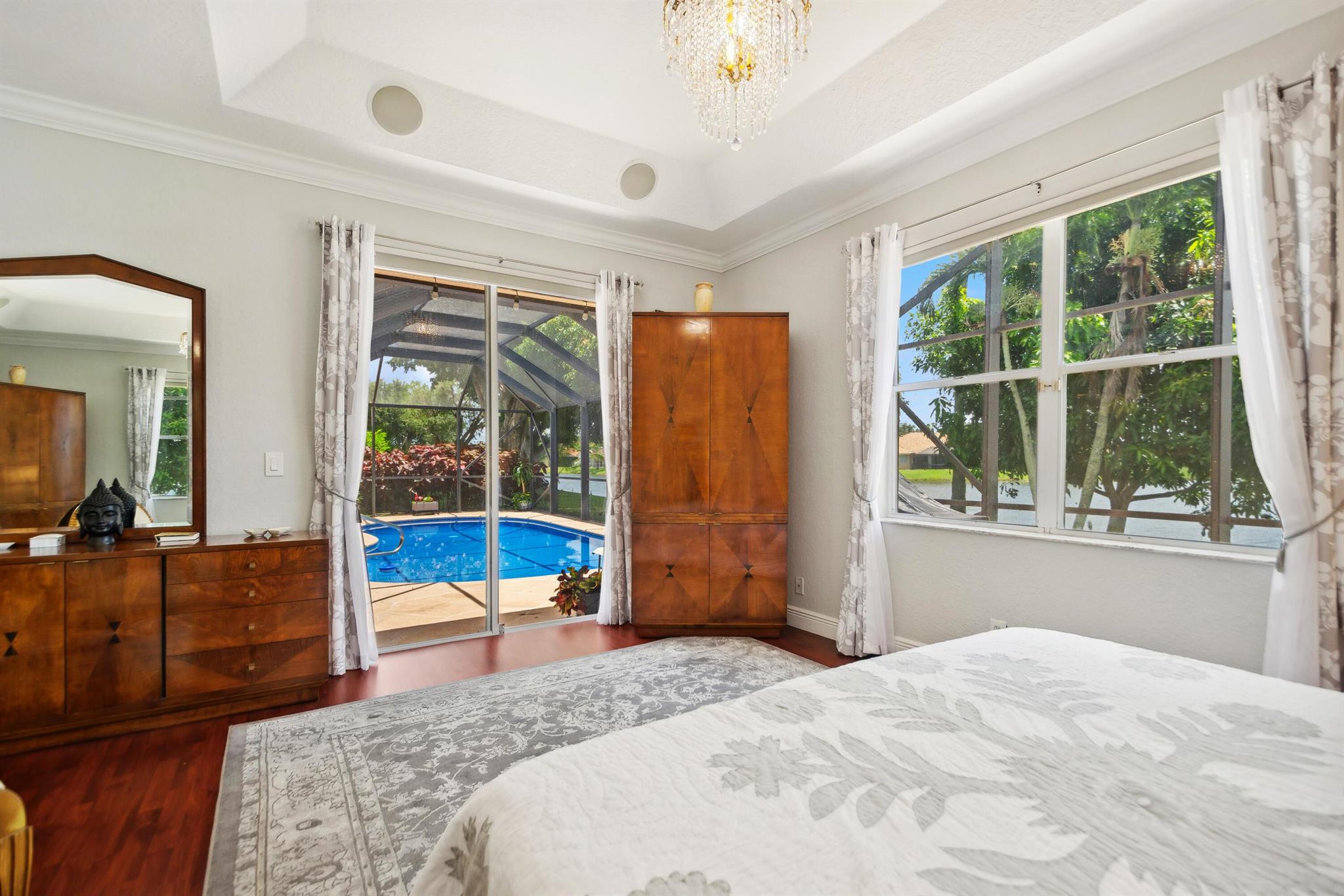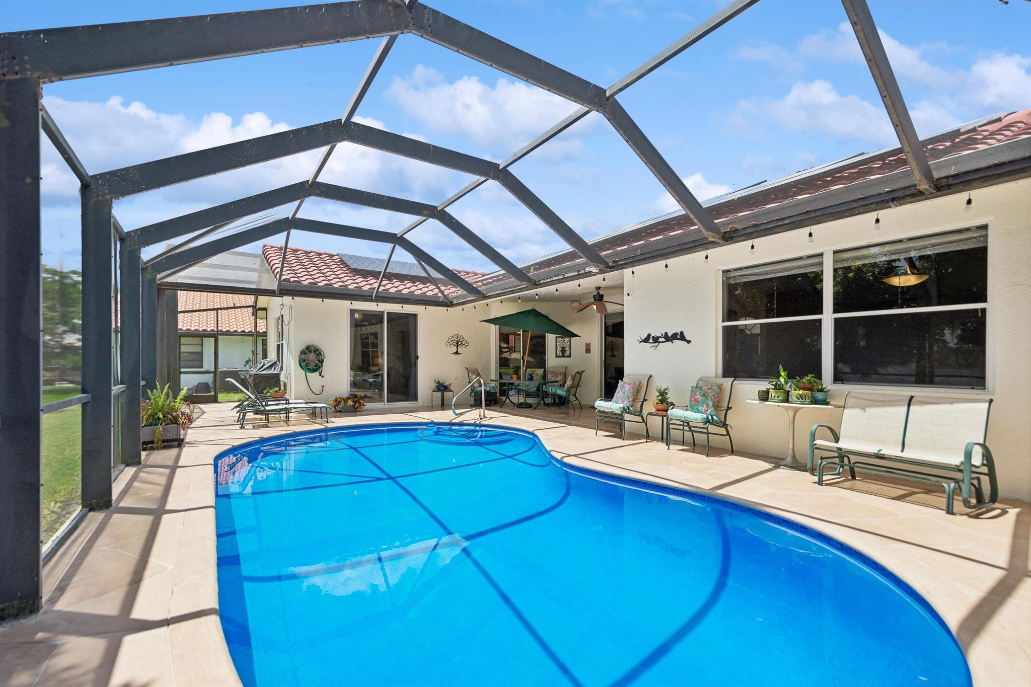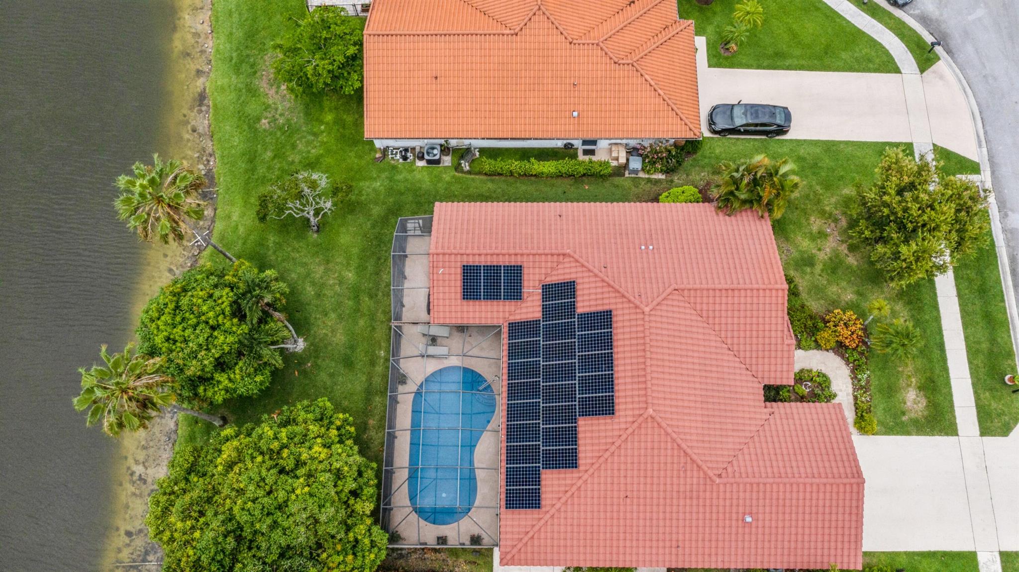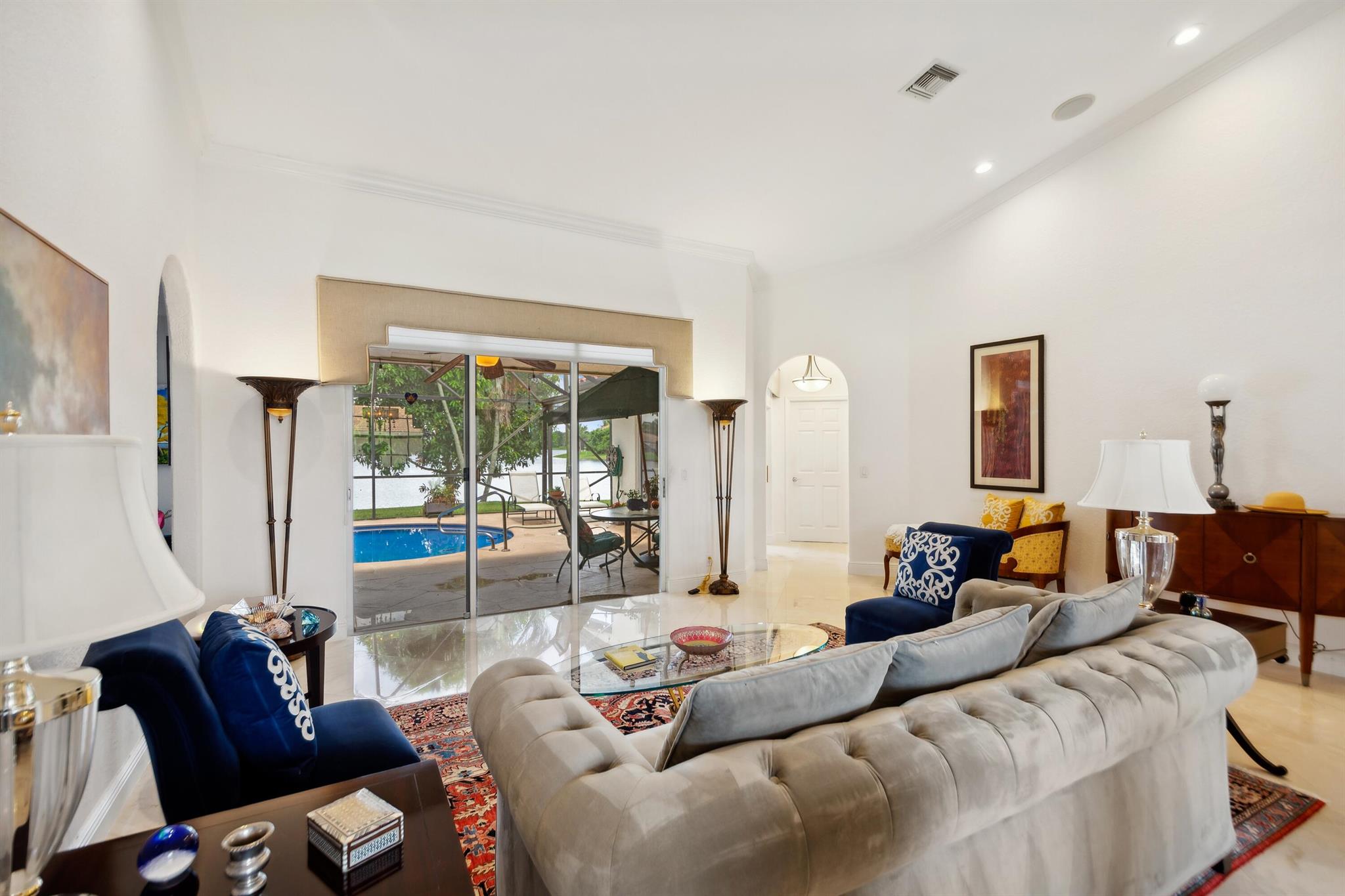 Discover luxury in this one-story, 4 bed, 2.5 bath pool home on nearly 1/4 acre, offering panoramic long lake views from the master bedroom and many other rooms. The custom kitchen features wood cabinetry, granite countertops, and Bosch appliances, complemented by elegant 24×24 marble floors. Enjoy the comfort of two newer A/C units and hydrotherapy showers. This home also boasts ample storage, a new pool liner, resurfaced pool deck, and Rhino-protected windows. Make this exceptional home yours today. Solar Panels are $185 monthly plus tax. Chandelier in Bedroom and Tiffany light in Hallway do not convey.Seller will make Concessions towards solar panels and roof with an acceptable offer. Opportunity to purchase below appraised Value (870K)Easy to Finance.