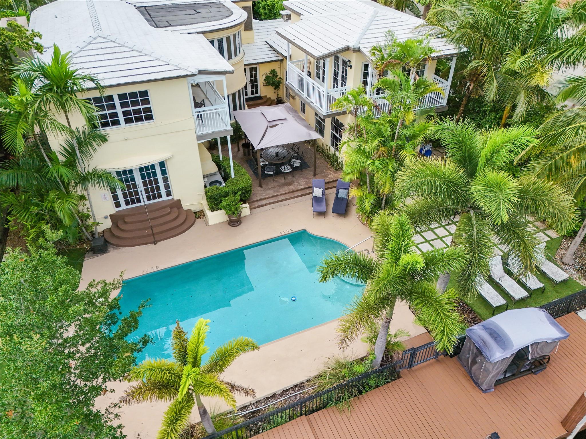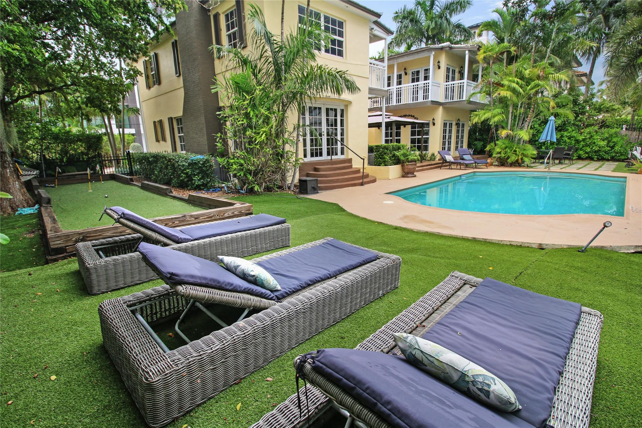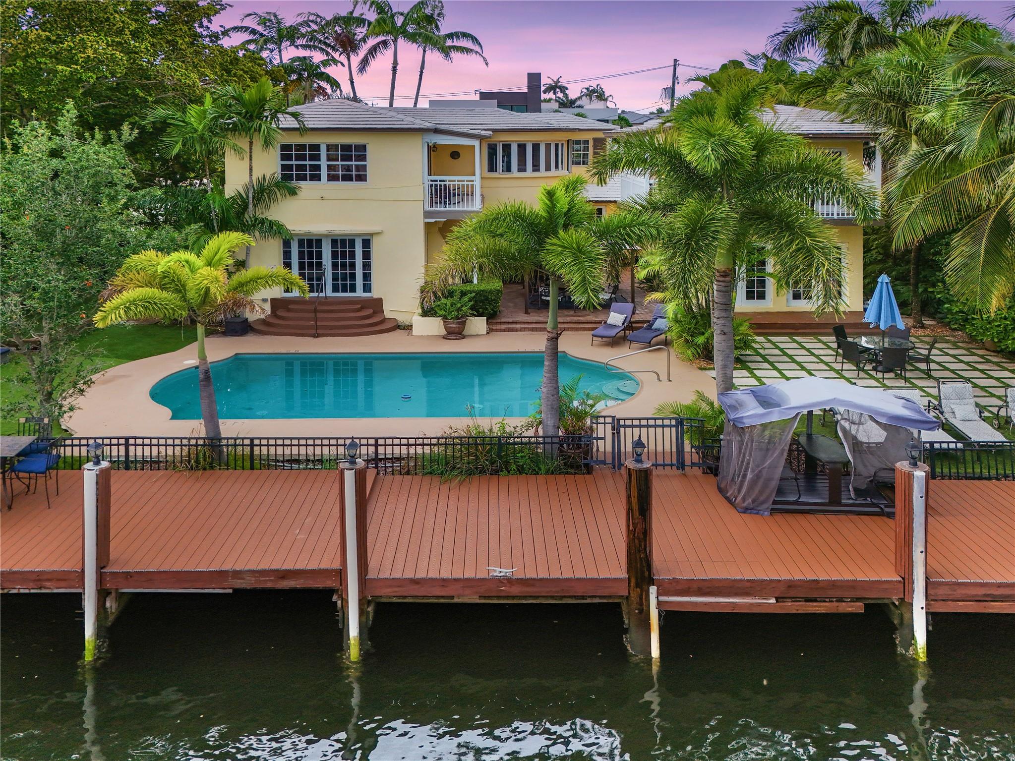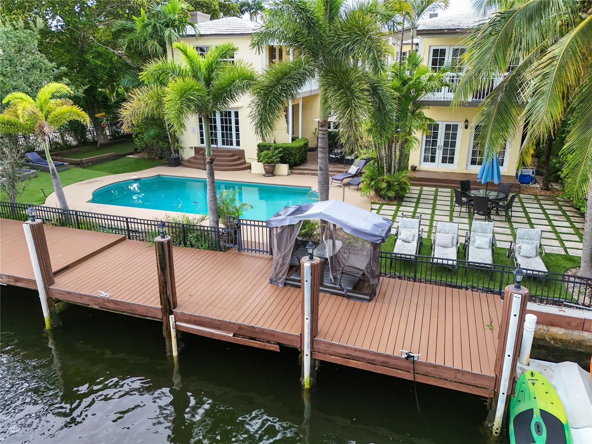 Two story elegant waterfront home, with exceptional indoor/outdoor amenities. 6 bedroom, 5.5 bathrooms, on corner lot. 5 Bedrooms with full en-suite bathrooms. Beautiful hardwood floors throughout. Impact Glass windows and doors and shutters. Private backyard with pool and tropical paradise. 75′ Waterfront. The spacious design is perfect for entertaining, featuring a game room, outdoor patio, and turfed lounge area overlooking the serene waterfront setting. This property is currently a successful AirBnb and presents a unique opportunity for lucrative cash flow.