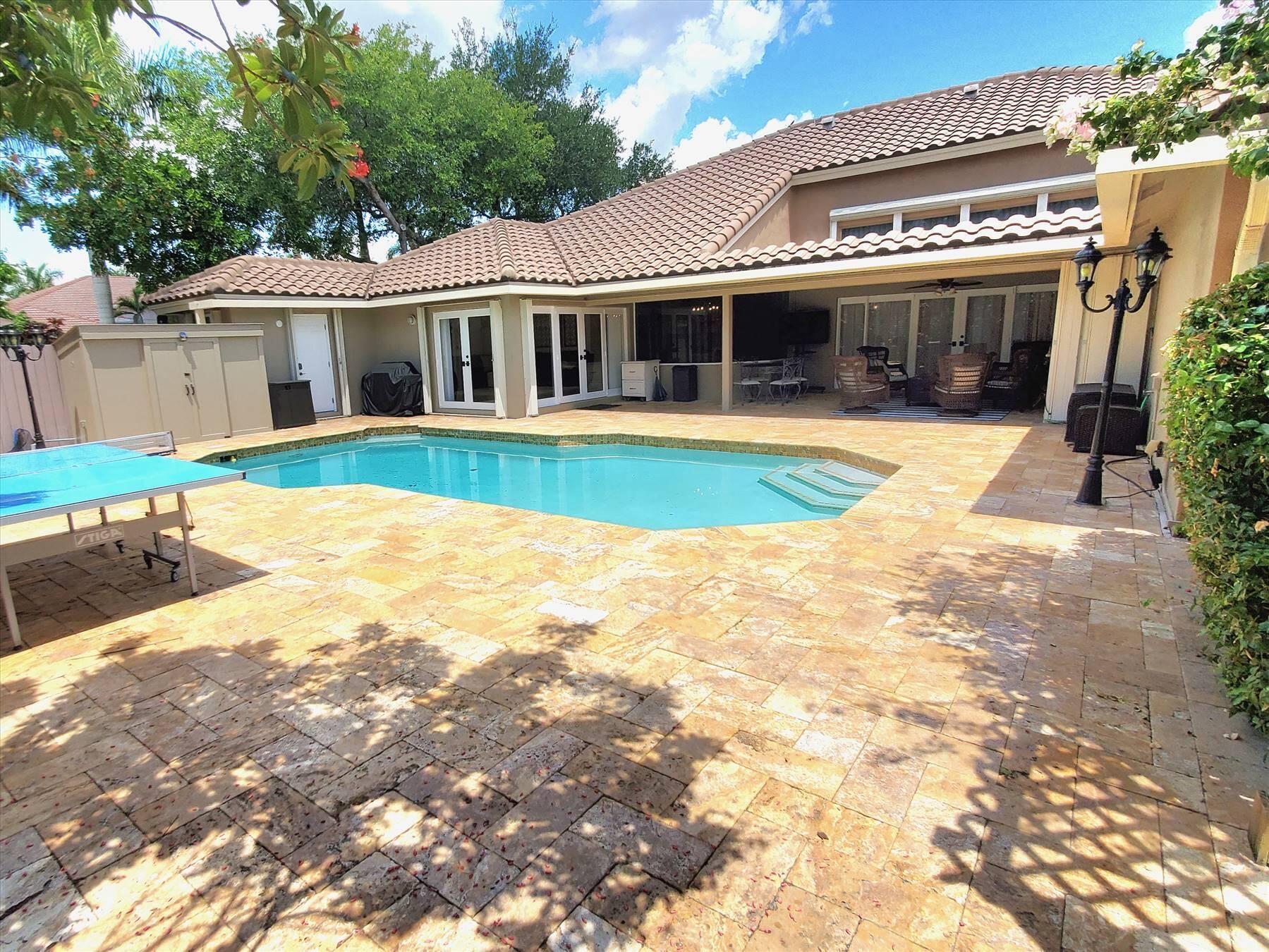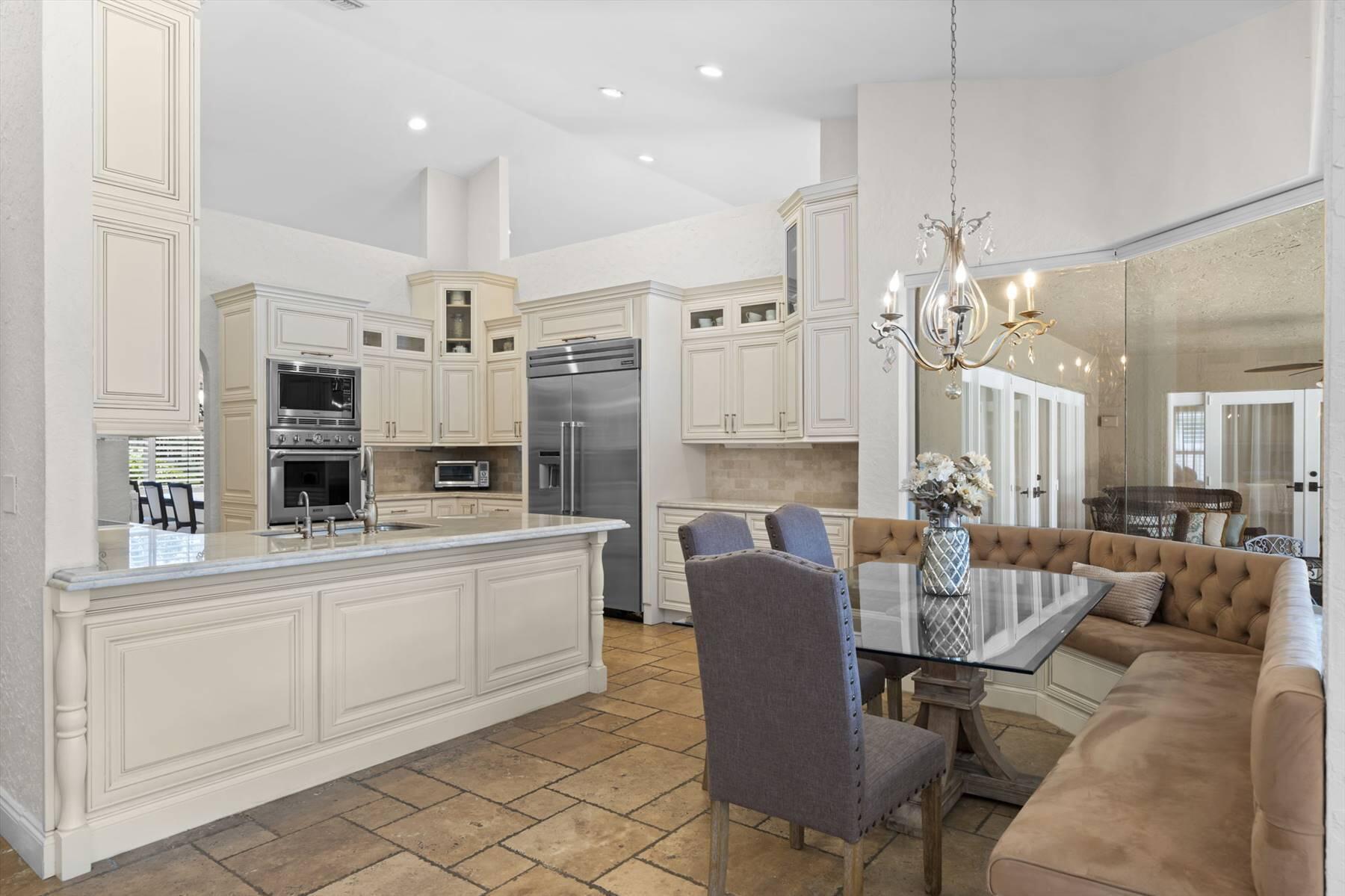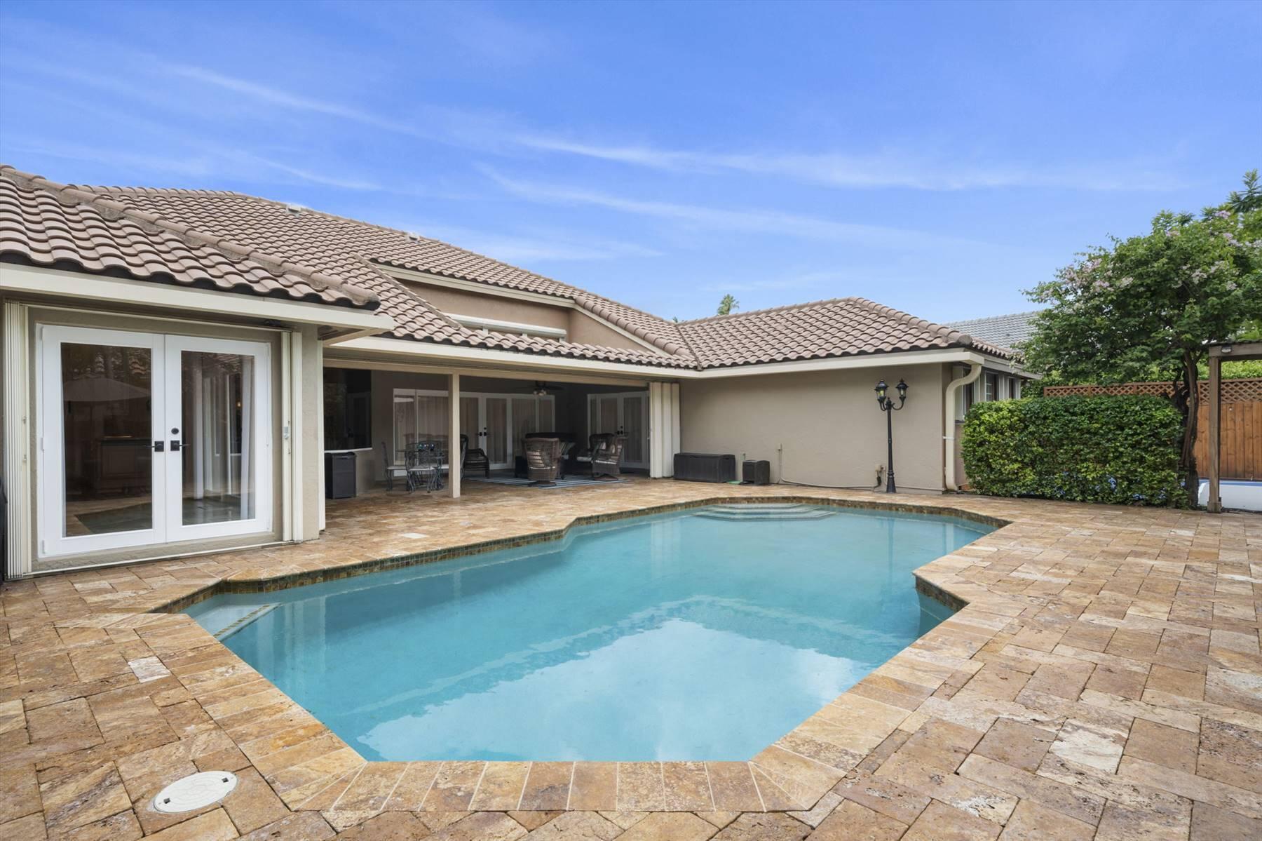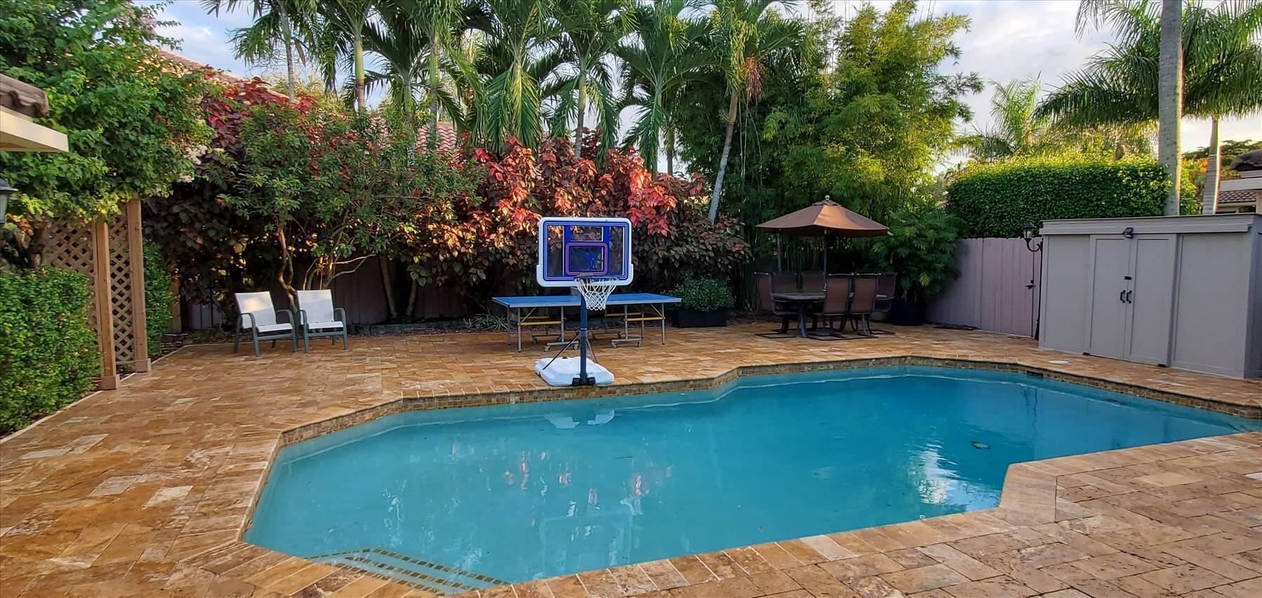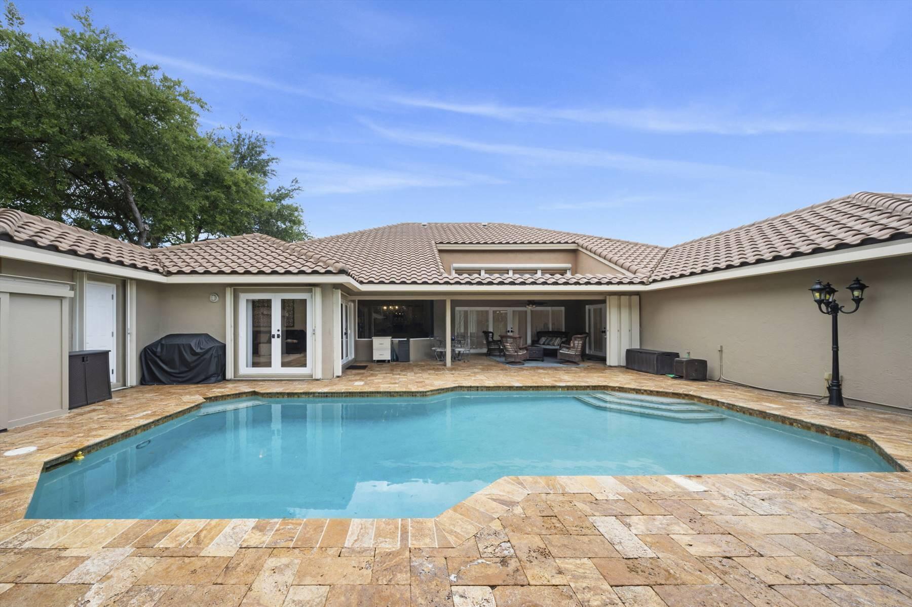 Luxurious 5BR 4BA single story residence in highly sought after Palm Island! This stunning, updated home sits on a large private corner lot with a fully fenced yard w/pool w/new salt system, new pool pump, newer travertine deck, a newly resurfaced basketball court, a dog run and generous covered patio, perfect for outdoor entertaining. Newly painted French doors and walls, exquisite travertine marble flooring in living areas, gorgeous high-end eat-in kitchen w/bench seating, upgraded solid wood cabinetry, stainless steel Thermador appliances, quartzite countertops and generous walk-in pantry. The primary bathroom has marble flooring and a large shower w/endless hot water from new tankless systems. Cabana bathroom, tons of storage throughout w/ closet organizers and easy access attic.