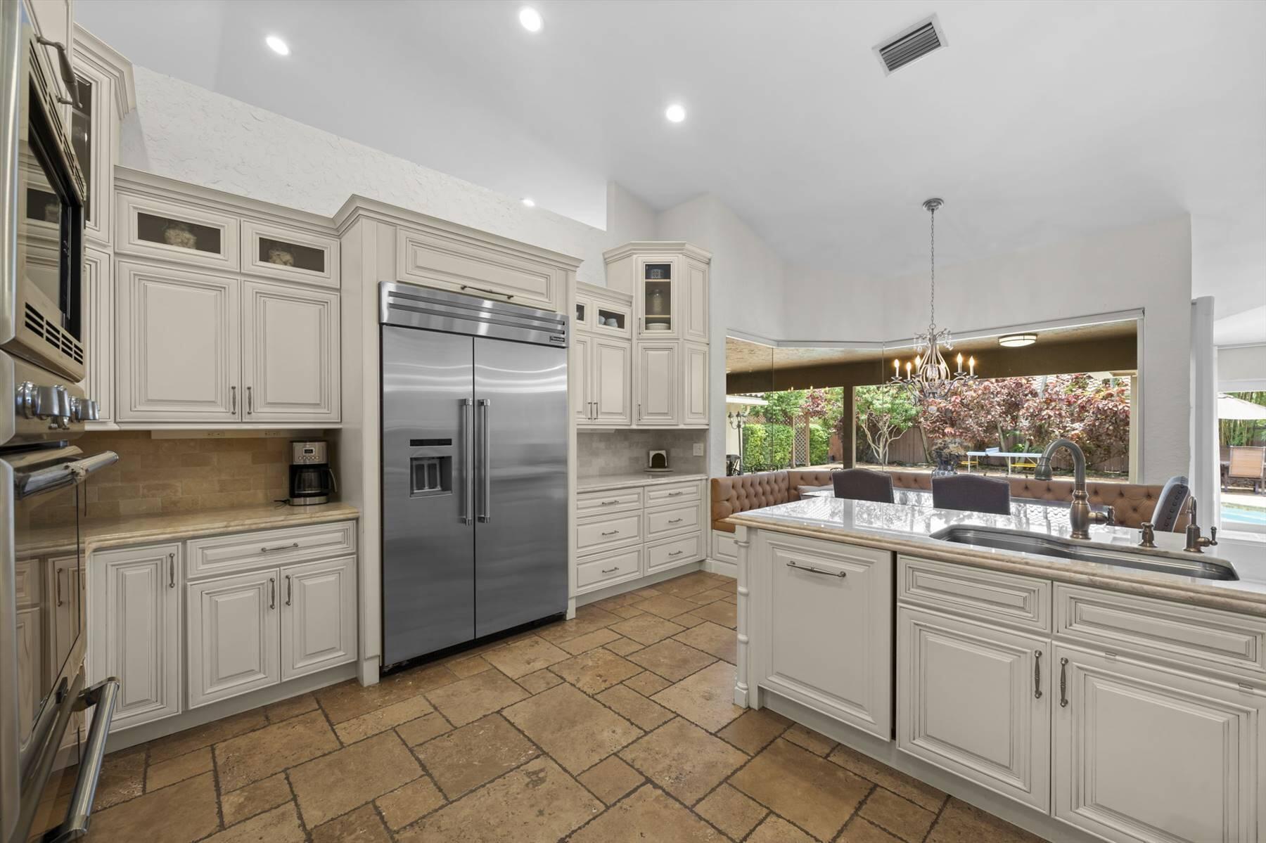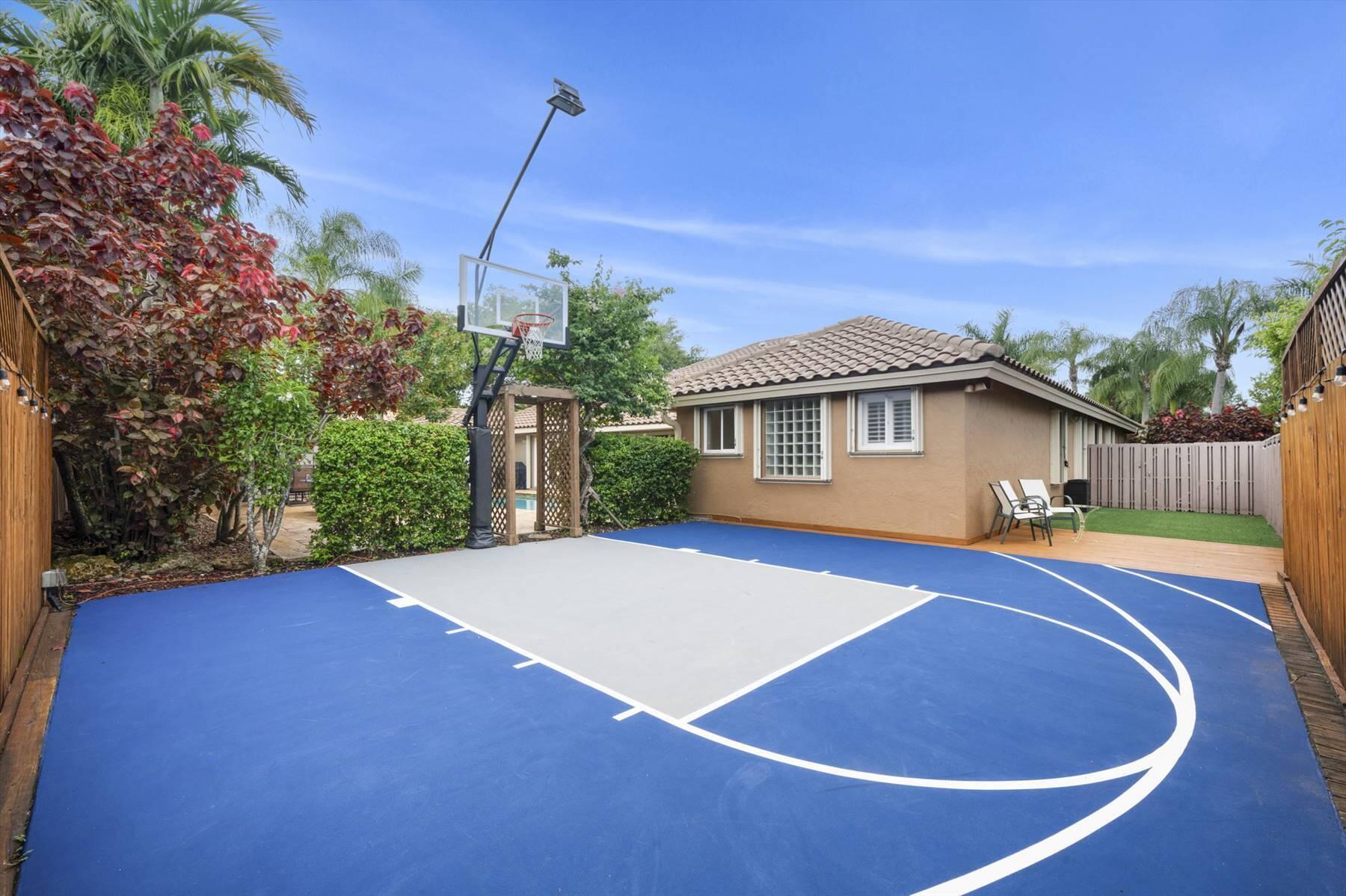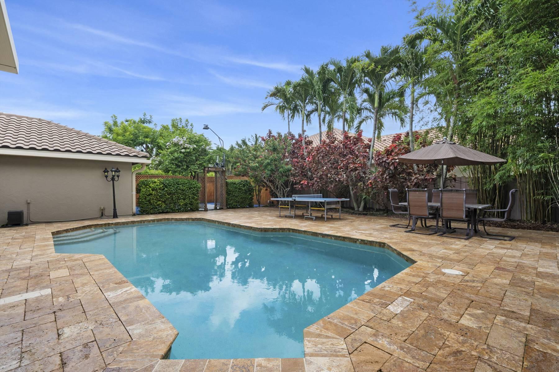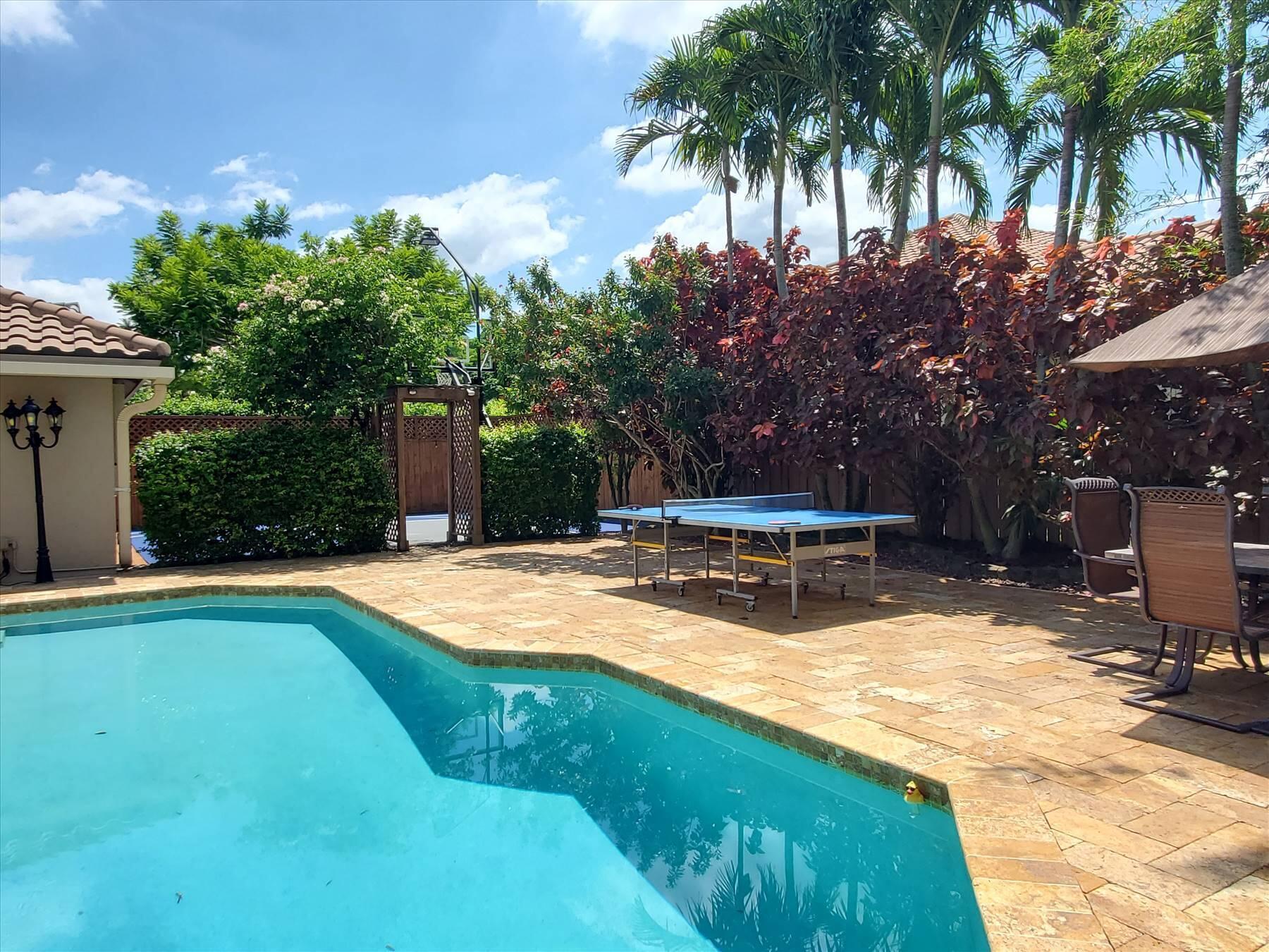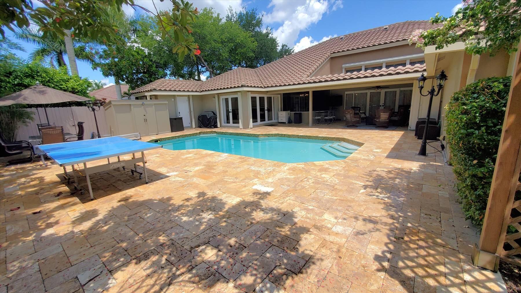 Luxurious 5BR 4BA single story residence in highly sought after Palm Island! This stunning, updated home sits on a large private corner lot with a fully fenced yard w/pool w/new salt system, new pool pump, newer travertine deck, a newly resurfaced basketball court, a dog run and generous covered patio, perfect for outdoor entertaining. Newly painted French doors and walls, exquisite travertine marble flooring in living areas, gorgeous high-end eat-in kitchen w/bench seating, upgraded solid wood cabinetry, stainless steel Thermador appliances, quartzite countertops and generous walk-in pantry. The primary bathroom has marble flooring and a large shower w/endless hot water from new tankless systems. Cabana bathroom, tons of storage throughout w/ closet organizers and easy access attic.