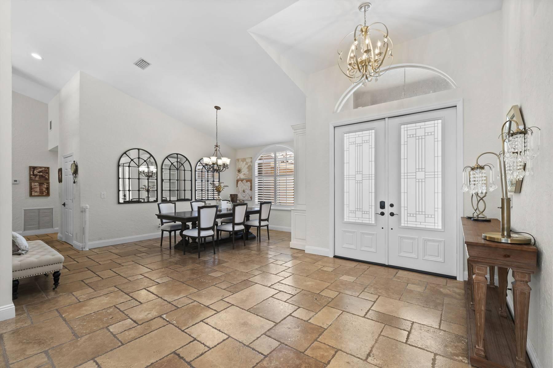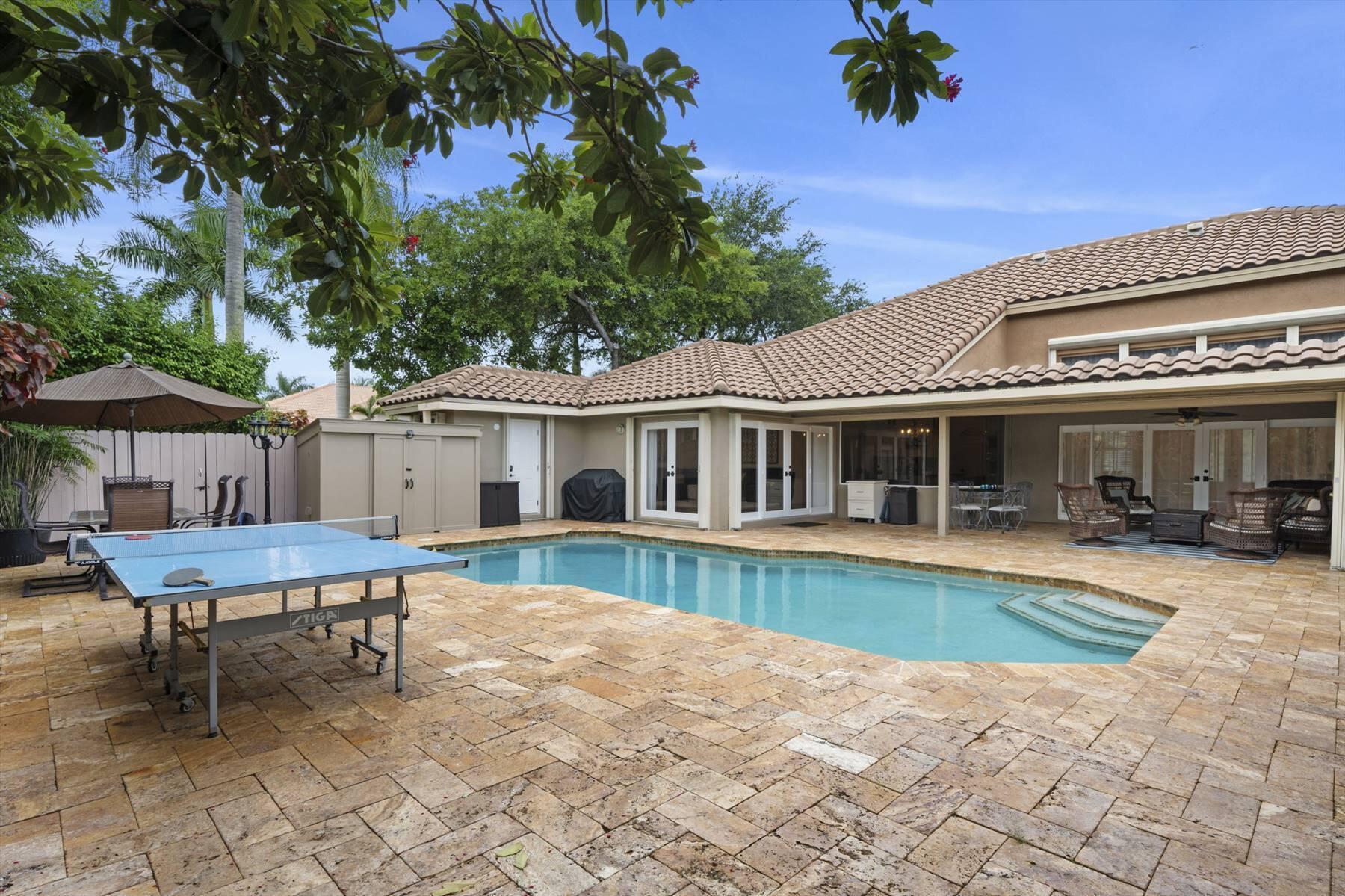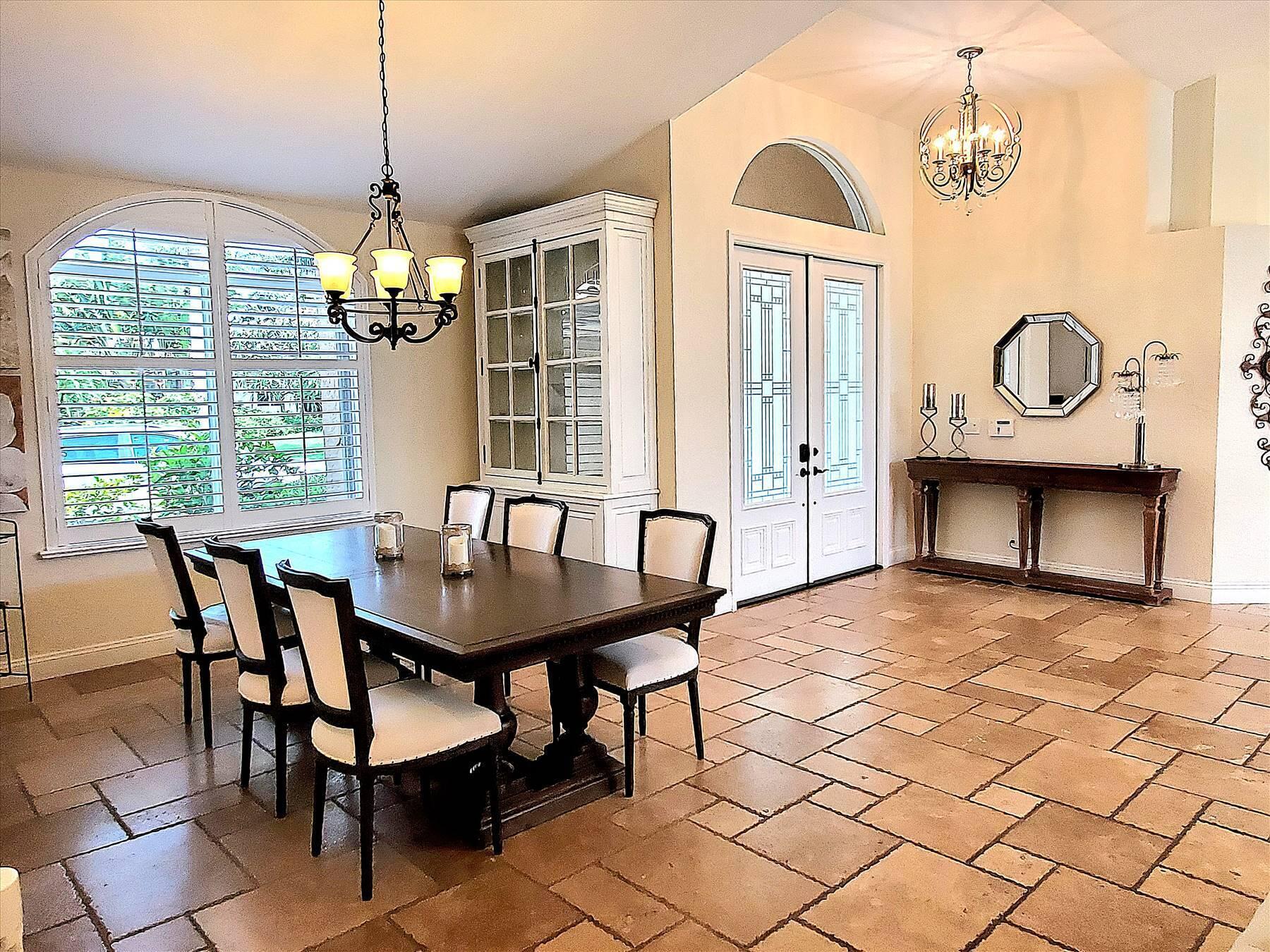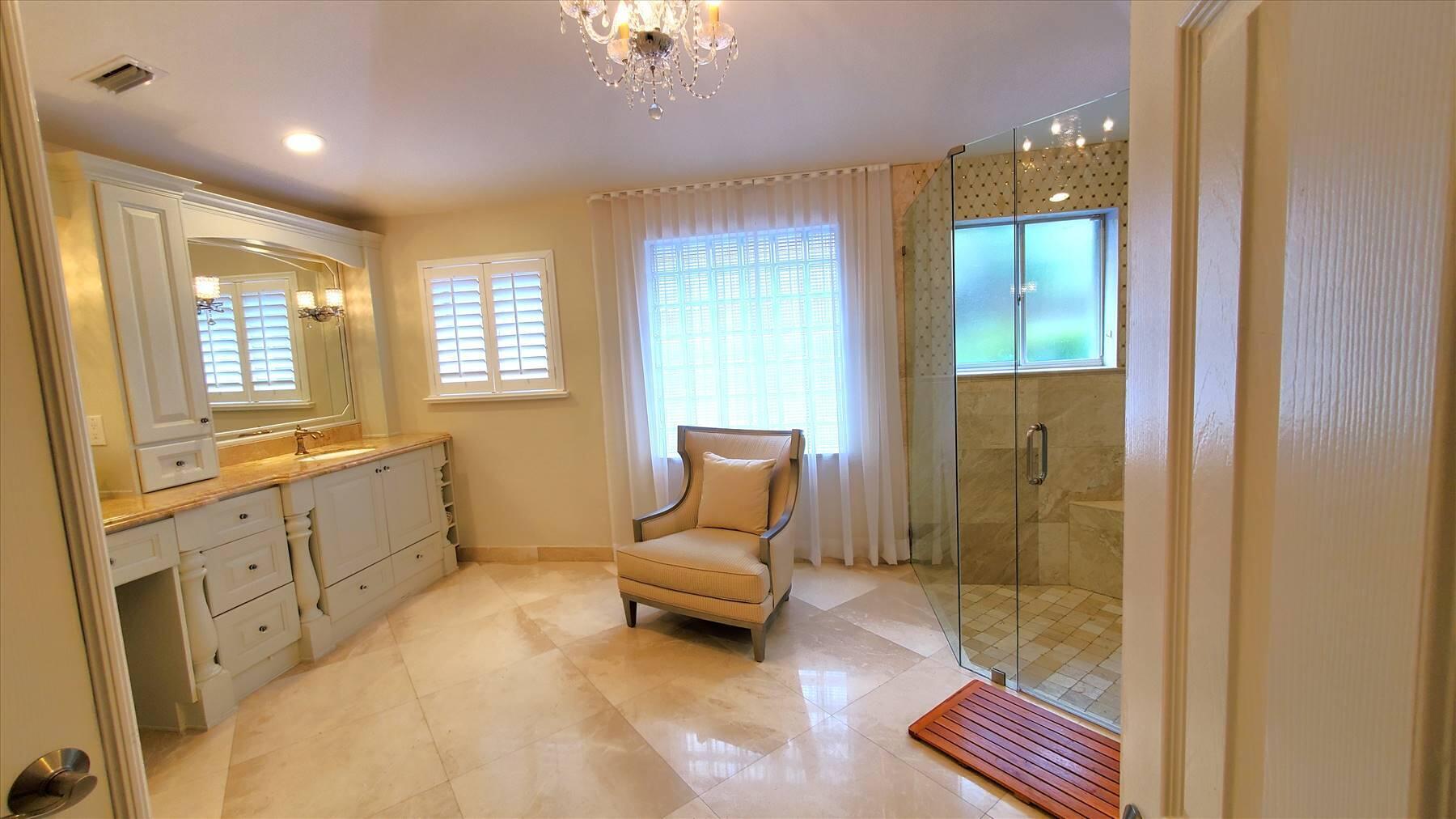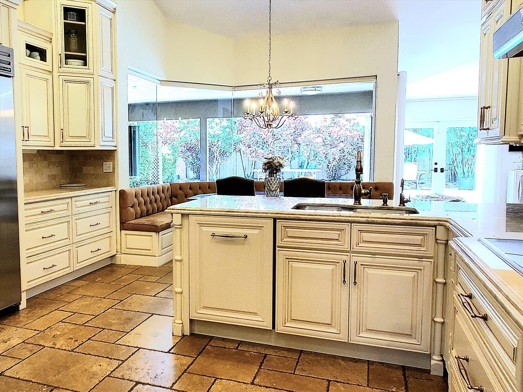 Luxurious 5BR 4BA single story residence in highly sought after Palm Island! This stunning, updated home sits on a large private corner lot with a fully fenced yard w/pool w/new salt system, new pool pump, newer travertine deck, a newly resurfaced basketball court, a dog run and generous covered patio, perfect for outdoor entertaining. Newly painted French doors and walls, exquisite travertine marble flooring in living areas, gorgeous high-end eat-in kitchen w/bench seating, upgraded solid wood cabinetry, stainless steel Thermador appliances, quartzite countertops and generous walk-in pantry. The primary bathroom has marble flooring and a large shower w/endless hot water from new tankless systems. Cabana bathroom, tons of storage throughout w/ closet organizers and easy access attic.