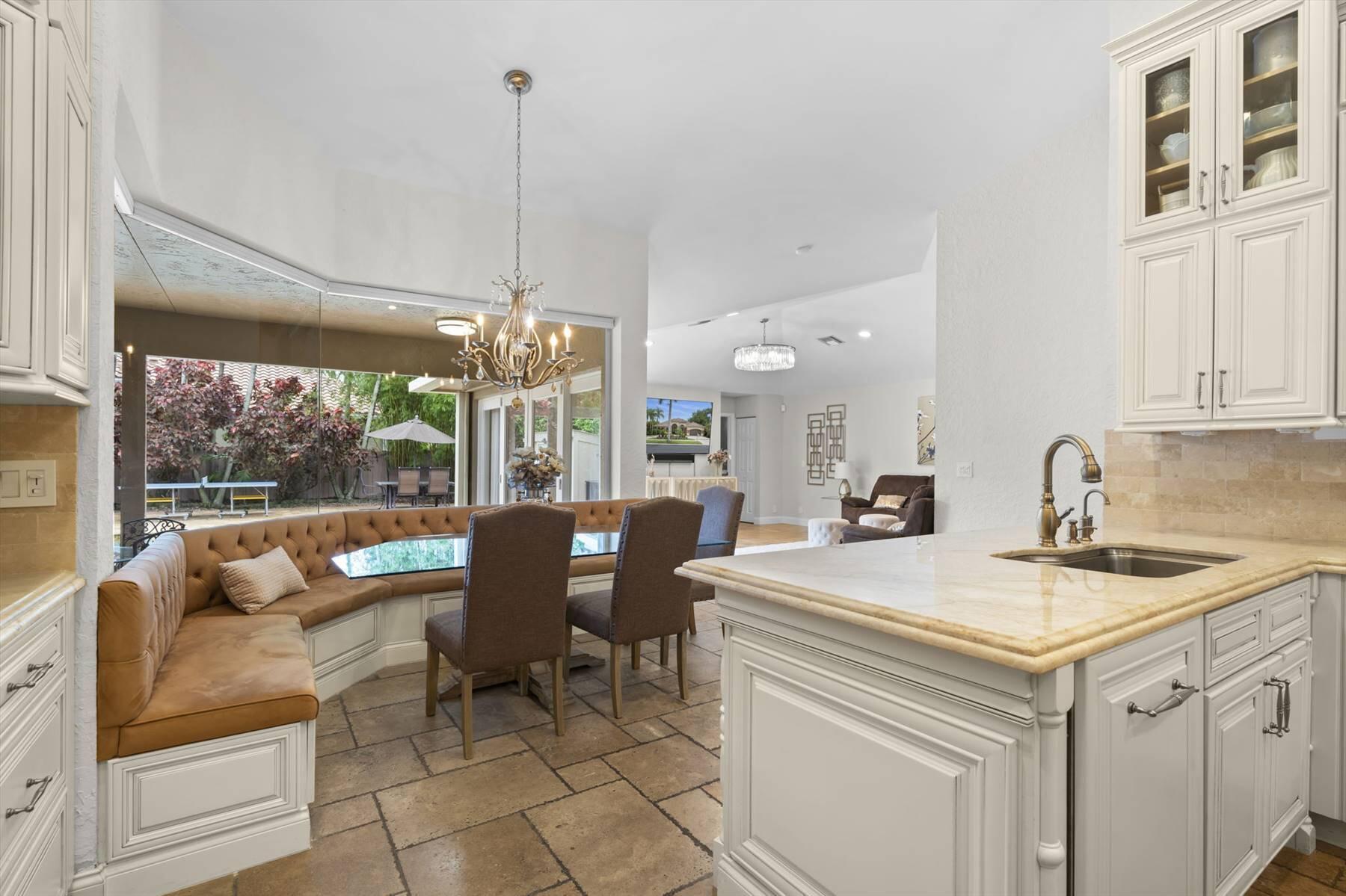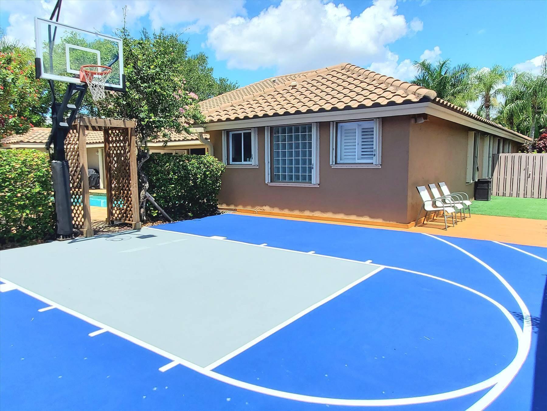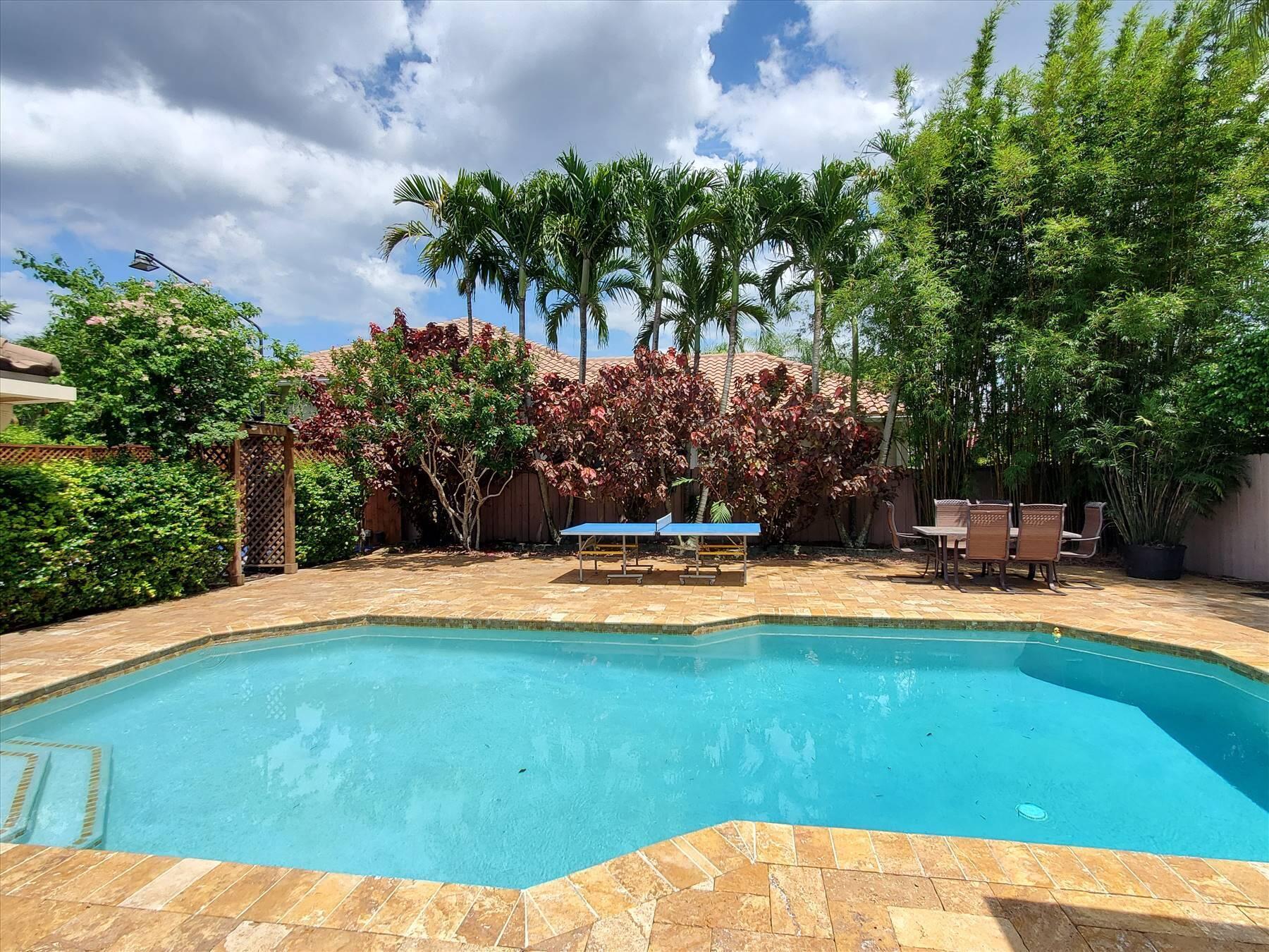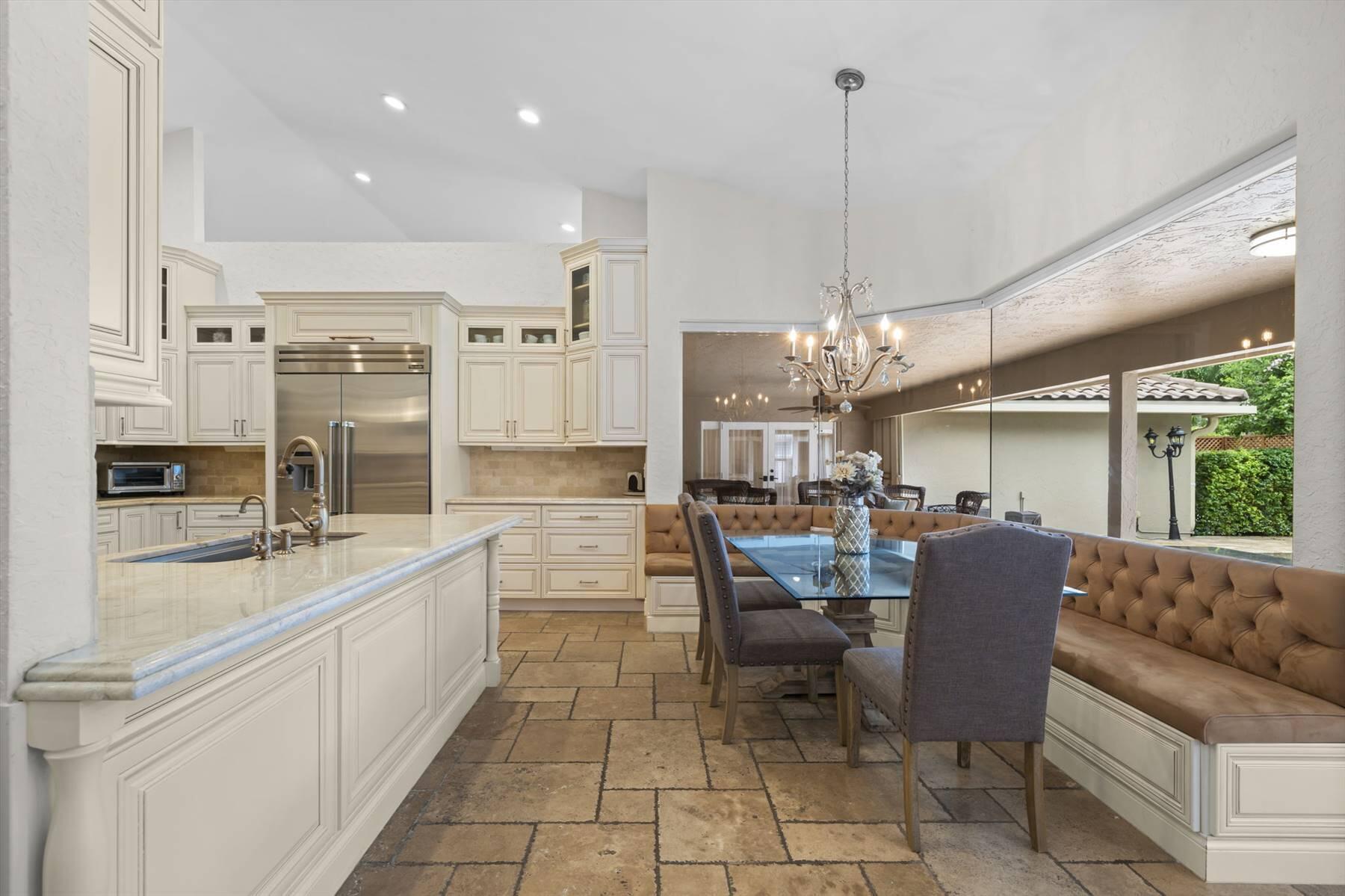 Luxurious 5BR 4BA single story residence in highly sought after Palm Island! This stunning, updated home sits on a large private corner lot with a fully fenced yard w/pool w/new salt system, new pool pump, newer travertine deck, a newly resurfaced basketball court, a dog run and generous covered patio, perfect for outdoor entertaining. Newly painted French doors and walls, exquisite travertine marble flooring in living areas, gorgeous high-end eat-in kitchen w/bench seating, upgraded solid wood cabinetry, stainless steel Thermador appliances, quartzite countertops and generous walk-in pantry. The primary bathroom has marble flooring and a large shower w/endless hot water from new tankless systems. Cabana bathroom, tons of storage throughout w/ closet organizers and easy access attic.