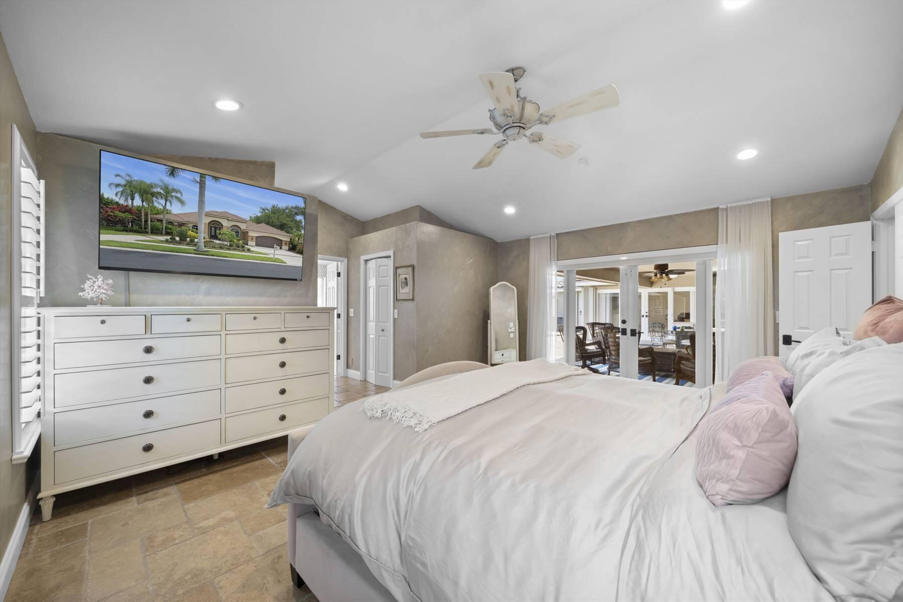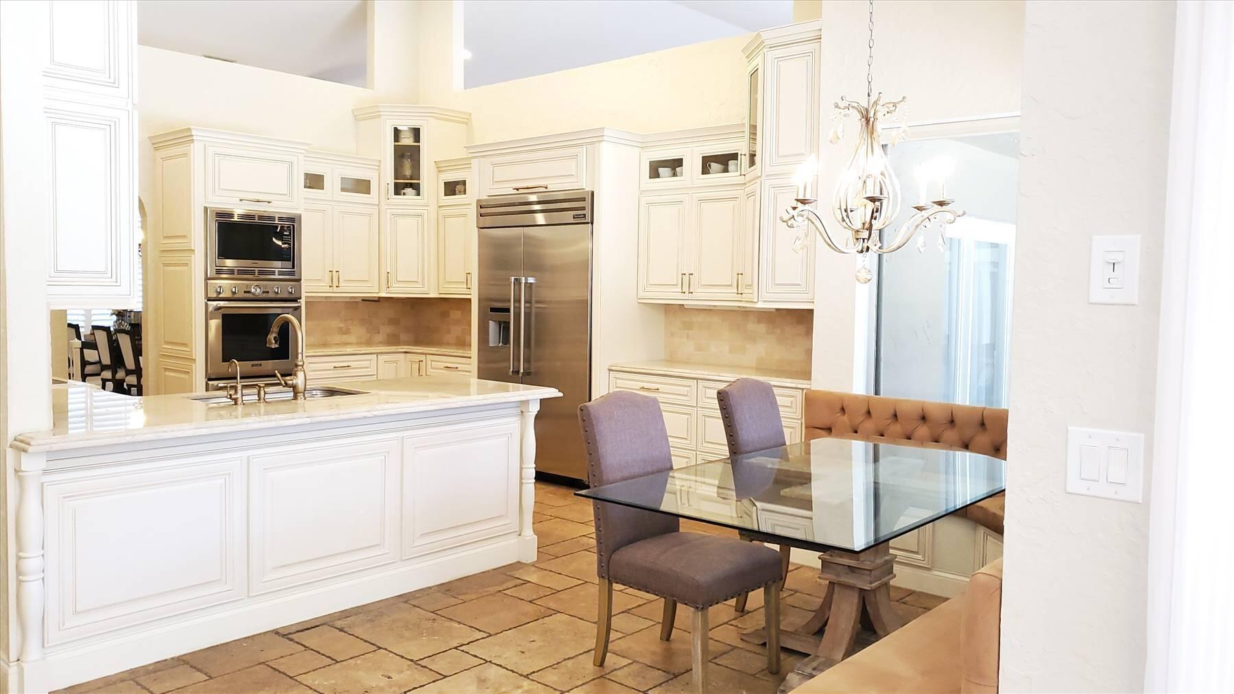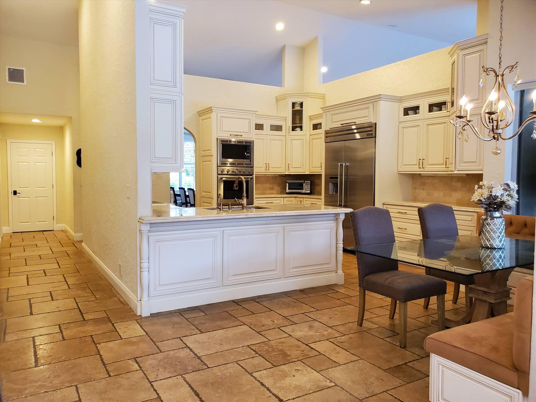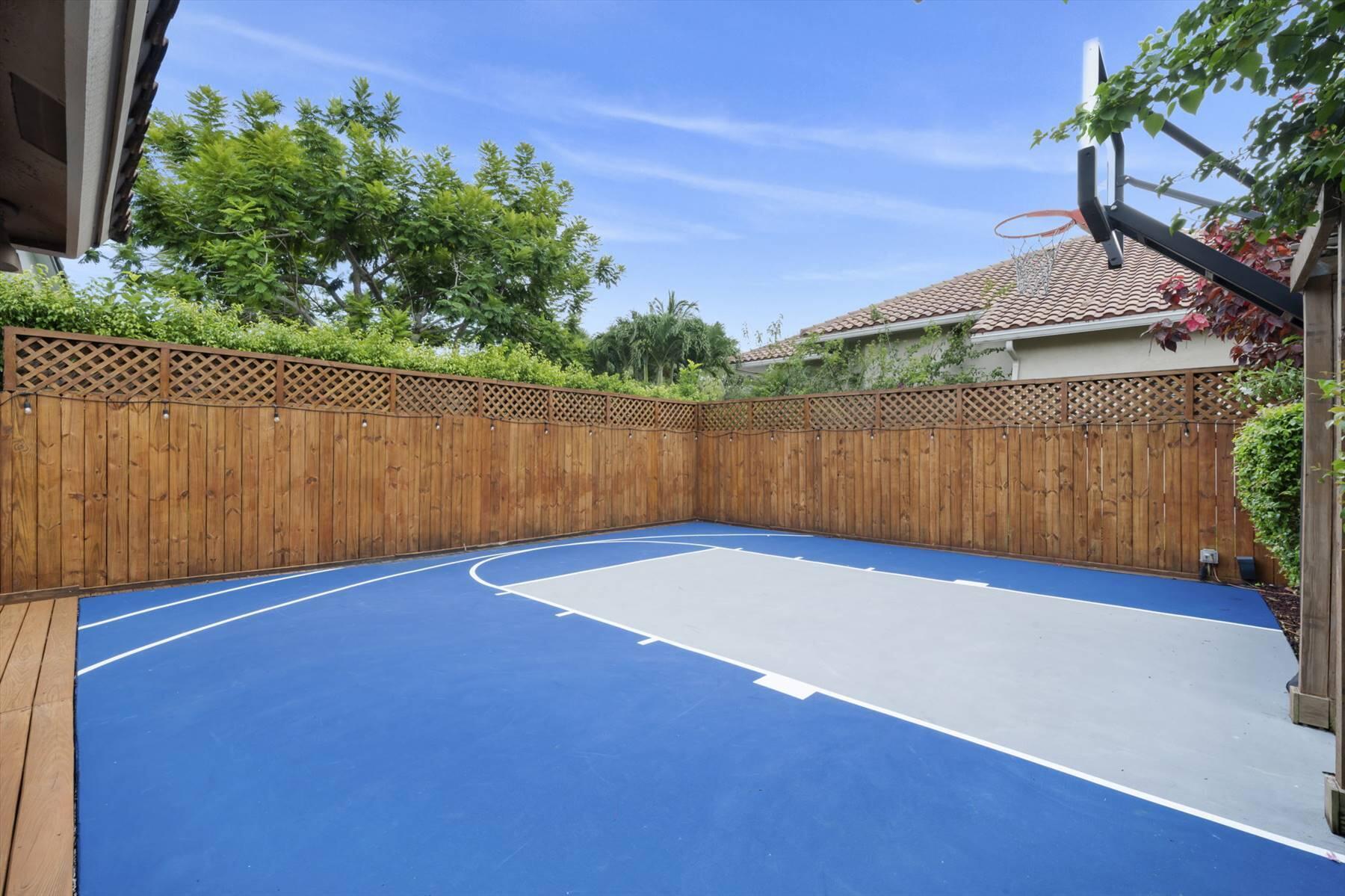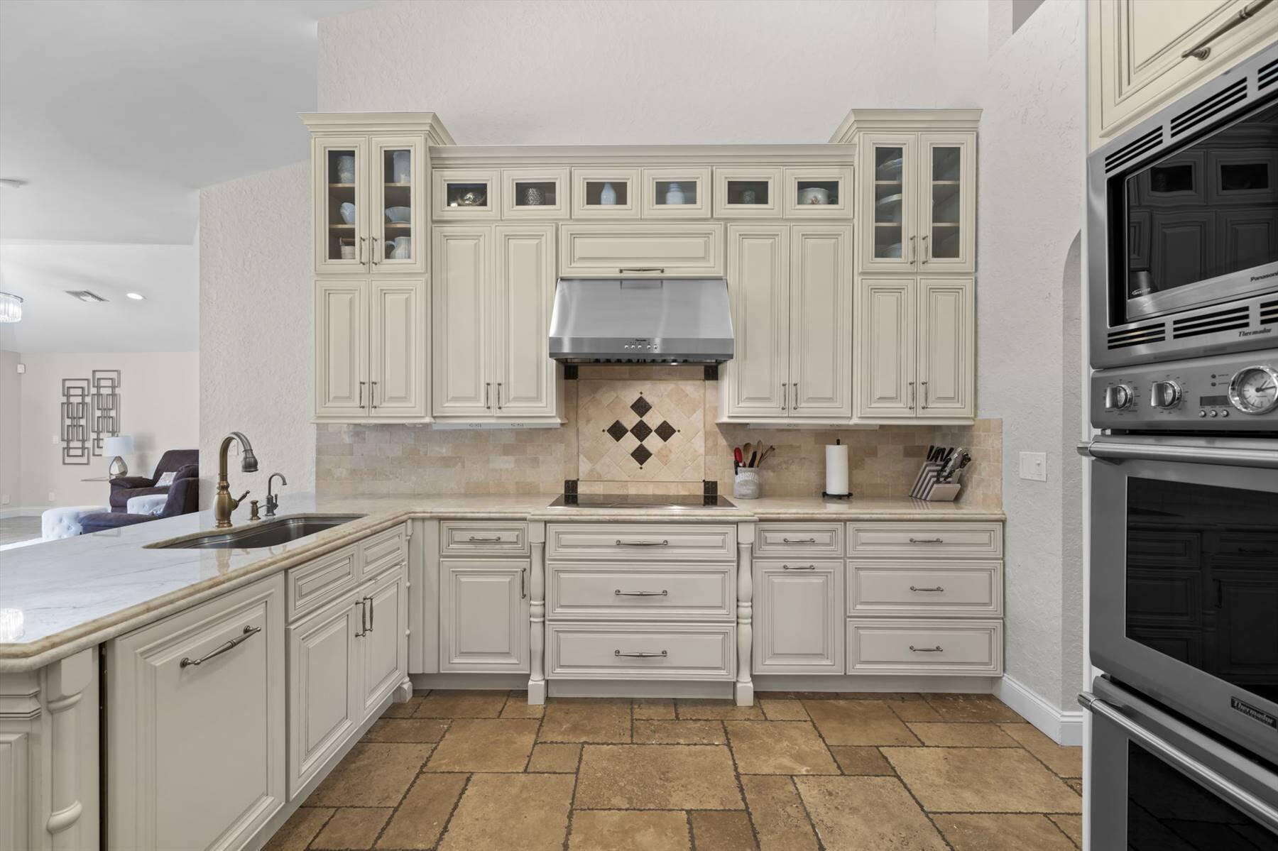 Luxurious 5BR 4BA single story residence in highly sought after Palm Island! This stunning, updated home sits on a large private corner lot with a fully fenced yard w/pool w/new salt system, new pool pump, newer travertine deck, a newly resurfaced basketball court, a dog run and generous covered patio, perfect for outdoor entertaining. Newly painted French doors and walls, exquisite travertine marble flooring in living areas, gorgeous high-end eat-in kitchen w/bench seating, upgraded solid wood cabinetry, stainless steel Thermador appliances, quartzite countertops and generous walk-in pantry. The primary bathroom has marble flooring and a large shower w/endless hot water from new tankless systems. Cabana bathroom, tons of storage throughout w/ closet organizers and easy access attic.