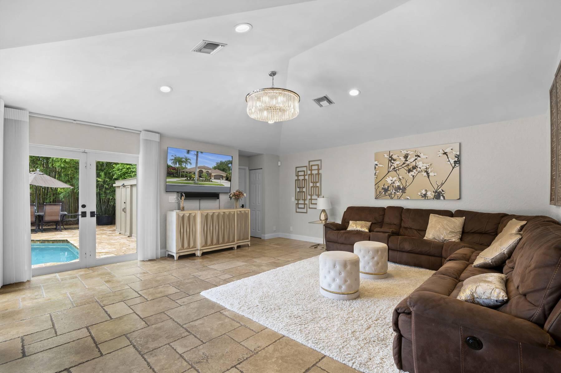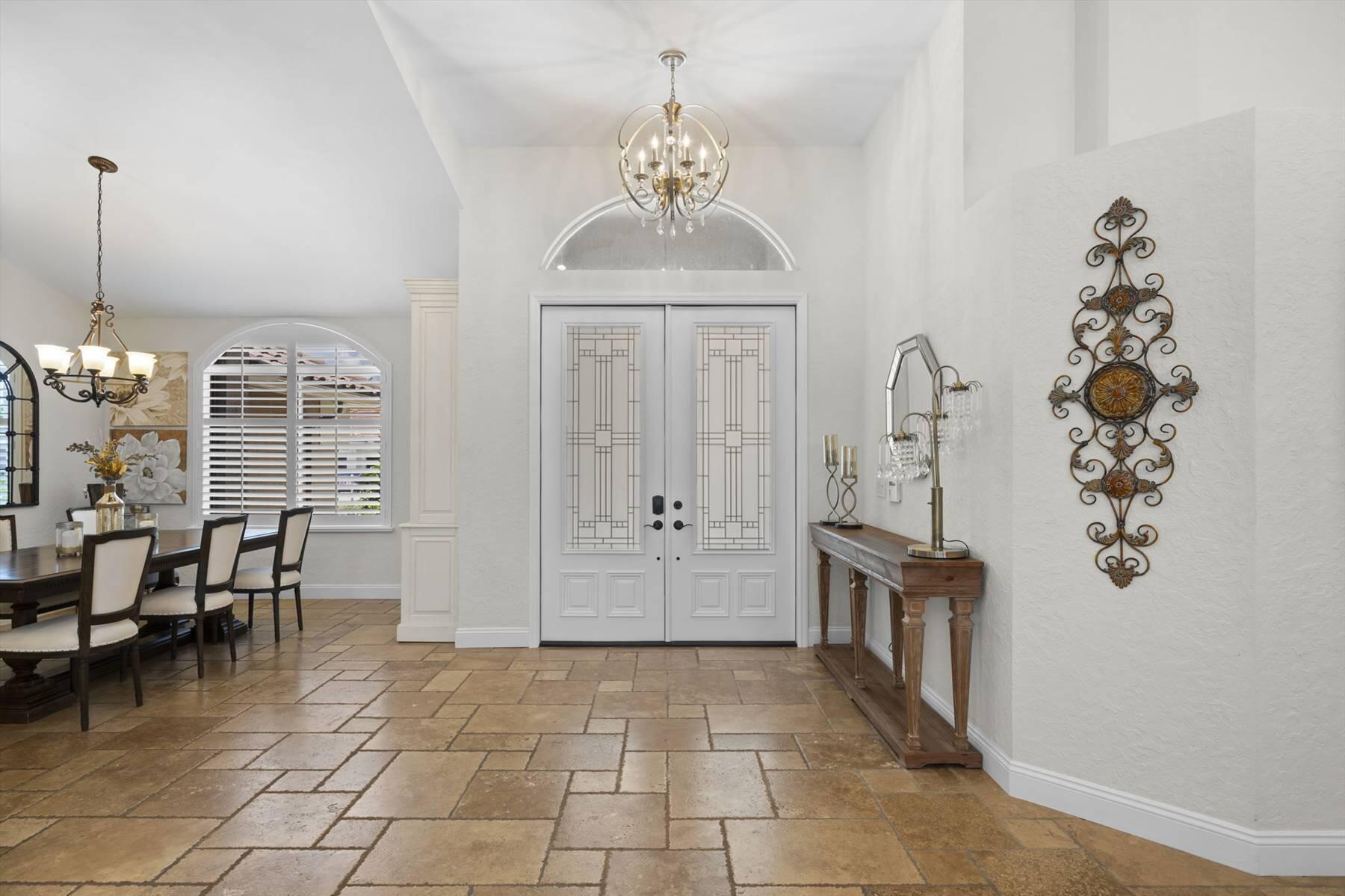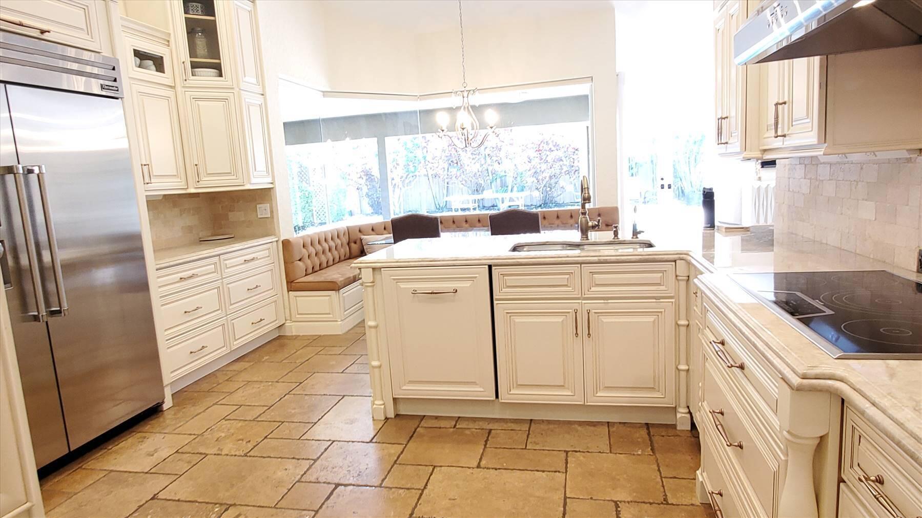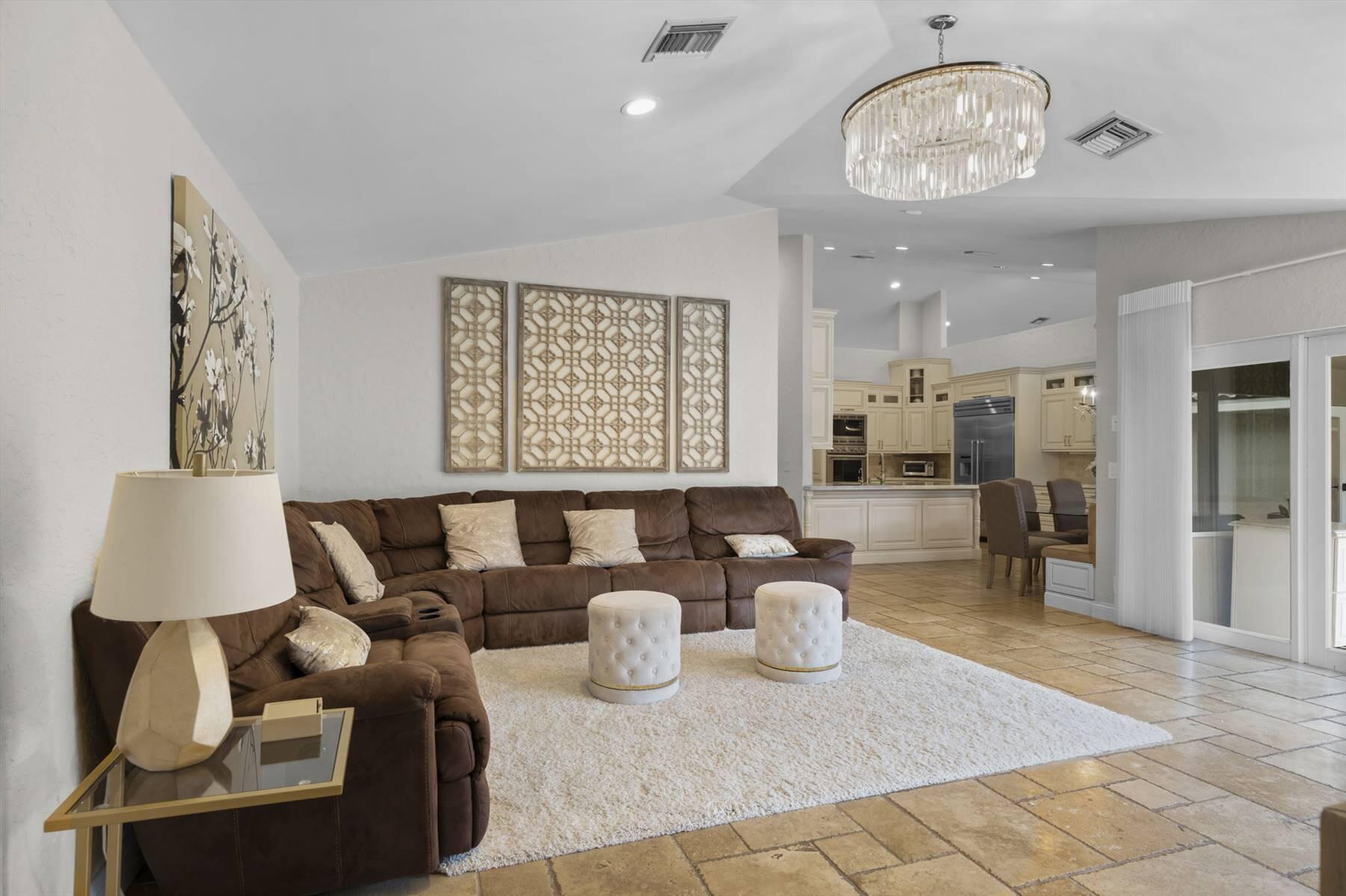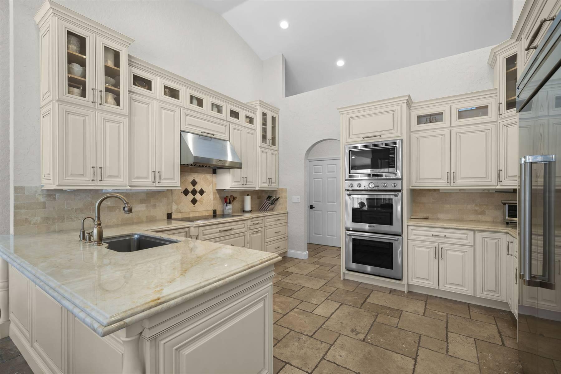 Luxurious 5BR 4BA single story residence in highly sought after Palm Island! This stunning, updated home sits on a large private corner lot with a fully fenced yard w/pool w/new salt system, new pool pump, newer travertine deck, a newly resurfaced basketball court, a dog run and generous covered patio, perfect for outdoor entertaining. Newly painted French doors and walls, exquisite travertine marble flooring in living areas, gorgeous high-end eat-in kitchen w/bench seating, upgraded solid wood cabinetry, stainless steel Thermador appliances, quartzite countertops and generous walk-in pantry. The primary bathroom has marble flooring and a large shower w/endless hot water from new tankless systems. Cabana bathroom, tons of storage throughout w/ closet organizers and easy access attic.