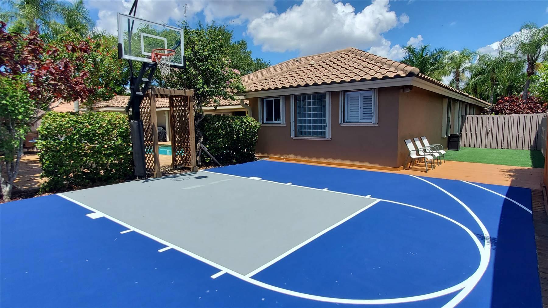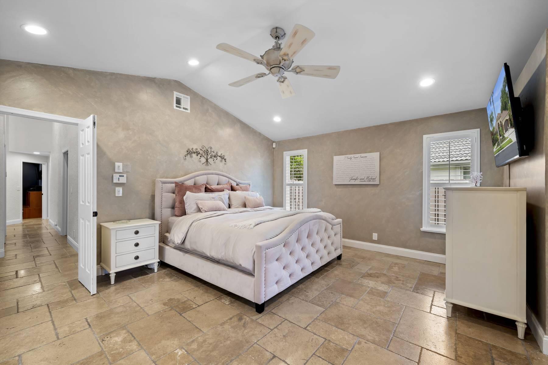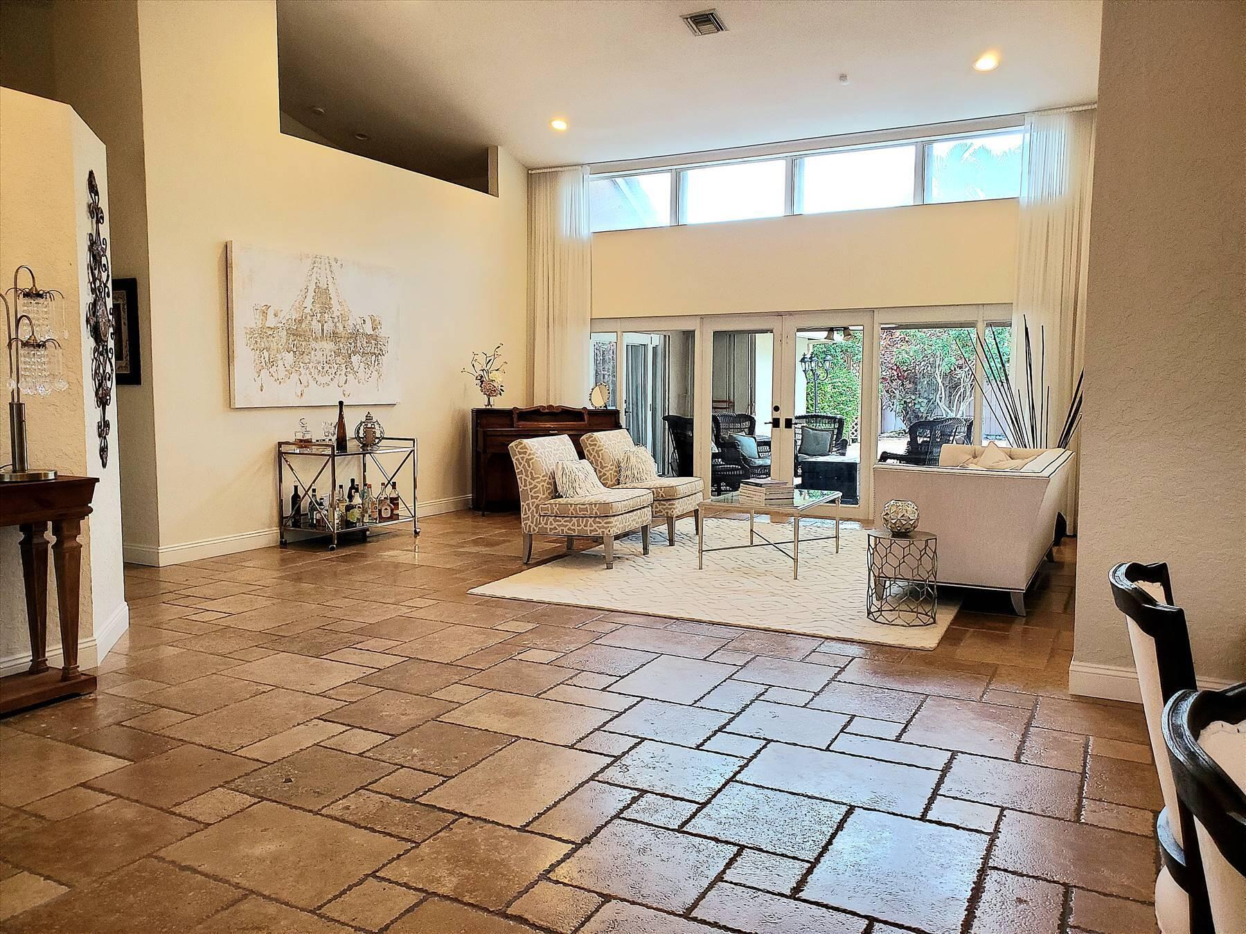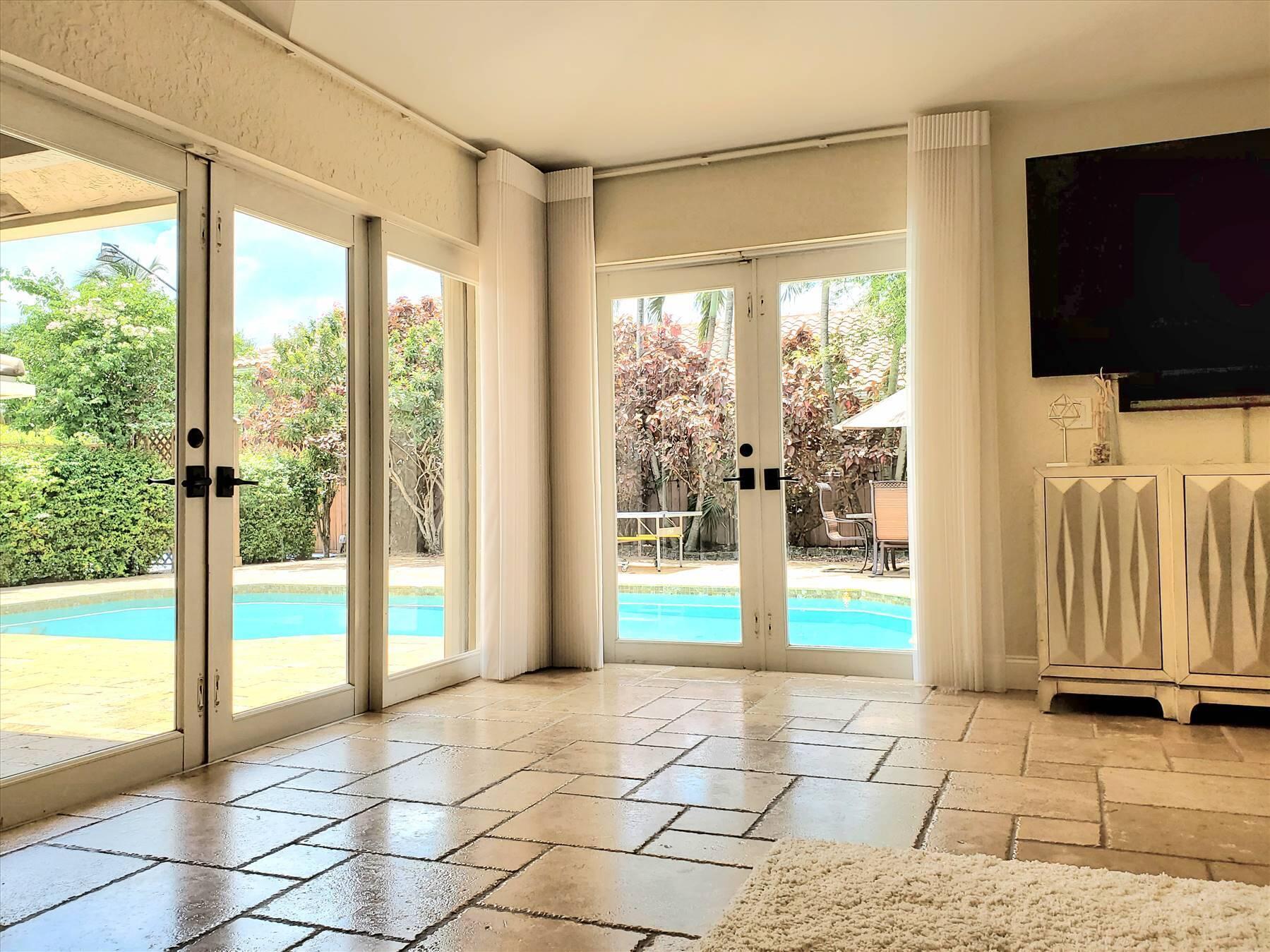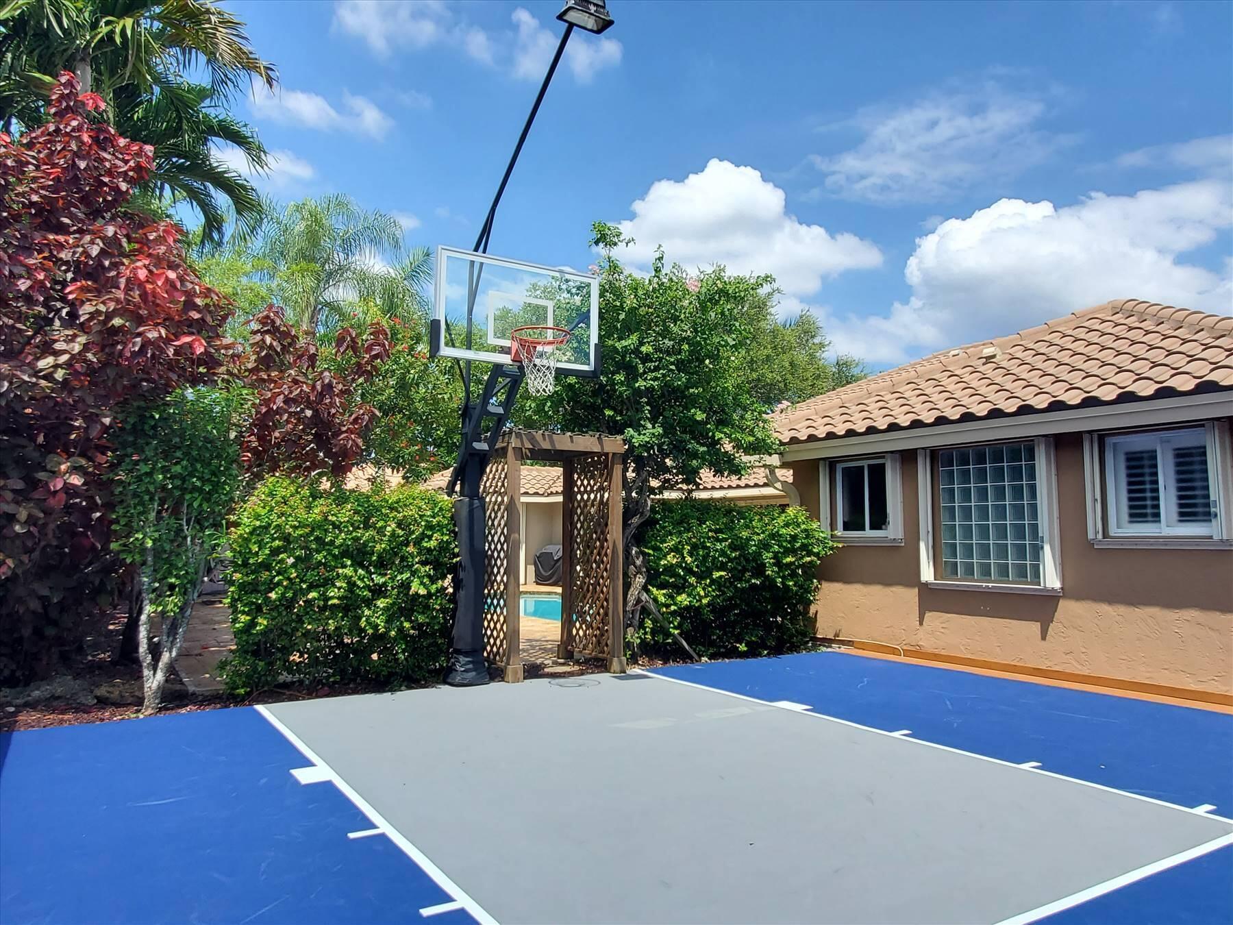 Luxurious 5BR 4BA single story residence in highly sought after Palm Island! This stunning, updated home sits on a large private corner lot with a fully fenced yard w/pool w/new salt system, new pool pump, newer travertine deck, a newly resurfaced basketball court, a dog run and generous covered patio, perfect for outdoor entertaining. Newly painted French doors and walls, exquisite travertine marble flooring in living areas, gorgeous high-end eat-in kitchen w/bench seating, upgraded solid wood cabinetry, stainless steel Thermador appliances, quartzite countertops and generous walk-in pantry. The primary bathroom has marble flooring and a large shower w/endless hot water from new tankless systems. Cabana bathroom, tons of storage throughout w/ closet organizers and easy access attic.