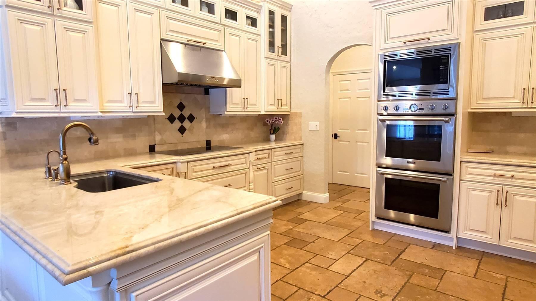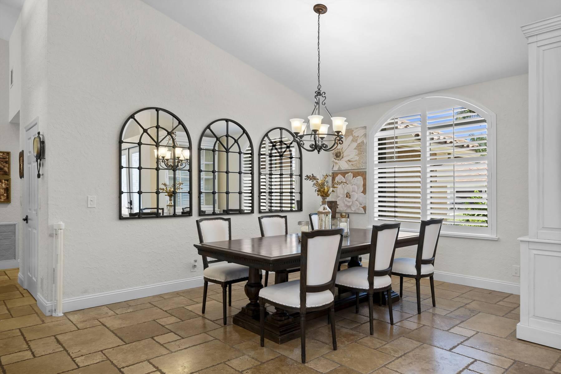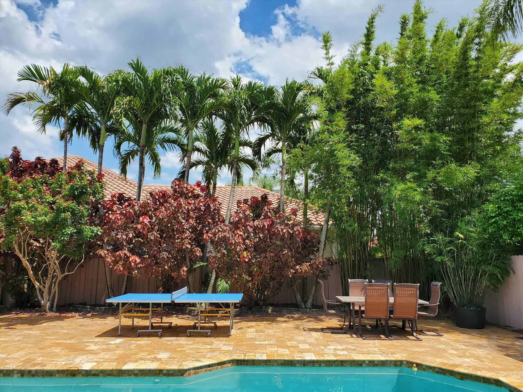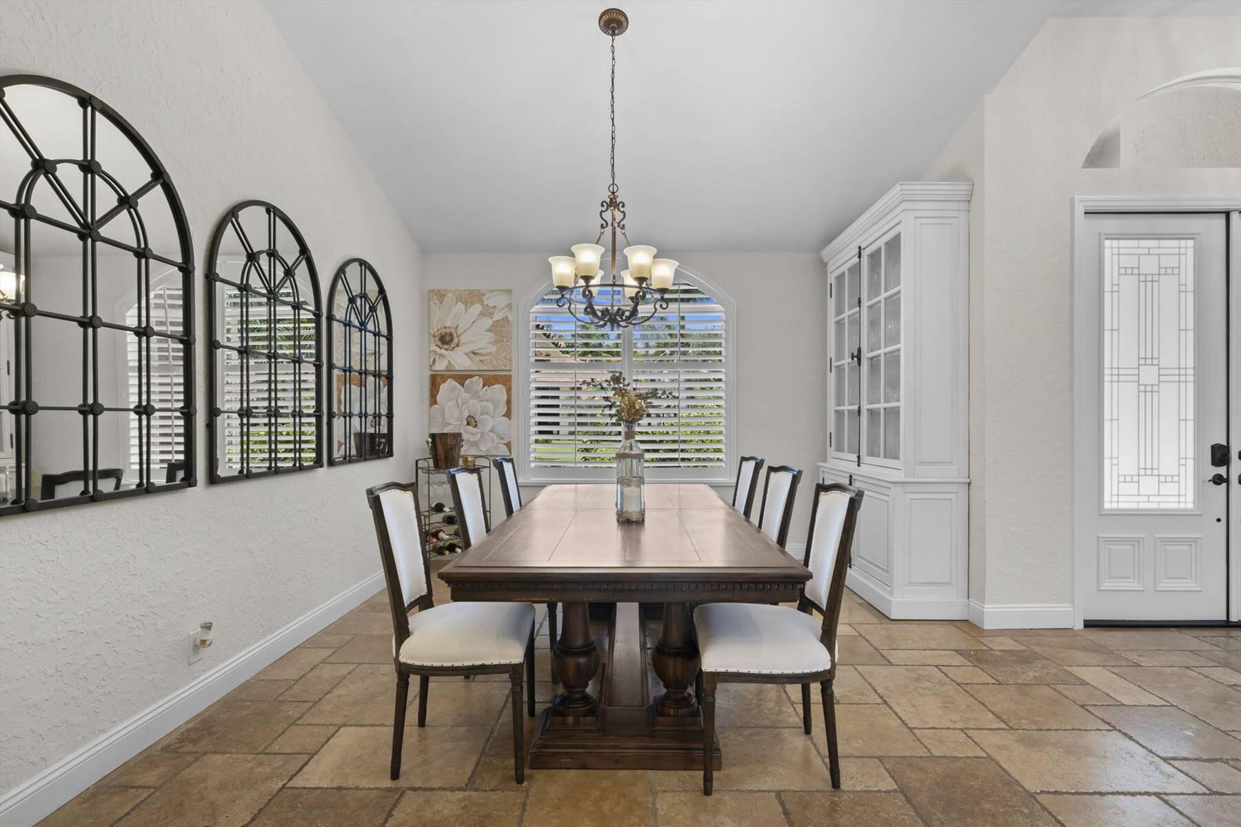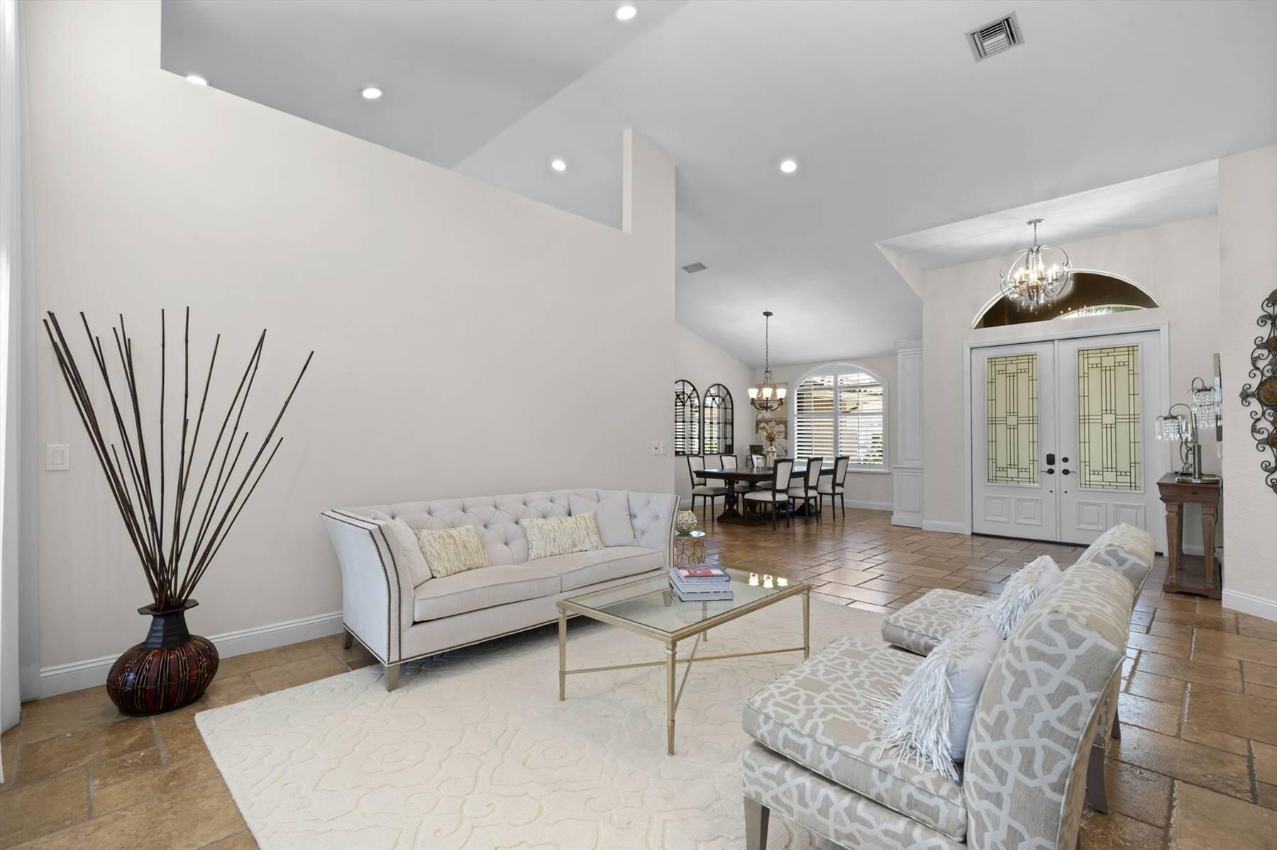 Luxurious 5BR 4BA single story residence in highly sought after Palm Island! This stunning, updated home sits on a large private corner lot with a fully fenced yard w/pool w/new salt system, new pool pump, newer travertine deck, a newly resurfaced basketball court, a dog run and generous covered patio, perfect for outdoor entertaining. Newly painted French doors and walls, exquisite travertine marble flooring in living areas, gorgeous high-end eat-in kitchen w/bench seating, upgraded solid wood cabinetry, stainless steel Thermador appliances, quartzite countertops and generous walk-in pantry. The primary bathroom has marble flooring and a large shower w/endless hot water from new tankless systems. Cabana bathroom, tons of storage throughout w/ closet organizers and easy access attic.