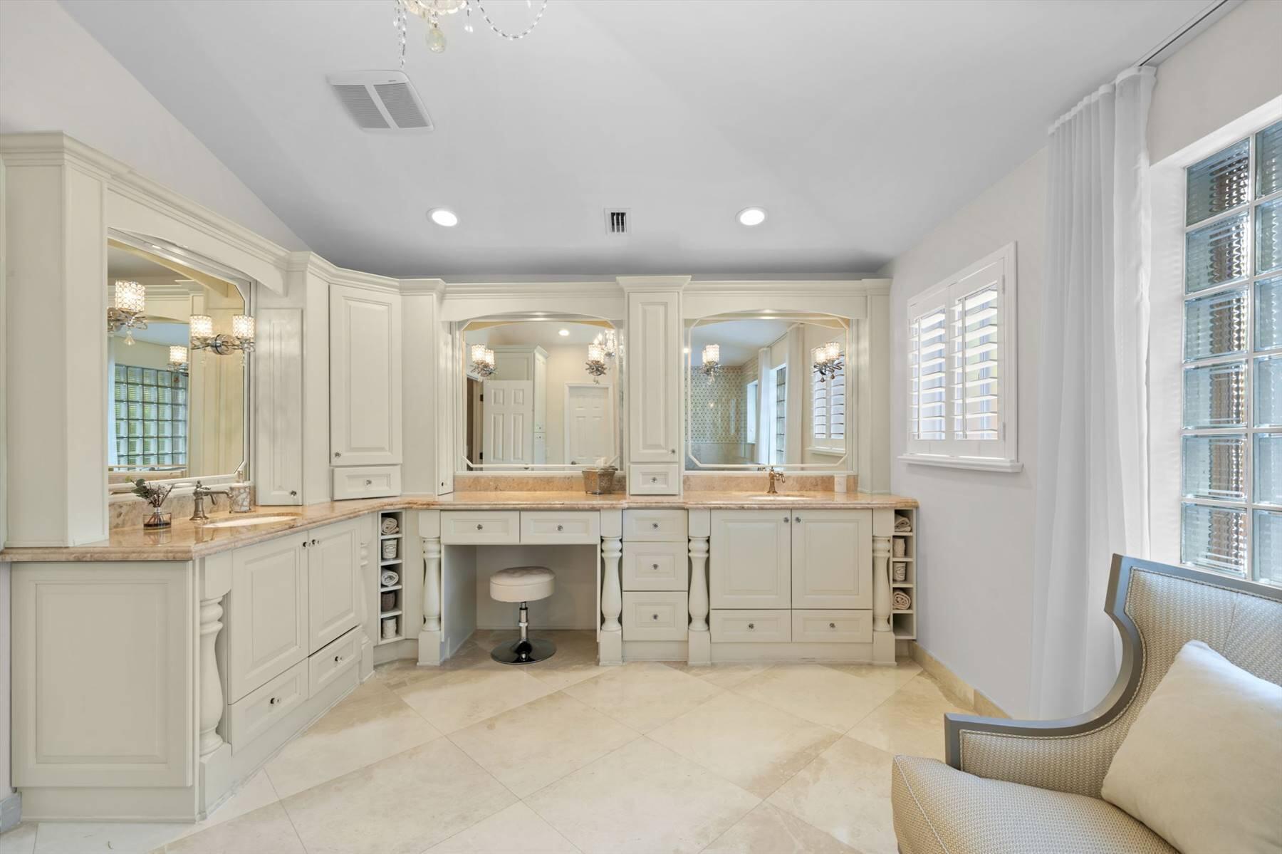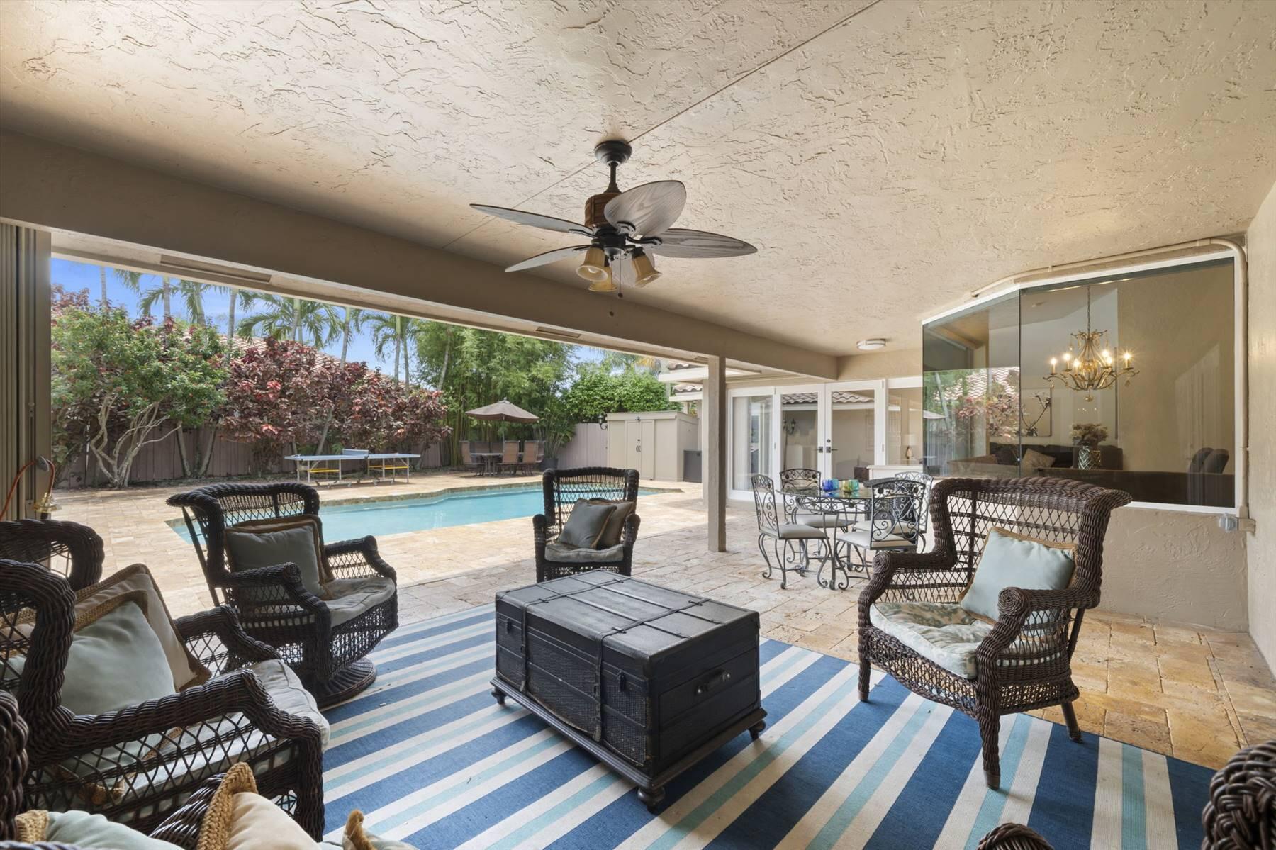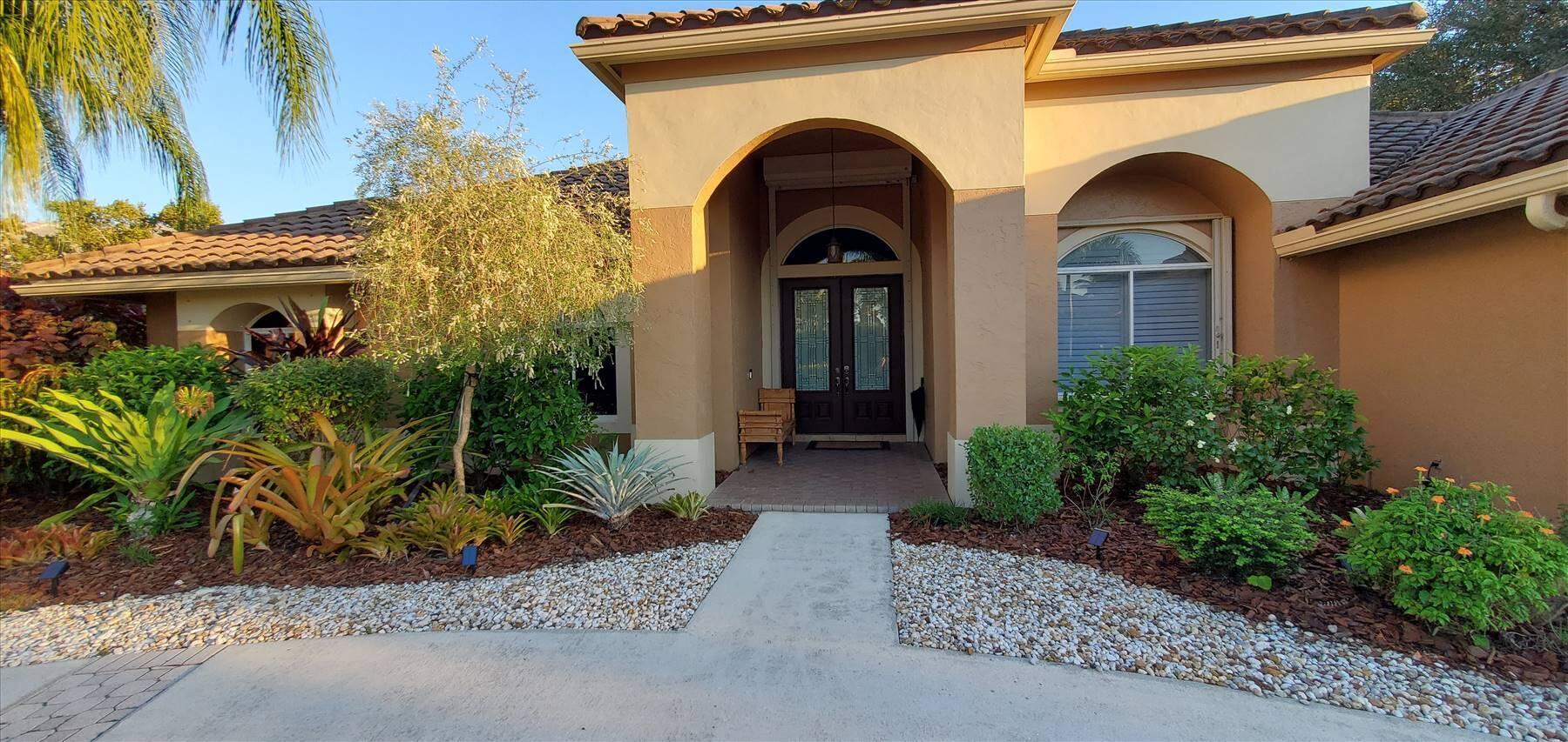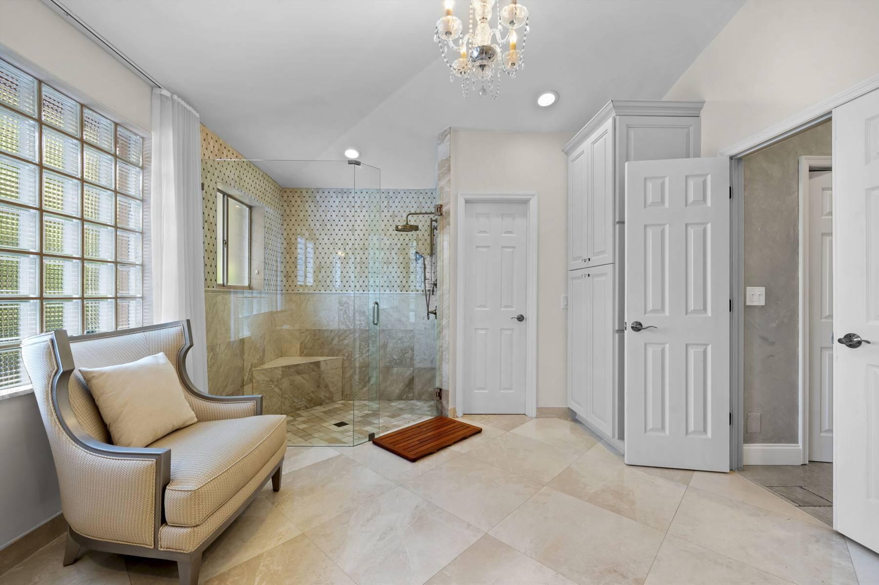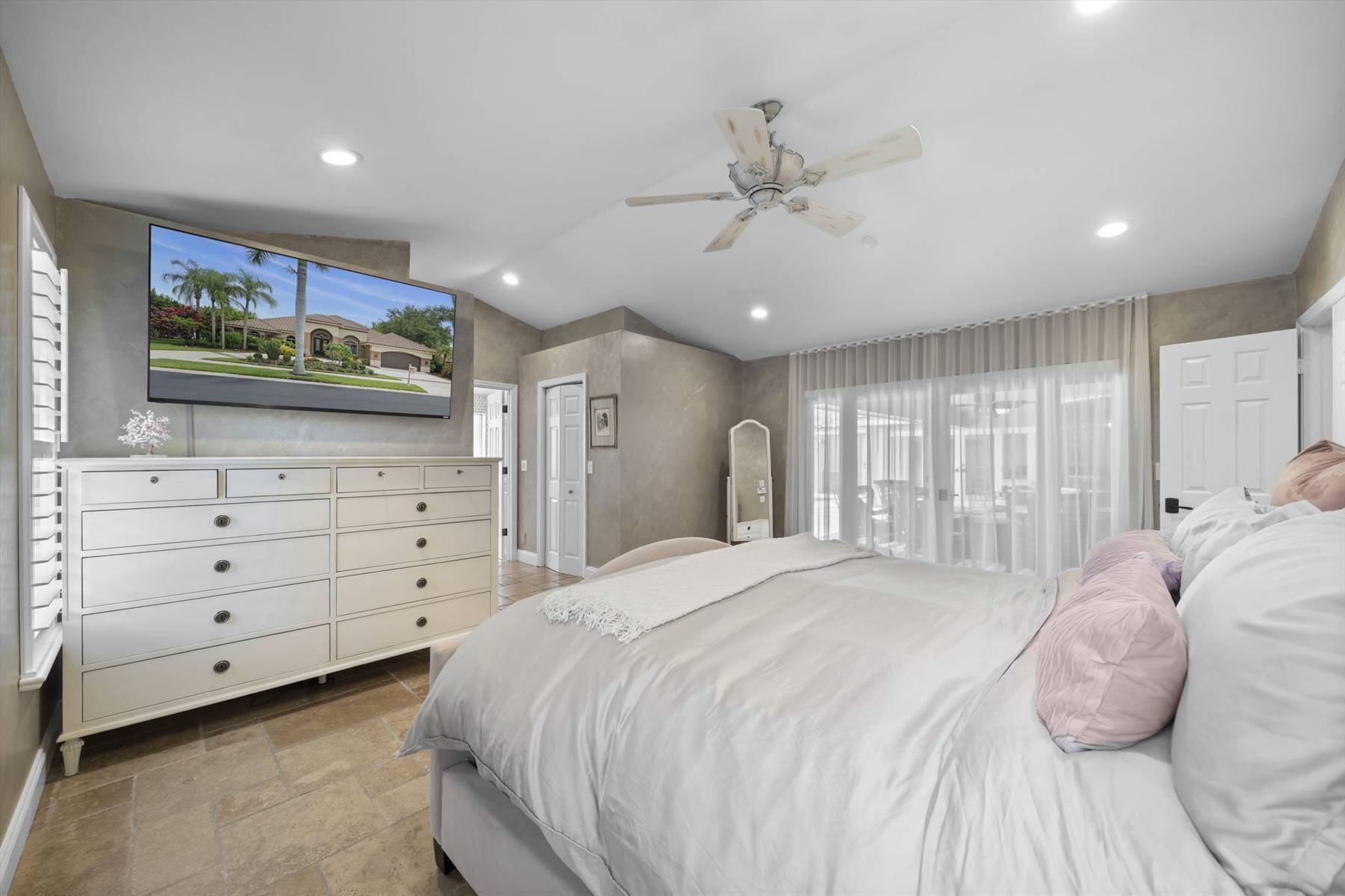 Luxurious 5BR 4BA single story residence in highly sought after Palm Island! This stunning, updated home sits on a large private corner lot with a fully fenced yard w/pool w/new salt system, new pool pump, newer travertine deck, a newly resurfaced basketball court, a dog run and generous covered patio, perfect for outdoor entertaining. Newly painted French doors and walls, exquisite travertine marble flooring in living areas, gorgeous high-end eat-in kitchen w/bench seating, upgraded solid wood cabinetry, stainless steel Thermador appliances, quartzite countertops and generous walk-in pantry. The primary bathroom has marble flooring and a large shower w/endless hot water from new tankless systems. Cabana bathroom, tons of storage throughout w/ closet organizers and easy access attic.