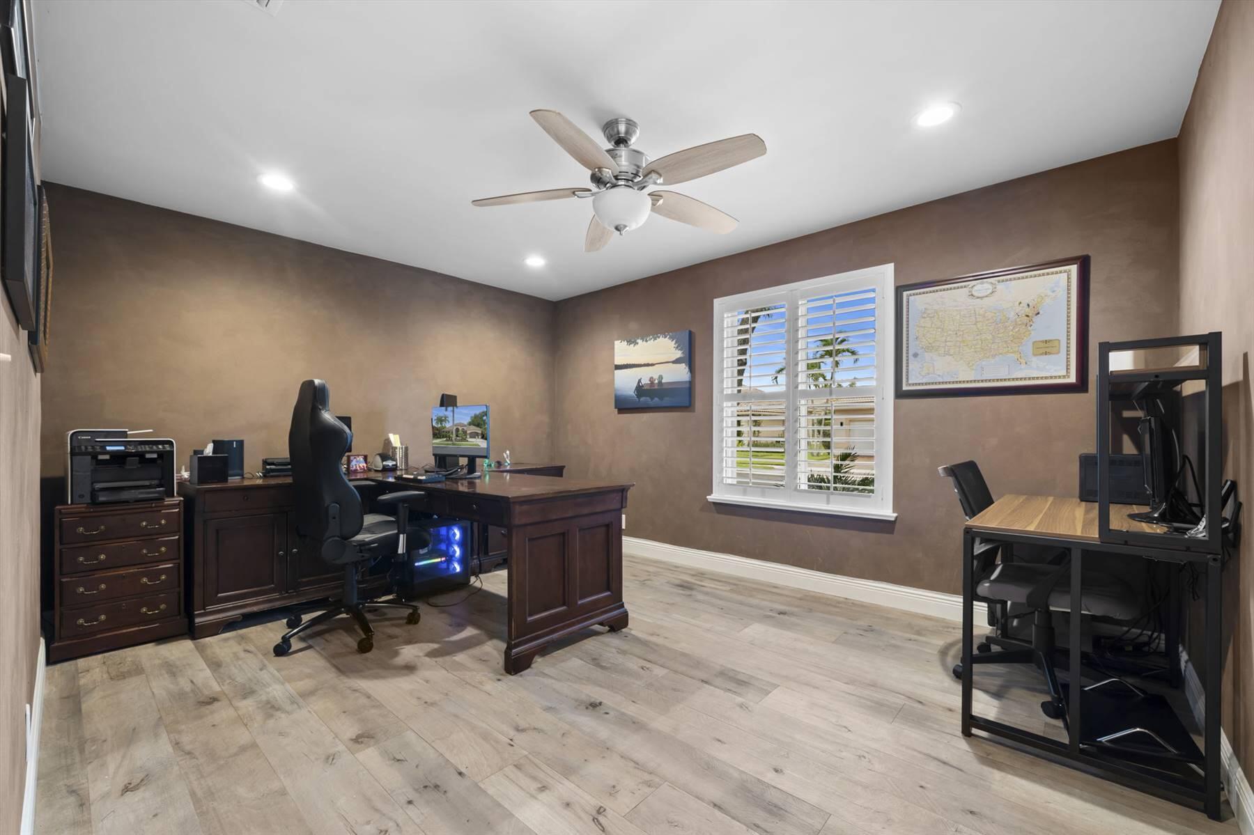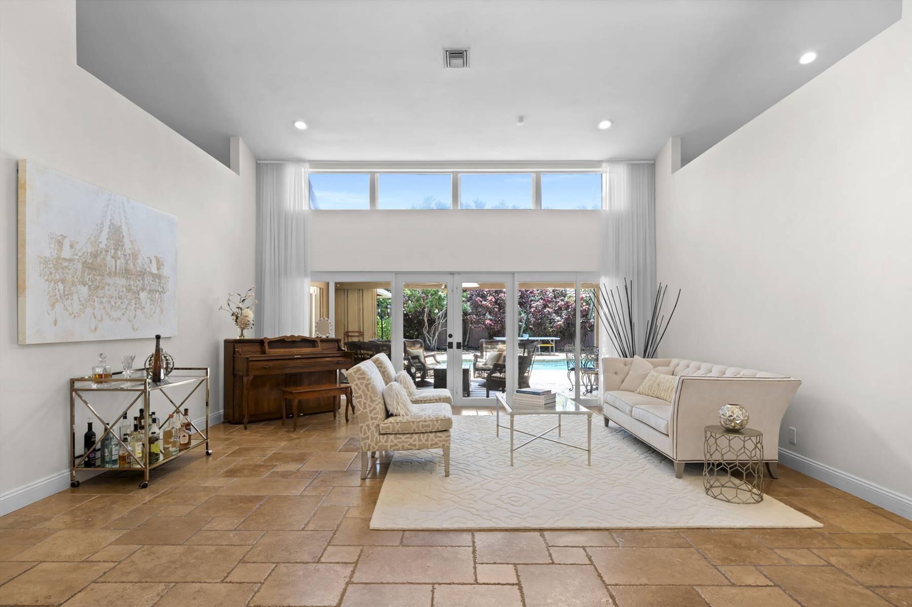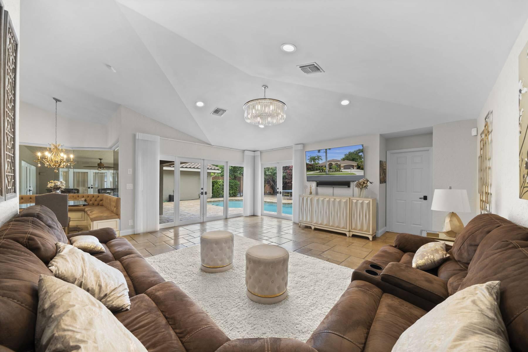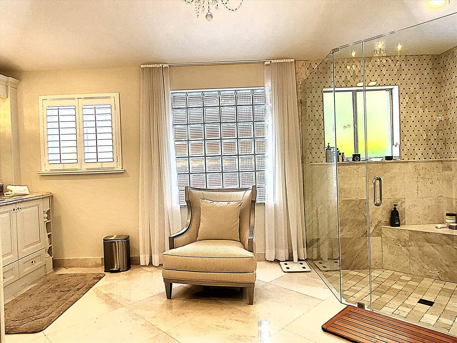 Luxurious 5BR 4BA single story residence in highly sought after Palm Island! This stunning, updated home sits on a large private corner lot with a fully fenced yard w/pool w/new salt system, new pool pump, newer travertine deck, a newly resurfaced basketball court, a dog run and generous covered patio, perfect for outdoor entertaining. Newly painted French doors and walls, exquisite travertine marble flooring in living areas, gorgeous high-end eat-in kitchen w/bench seating, upgraded solid wood cabinetry, stainless steel Thermador appliances, quartzite countertops and generous walk-in pantry. The primary bathroom has marble flooring and a large shower w/endless hot water from new tankless systems. Cabana bathroom, tons of storage throughout w/ closet organizers and easy access attic.