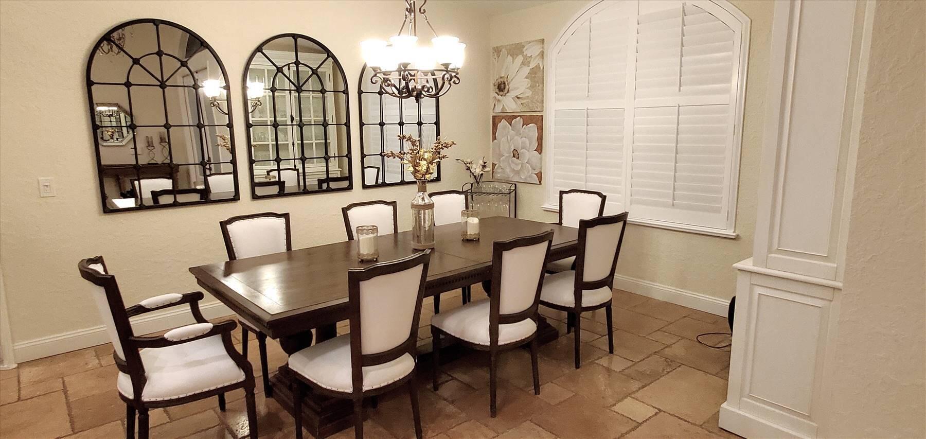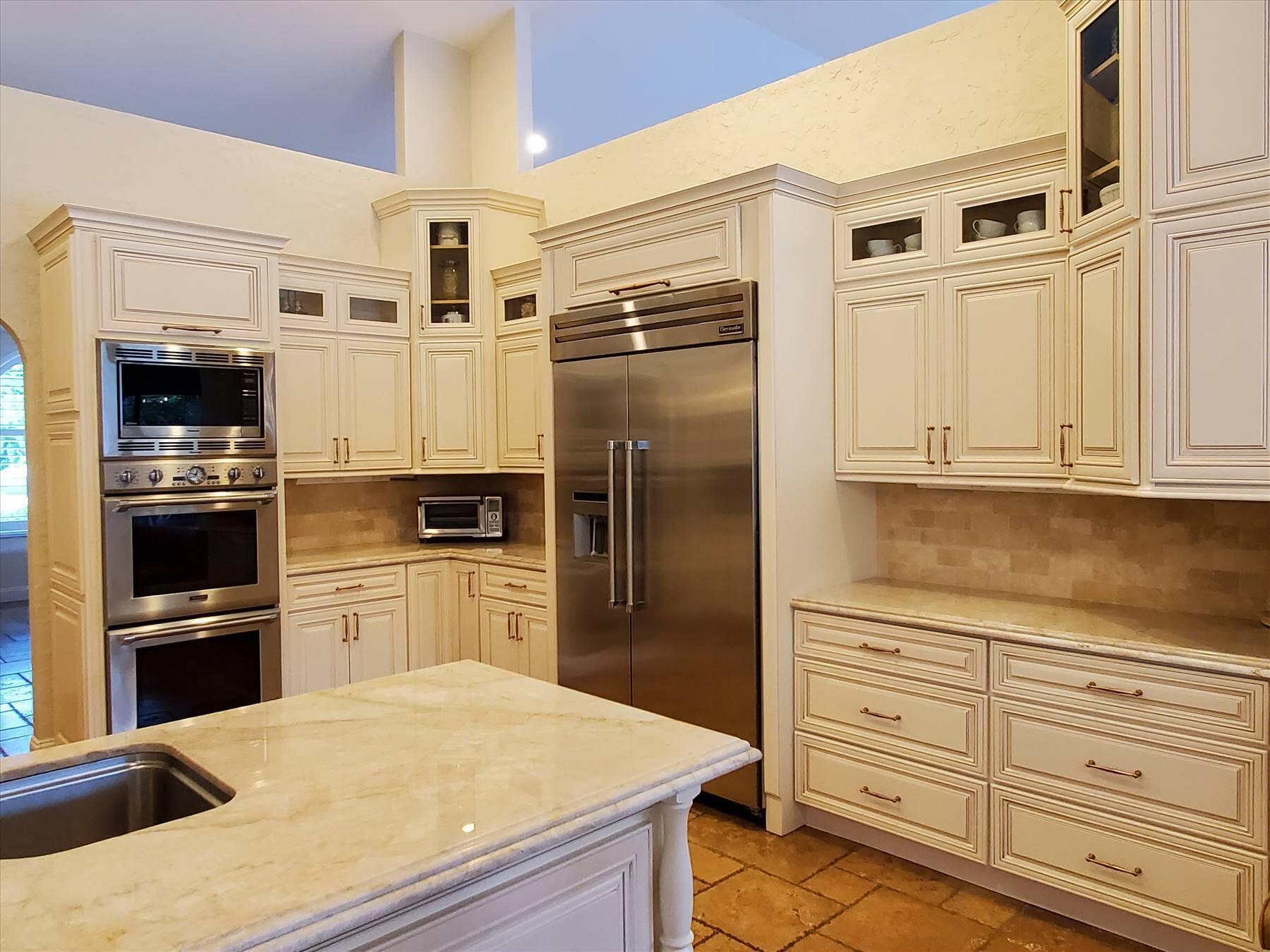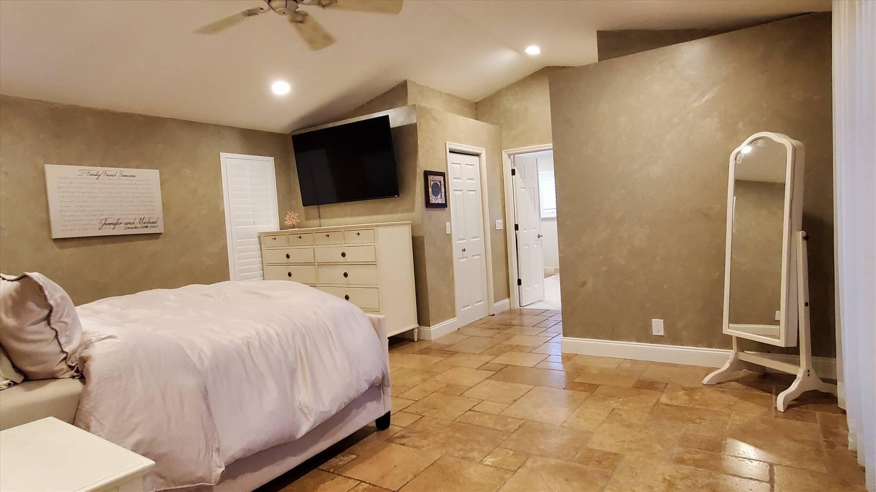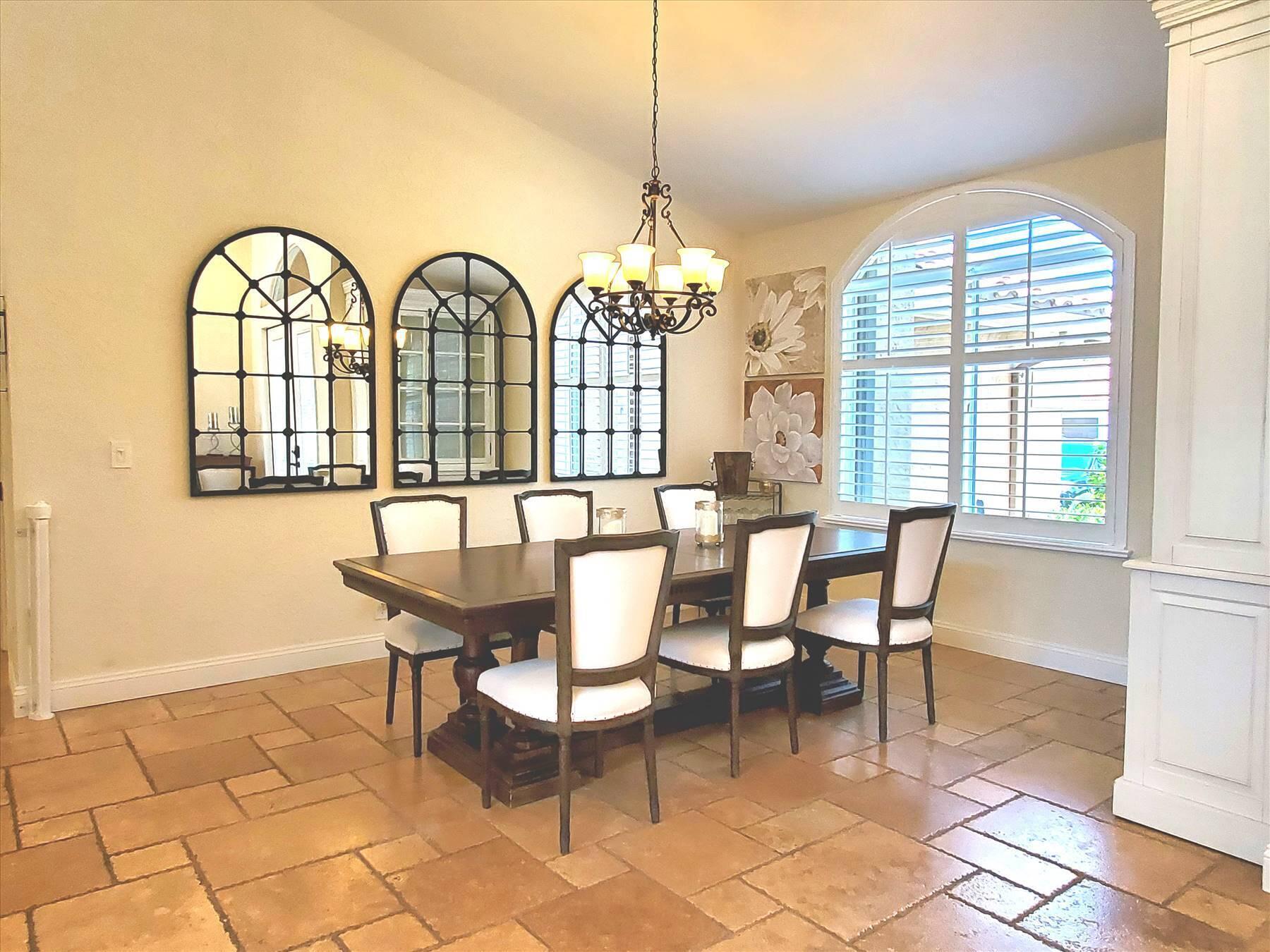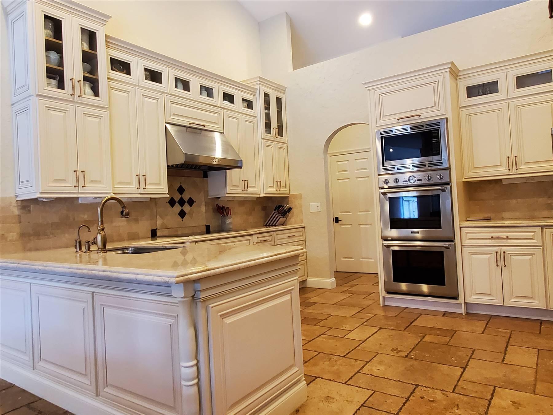 Luxurious 5BR 4BA single story residence in highly sought after Palm Island! This stunning, updated home sits on a large private corner lot with a fully fenced yard w/pool w/new salt system, new pool pump, newer travertine deck, a newly resurfaced basketball court, a dog run and generous covered patio, perfect for outdoor entertaining. Newly painted French doors and walls, exquisite travertine marble flooring in living areas, gorgeous high-end eat-in kitchen w/bench seating, upgraded solid wood cabinetry, stainless steel Thermador appliances, quartzite countertops and generous walk-in pantry. The primary bathroom has marble flooring and a large shower w/endless hot water from new tankless systems. Cabana bathroom, tons of storage throughout w/ closet organizers and easy access attic.