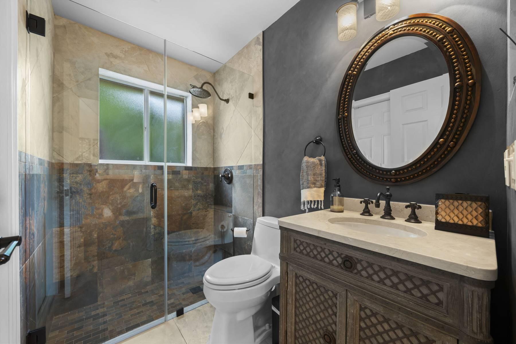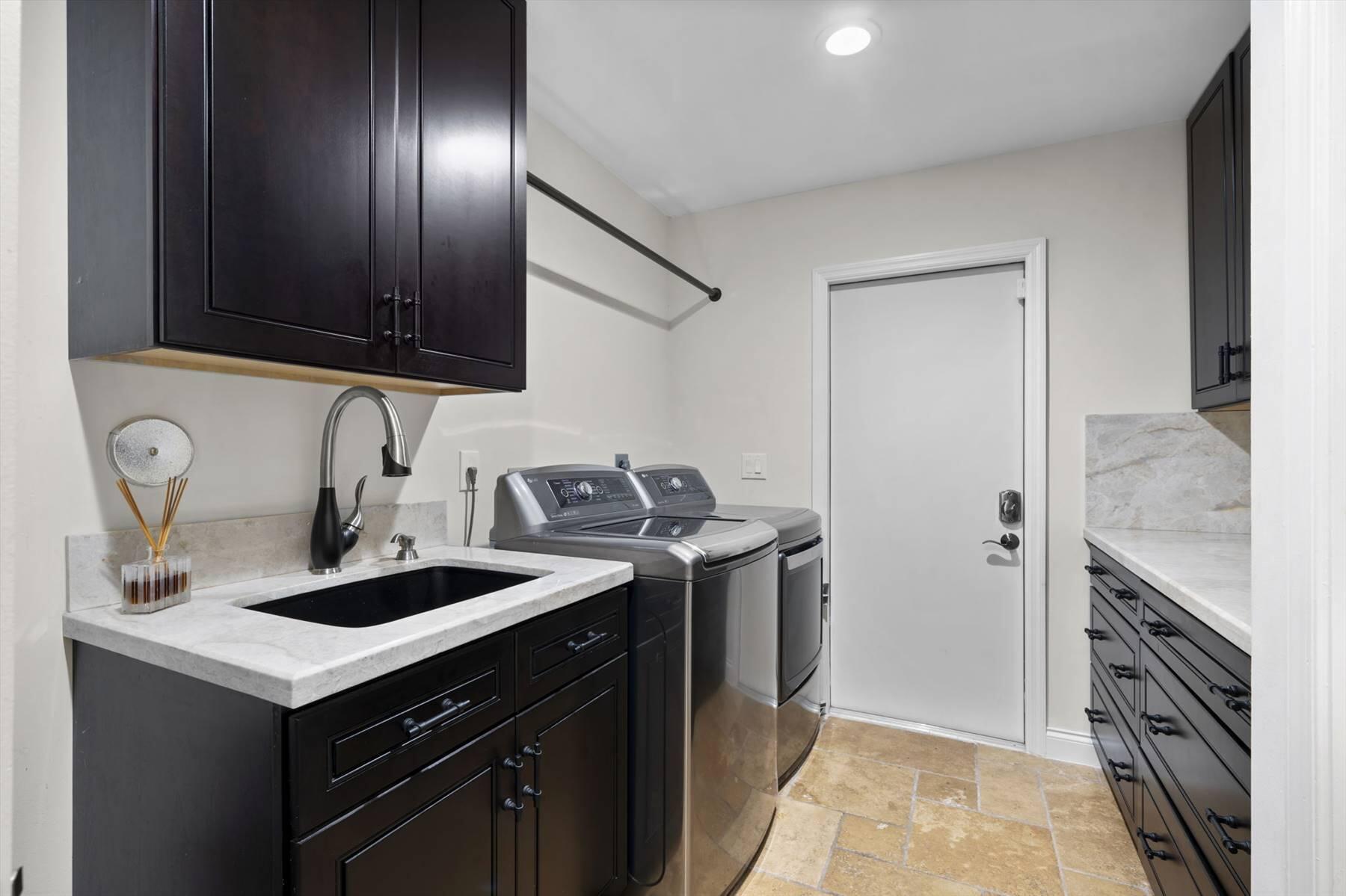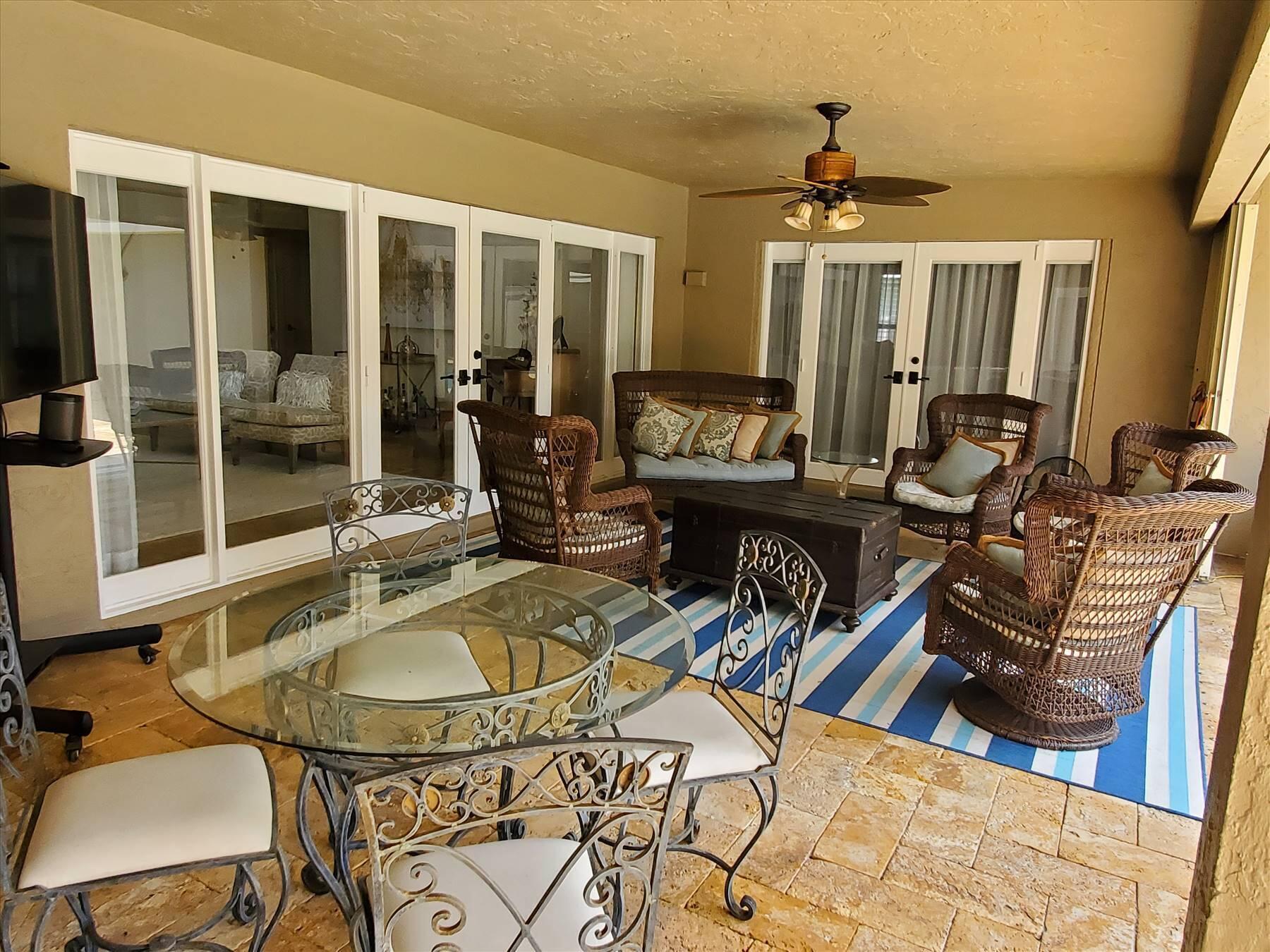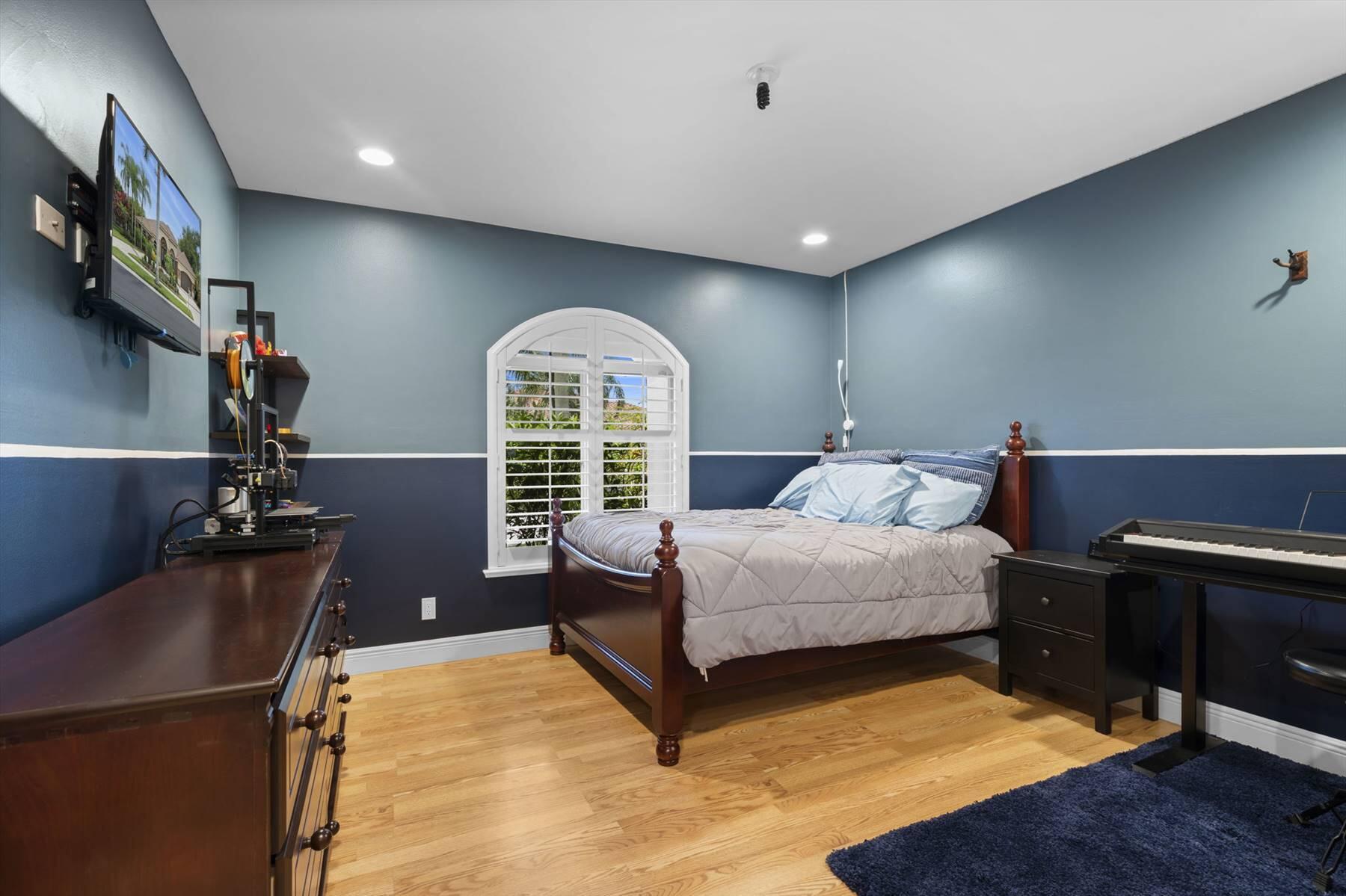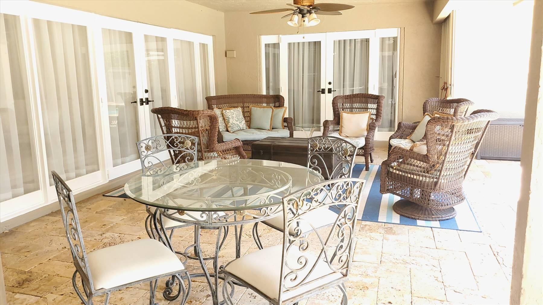 Luxurious 5BR 4BA single story residence in highly sought after Palm Island! This stunning, updated home sits on a large private corner lot with a fully fenced yard w/pool w/new salt system, new pool pump, newer travertine deck, a newly resurfaced basketball court, a dog run and generous covered patio, perfect for outdoor entertaining. Newly painted French doors and walls, exquisite travertine marble flooring in living areas, gorgeous high-end eat-in kitchen w/bench seating, upgraded solid wood cabinetry, stainless steel Thermador appliances, quartzite countertops and generous walk-in pantry. The primary bathroom has marble flooring and a large shower w/endless hot water from new tankless systems. Cabana bathroom, tons of storage throughout w/ closet organizers and easy access attic.