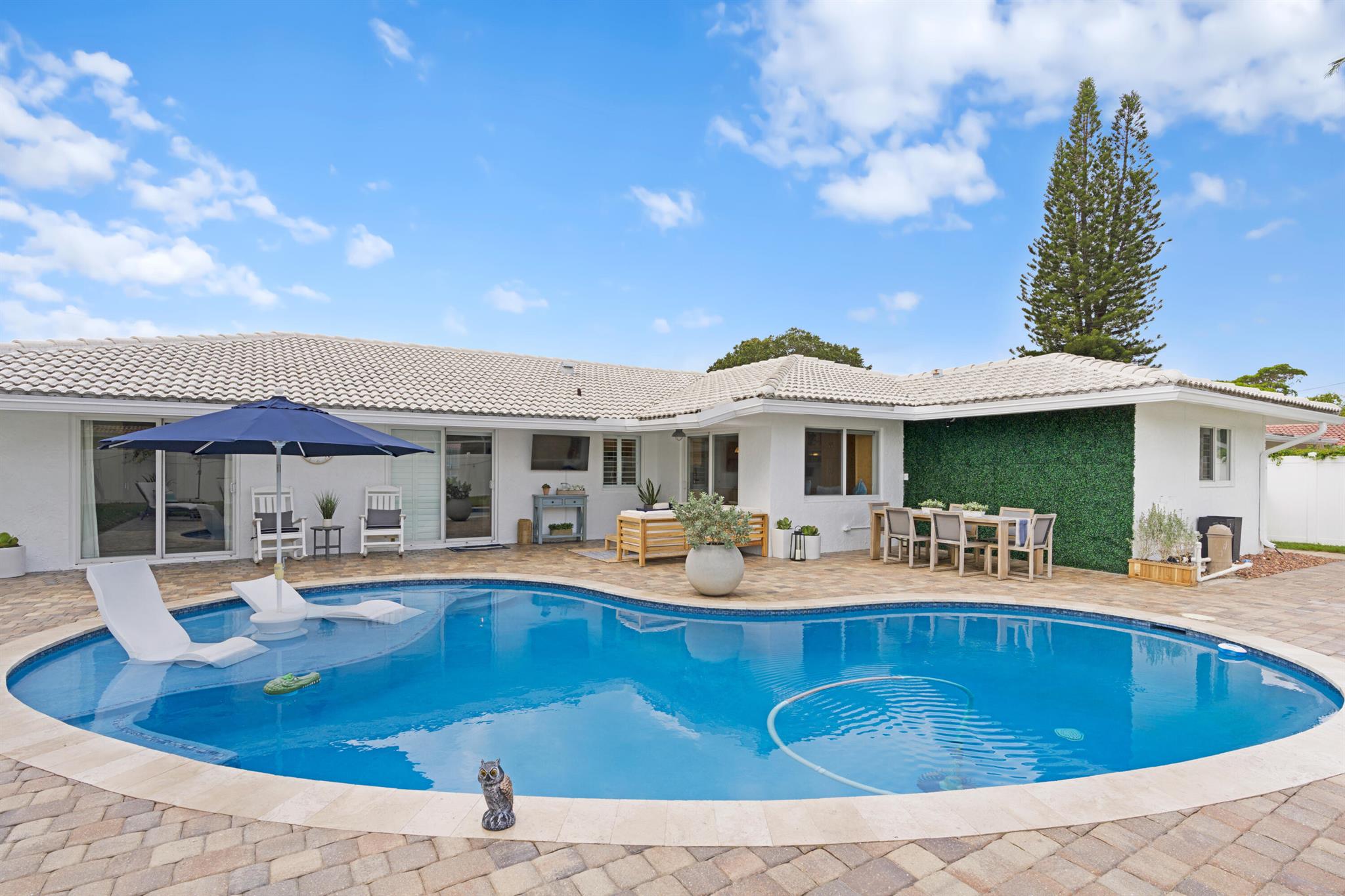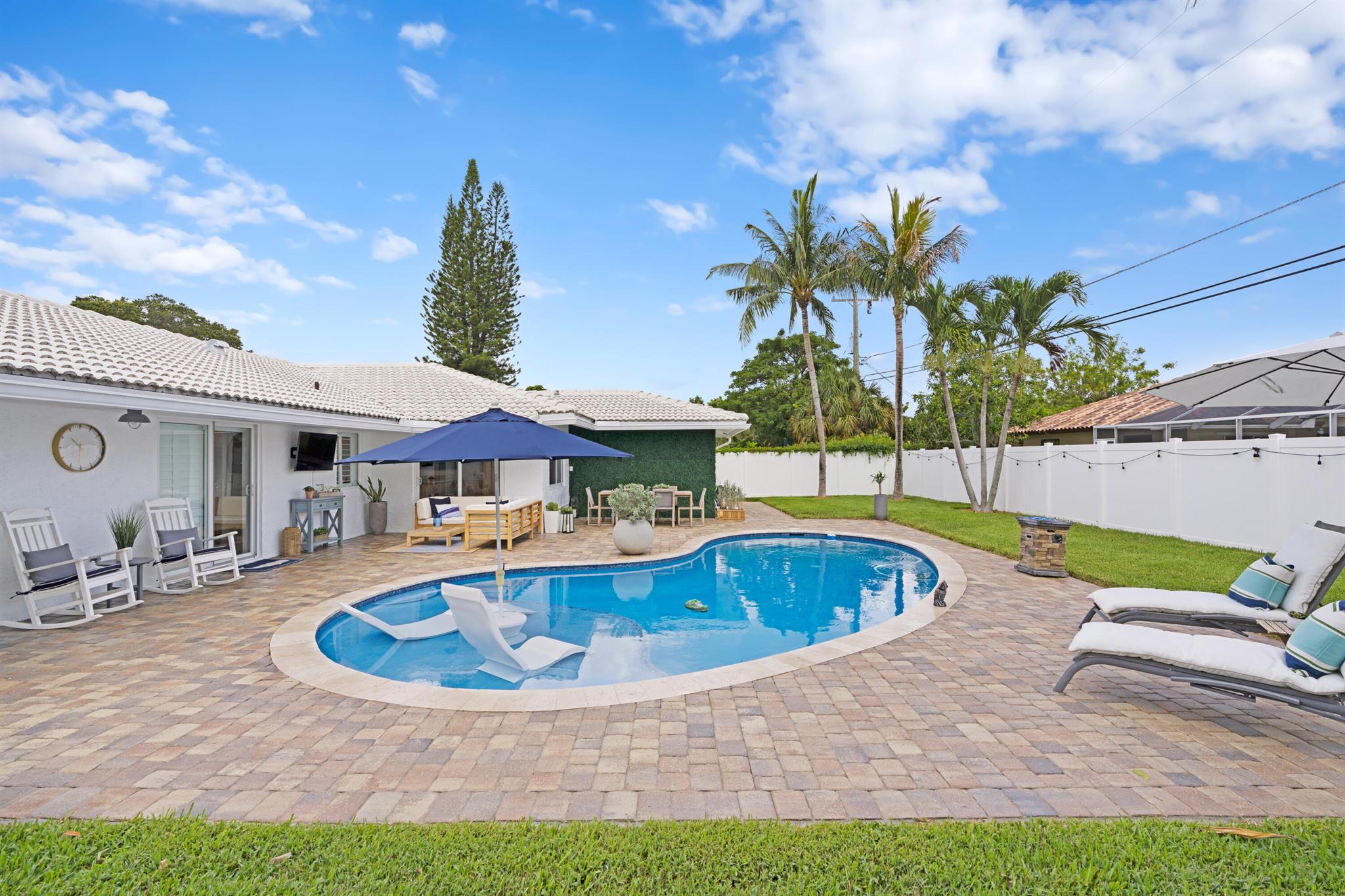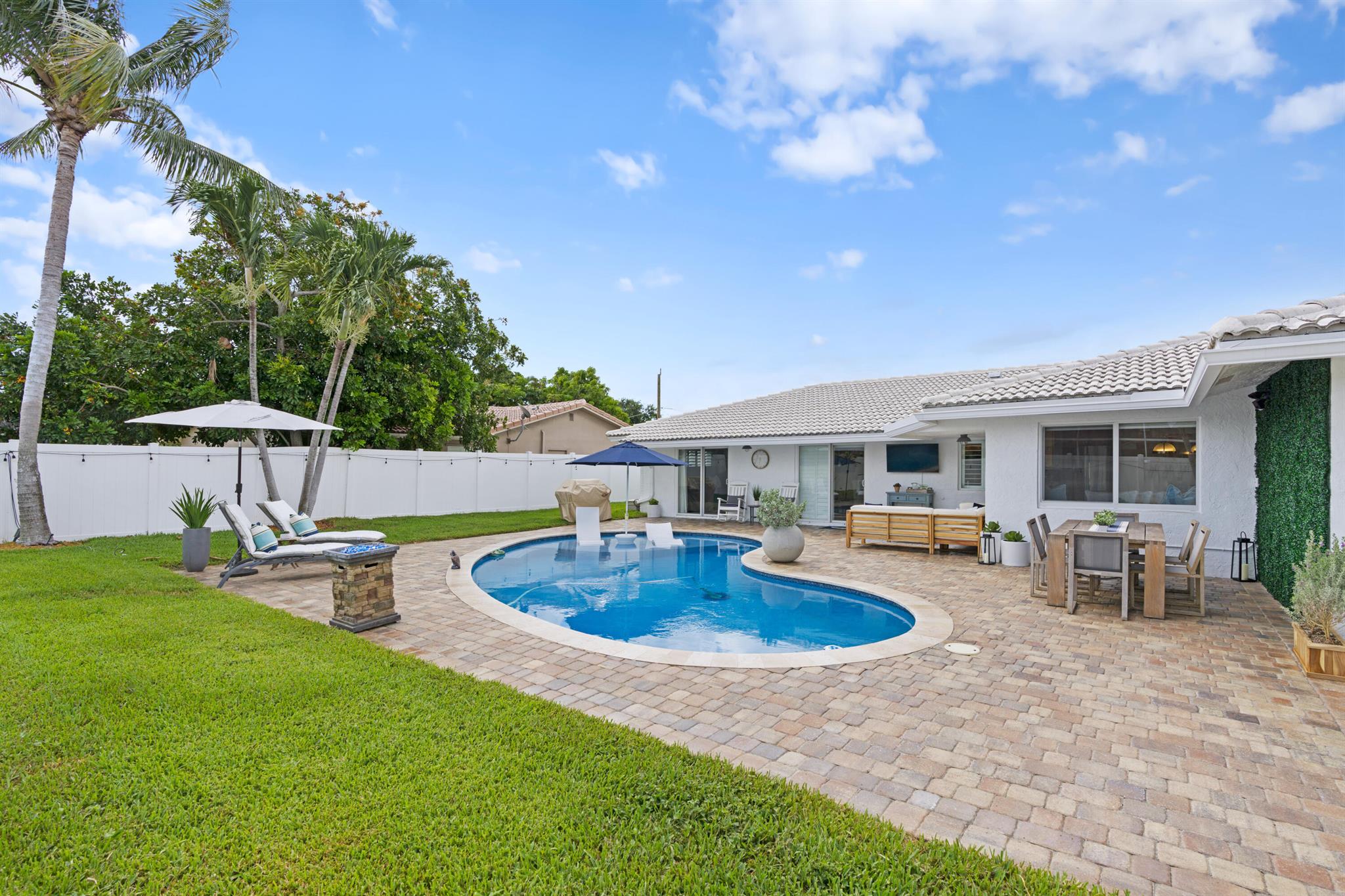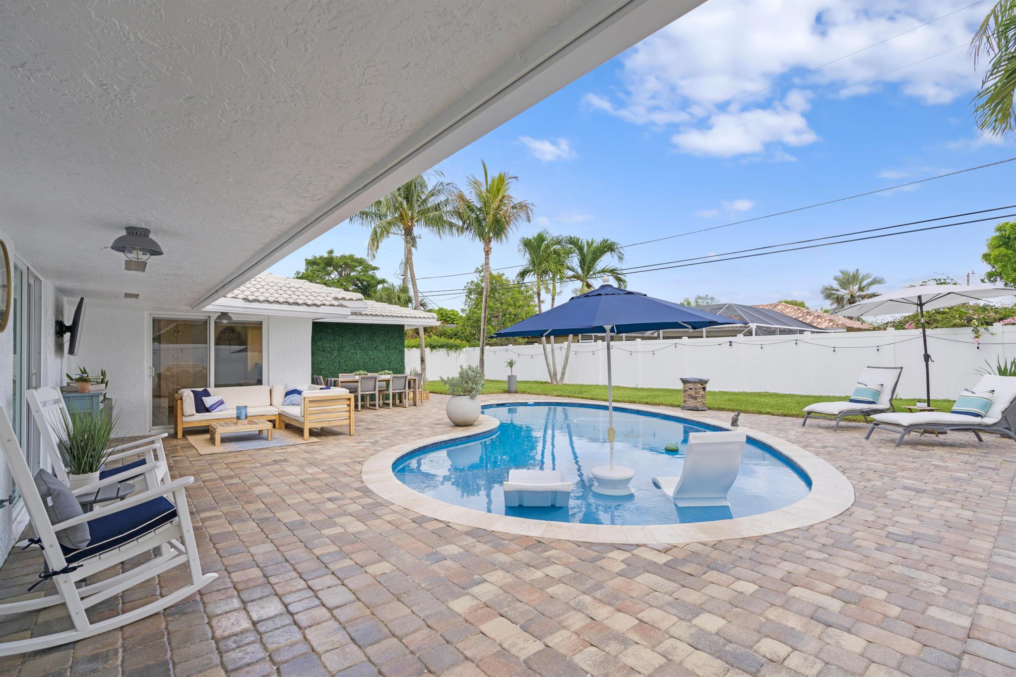 Gorgeous turnkey pool home in east Boca Raton with a completely fenced in yard on a large lot. This 3/2 home has been updated with a new primary bedroom and bathroom, custom barn doors, a walk-in closet with custom built-ins and all new flooring (2021). The primary bath was completely renovated with double sinks, quartz countertops, shiplap and separate walk-in shower with a custom quartz built-in bench. The interior has been freshly painted with new moldings, baseboards, new ceiling fans throughout, all new a/c ducts (2023), new hardware throughout, new flooring in all the bedrooms and a new full-size washer/dryer inside. Water softener system (2021) and new AC (2019). The updated large extended eat-in kitchen with granite countertops, an oversized island, custom maple cabinetry with