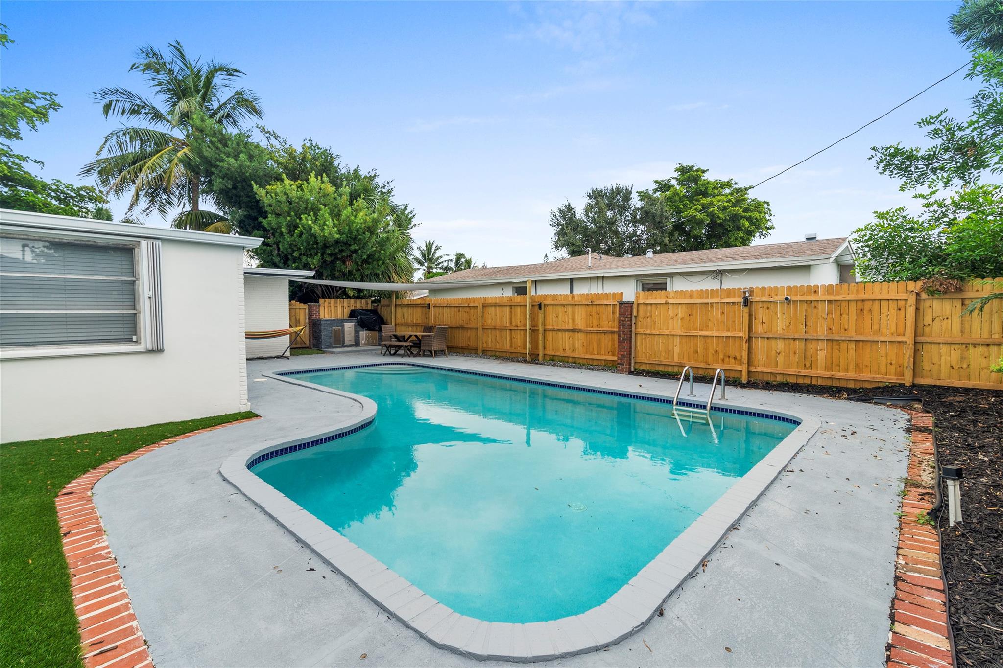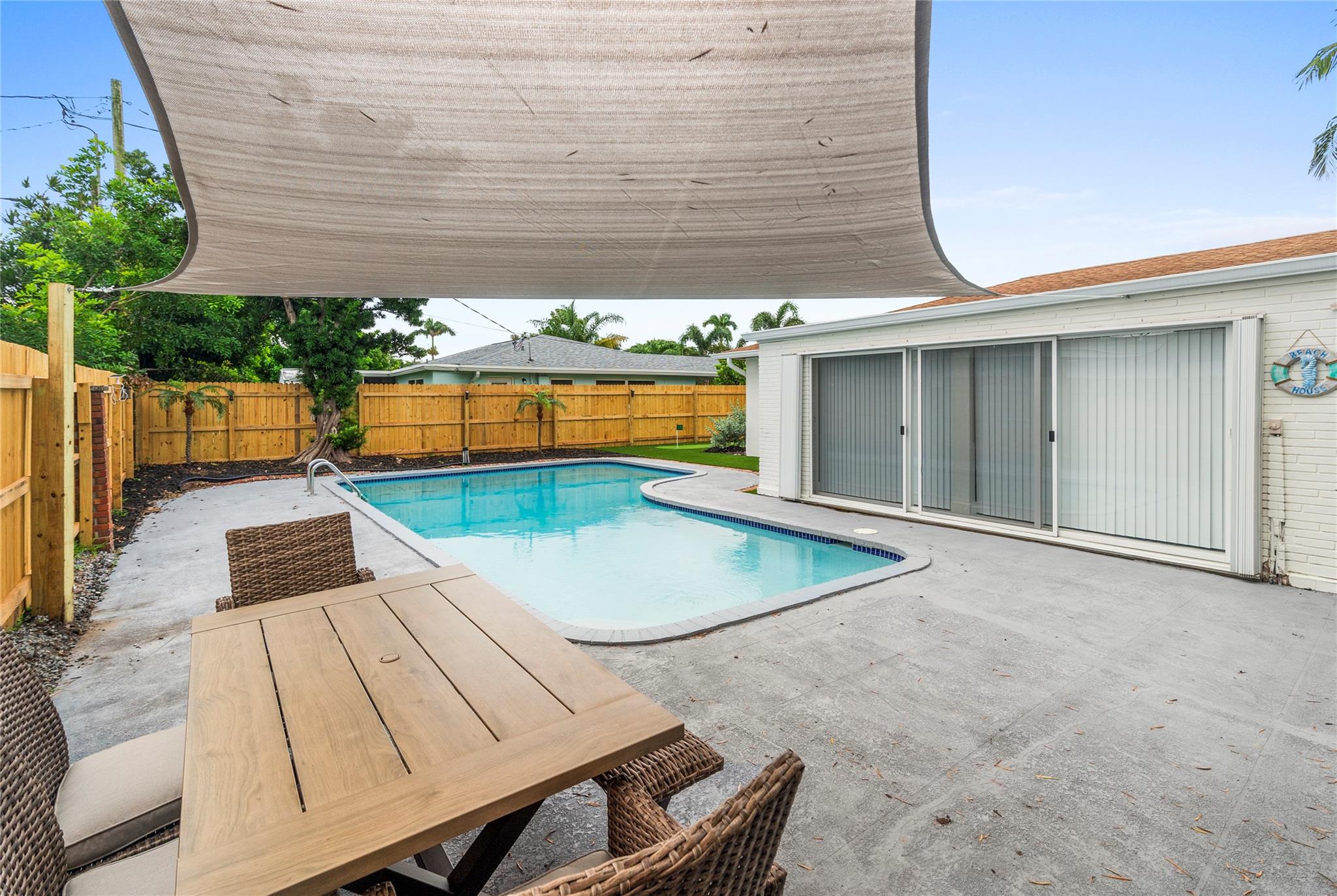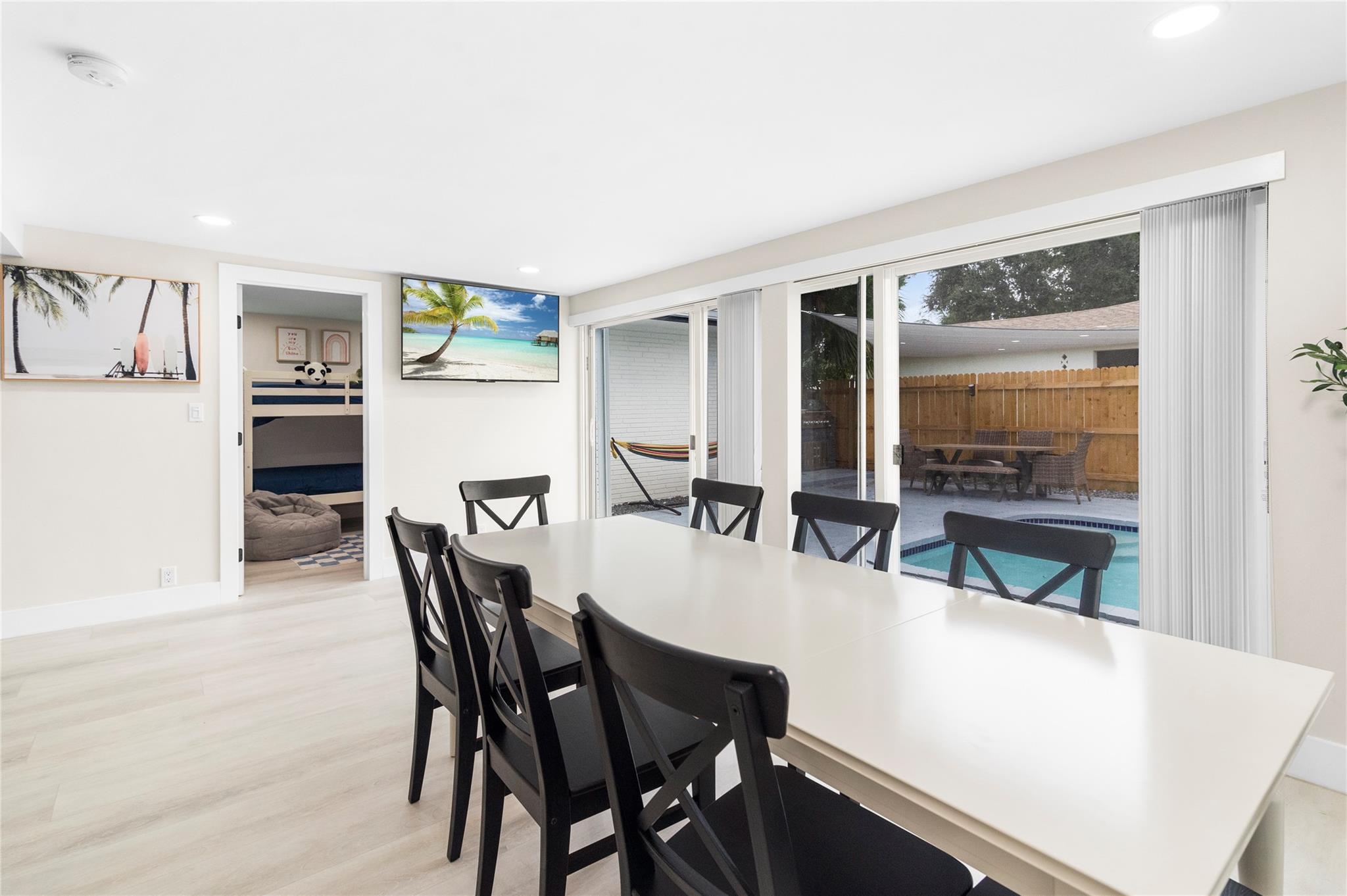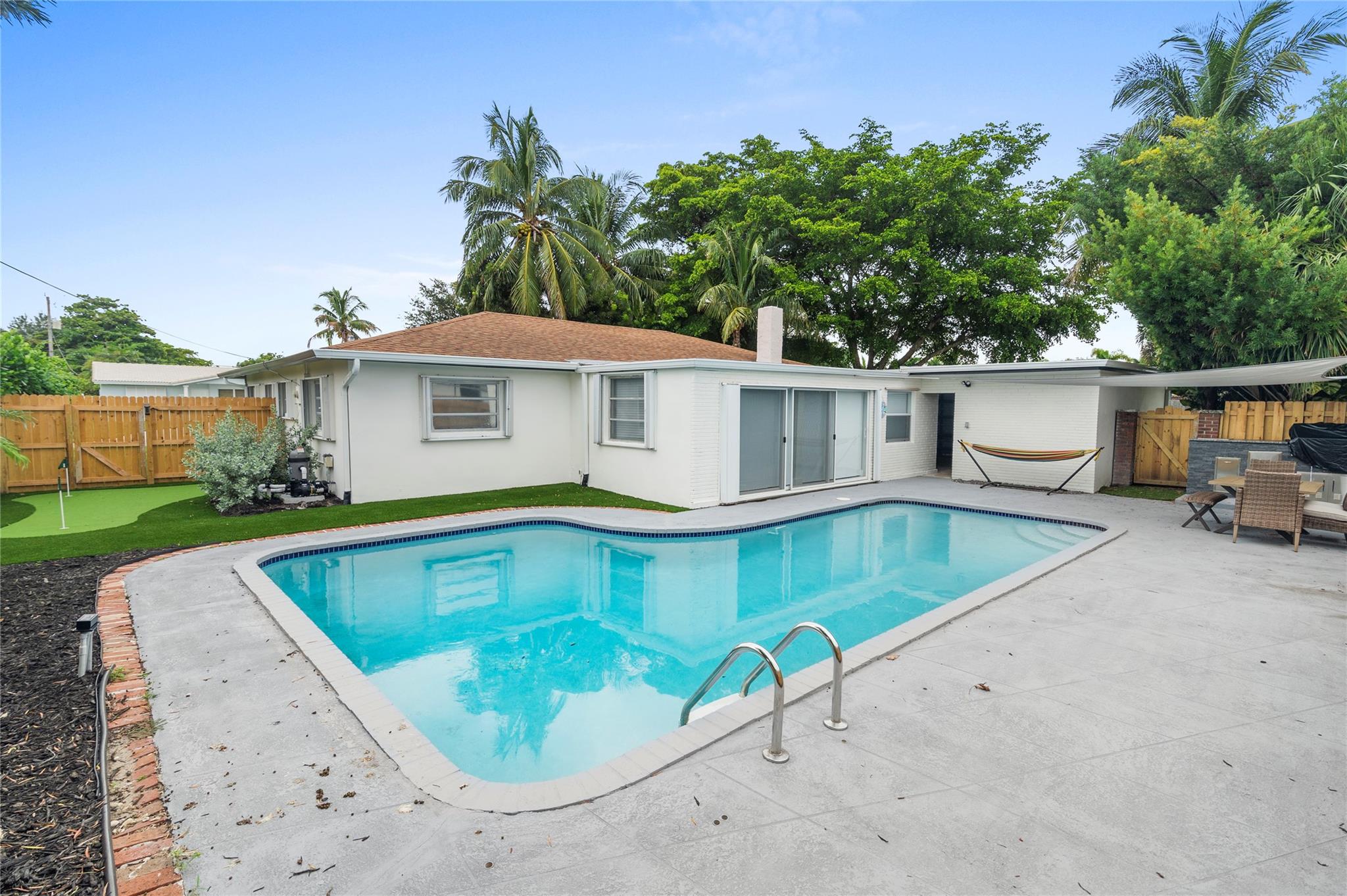 Beautifully renovated ranch-style home. Safe, family-friendly vibrant community. Fully renovated as of 2023 and is an ideal turn-key investment opportunity. Property comes fully furnished and stocked for immediate Airbnb use. Air-temperature pool with removable security fence, 3-hole putting green, shaded canopy, fully fenced backyard and two gated entrances. Primary features a private bathroom with walk-in shower and rainfall showerhead; secondary bathroom has a soaking tub. Open-concept living room offers indoor/outdoor living with direct access to both the patio and kitchen/dining room. Updated kitchen with new cabinets, soft-close drawers and doors, quartz counters and a breakfast bar that seats 3. Whether you’re looking to make this your home or a lucrative investment property