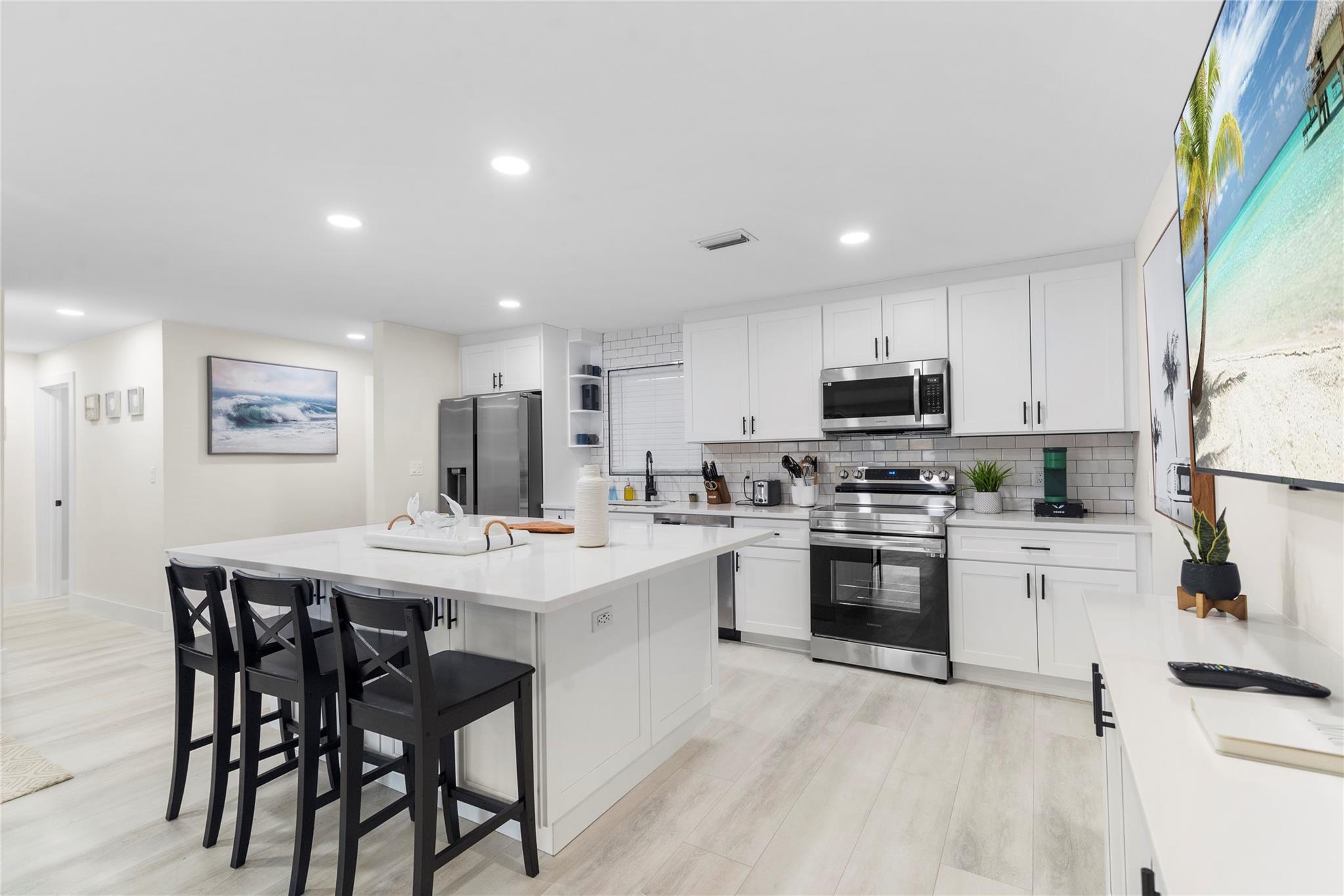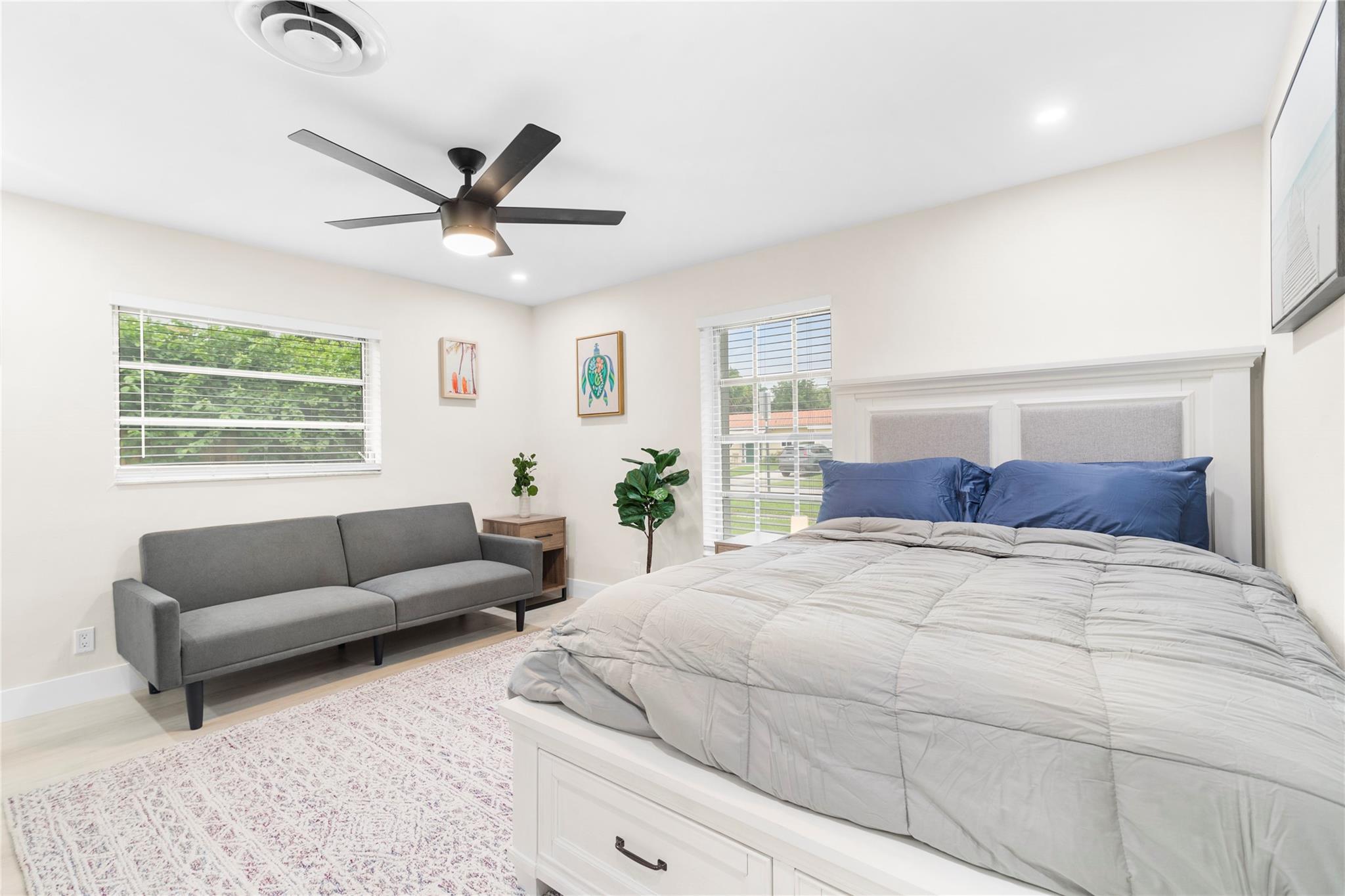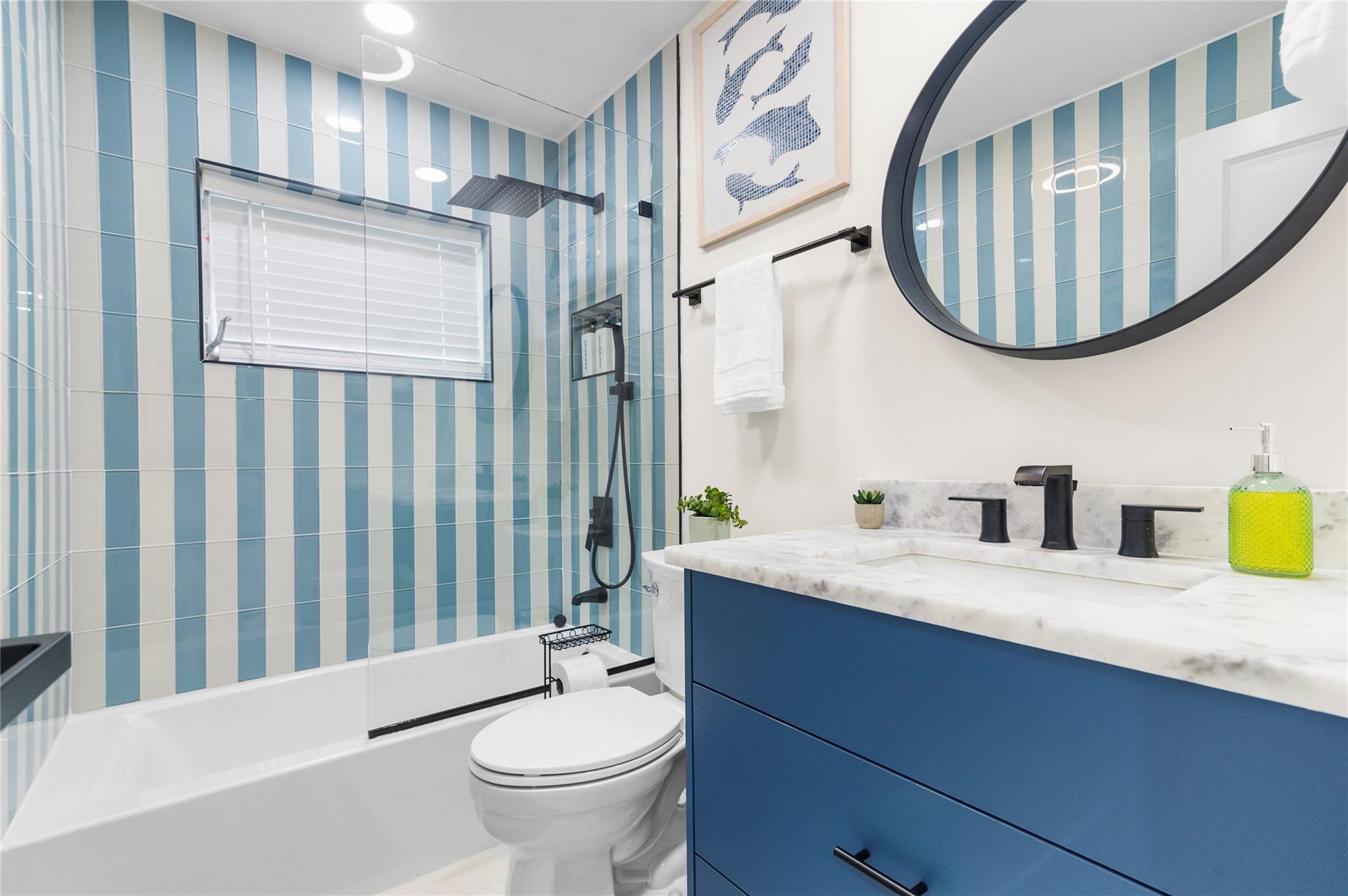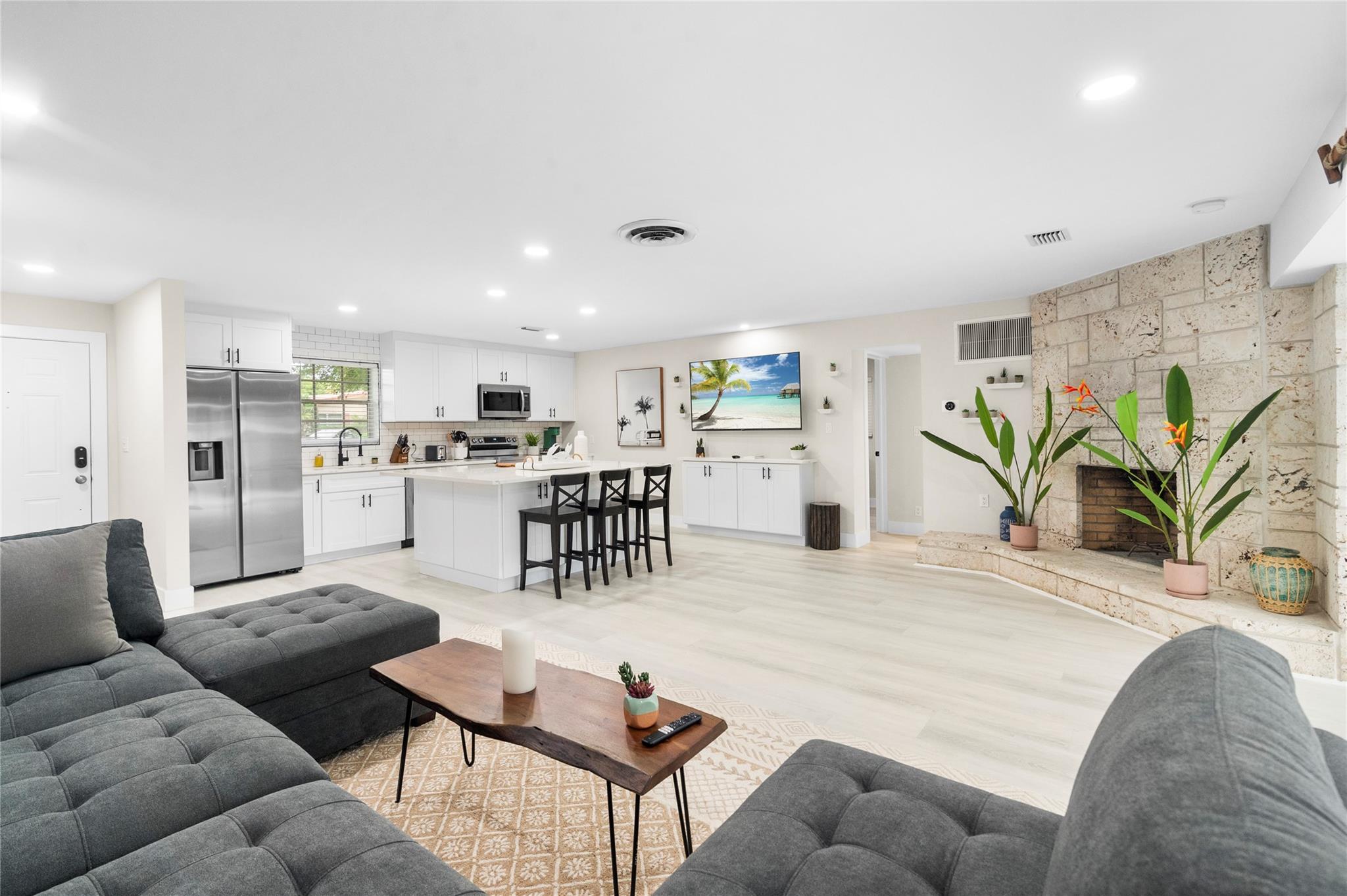 Beautifully renovated ranch-style home. Safe, family-friendly vibrant community. Fully renovated as of 2023 and is an ideal turn-key investment opportunity. Property comes fully furnished and stocked for immediate Airbnb use. Air-temperature pool with removable security fence, 3-hole putting green, shaded canopy, fully fenced backyard and two gated entrances. Primary features a private bathroom with walk-in shower and rainfall showerhead; secondary bathroom has a soaking tub. Open-concept living room offers indoor/outdoor living with direct access to both the patio and kitchen/dining room. Updated kitchen with new cabinets, soft-close drawers and doors, quartz counters and a breakfast bar that seats 3. Whether you’re looking to make this your home or a lucrative investment property