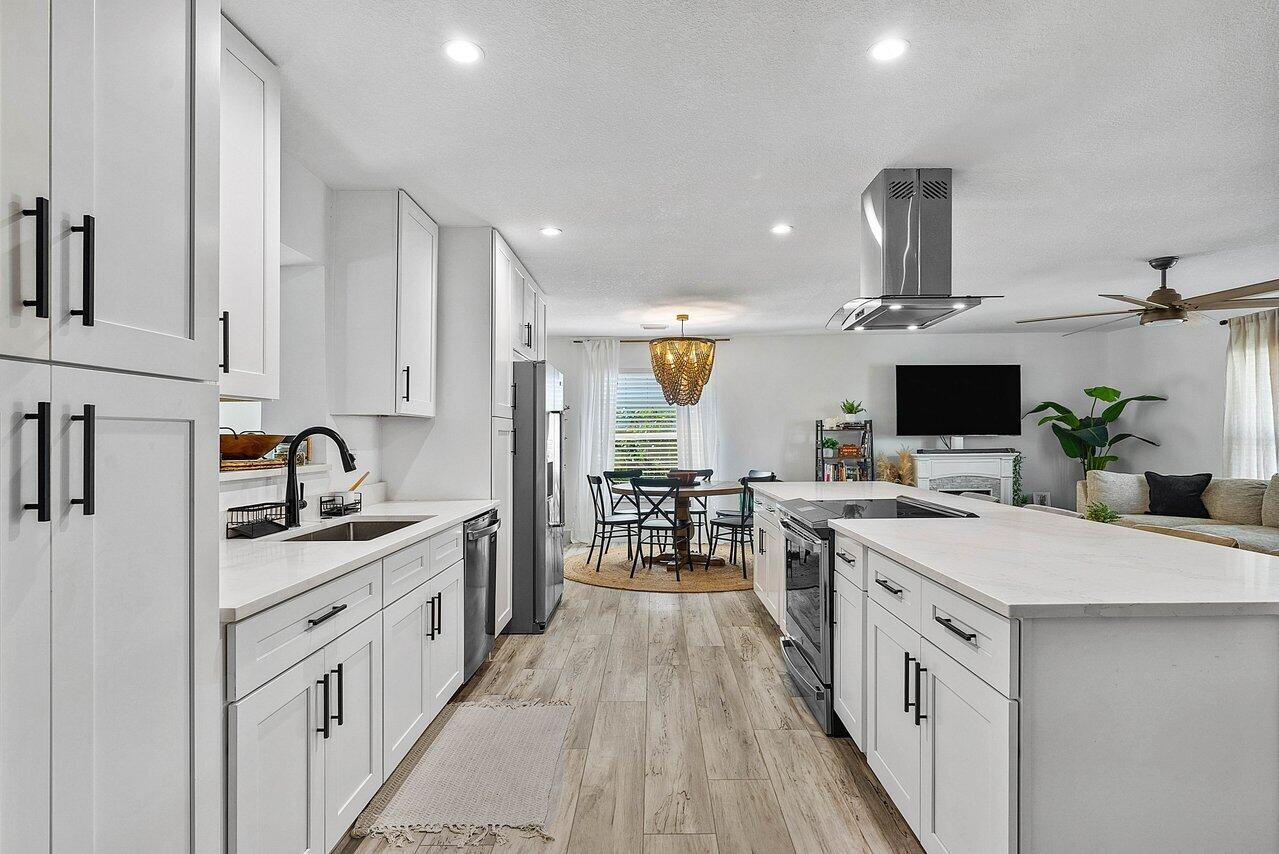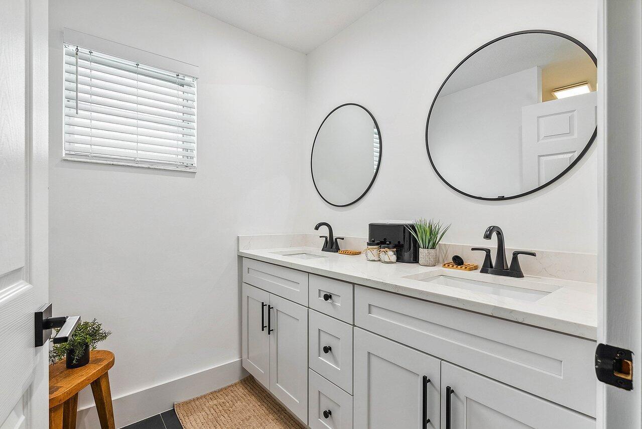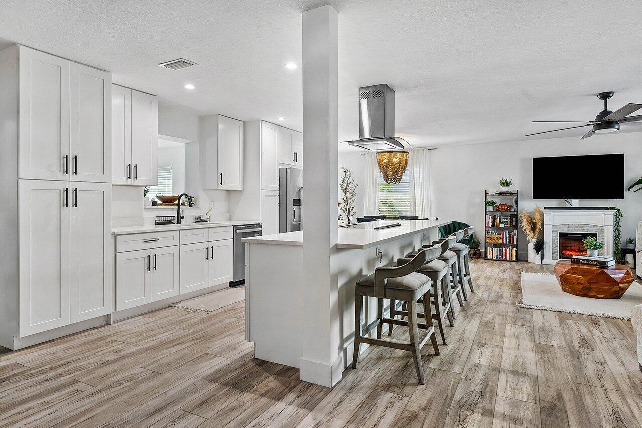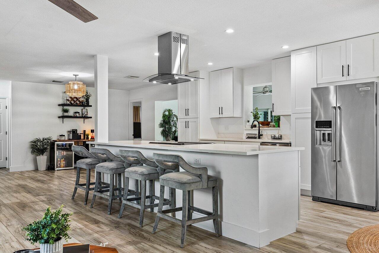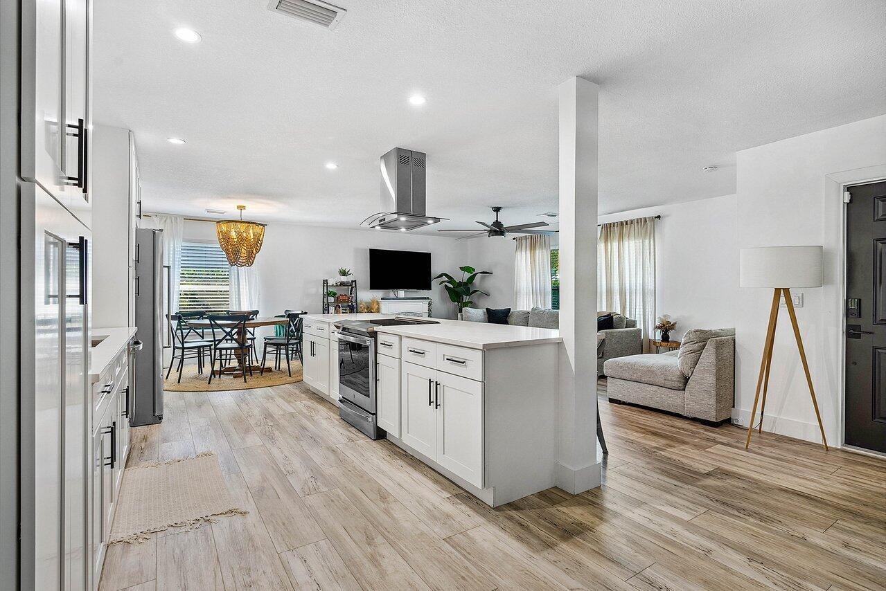 Welcome to paradise! This meticulously remodeled 3-bedroom, 2-bathroom CBS block home with 6 year old roof is a vision of modern luxury. Step inside and be greeted by the elegance of white shaker cabinets and quartz countertops, accented with sleek black matte finishes. Entertain with the newer smart range, dishwasher and enjoy other smart appliances including the washer and dryer. Every inch of this home has been meticulously cared for, evident in the attention to detail and showcased in the newer front and interior doors. Enjoy the comfort of luxury flooring complimented by newer tile throughout the home. Majority of the windows and doors are hurricane impact.