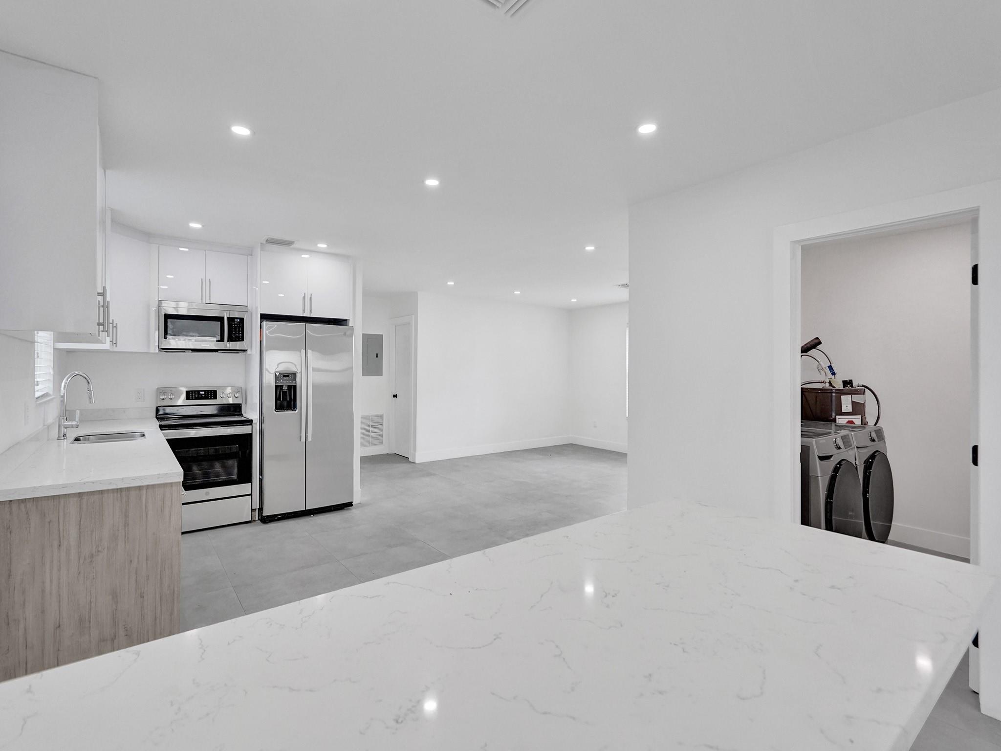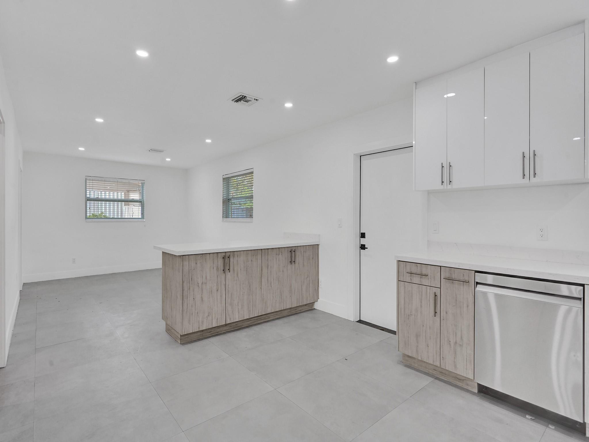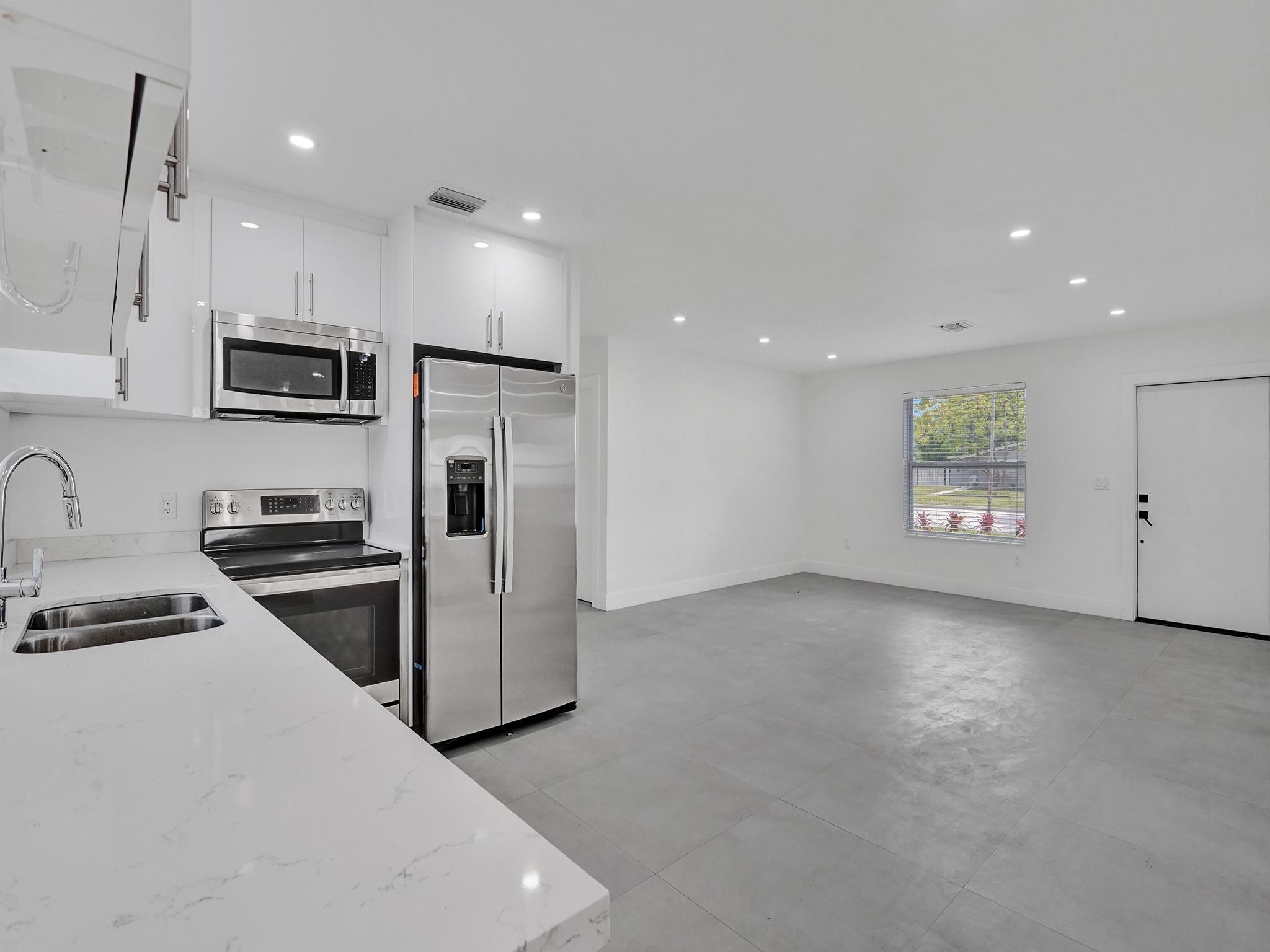 Single-family home 2 bedrooms 2 Bathrooms 2 Car garage (Converted to a room) Drivway and Large Fenced backyard with deck on the water. Completely renovated and upgraded (Modern Concept): New kitchen with quartz countertops New Backsplash, New stainless-steel appliances, laundry/Storage room with Full-size washer and Dryer, New Tile floors throughout, 50×50 porcelain, All new bathrooms, Frameless shower glasses Freshly painted inside and outside, New water heater, New Central AC, Tile floors in the Garage. Landscaping and more… Great location near, Shopping, Dining, and Transportation. NO HOA.
