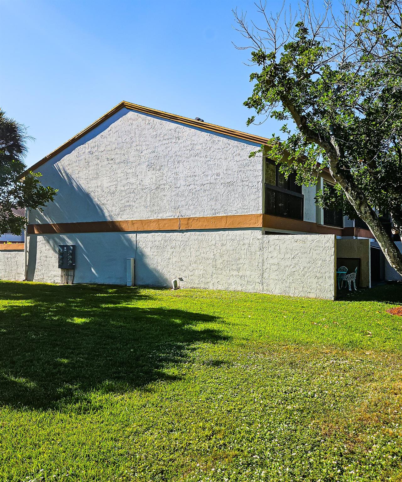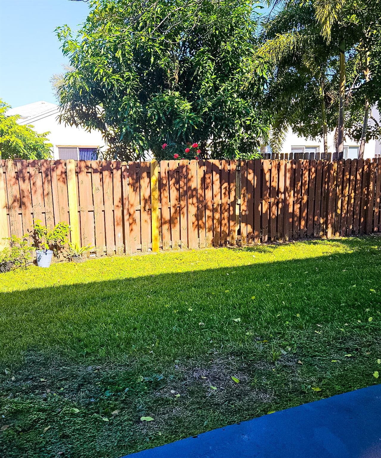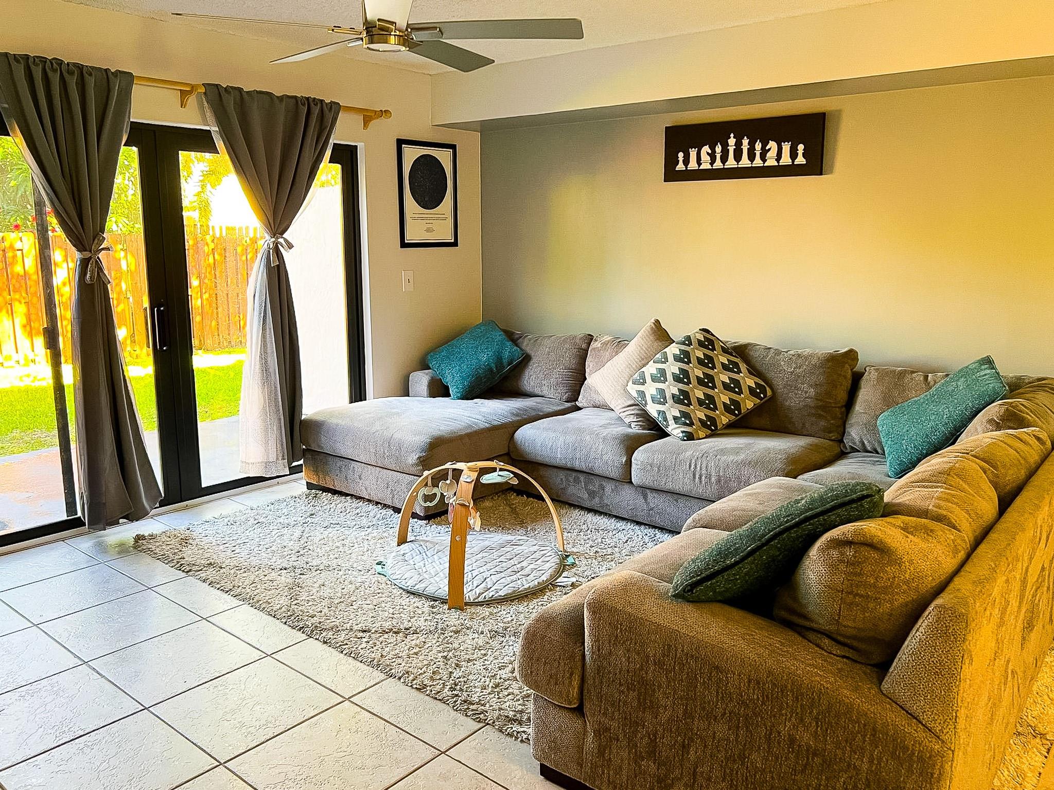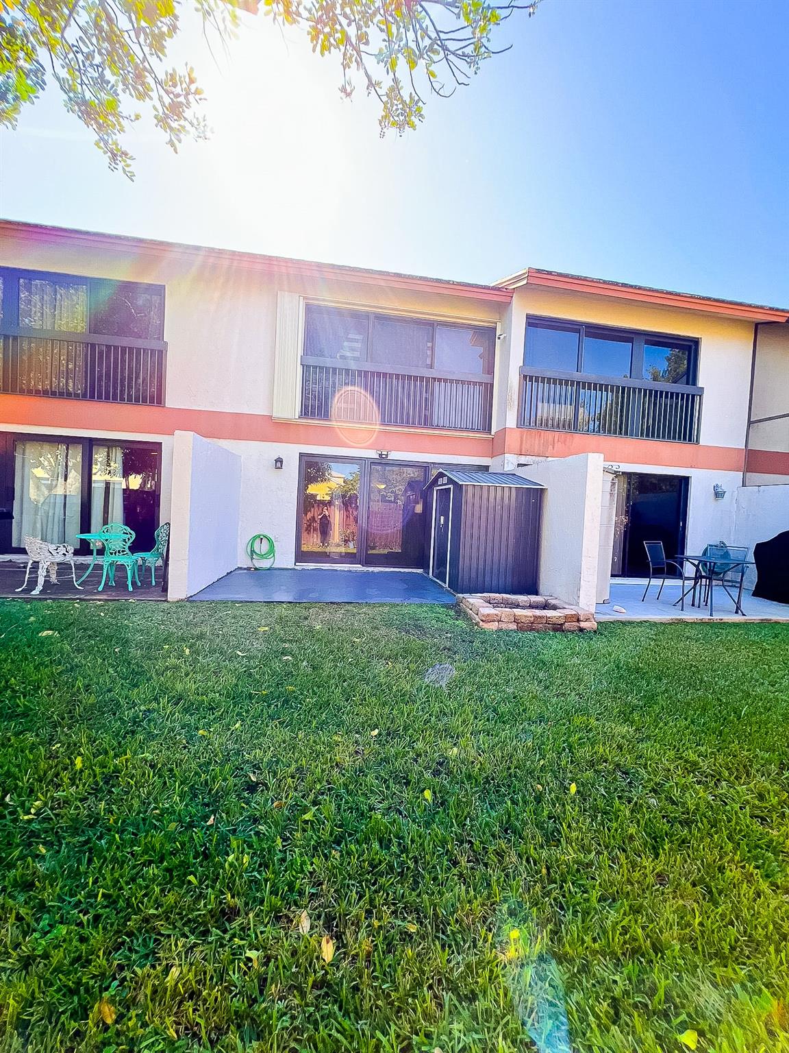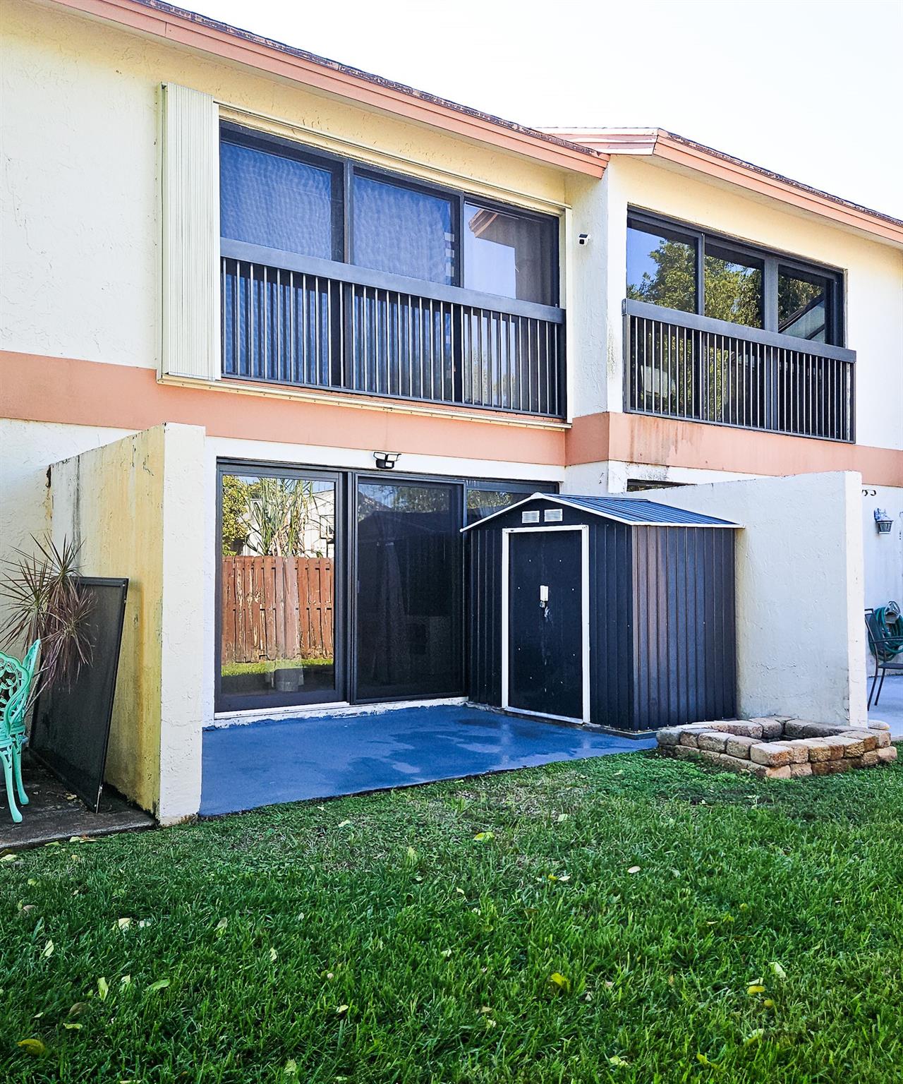 Modern conveniences include a smart fan with app control, a Nest thermostat, and accordion shutters with impact windows downstairs. Built in 1990 with durable masonry construction, this home also includes a laundry area and a private outdoor space with a shed.