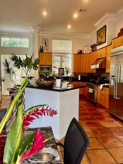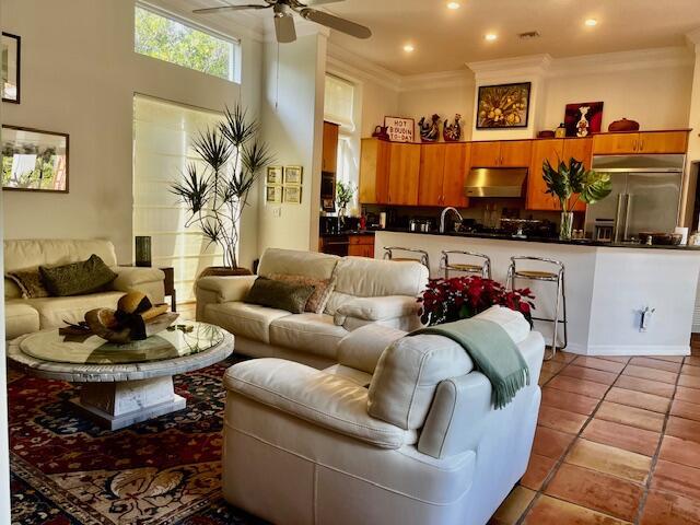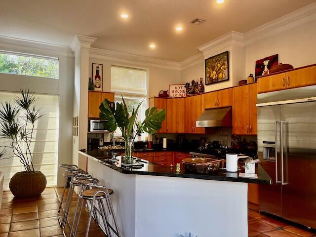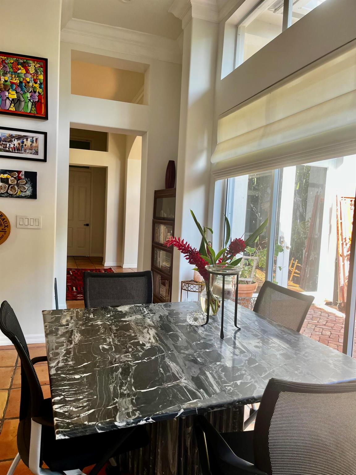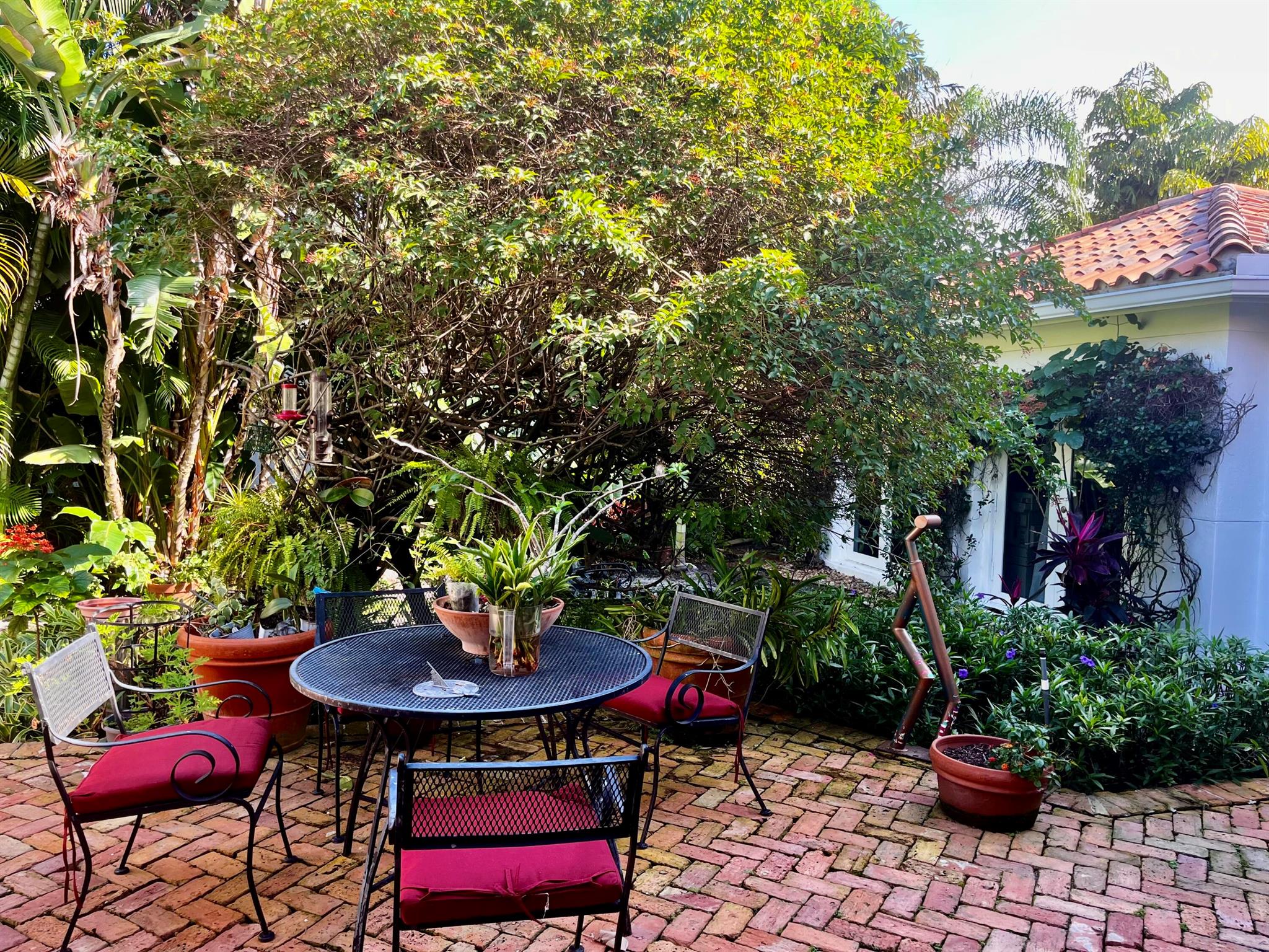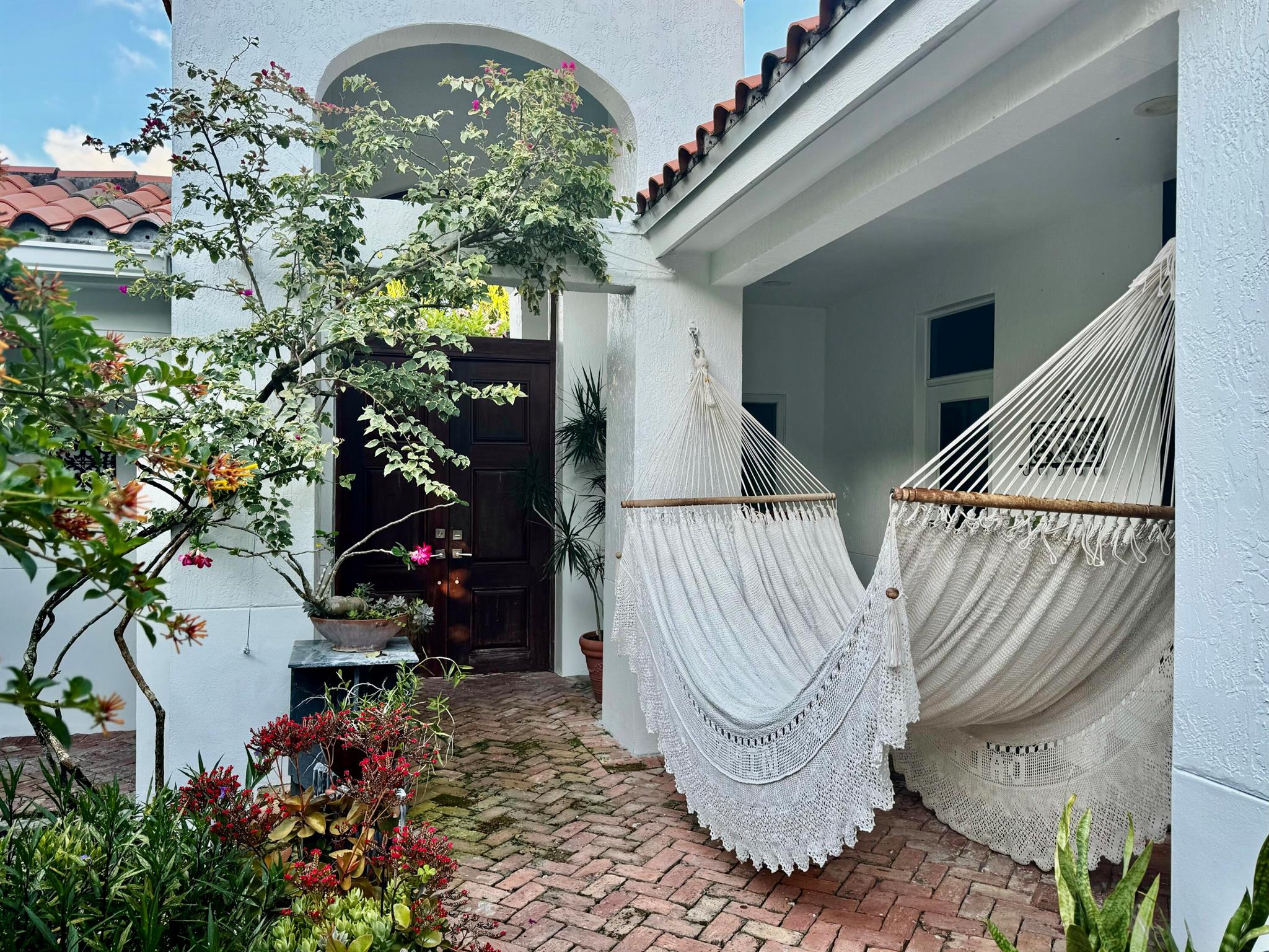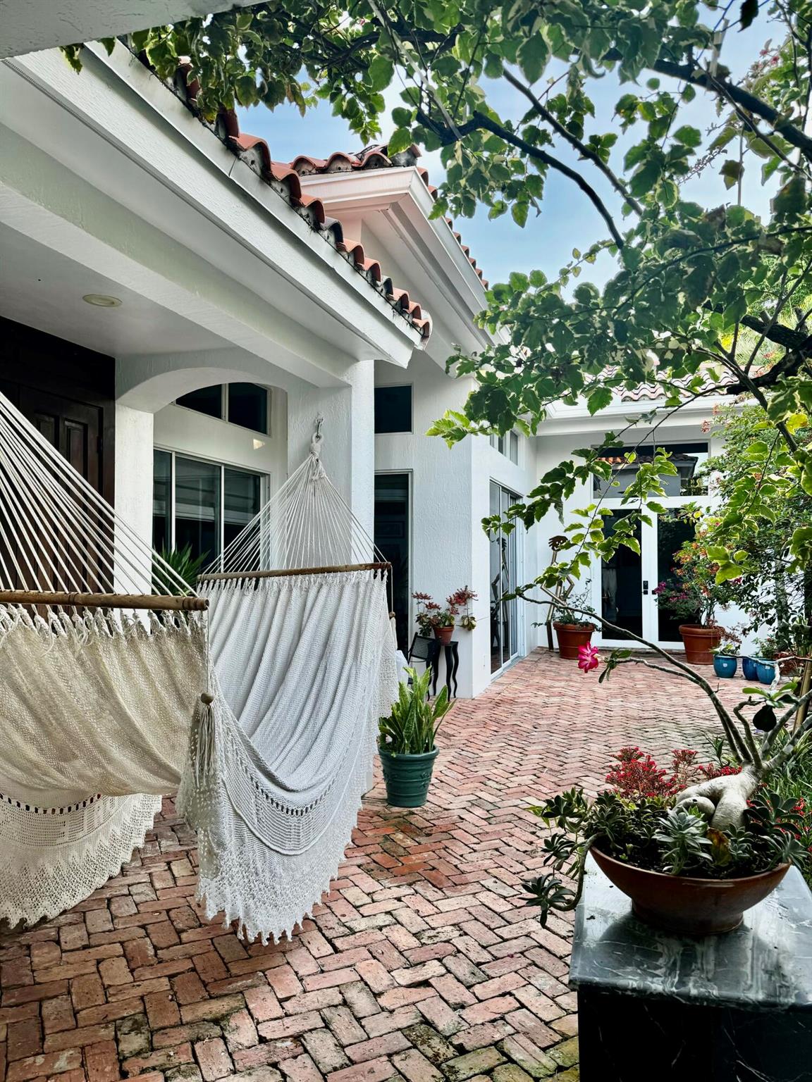 Amazing courtyard home in the exclusive gated community of the CLOISTERS with only 100 homes, near shops, restaurants and exceptional schools. This beautiful home features a mahogany front door, high ceilings, large windows, spacious rooms, a large kitchen with a Viking gas stove, a Kitchen Aide refrigerator, two sinks. A Beautiful M. bedroom and bathroom, a large dining room, a separate living room a breakfast area and a family room. Tile in the main areas and Brazilian Cherry hardwood floors in all the bedrooms. Custom closets, security alarm, 2 new tankless water heaters, Well maintained A/C, and a beautiful courtyard with lush landscaping. The 2 car garage has impact windows, a large closet, a storage area w/ a separate A/C and a The HOA fees of $125/month are the lowest in the area.