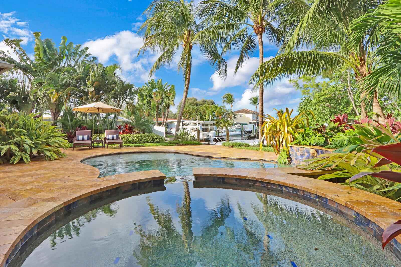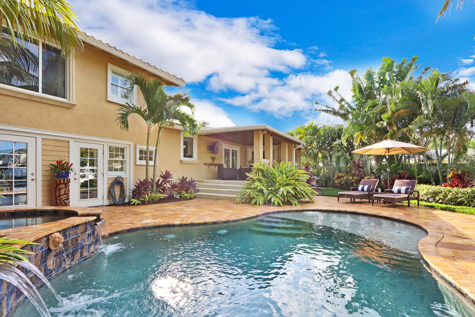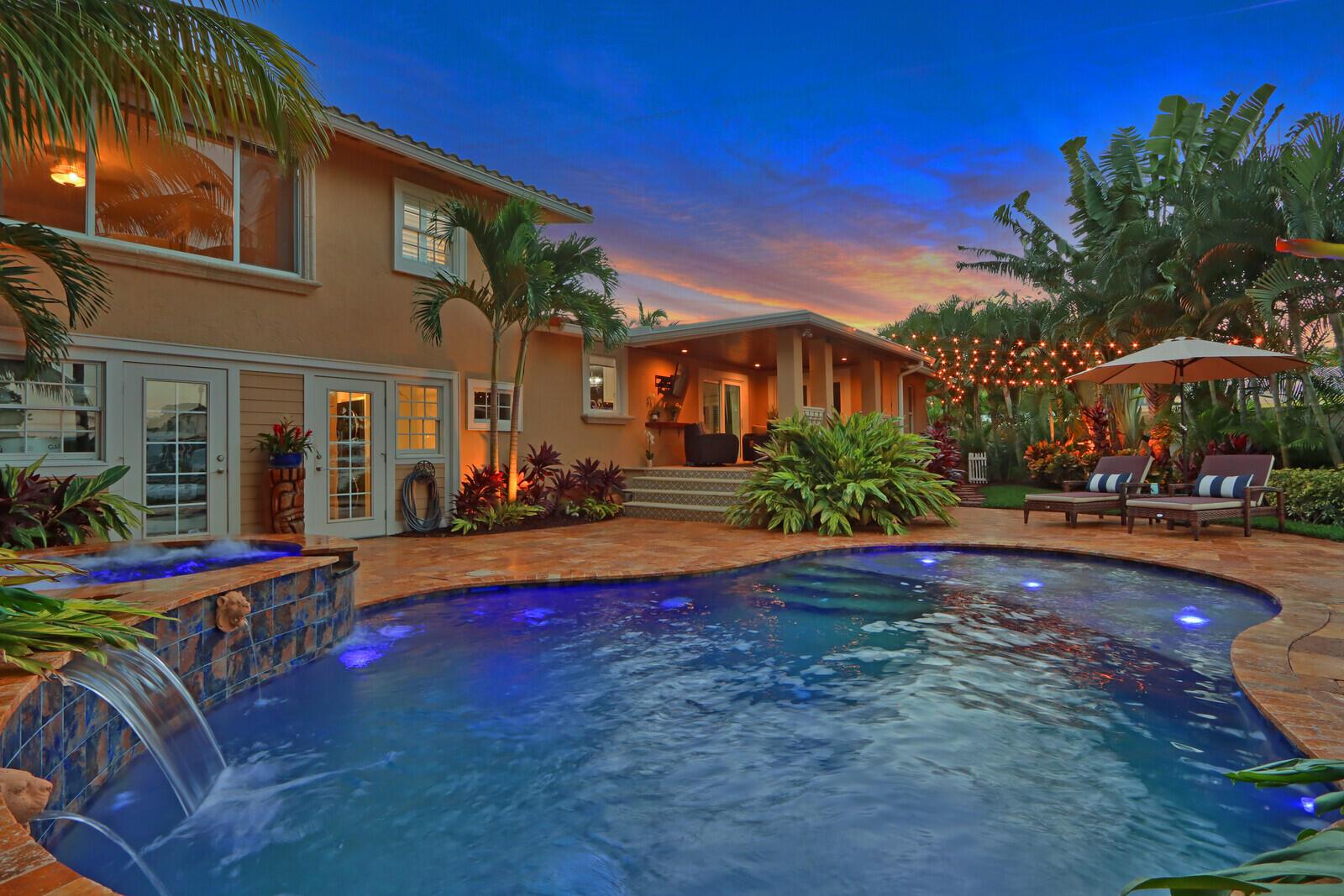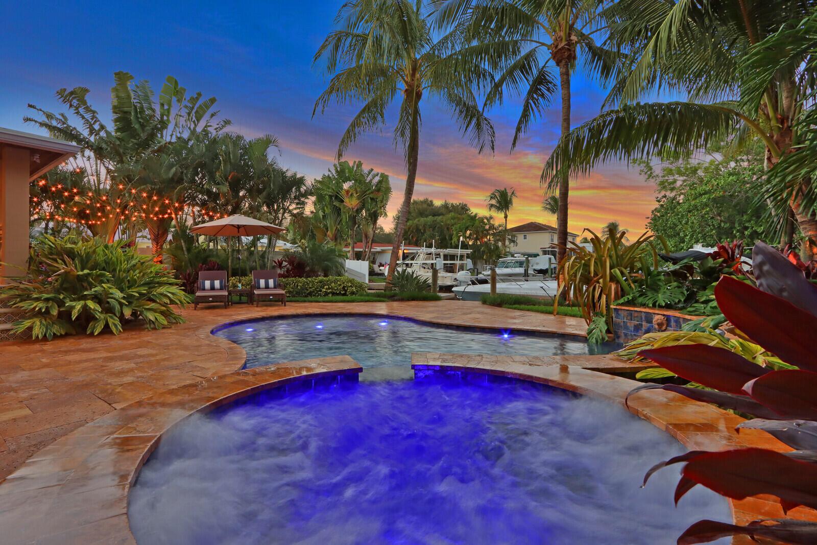 Welcome to your serene waterfront oasis! This exquisitely remodeled home, available furnished or unfurnished, offers an unparalleled living experience. With an expansive 2,400 sq ft layout featuring 3 bedrooms, 3 full bathrooms and an office, this home is a testament to modern living. The heart of this residence is its breathtaking exterior, a beautiful heated pool and hot tub surrounded by professional landscaping invites serene moments, while the private dock with lift beckons boating enthusiasts with no fixed bridges. Imagine docking your boat or parking your RV right on your property, the ultimate convenience. Nestled in a prime location, you’re just minutes from the beach, the best restaurants and all the shopping PBG has to offer! Including a tiki bar w a pool table, it’s perfect!