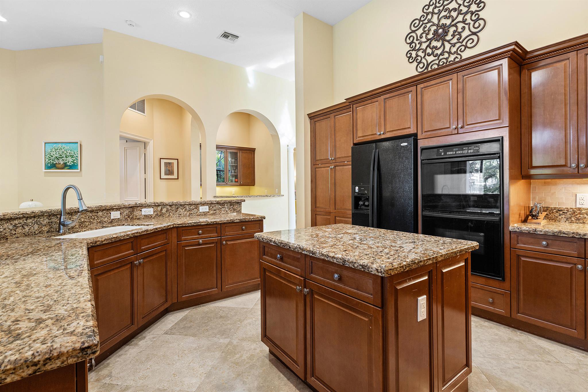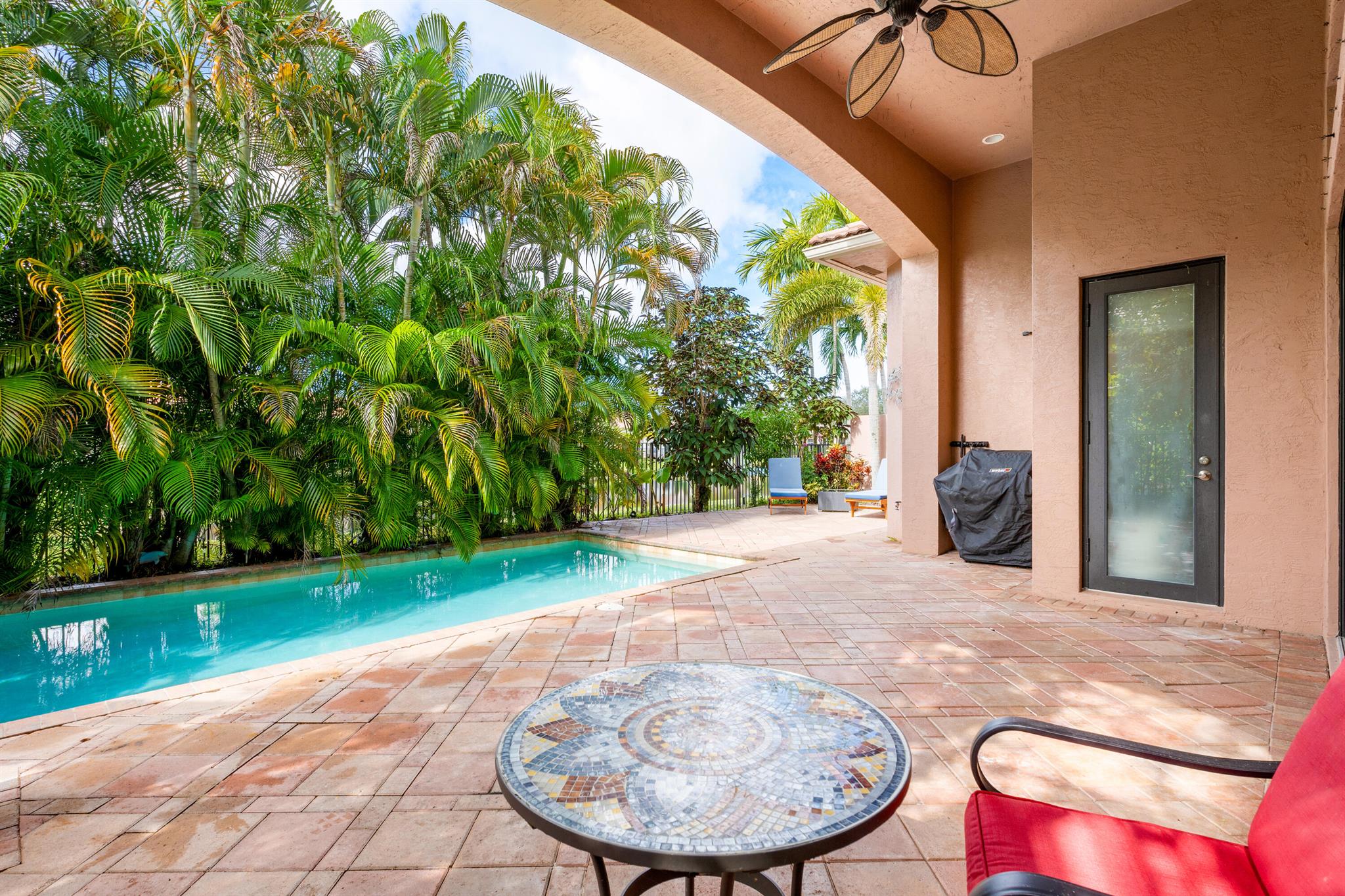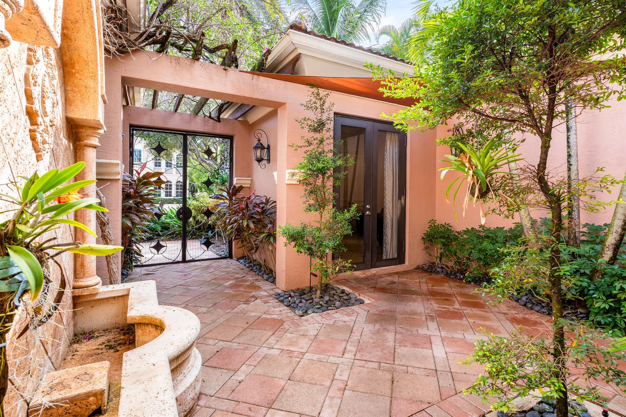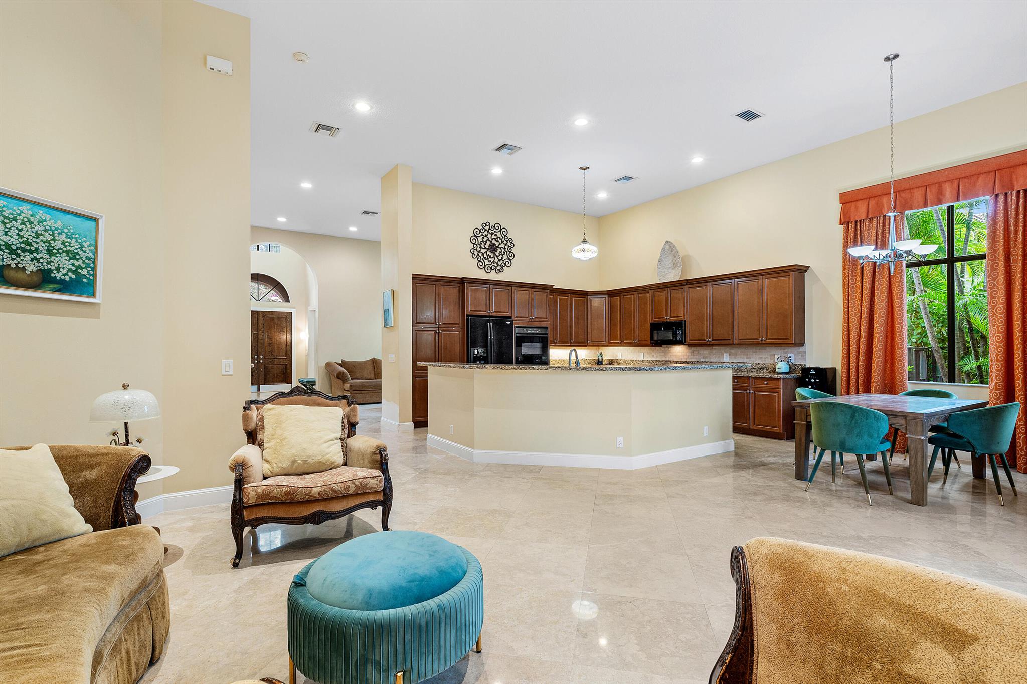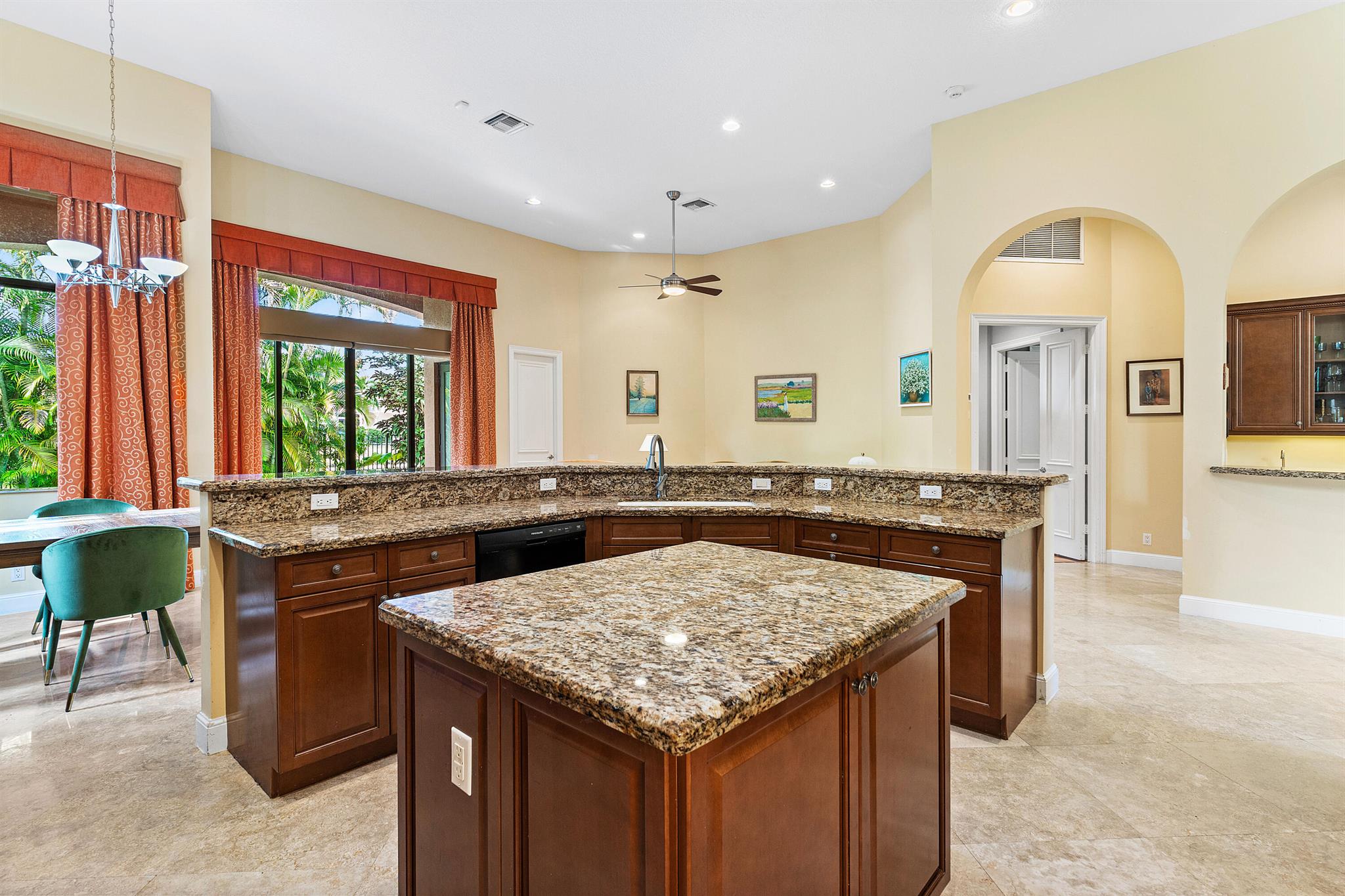Extremely Motivated Seller!!!! This charming Martinique is on a prime private lake lot and features 3 en-suite bedrooms plus a library/4th bedroom, 3 full and 1 half baths – all on one single level, w/ a triple-split floor plan including a private guest house. Highlights include marble floors thru-out the main living areas, wood floors in the office, a gourmet chef’s kitchen with wood cabinetry, granite countertops, & is open to a spacious family room. Designer appointments include architectural millwork, light fixtures, and artistic details. The primary features dual walk-in closets, and a luxurious primary bath w/ separate vanities including a makeup vanity. With a heated pool surrounded by tropical landscaping, enjoy unmatched privacy and style in this lakefront gem!