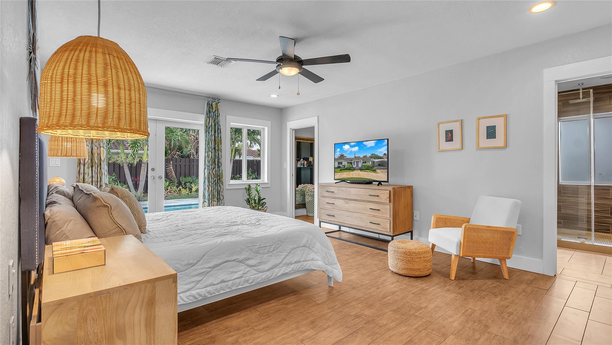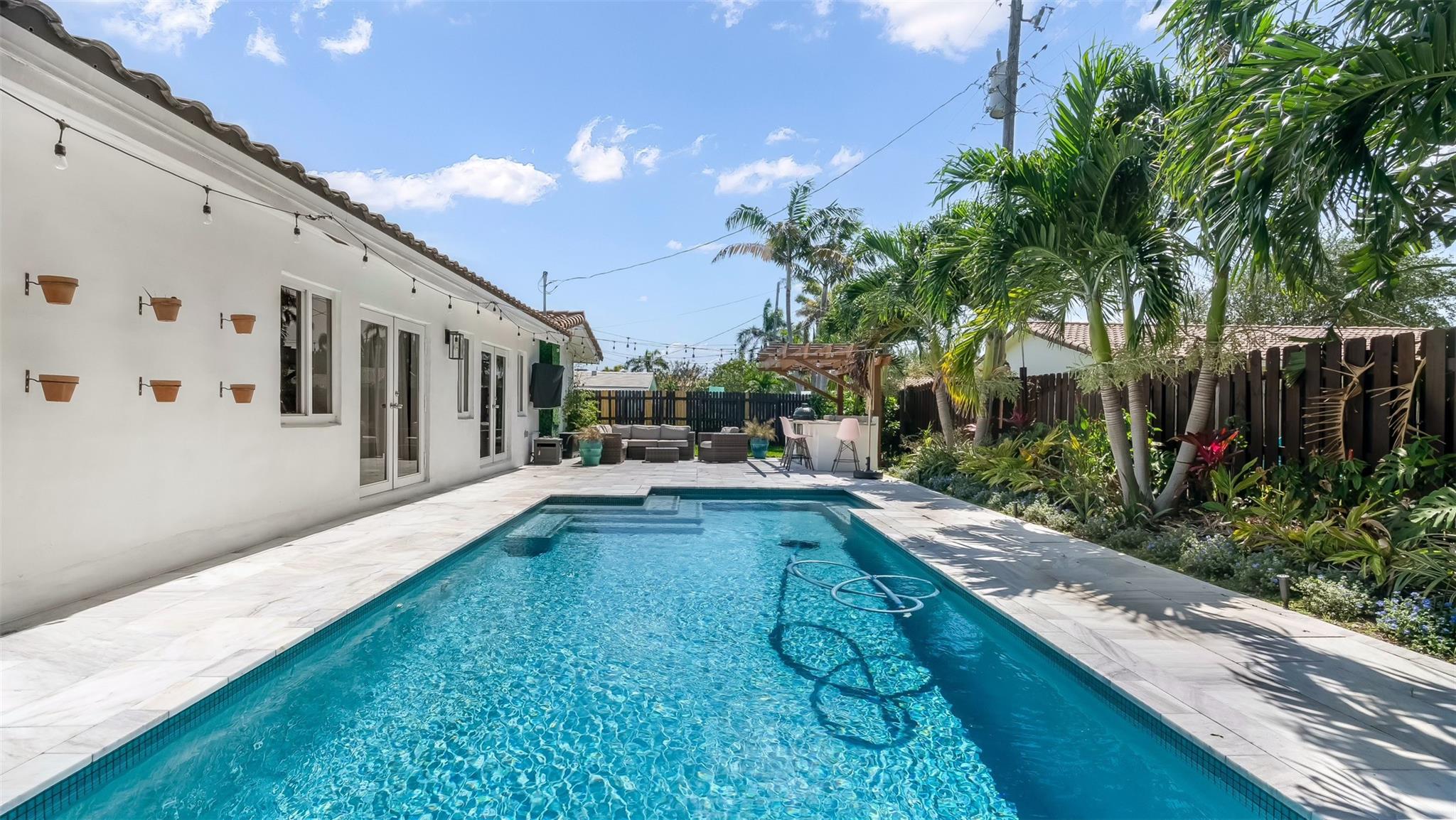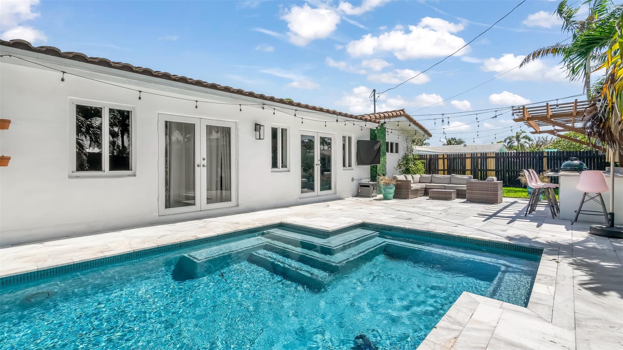 Welcome to this stunning 3 bed/3bath mid-century modern home! Step inside and be greeted by a spacious and airy interior, flooded with natural light and elegant renovations with meticulous attention to detail (2017). Open the French impact doors to see your personal backyard oasis, complete with outdoor kitchen, pergola, salt water pool and surrounded by marble flooring (2019). Have peace of mind with recent updates: complete impact windows and doors, barrel tile roof, water heater, AC, plumbing, electric panel and addition of primary en-suite (2017) making this a truly turn key home.