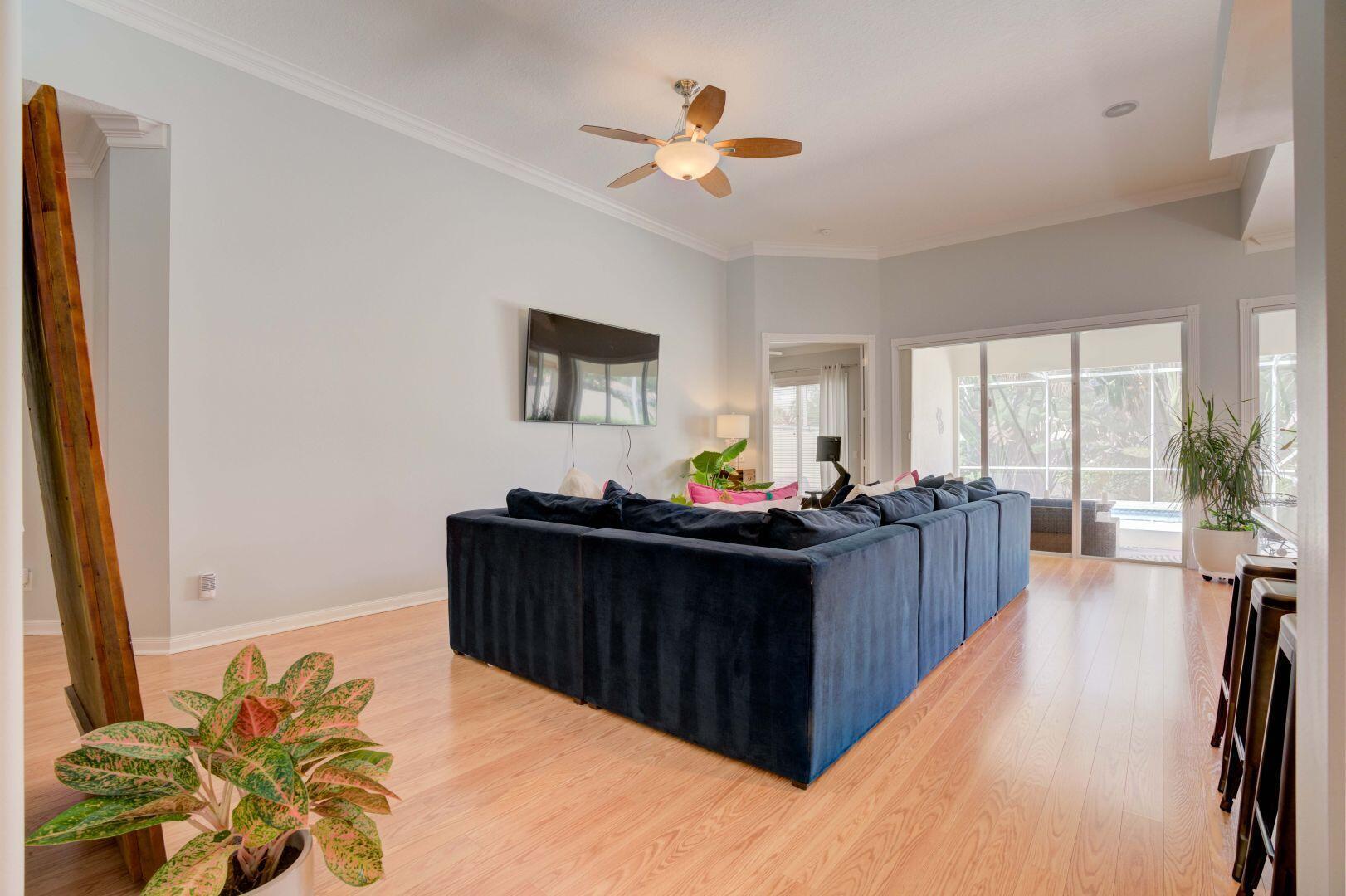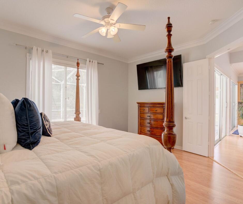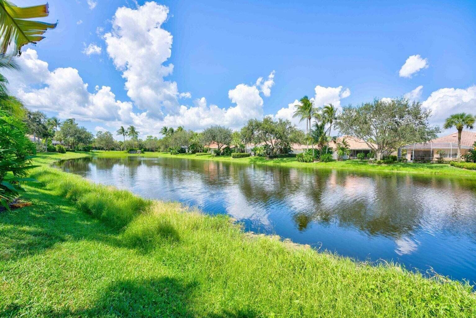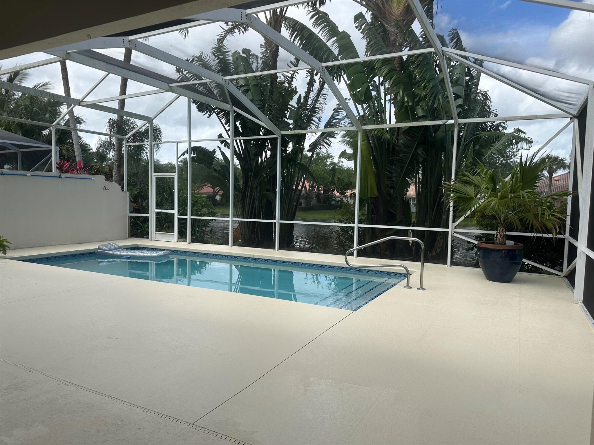 Spacious lakefront screened pool home on the quiet side of Riverwalk – no traffic noise. Home has 3 bedrooms, 2.5 baths, a bonus room that can be used as a 4th bedroom, a den, or an office. Brand new appliances, pool resurfaced & retiled in 2023, A/C & hot water heater replaced in 2021, hurricane shutters added in 2020, walkway and pool deck repainted in 2024, kitchen cabinets are solid wood, and crown molding throughout. Master bath has 2 bathrooms. Numerous community amenities that includes cable.