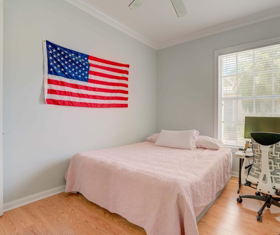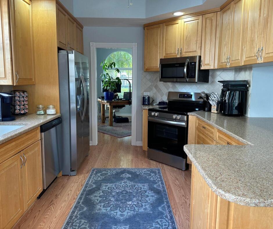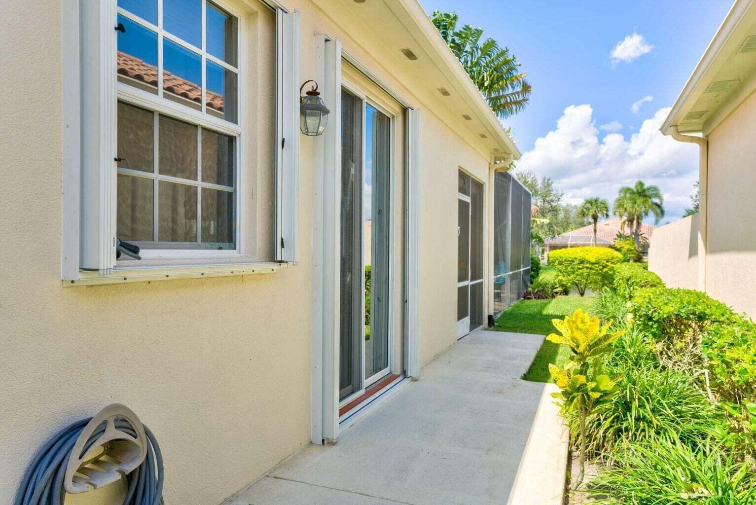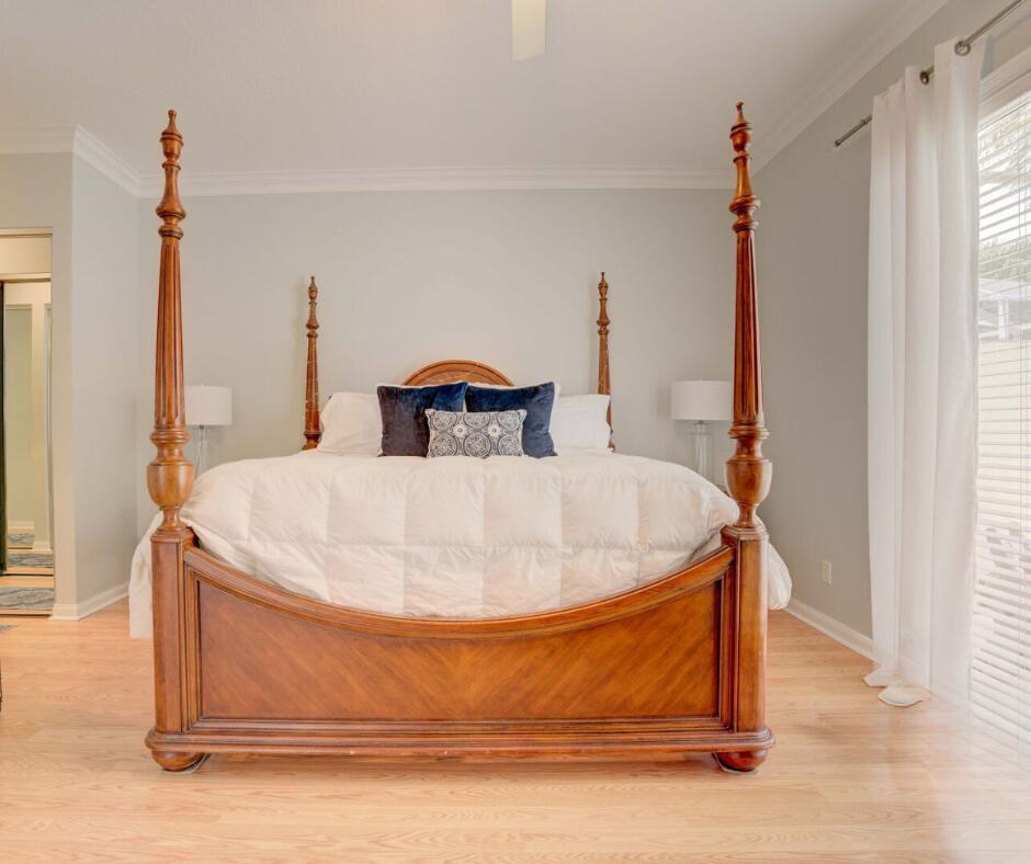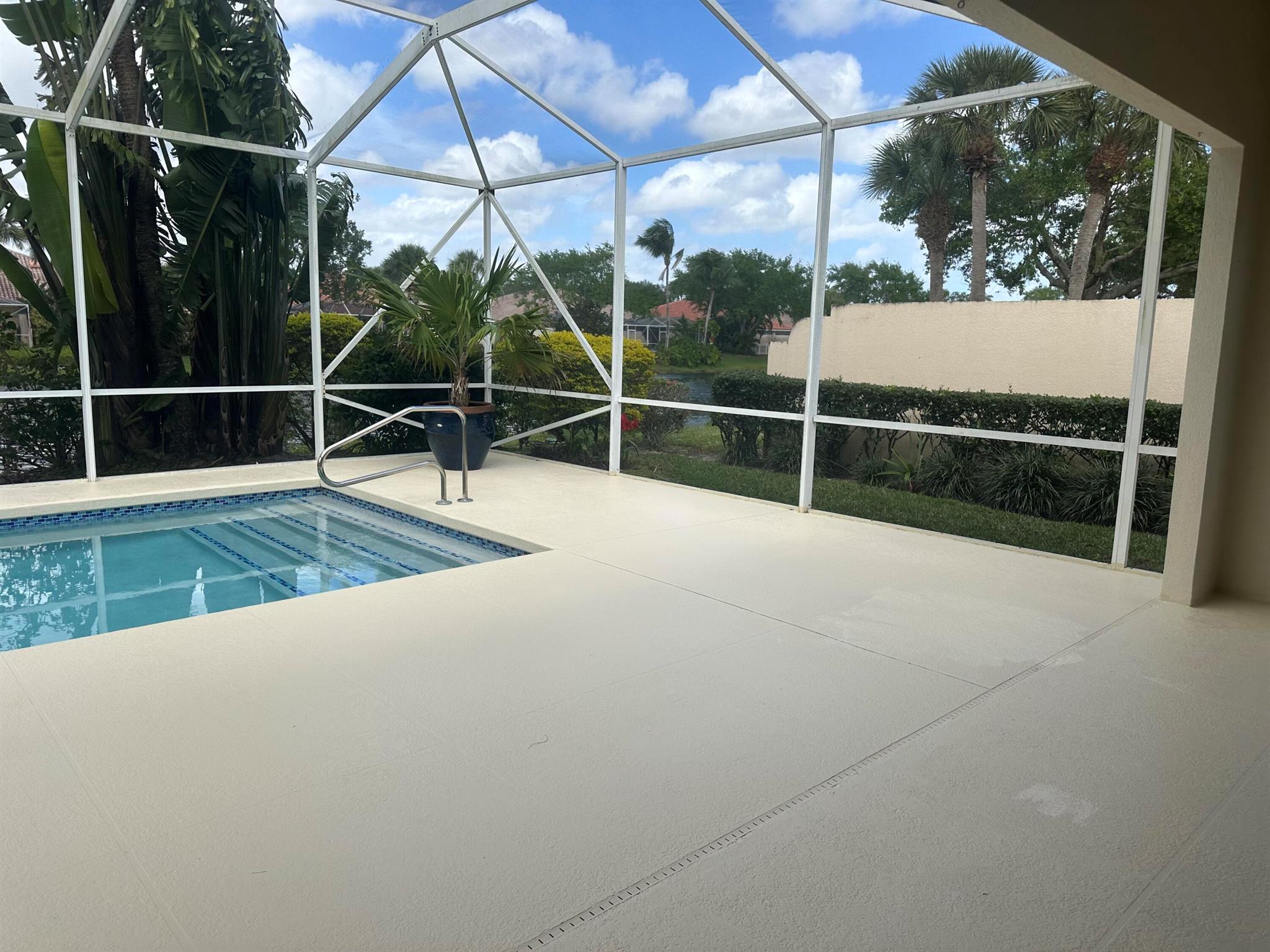 Spacious lakefront screened pool home on the quiet side of Riverwalk – no traffic noise. Home has 3 bedrooms, 2.5 baths, a bonus room that can be used as a 4th bedroom, a den, or an office. Brand new appliances, pool resurfaced & retiled in 2023, A/C & hot water heater replaced in 2021, hurricane shutters added in 2020, walkway and pool deck repainted in 2024, kitchen cabinets are solid wood, and crown molding throughout. Master bath has 2 bathrooms. Numerous community amenities that includes cable.