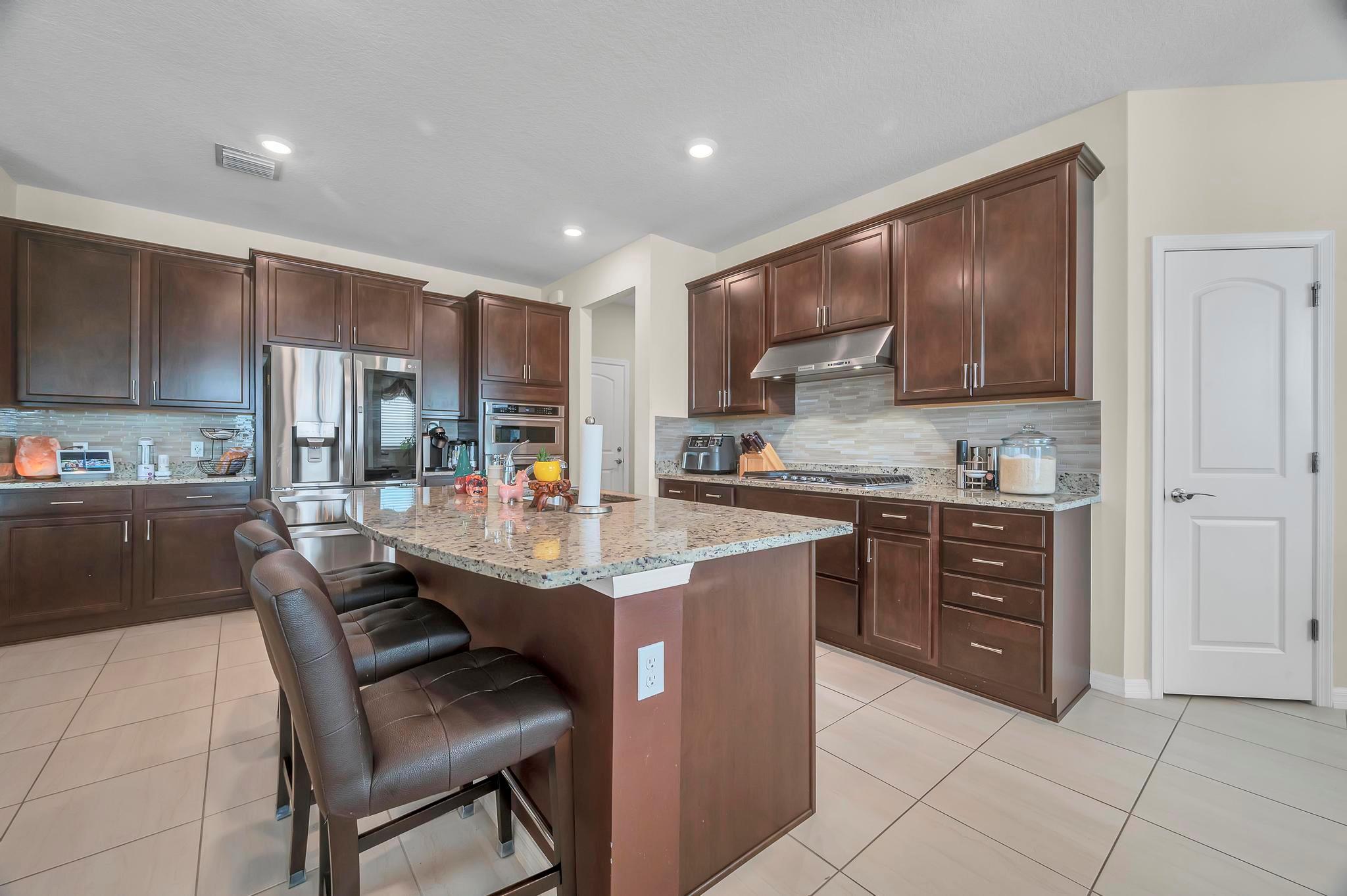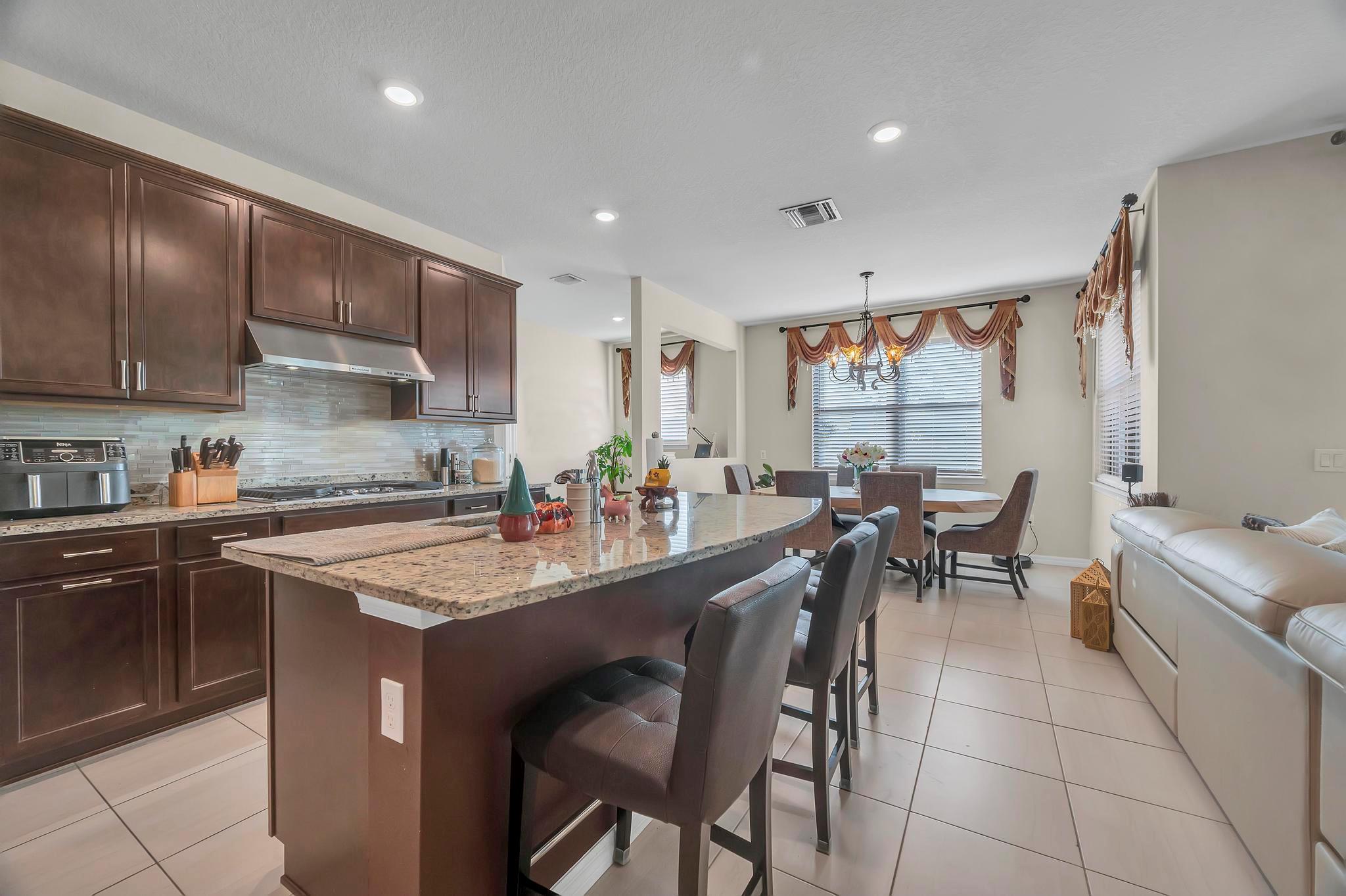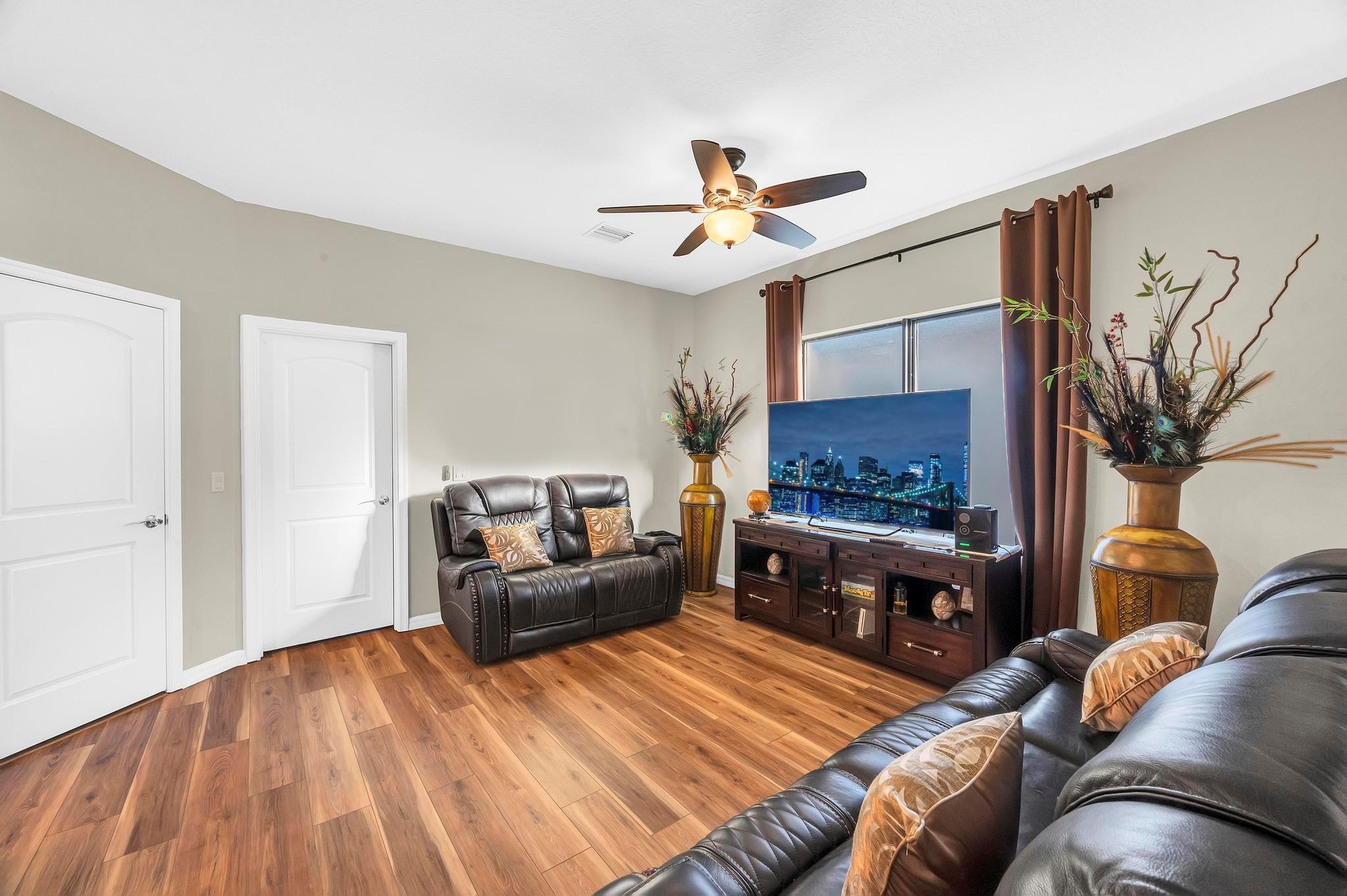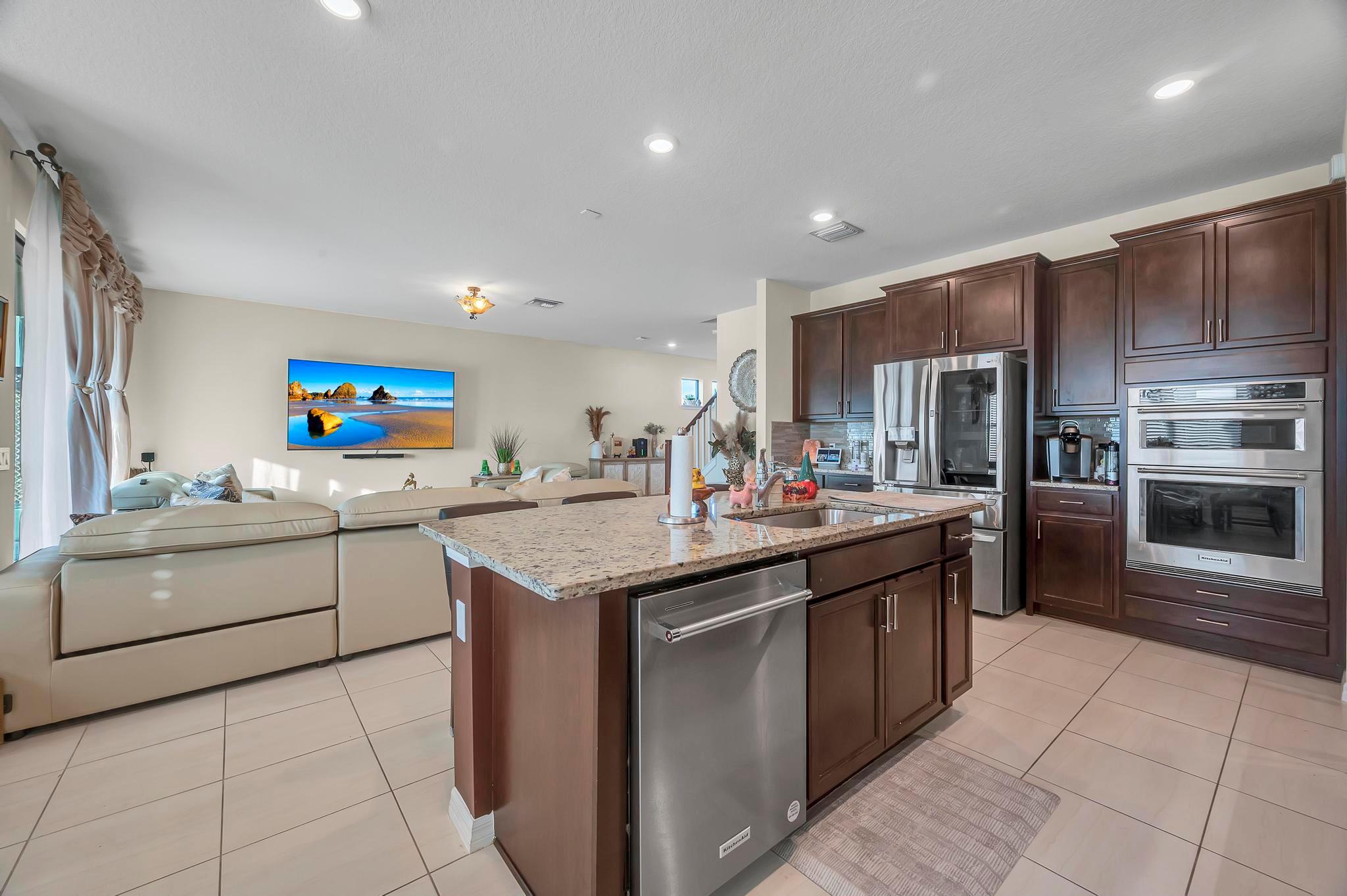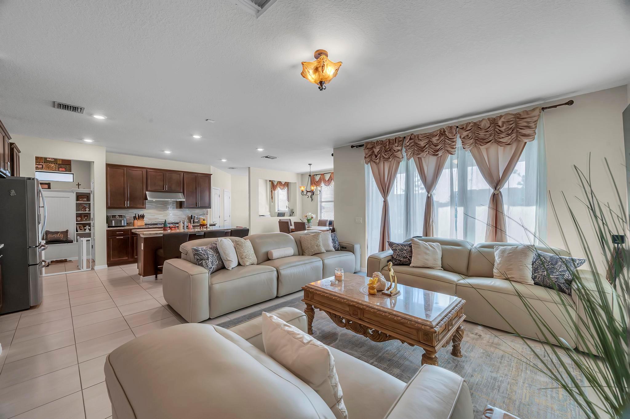 Welcome to The Fields! Perfectly located off the turnpike and Lake Worth Road, this Divosta-built ”Riverwalk” home consists of 5 bedrooms and 3 full bathrooms with a waterview of one of the many ponds throughout the gated community. Built in 2022, this home has a lot of upgraded features and options including one bedroom and one full bathroom on the main level, tile and hardwood floors throughout, and gas appliances. The large open floor plan allows for multiple rooms to function in a single living space. With ample granite countertop and cabinets, the kitchen also provides an island for casual seating while the dining area has room for a large table and a more formal arrangement.