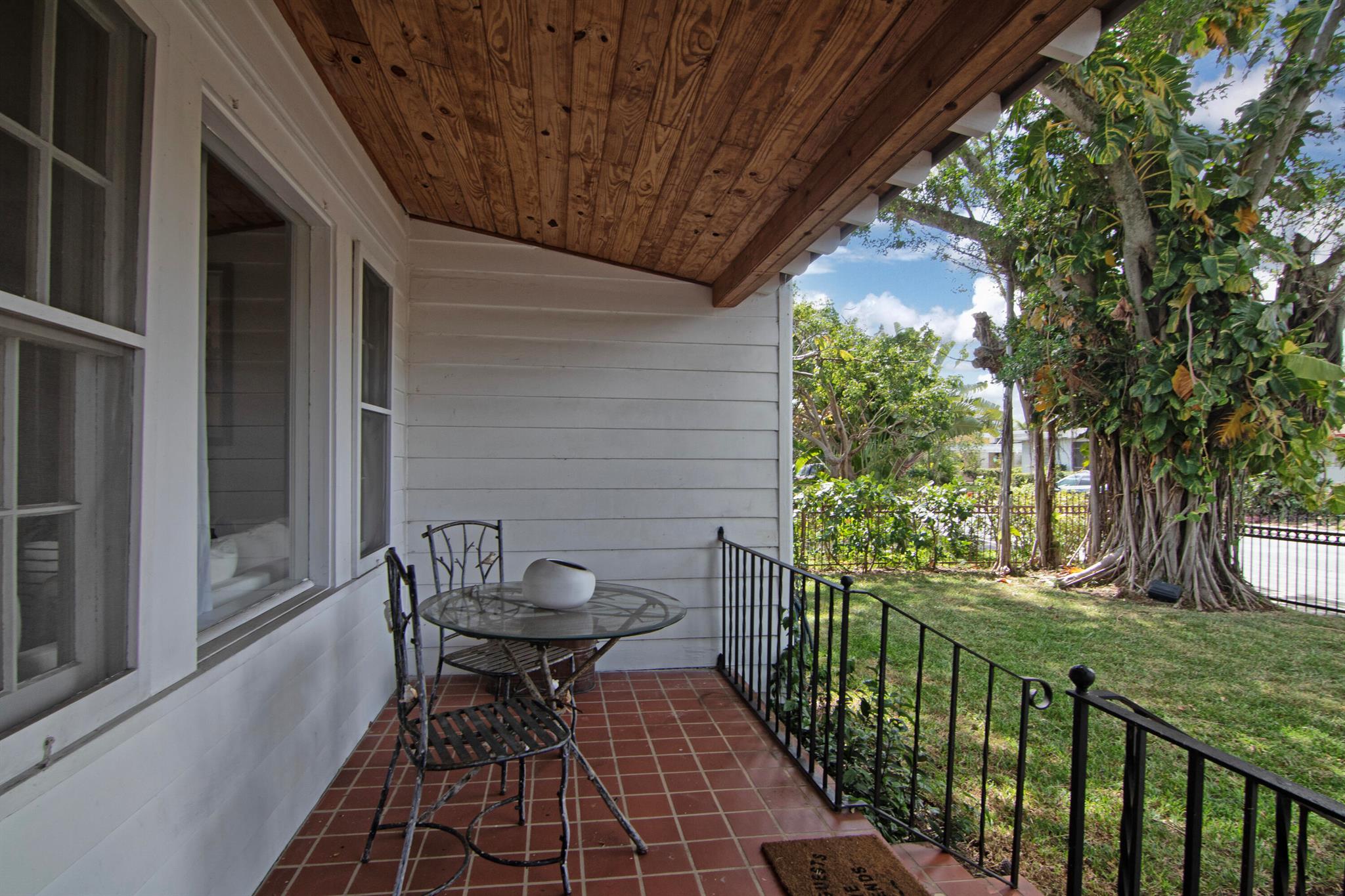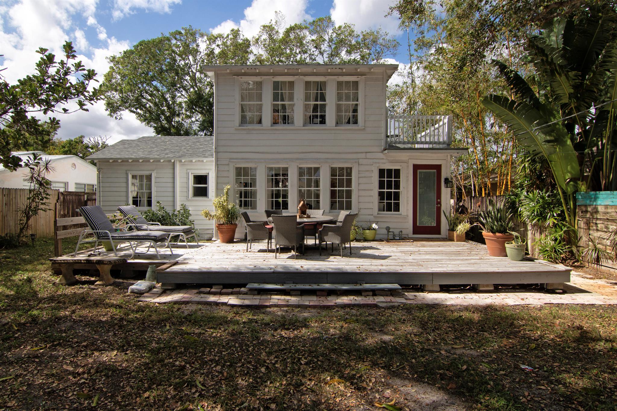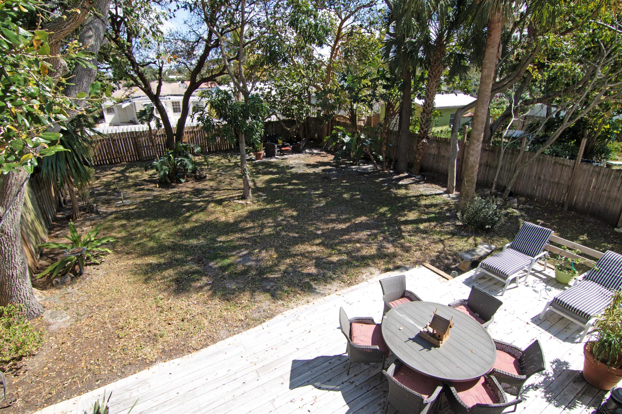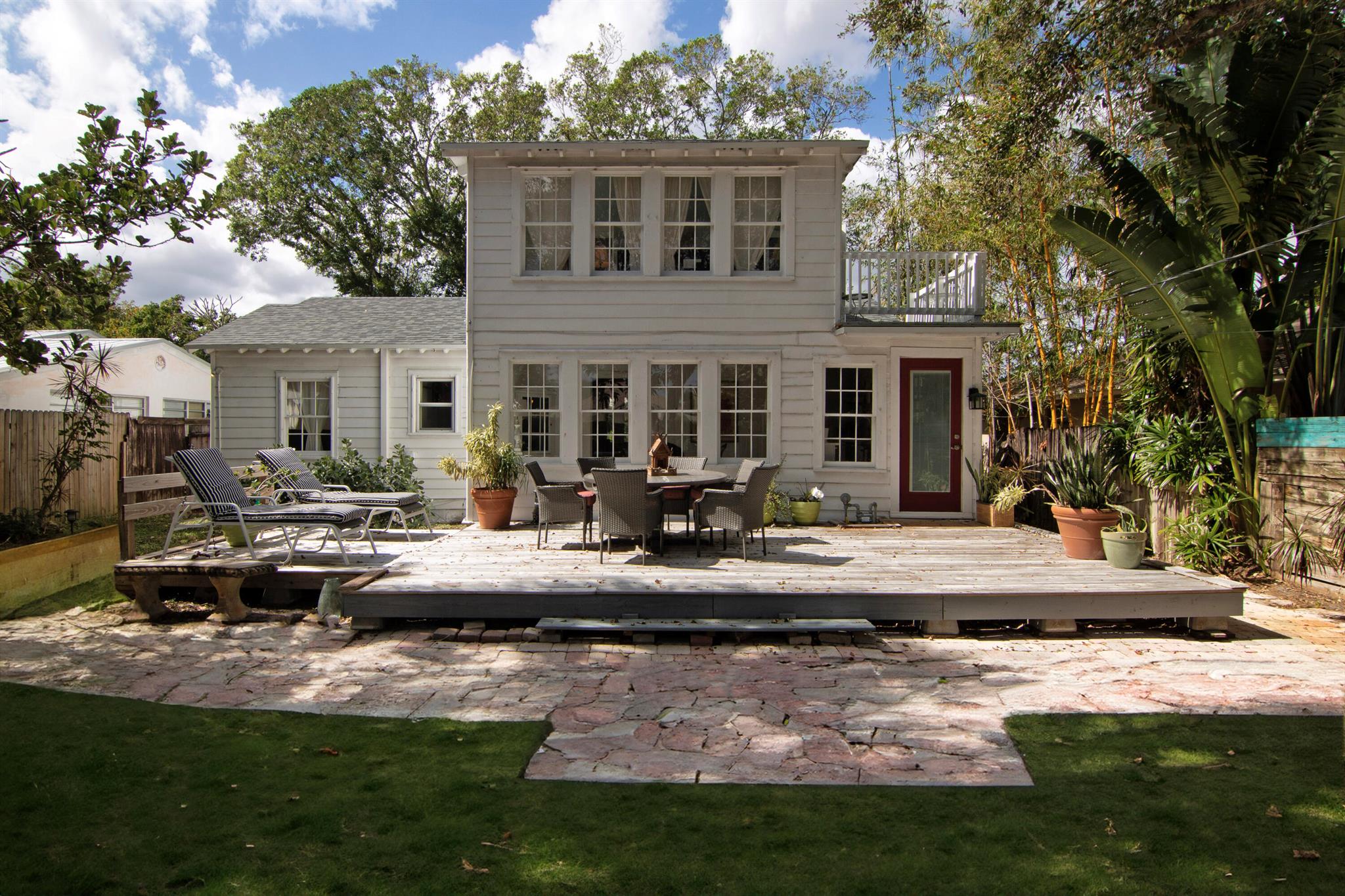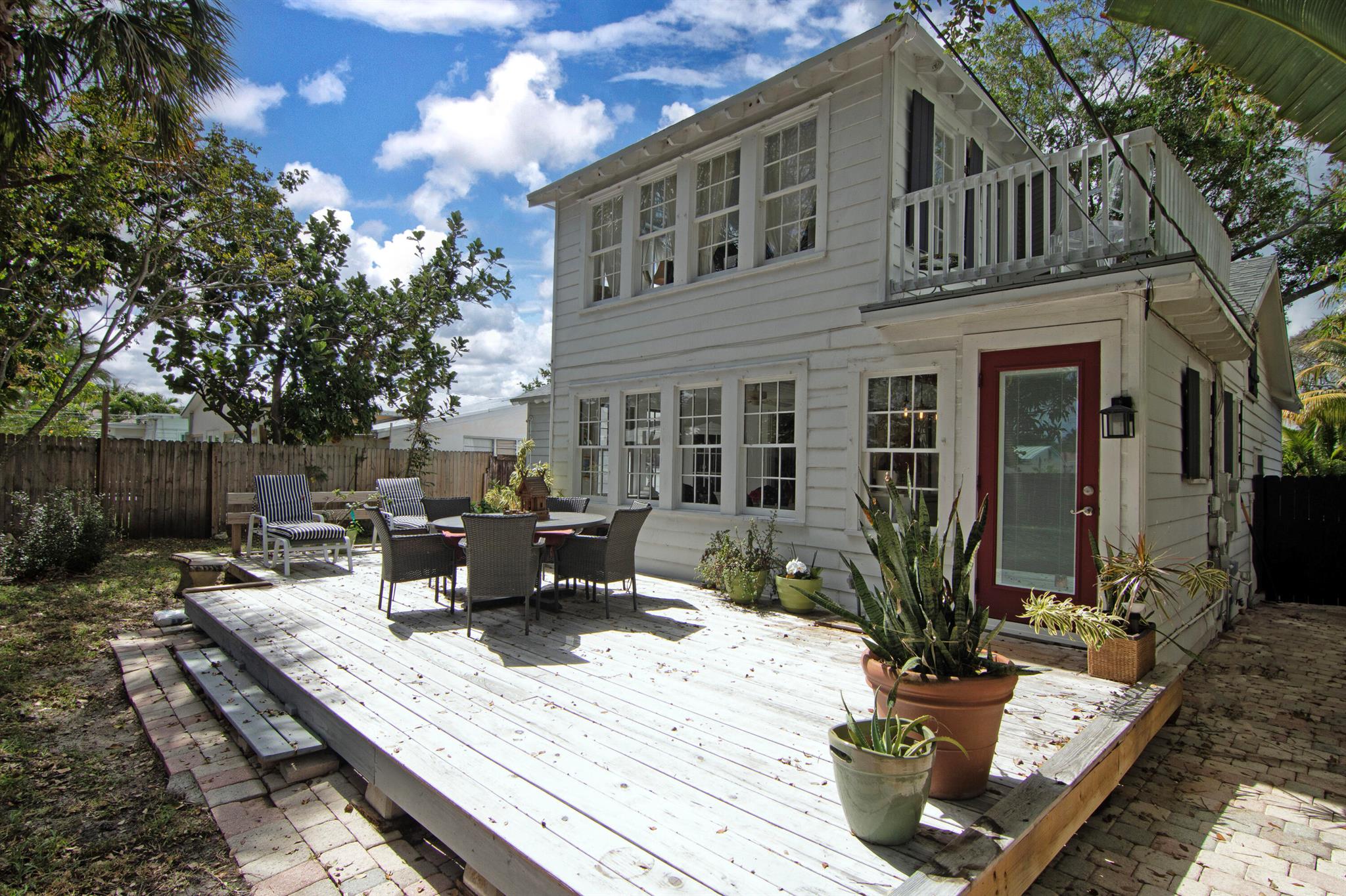 One of the ”Charming Cottages of Lake Worth Beach”. Updated 3 bedroom, 2 bath, home with original oak flooring, fireplace, and open staircase. New kitchen and baths, gas range, custom kitchen cabinetry w/quartz counters. One car garage w/laundry, gas water heater, and storage. The roof is new and has strapping applied. The windows are all original with storm shutters. The house is very charming with original details, original stair railing, wrap-around dining room windows looking out to the deck and large yard. There is room to build a garage/guest house, and pool. There is a bedroom suite on the 2nd floor with a deck overlooking the yard, and a full bath. Two bedrooms are on the first floor and a full bath. Close to the Lake Worth Golf Course/waterfront restaurant, and Downtown LWB