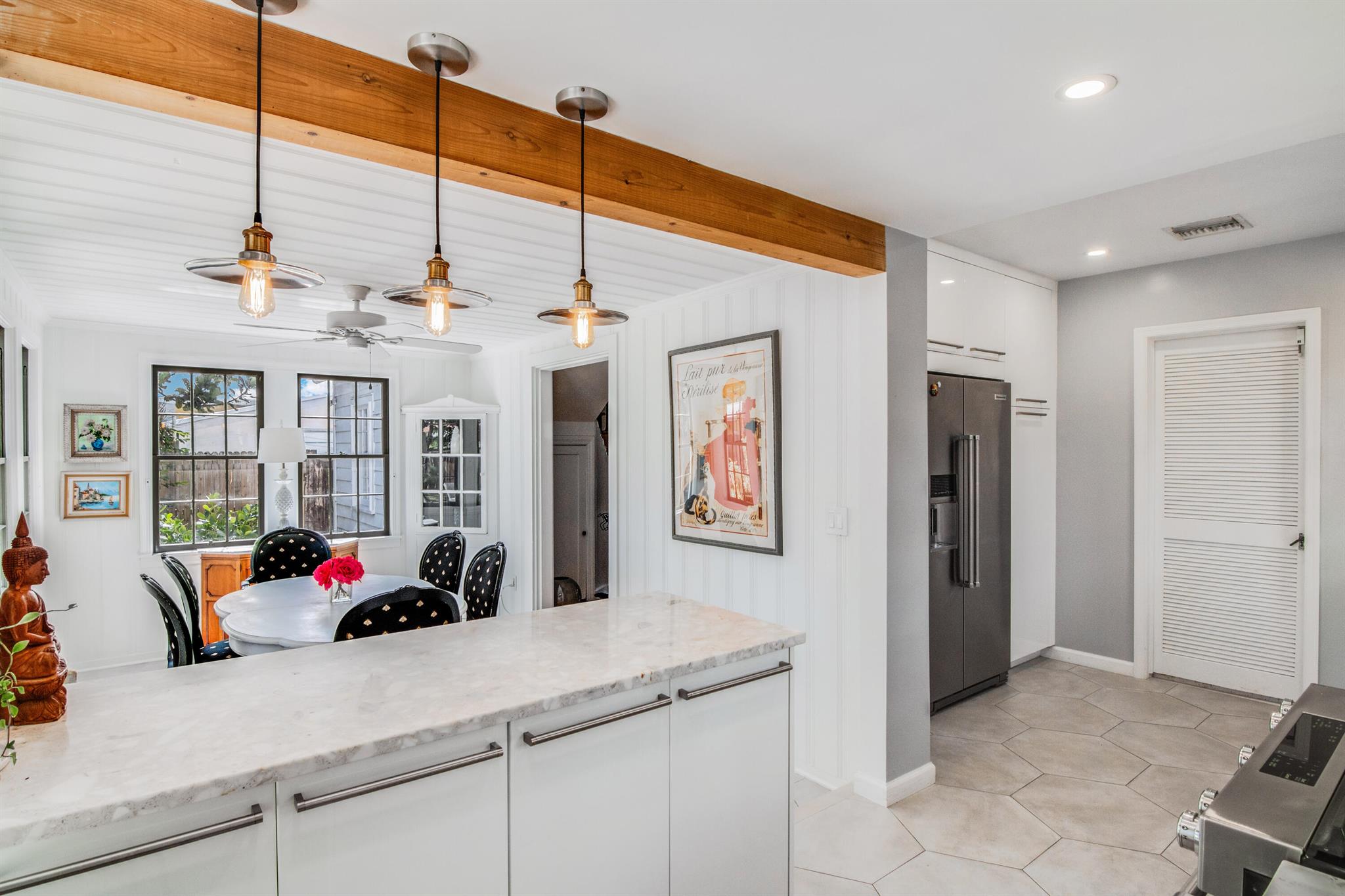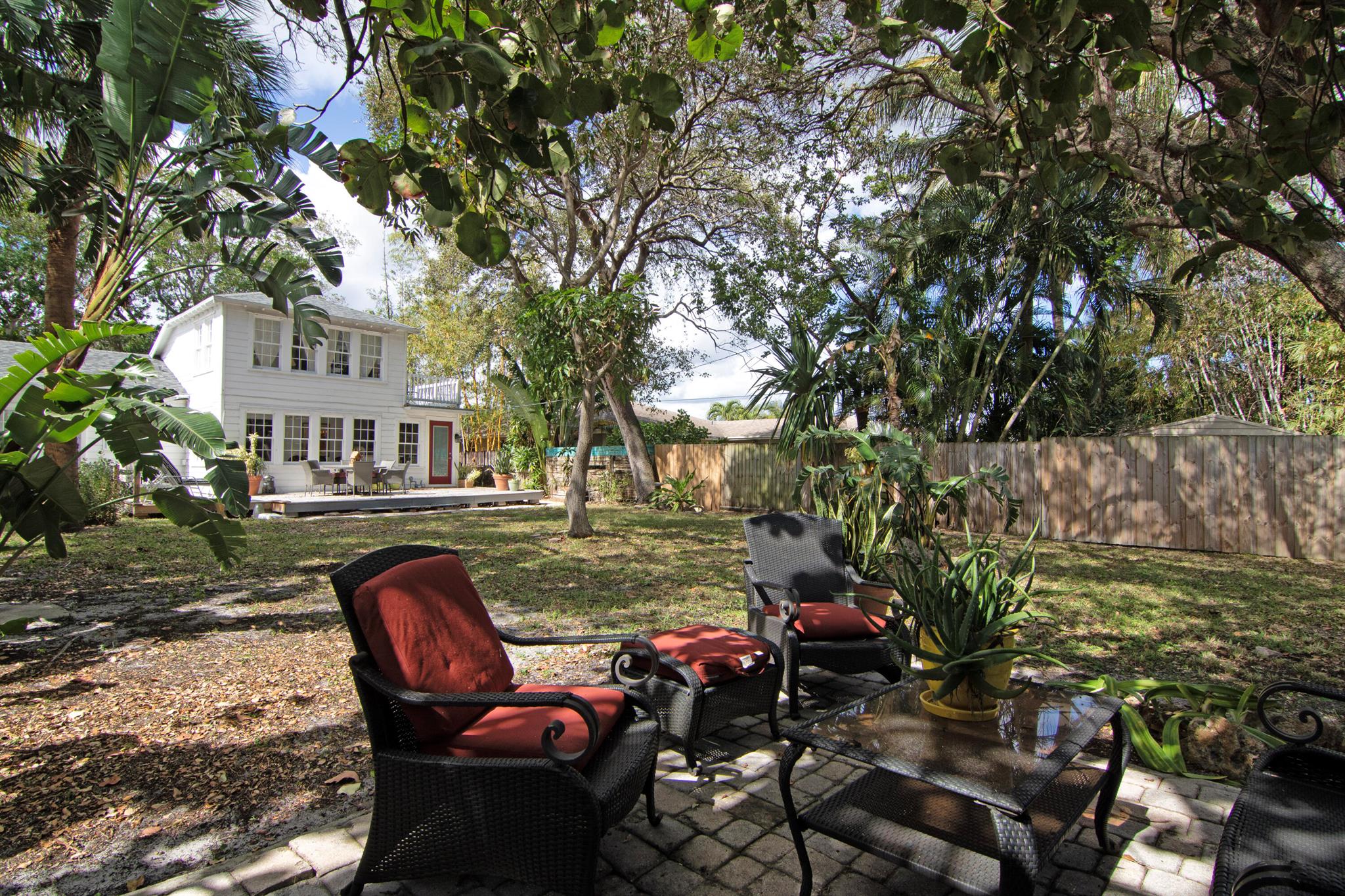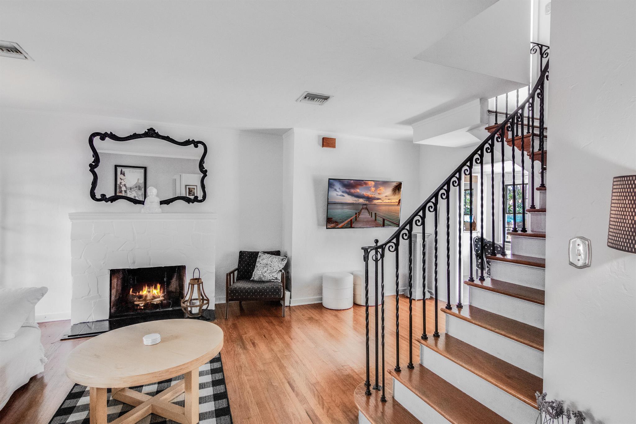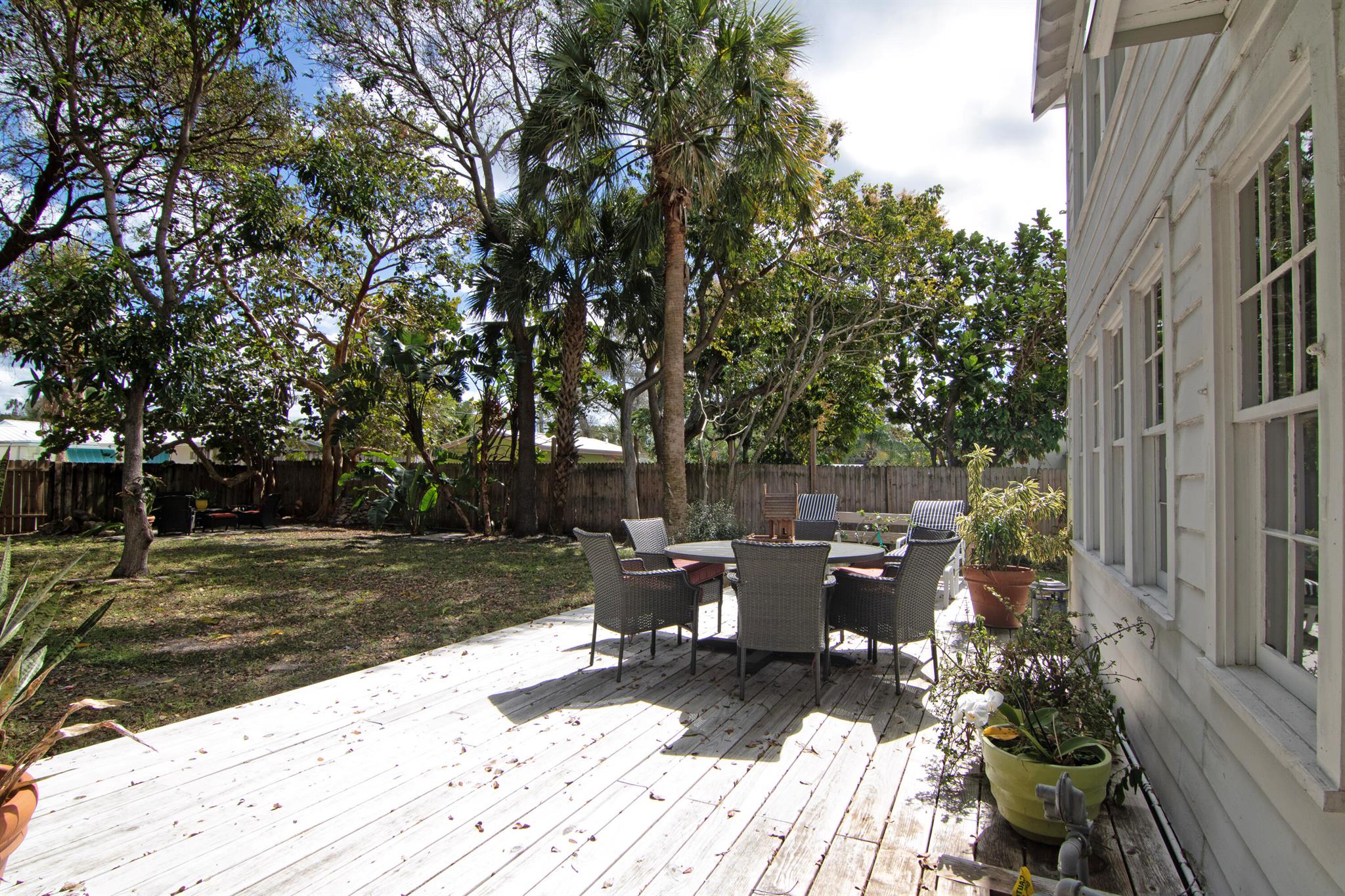 One of the ”Charming Cottages of Lake Worth Beach”. Updated 3 bedroom, 2 bath, home with original oak flooring, fireplace, and open staircase. New kitchen and baths, gas range, custom kitchen cabinetry w/quartz counters. One car garage w/laundry, gas water heater, and storage. The roof is new and has strapping applied. The windows are all original with storm shutters. The house is very charming with original details, original stair railing, wrap-around dining room windows looking out to the deck and large yard. There is room to build a garage/guest house, and pool. There is a bedroom suite on the 2nd floor with a deck overlooking the yard, and a full bath. Two bedrooms are on the first floor and a full bath. Close to the Lake Worth Golf Course/waterfront restaurant, and Downtown LWB