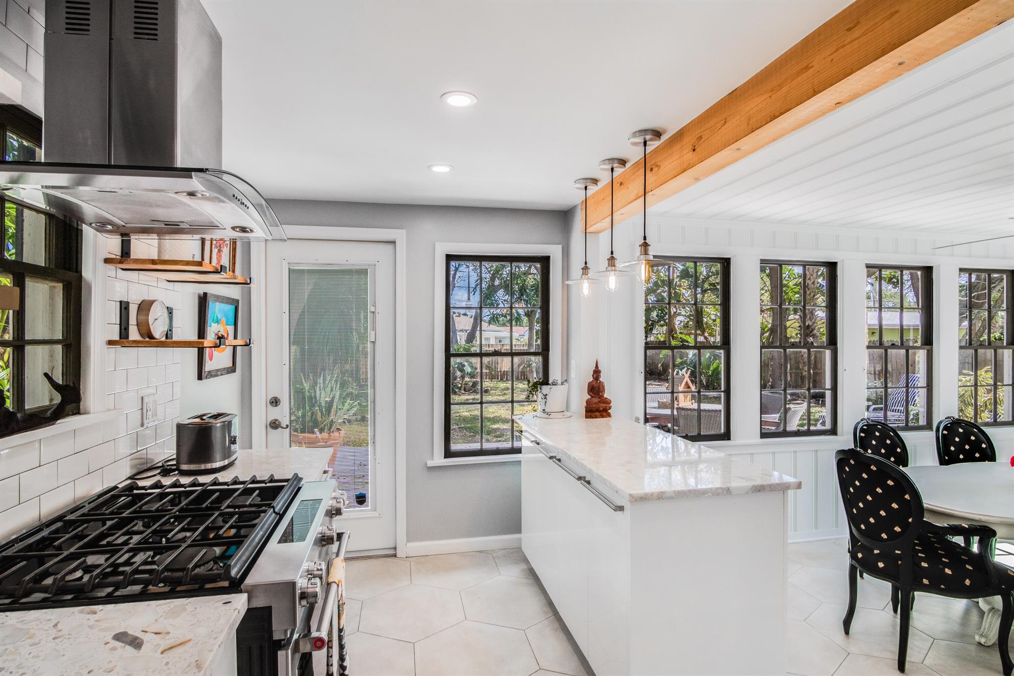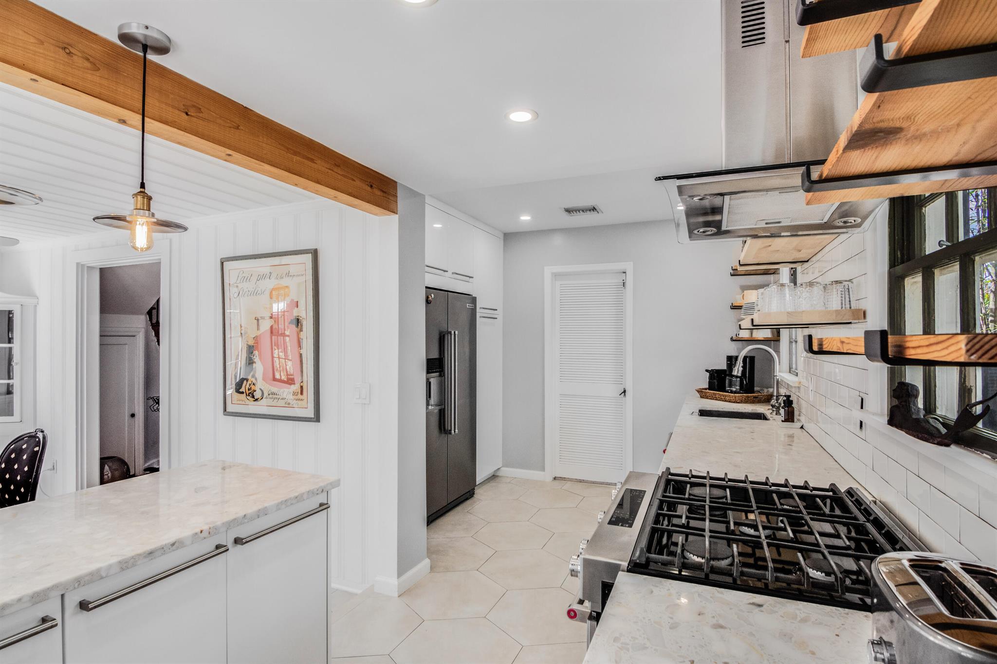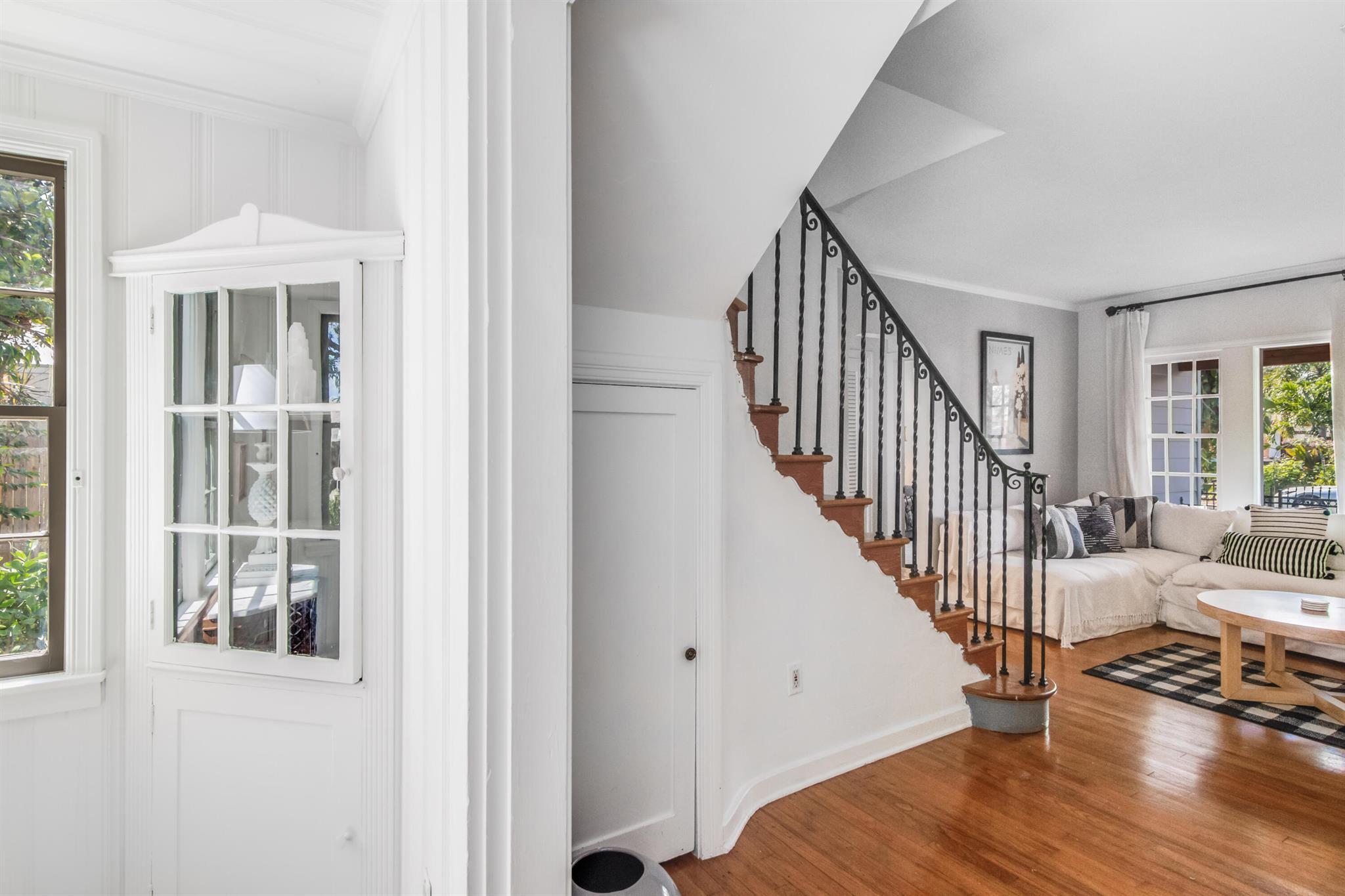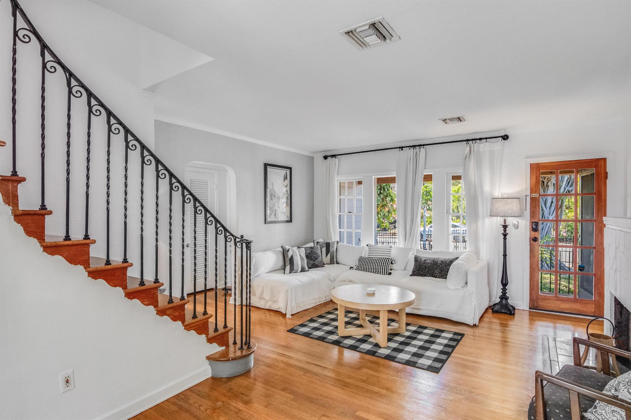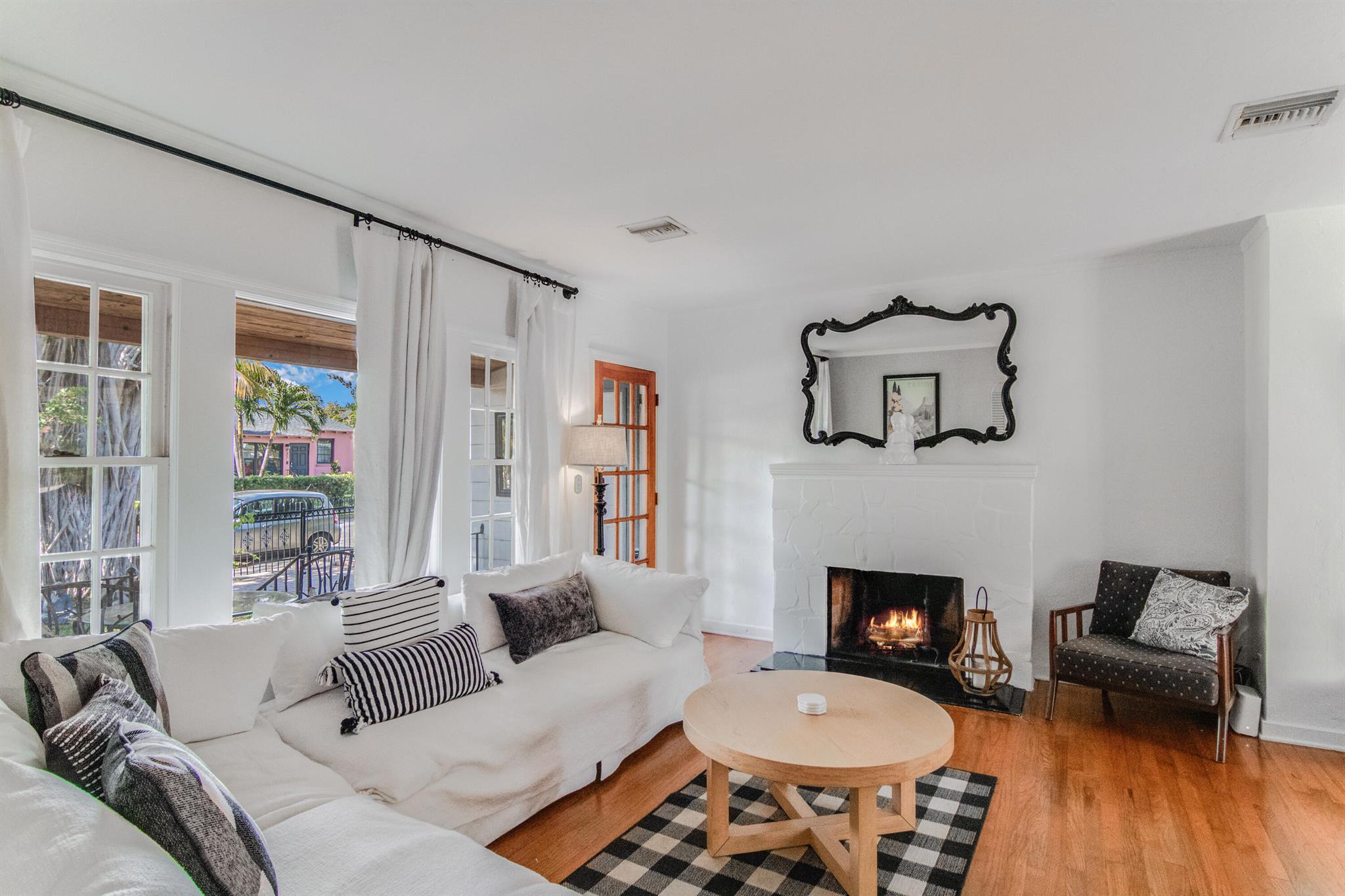 One of the ”Charming Cottages of Lake Worth Beach”. Updated 3 bedroom, 2 bath, home with original oak flooring, fireplace, and open staircase. New kitchen and baths, gas range, custom kitchen cabinetry w/quartz counters. One car garage w/laundry, gas water heater, and storage. The roof is new and has strapping applied. The windows are all original with storm shutters. The house is very charming with original details, original stair railing, wrap-around dining room windows looking out to the deck and large yard. There is room to build a garage/guest house, and pool. There is a bedroom suite on the 2nd floor with a deck overlooking the yard, and a full bath. Two bedrooms are on the first floor and a full bath. Close to the Lake Worth Golf Course/waterfront restaurant, and Downtown LWB