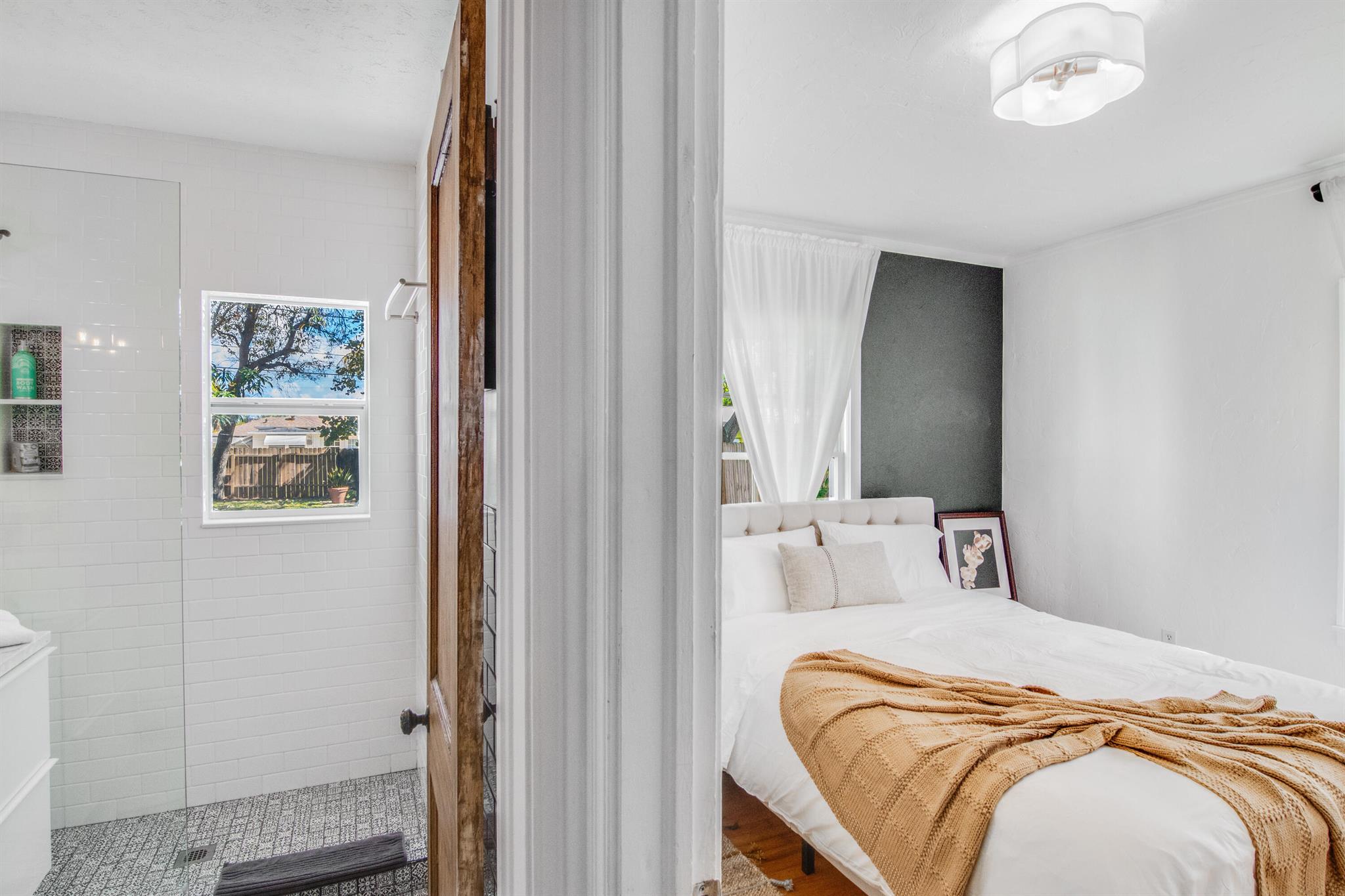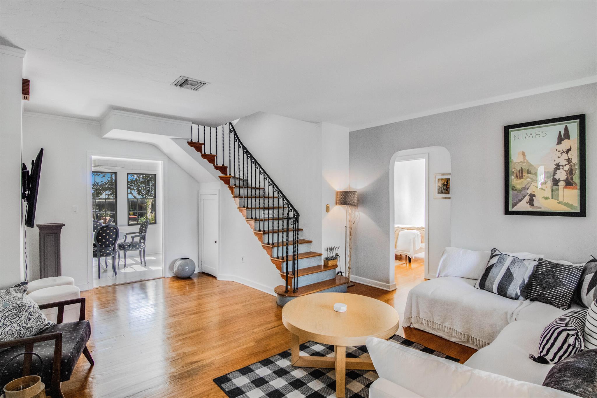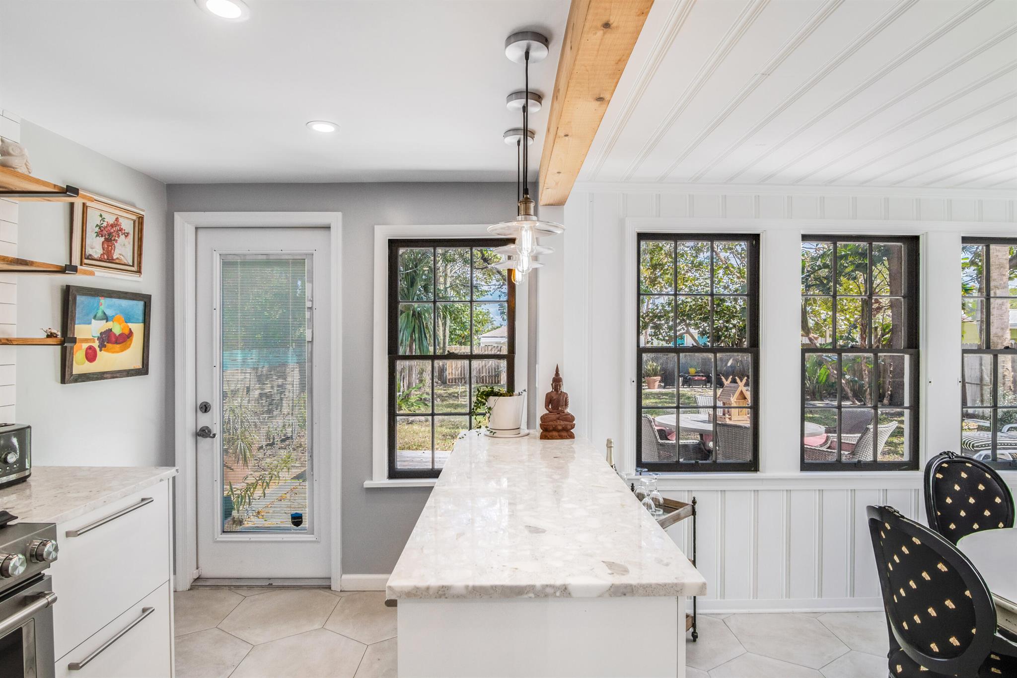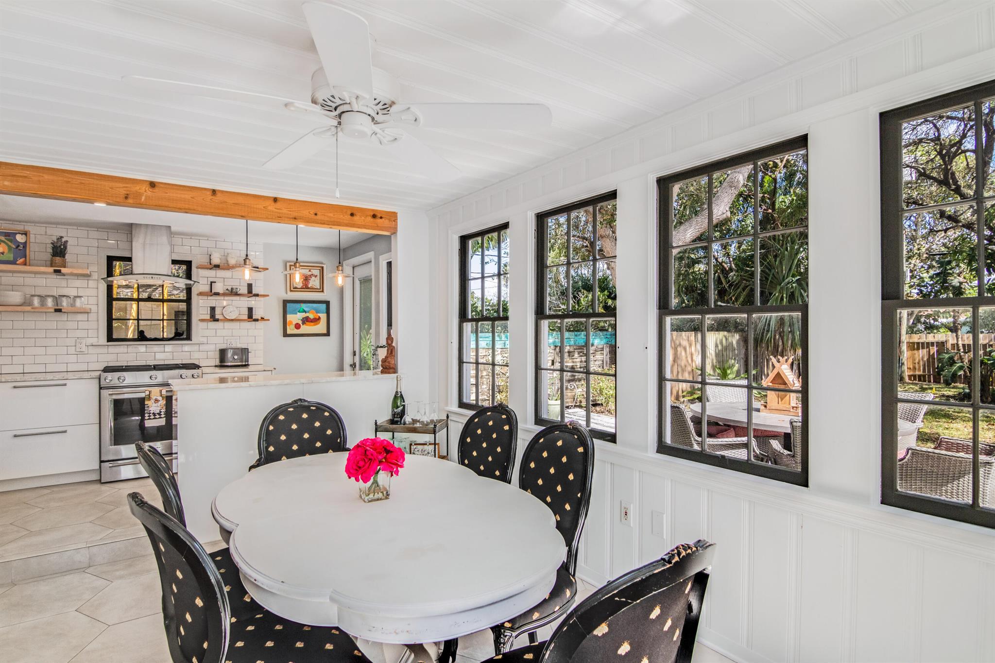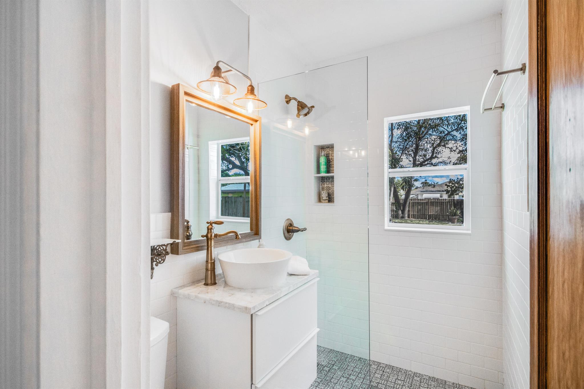 One of the ”Charming Cottages of Lake Worth Beach”. Updated 3 bedroom, 2 bath, home with original oak flooring, fireplace, and open staircase. New kitchen and baths, gas range, custom kitchen cabinetry w/quartz counters. One car garage w/laundry, gas water heater, and storage. The roof is new and has strapping applied. The windows are all original with storm shutters. The house is very charming with original details, original stair railing, wrap-around dining room windows looking out to the deck and large yard. There is room to build a garage/guest house, and pool. There is a bedroom suite on the 2nd floor with a deck overlooking the yard, and a full bath. Two bedrooms are on the first floor and a full bath. Close to the Lake Worth Golf Course/waterfront restaurant, and Downtown LWB