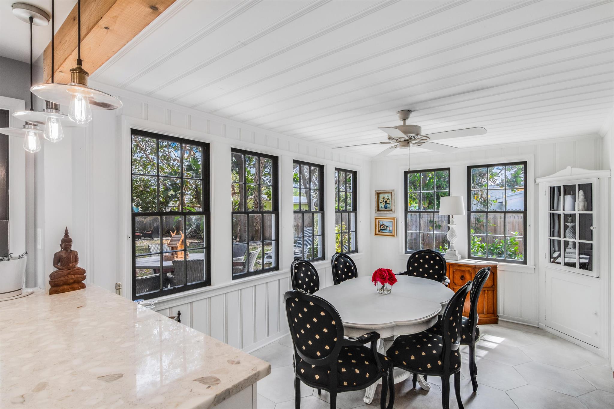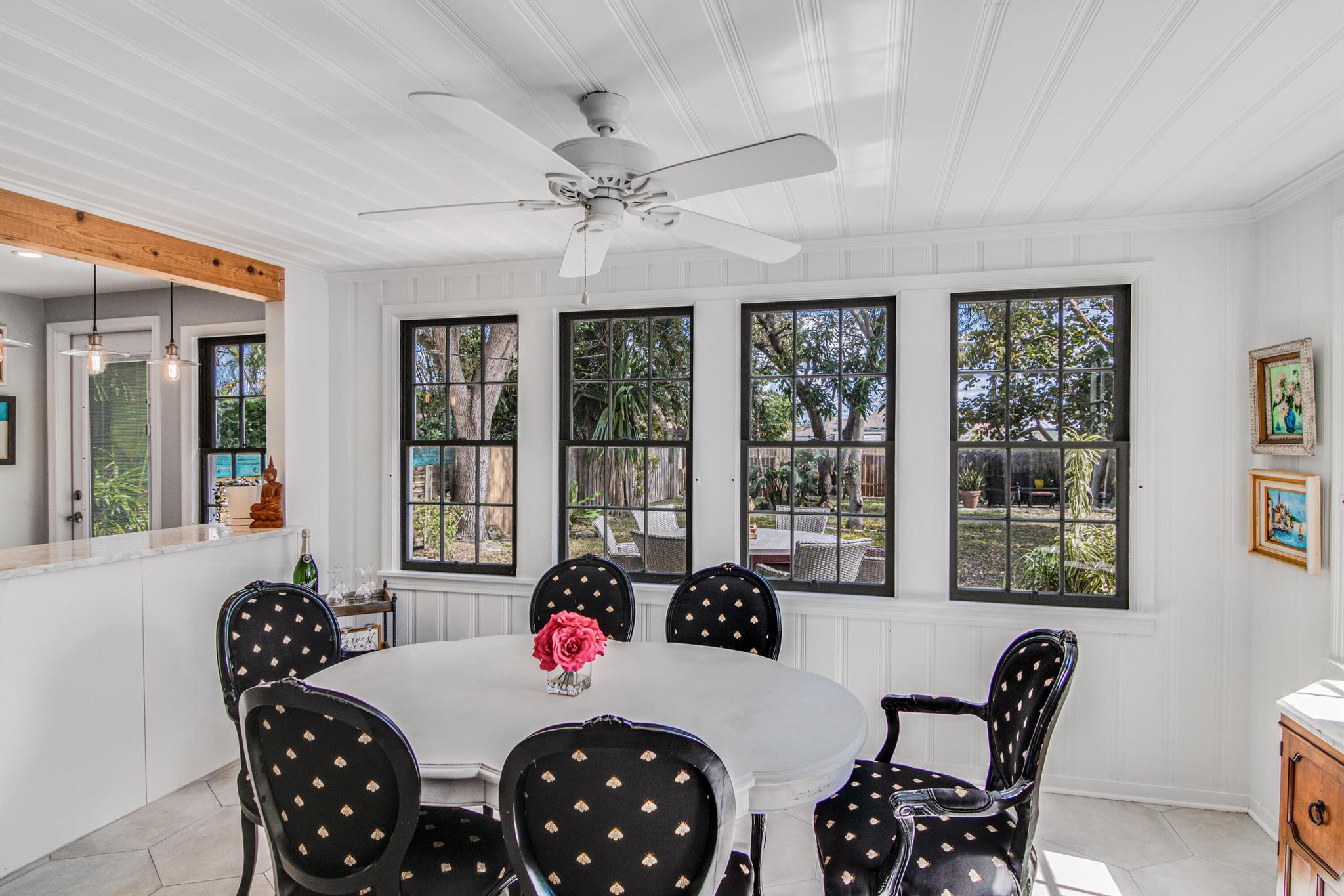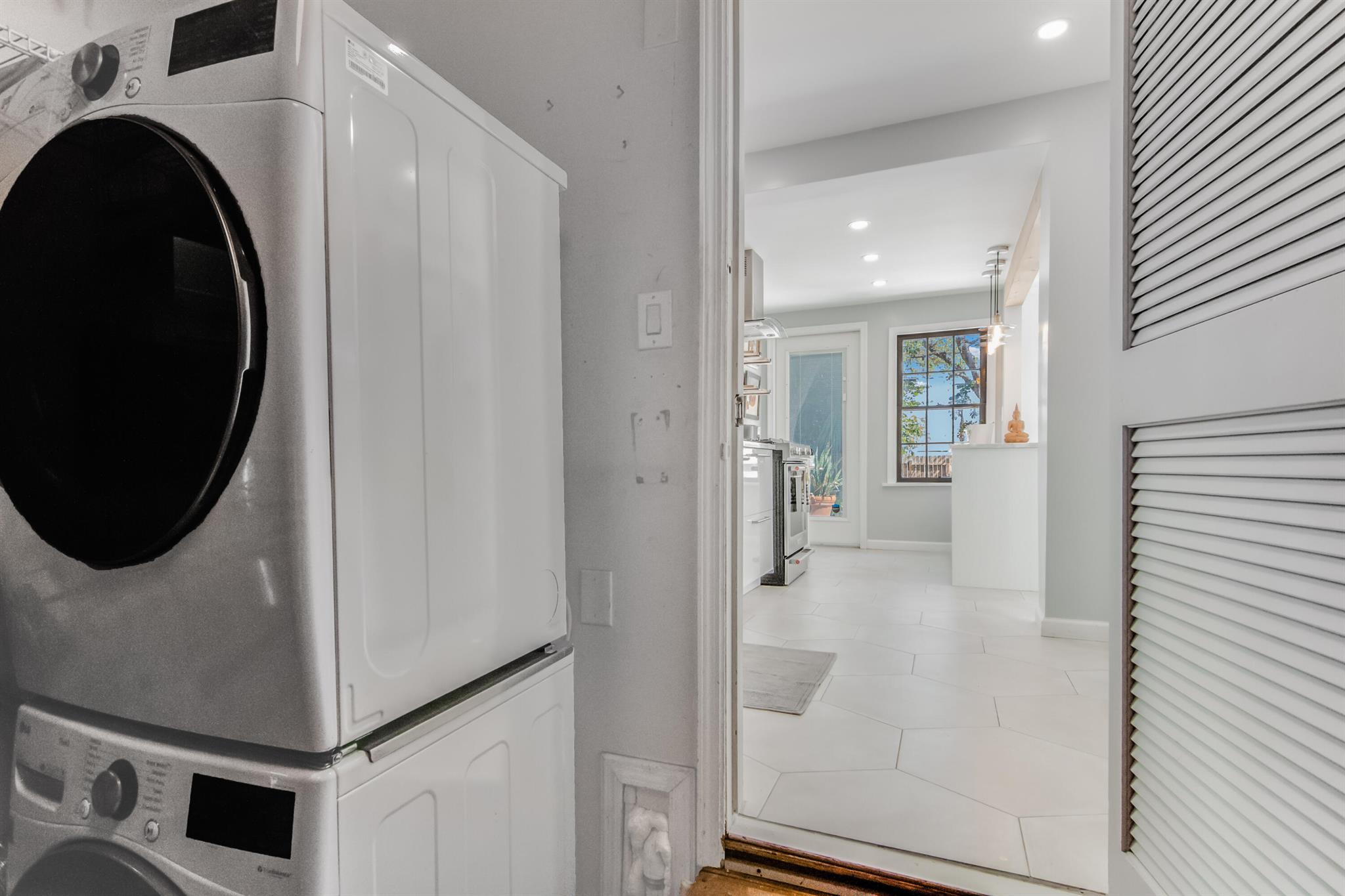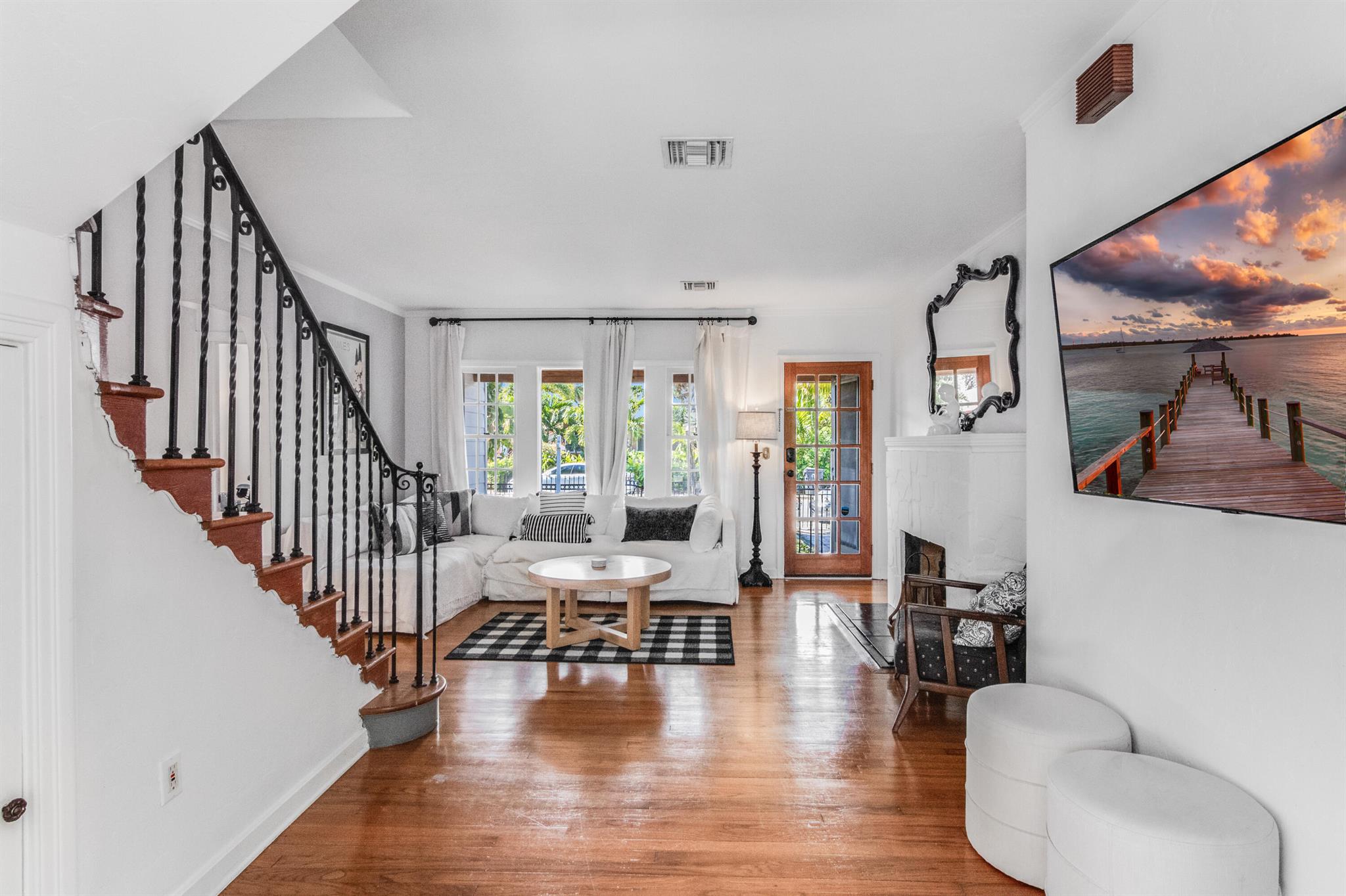 One of the ”Charming Cottages of Lake Worth Beach”. Updated 3 bedroom, 2 bath, home with original oak flooring, fireplace, and open staircase. New kitchen and baths, gas range, custom kitchen cabinetry w/quartz counters. One car garage w/laundry, gas water heater, and storage. The roof is new and has strapping applied. The windows are all original with storm shutters. The house is very charming with original details, original stair railing, wrap-around dining room windows looking out to the deck and large yard. There is room to build a garage/guest house, and pool. There is a bedroom suite on the 2nd floor with a deck overlooking the yard, and a full bath. Two bedrooms are on the first floor and a full bath. Close to the Lake Worth Golf Course/waterfront restaurant, and Downtown LWB