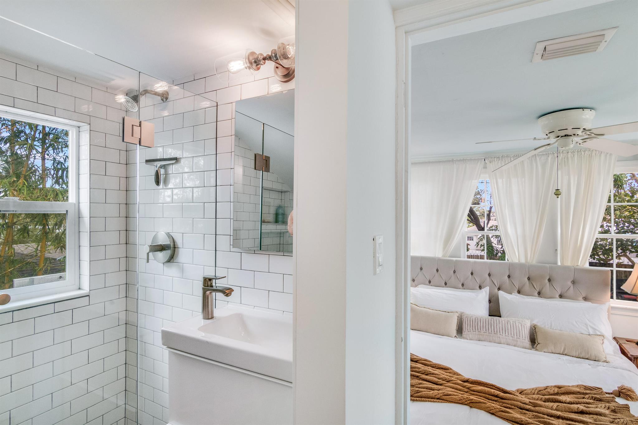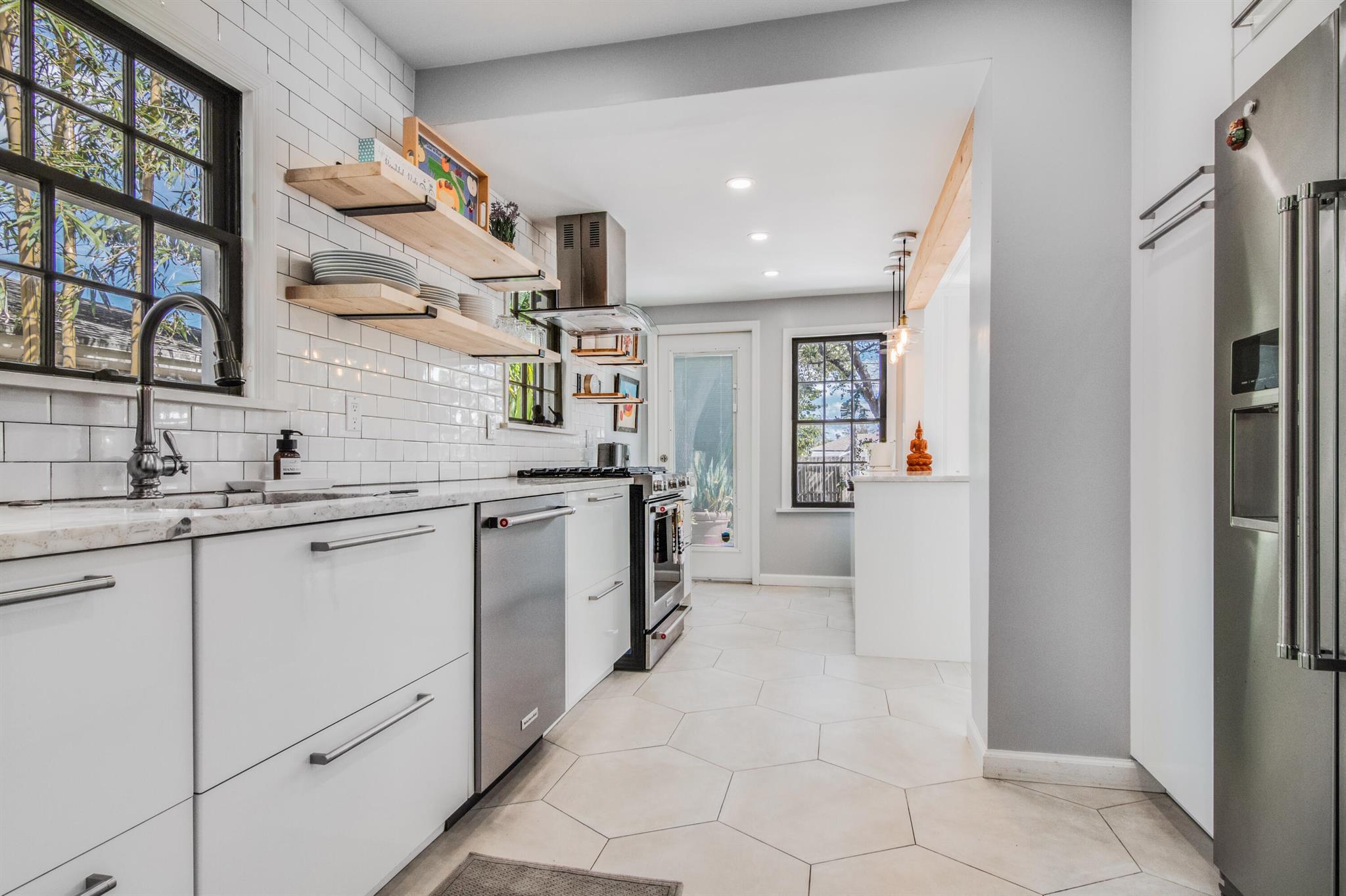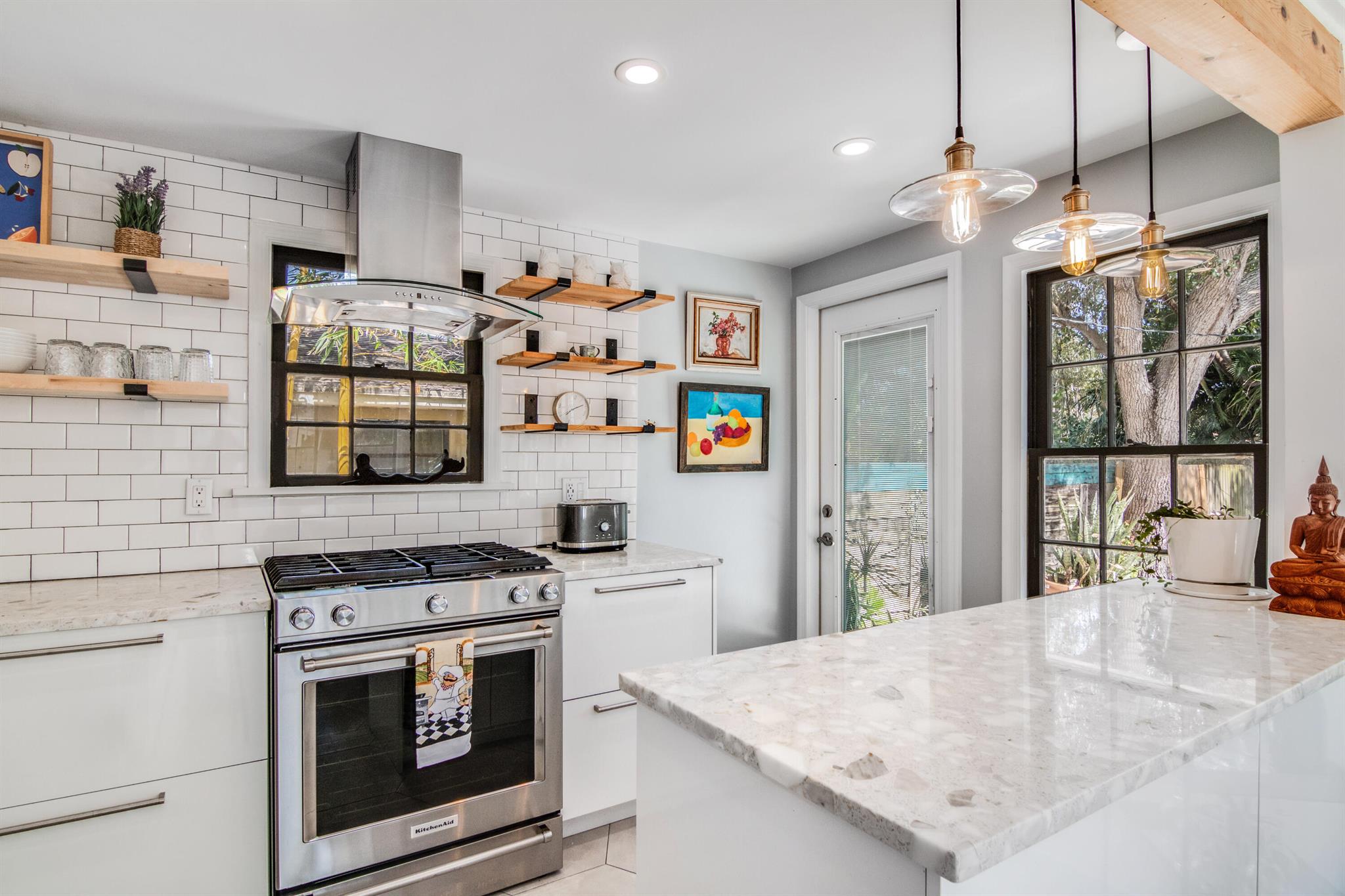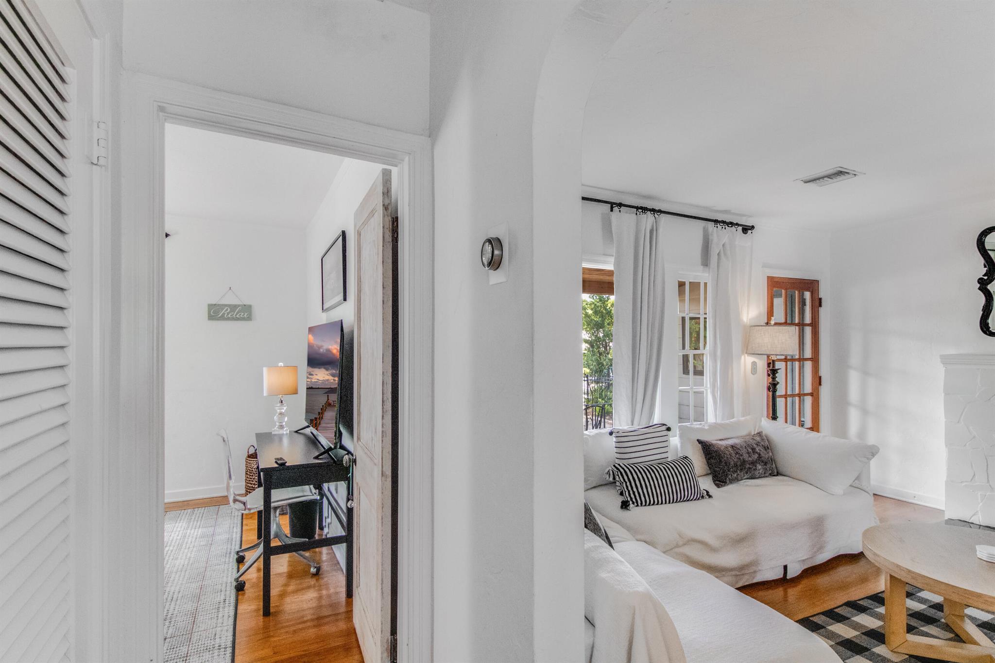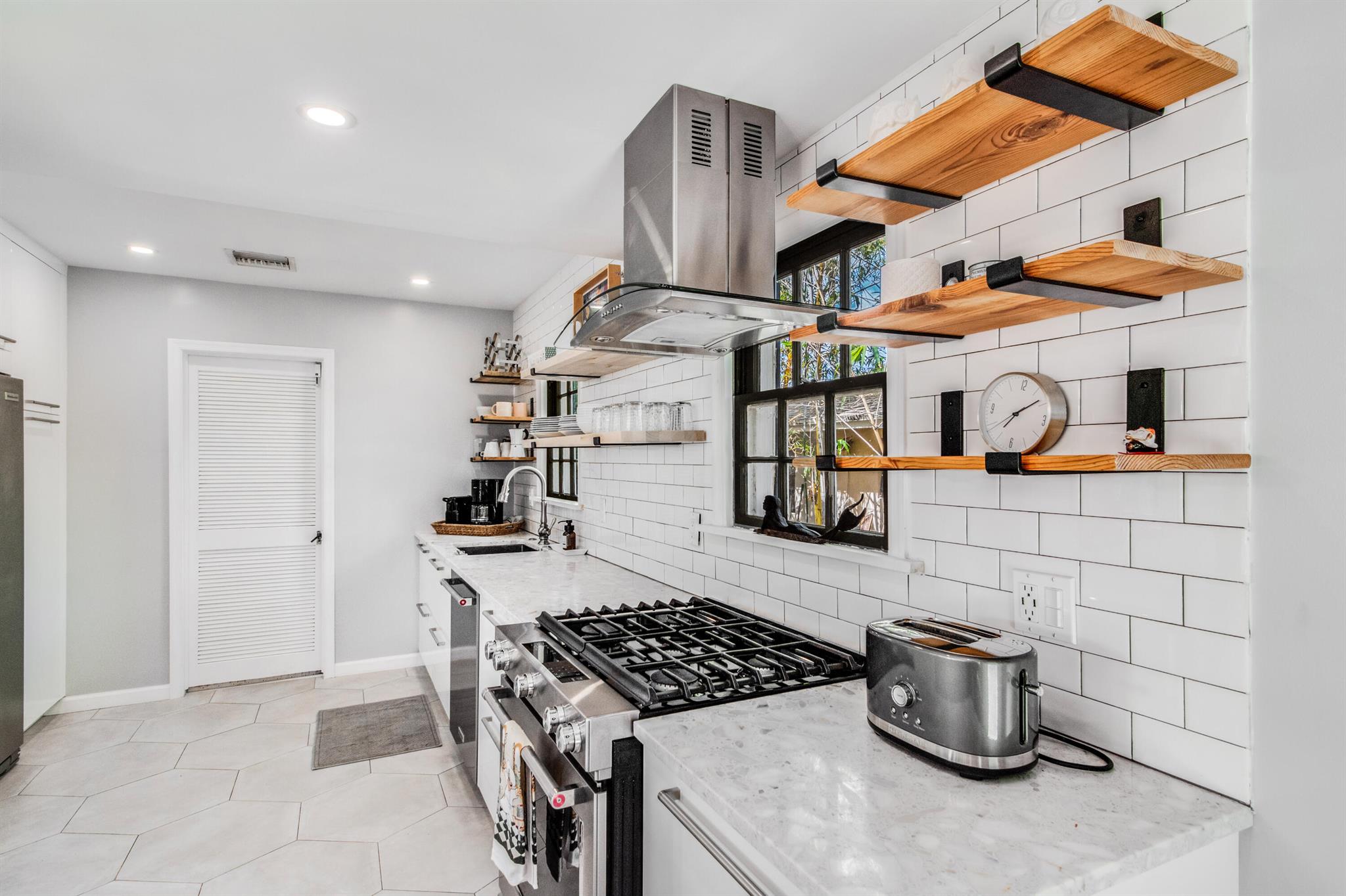 One of the ”Charming Cottages of Lake Worth Beach”. Updated 3 bedroom, 2 bath, home with original oak flooring, fireplace, and open staircase. New kitchen and baths, gas range, custom kitchen cabinetry w/quartz counters. One car garage w/laundry, gas water heater, and storage. The roof is new and has strapping applied. The windows are all original with storm shutters. The house is very charming with original details, original stair railing, wrap-around dining room windows looking out to the deck and large yard. There is room to build a garage/guest house, and pool. There is a bedroom suite on the 2nd floor with a deck overlooking the yard, and a full bath. Two bedrooms are on the first floor and a full bath. Close to the Lake Worth Golf Course/waterfront restaurant, and Downtown LWB