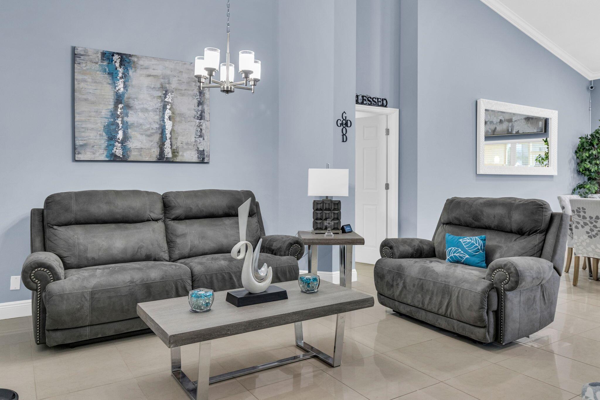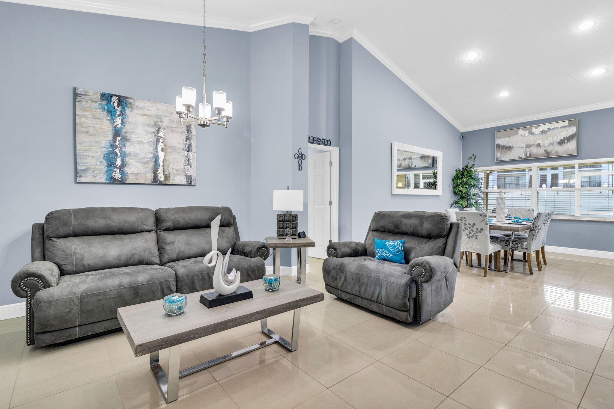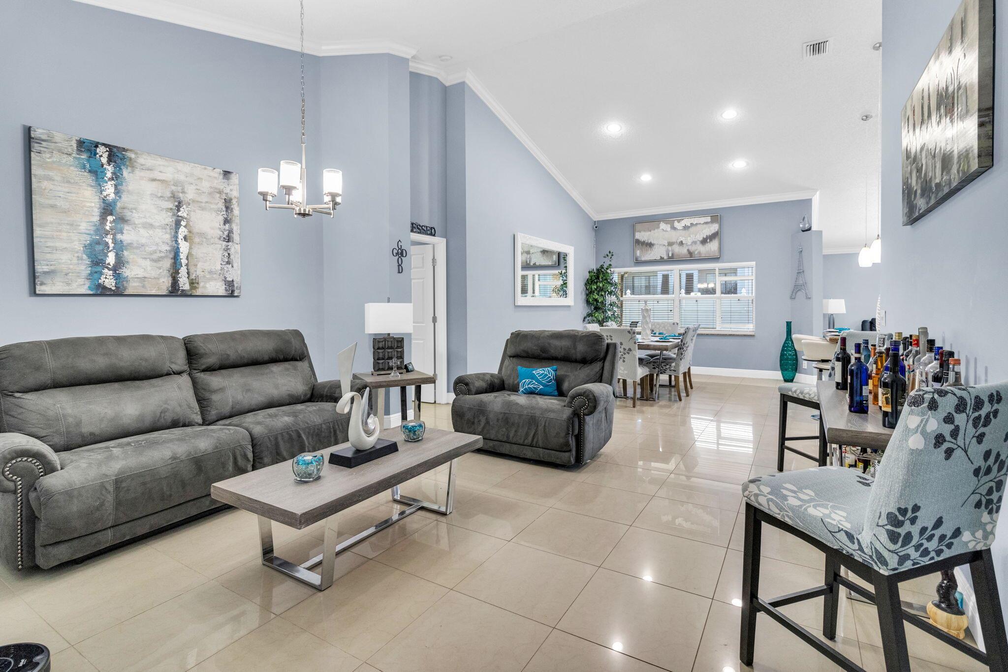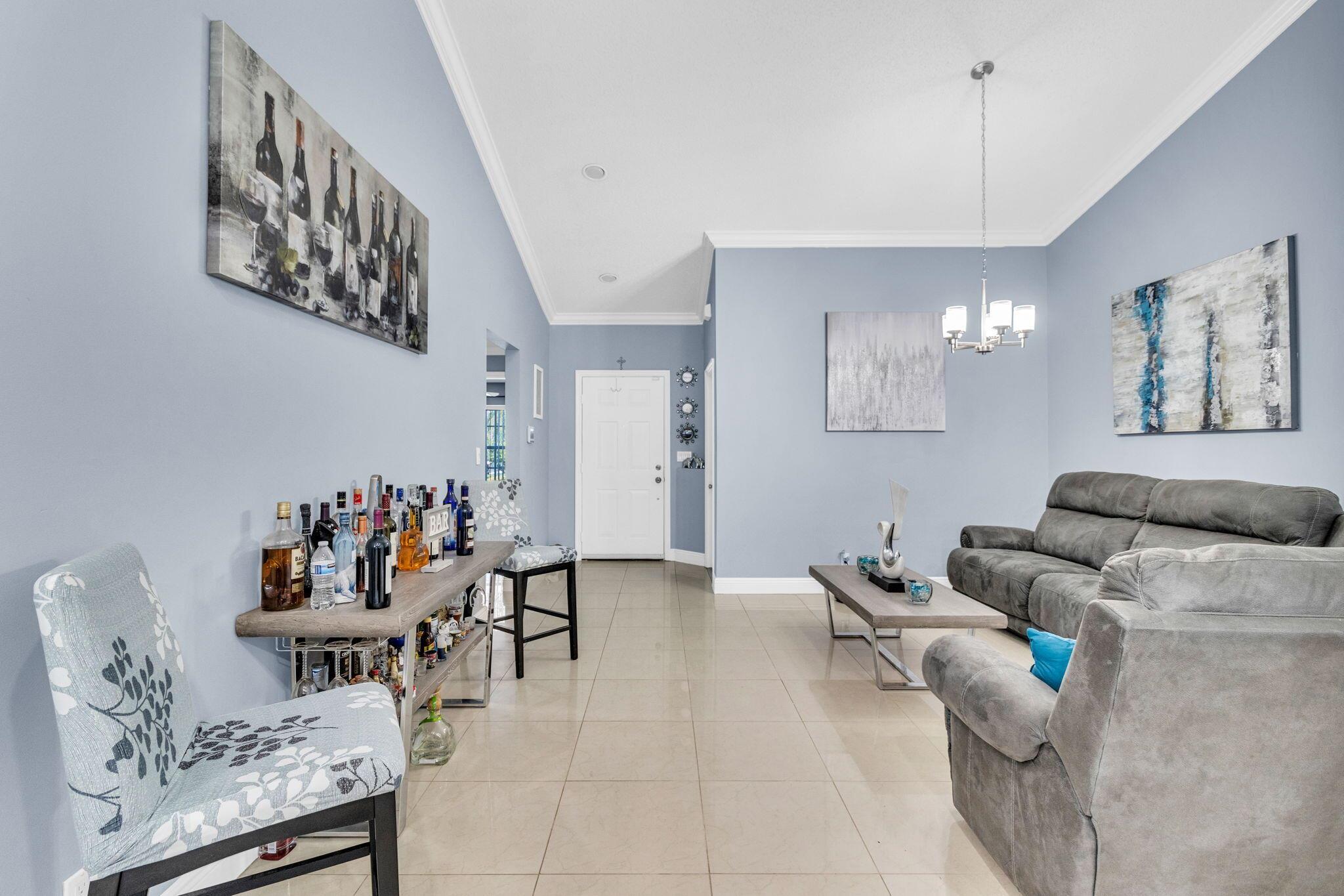 Welcome home! Enjoy this 3-bedroom, 2-bathroom, 2-car garage home, this gem nestled in the heart of Royal Palm Beach. Enjoy the inviting charming crown molding that is complemented by high-hat lighting. Open floor plan kitchen was renovated 3 years ago. Kitchen cabinets with 2 lazy Susan for extra organization. Granite countertops, porcelain tile throughout. Screened in patio with pavers perfect for enjoying you’re morning coffee. Exterior is surrounded by luscious green grass. Solar panels that provide a electric bill of $15-$20. Roof replaced in 2021, AC replaced in 2017, new water heater, new PVC white fence. Hurricane shutters for storm protection. Epoxy garage floor. Storage shed. The driveway has been extended with pavers. Window treatments will convey. Furniture is negotiable.