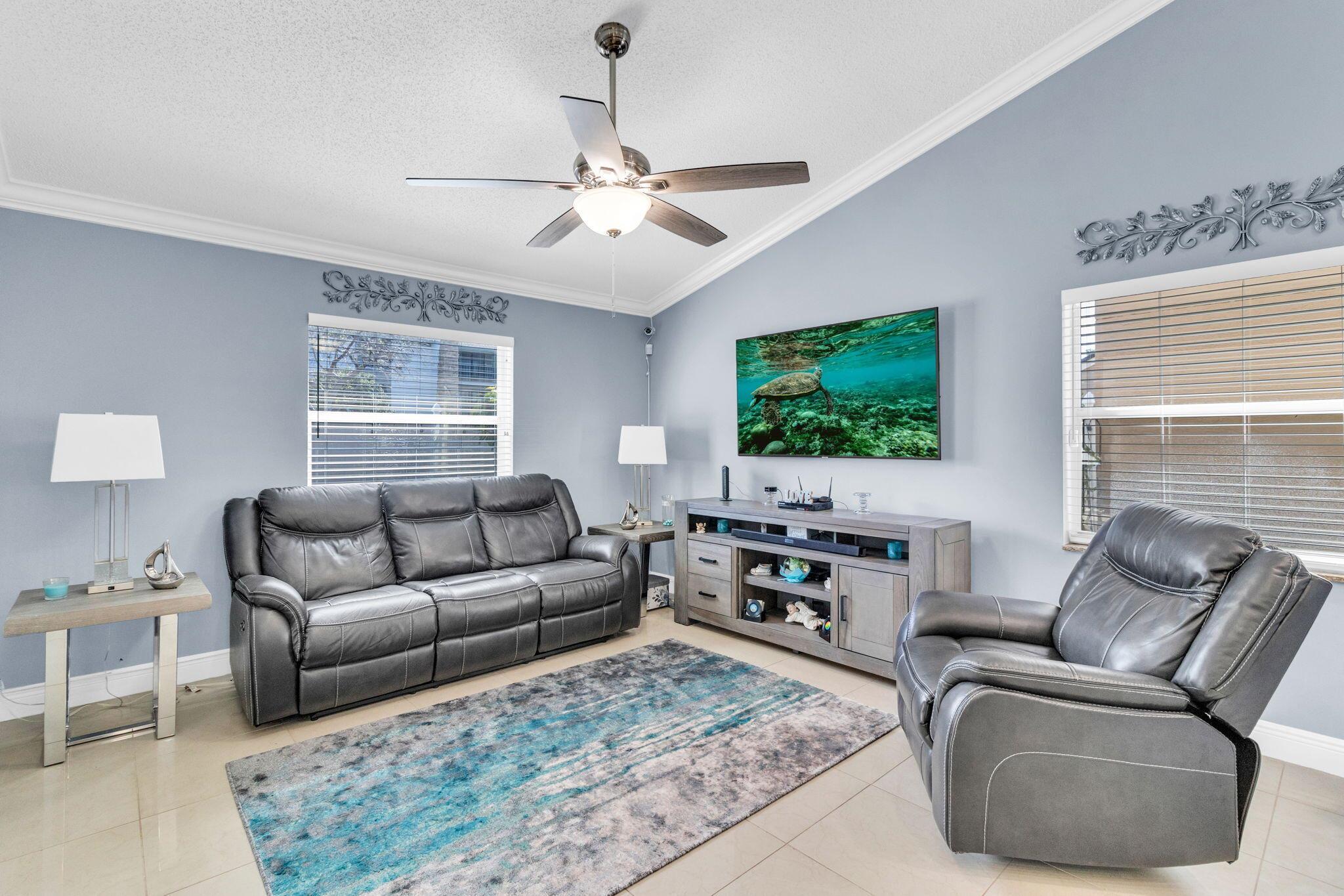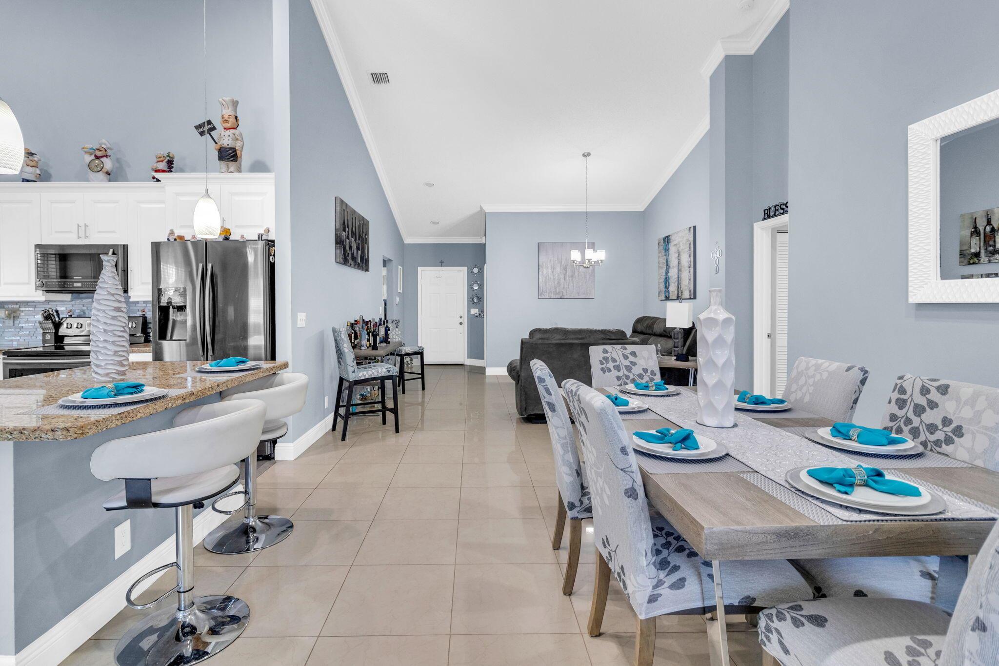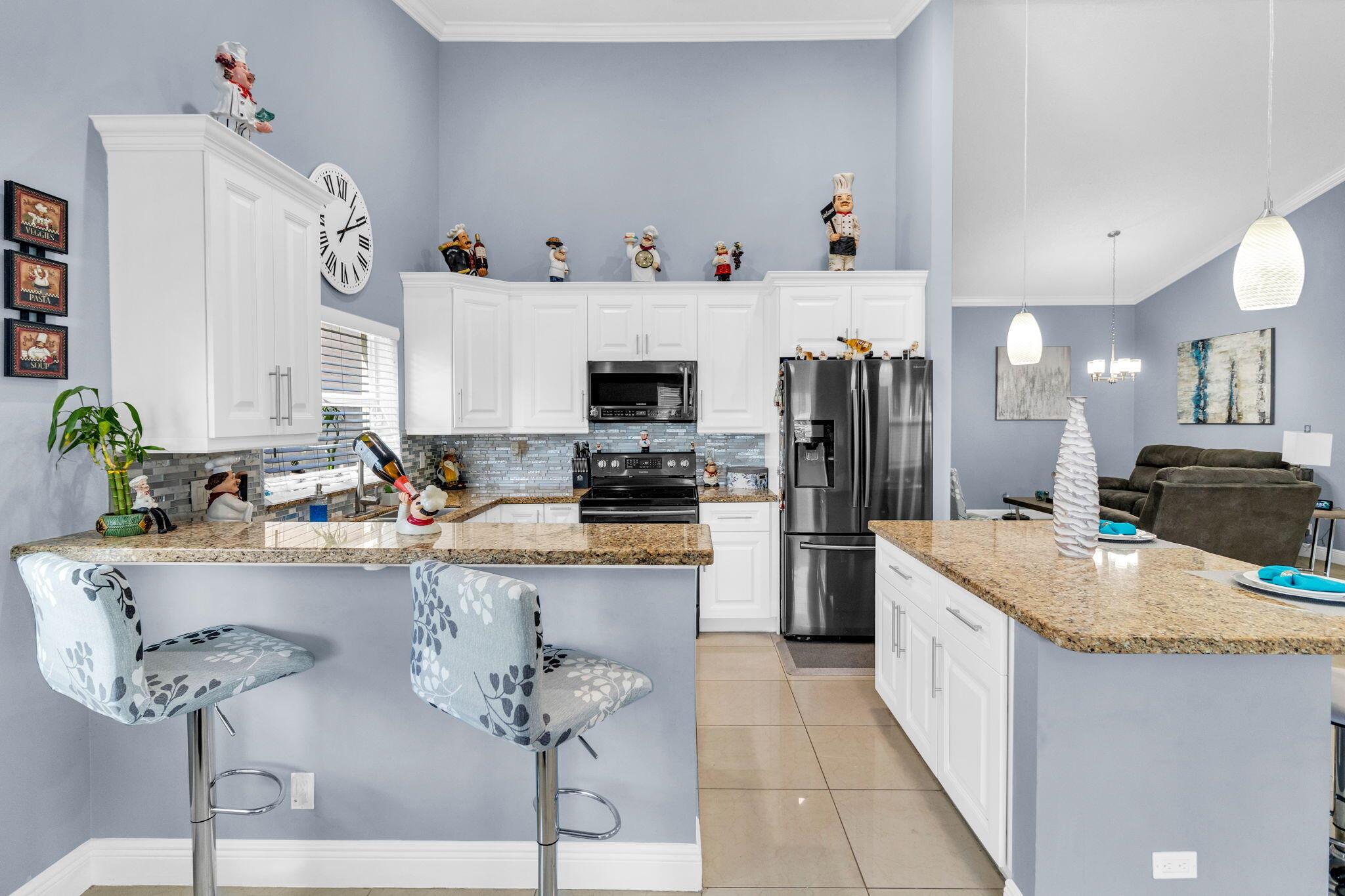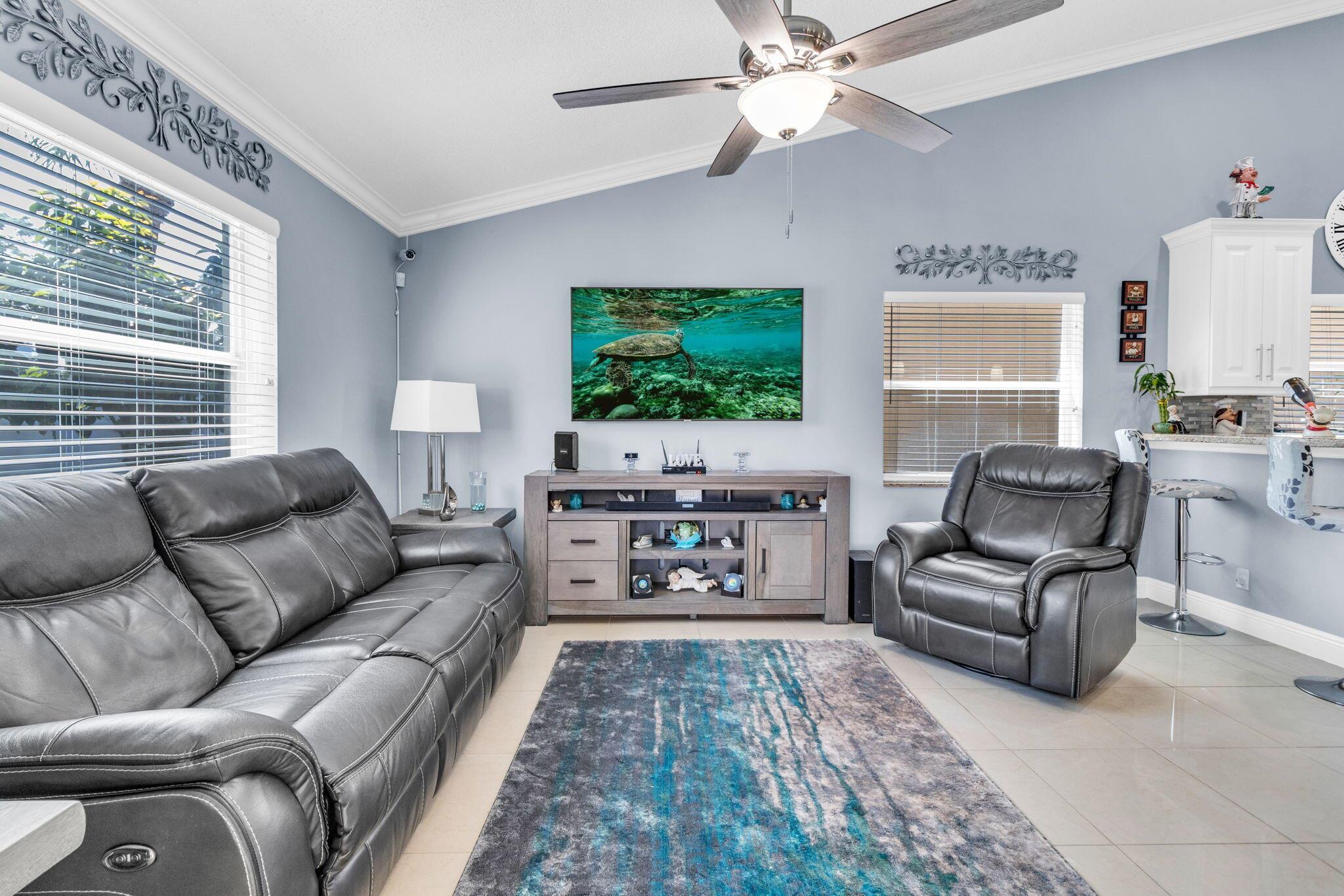 Welcome home! Enjoy this 3-bedroom, 2-bathroom, 2-car garage home, this gem nestled in the heart of Royal Palm Beach. Enjoy the inviting charming crown molding that is complemented by high-hat lighting. Open floor plan kitchen was renovated 3 years ago. Kitchen cabinets with 2 lazy Susan for extra organization. Granite countertops, porcelain tile throughout. Screened in patio with pavers perfect for enjoying you’re morning coffee. Exterior is surrounded by luscious green grass. Solar panels that provide a electric bill of $15-$20. Roof replaced in 2021, AC replaced in 2017, new water heater, new PVC white fence. Hurricane shutters for storm protection. Epoxy garage floor. Storage shed. The driveway has been extended with pavers. Window treatments will convey. Furniture is negotiable.