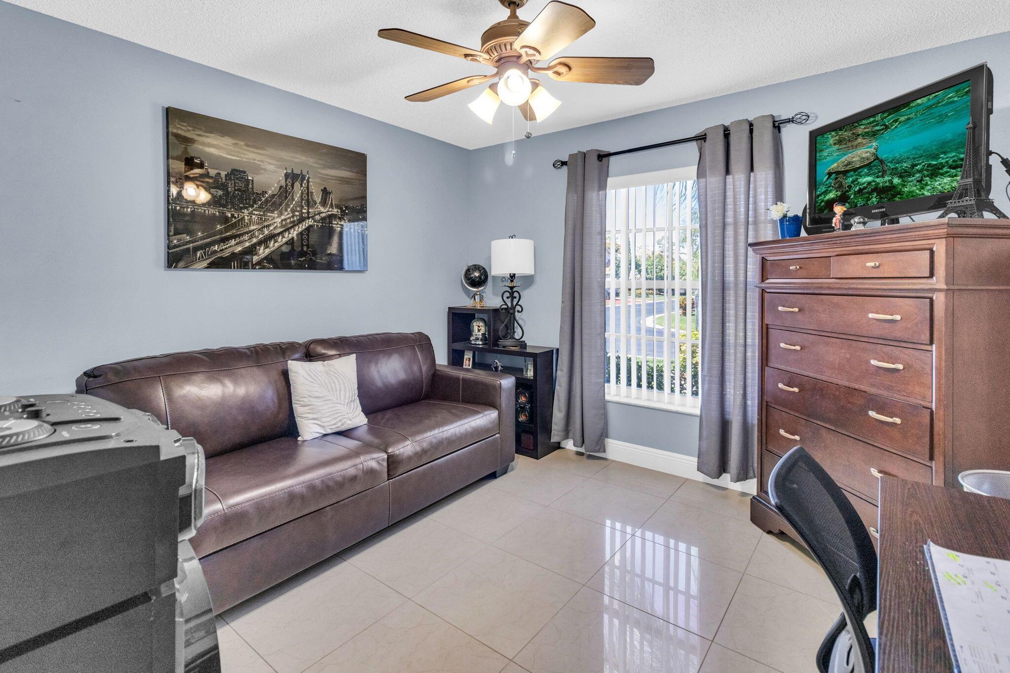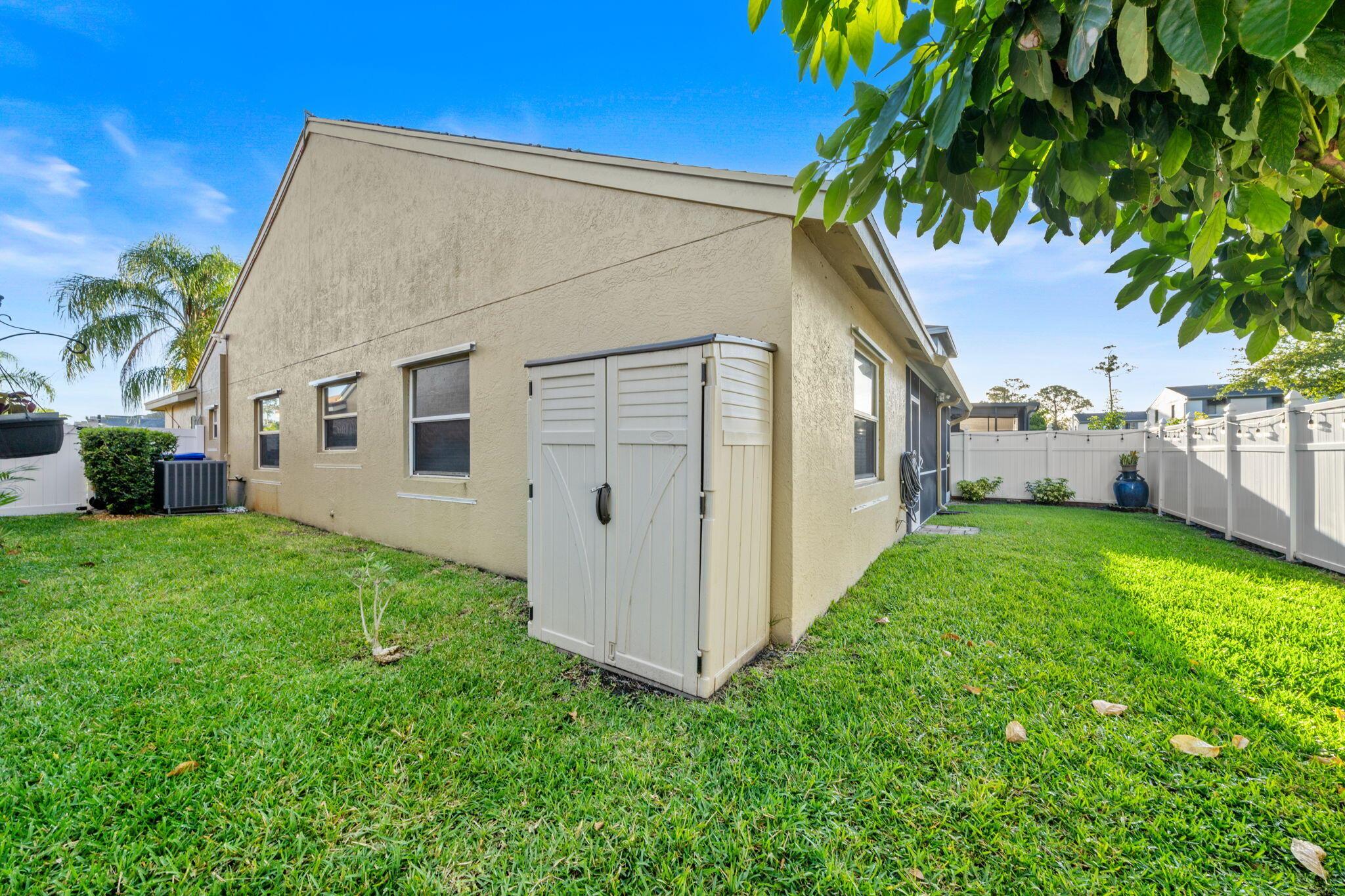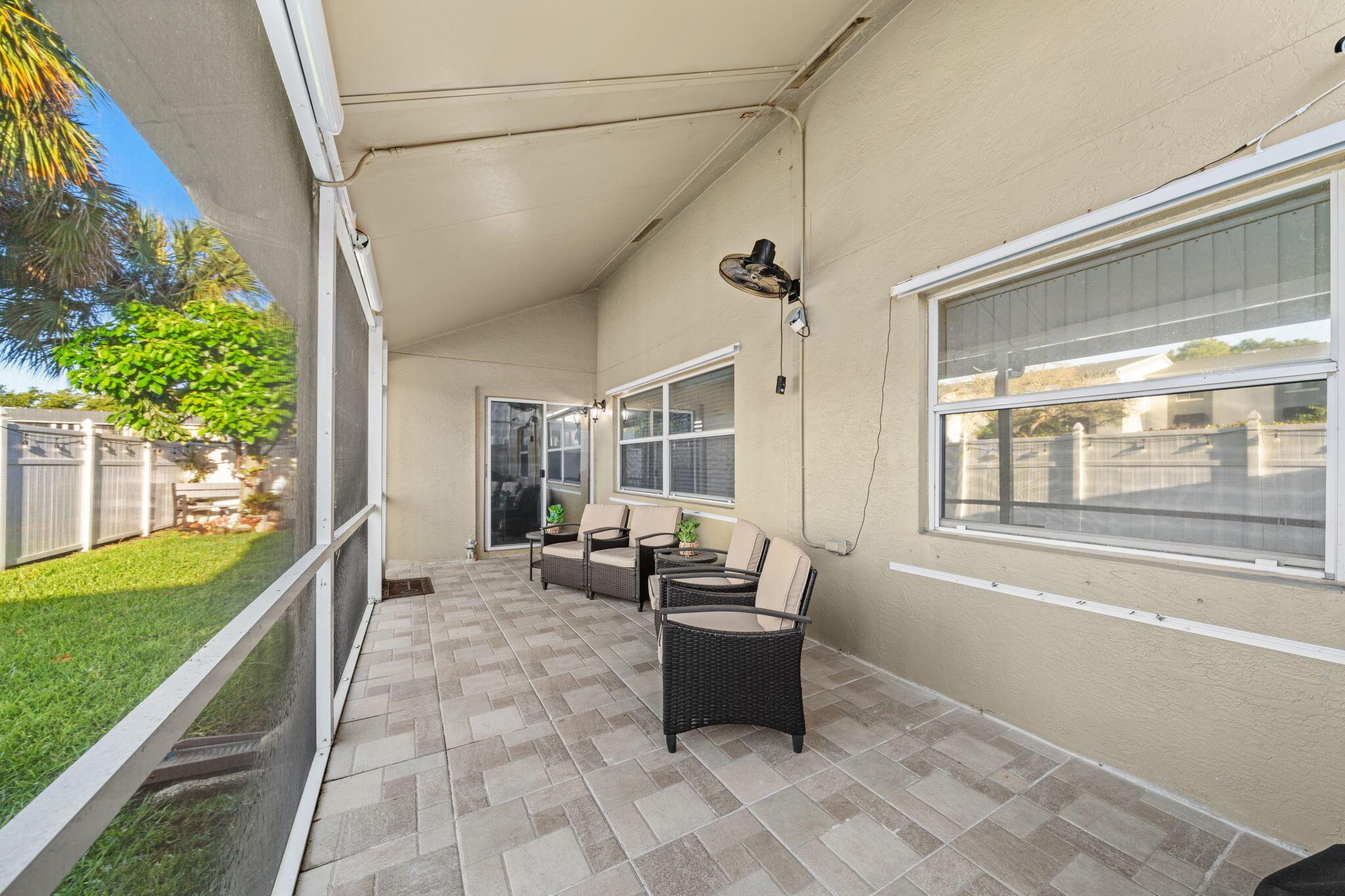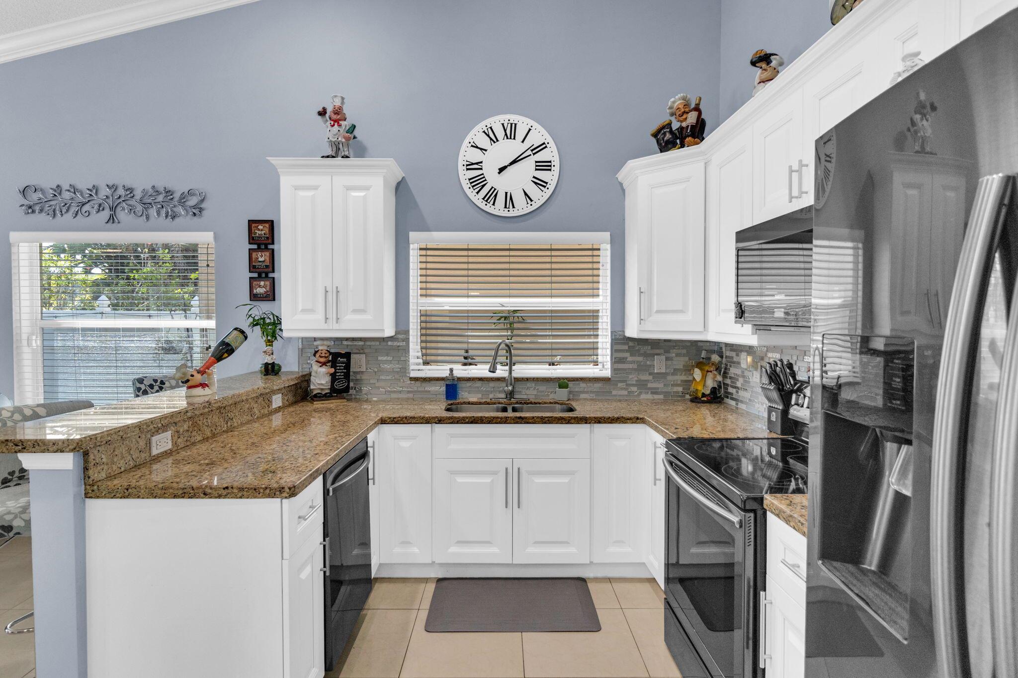 Welcome home! Enjoy this 3-bedroom, 2-bathroom, 2-car garage home, this gem nestled in the heart of Royal Palm Beach. Enjoy the inviting charming crown molding that is complemented by high-hat lighting. Open floor plan kitchen was renovated 3 years ago. Kitchen cabinets with 2 lazy Susan for extra organization. Granite countertops, porcelain tile throughout. Screened in patio with pavers perfect for enjoying you’re morning coffee. Exterior is surrounded by luscious green grass. Solar panels that provide a electric bill of $15-$20. Roof replaced in 2021, AC replaced in 2017, new water heater, new PVC white fence. Hurricane shutters for storm protection. Epoxy garage floor. Storage shed. The driveway has been extended with pavers. Window treatments will convey. Furniture is negotiable.