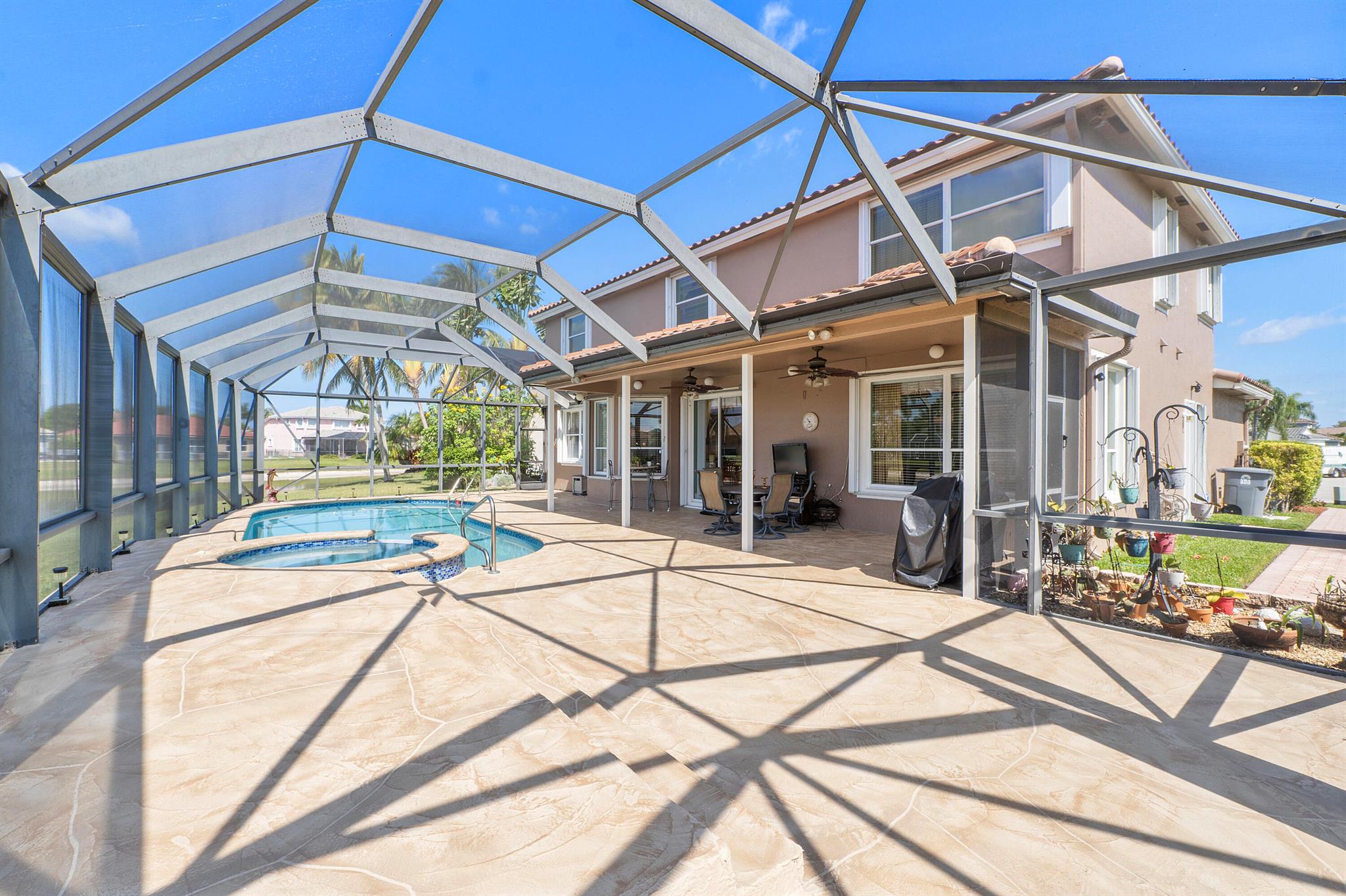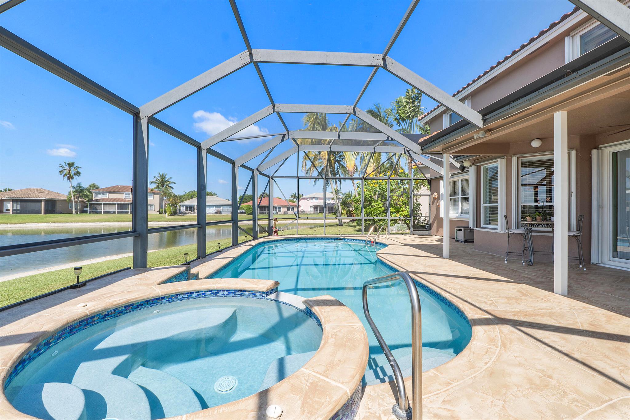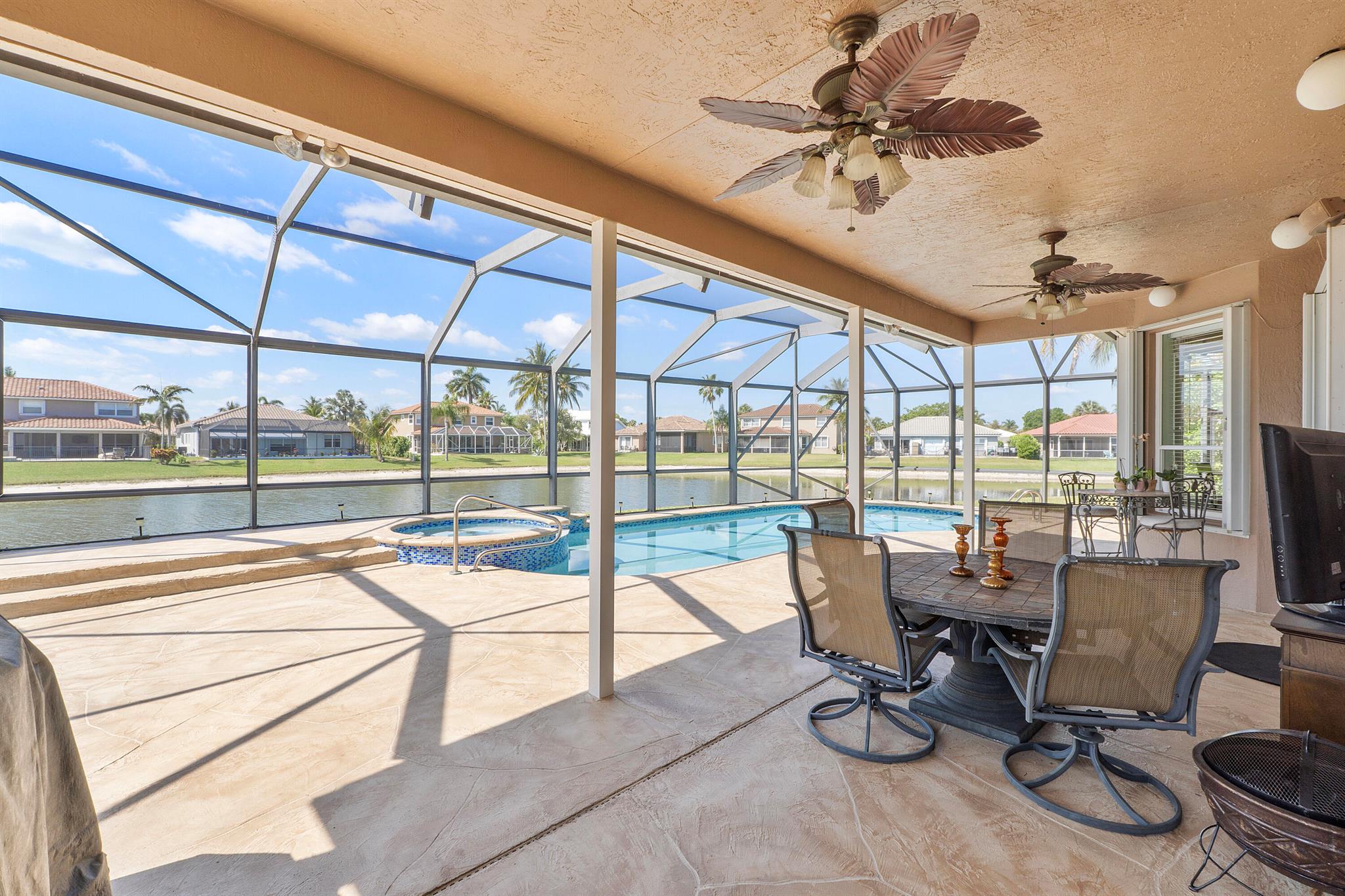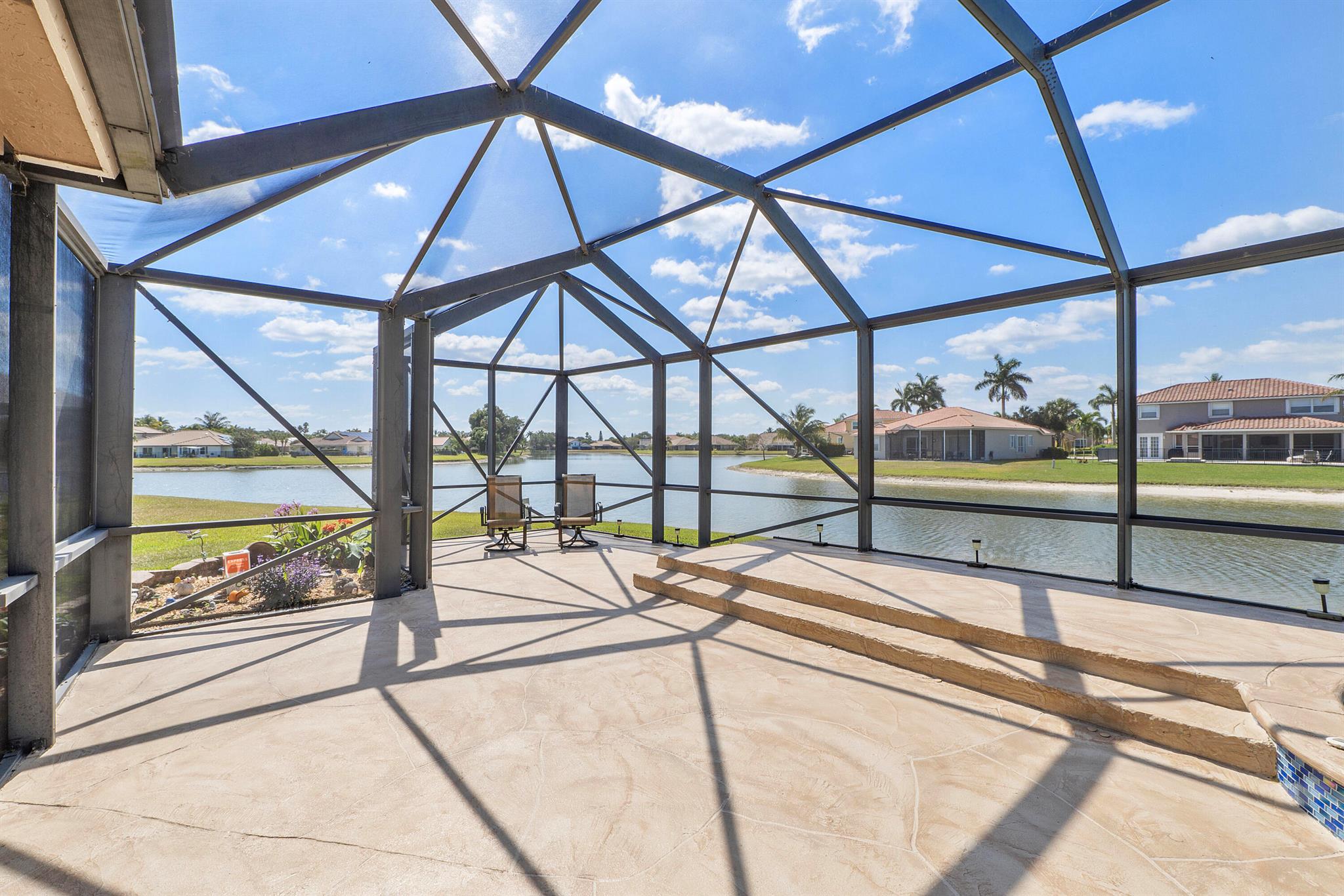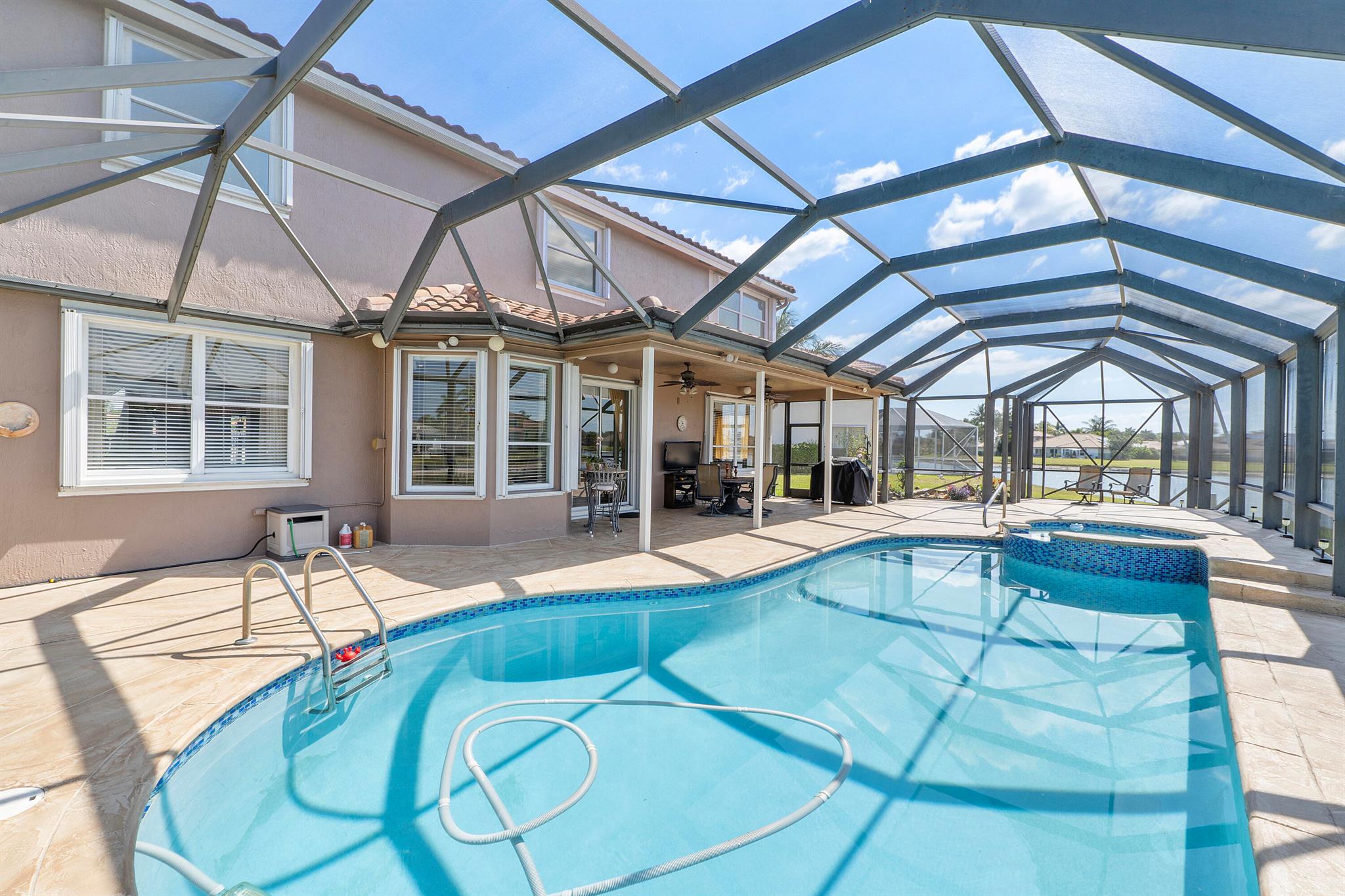 Looking for a beautiful 4 Bed 3 Bath single family home in a pet-friendly community? Check out Boca Winds -Waterway! the home features granite countertops, SS appliances, accordion shutters, roof (2022) water heater (2020), two AC units (2022), an enclosed sparkling swimming pool/spa, and an additional enclosed extended backyard to sunbathe on your lounge chairs, pool pump (2020), irrigation timer ((2022), pool filter motor (2021), exterior water piping (2021). While enjoying the panoramic lake views and the lovely sparkling swimming pool. Unique selling points include sunrise/sunsets from your backyard, lake views, enclosed pool/spa, Cul de sac, 3 car garage, Central Vacuum and it has 13 removable screens which are easy to take out. Screen house beams are sturdy and larger than normal.