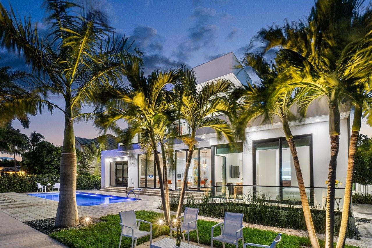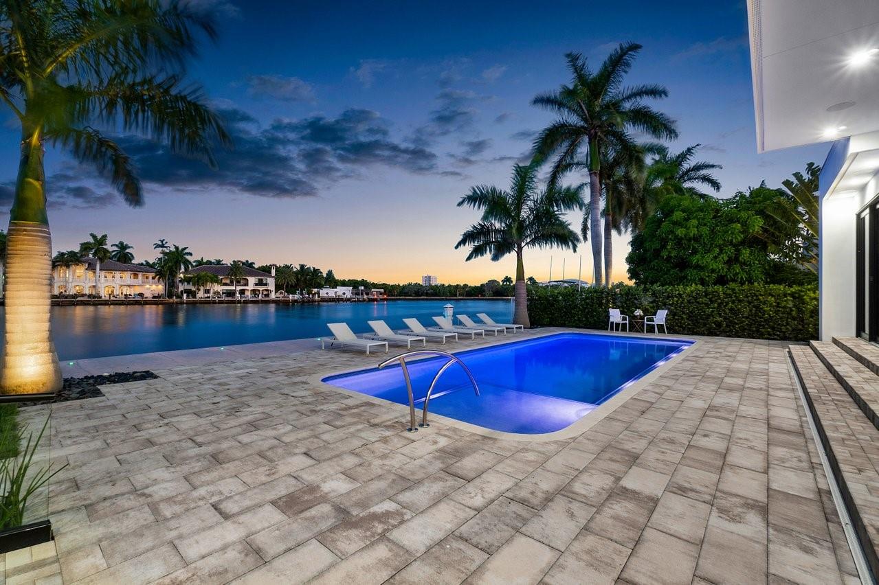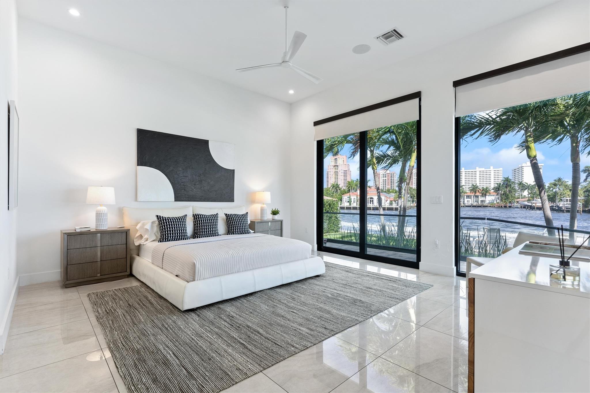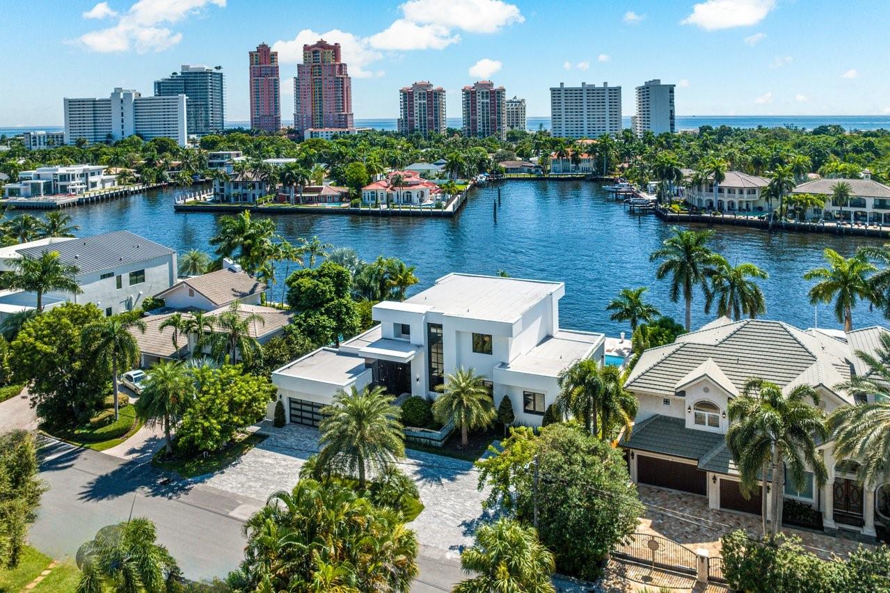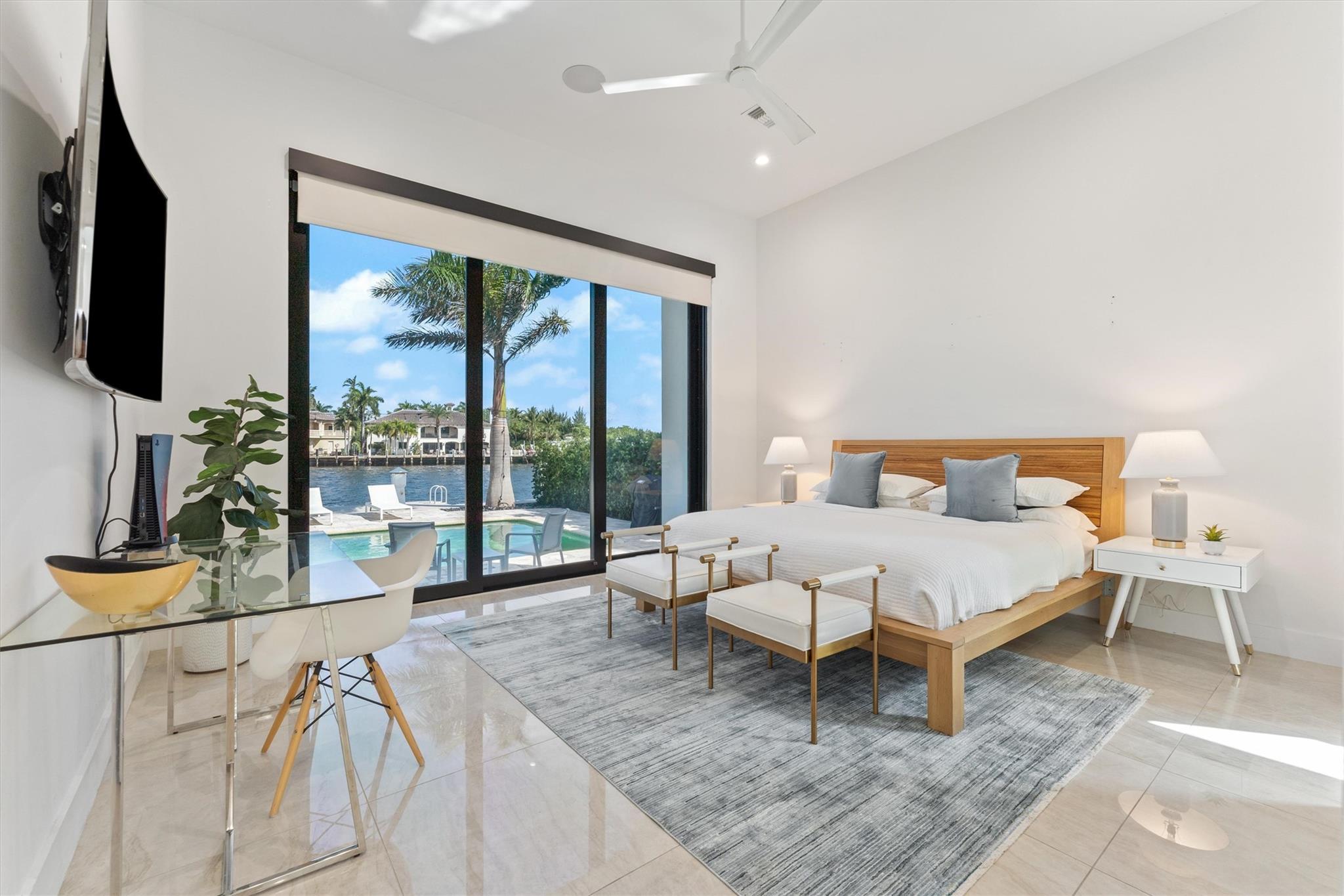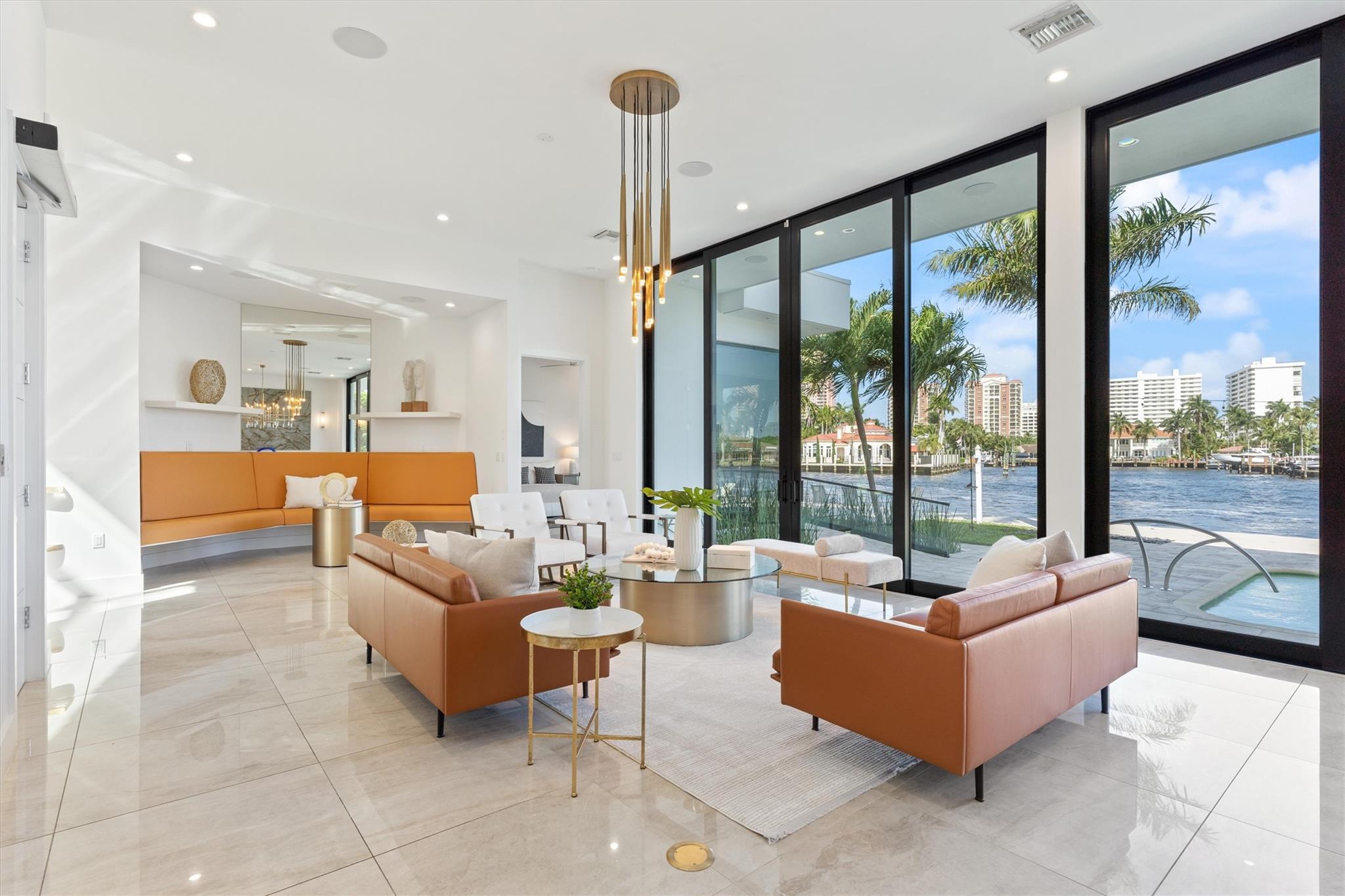 Introducing an Incomparable Intracoastal Masterpiece; this home promises open-concept luxury living. With 5 bedrooms including 2 Primary Suites, 4.5 bathrooms, and Handicap accessibility features. From the stone-clad entrance to the dramatic floating staircase and glass elevator, you enter into a grand open floor plan with volume ceilings. Expansive windows offer stunning water and park views, blending indoor and outdoor living. Inside, enjoy a gourmet kitchen with Miele and Bosch appliances, luxurious bathrooms including a matching outdoor shower. With four Trane air conditioners, comfort is ensured year-round. Large Heated Pool for laps or lounging. 100 Foot Dock, Deep Water, Ocean Access. Smart Home Ready and Sonos throughout. Don’t miss calling Coral Ridge’s best street home!