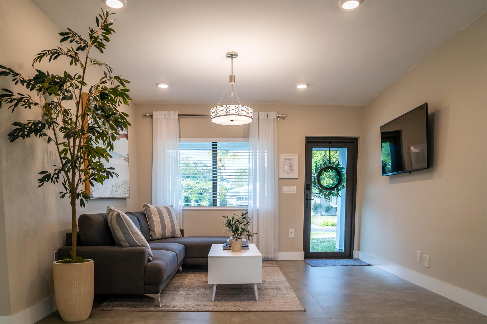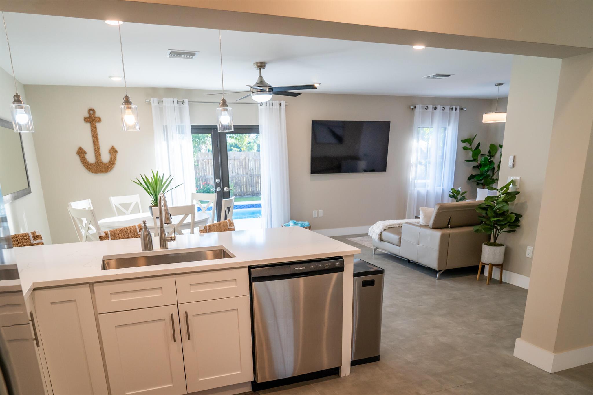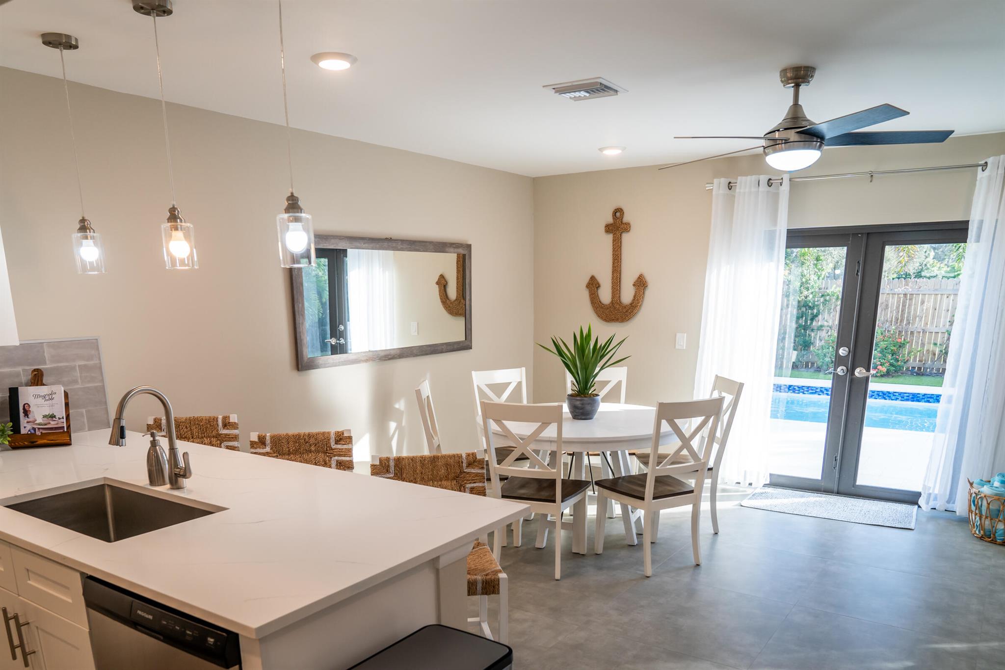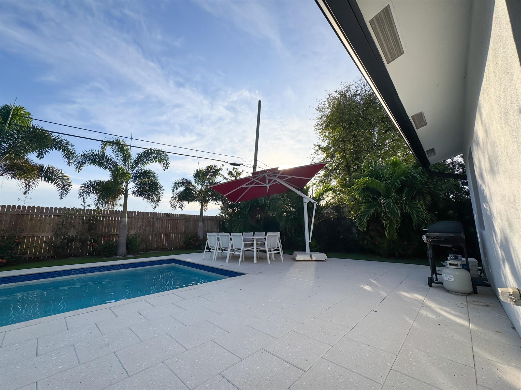 Live the Florida lifestyle in this cozy coastal gem conveniently located just a few minutes to the beach and a quick golf cart ride to famous Downtown Delray for fine dining, shopping and nightlife. This home is move in ready, being sold completely furnished. Perfect for entertaining with a spacious open floor plan. Stylish French doors opening to your stunning fenced backyard oasis designed with luxury and privacy in mind. Complete hurricane doors and windows, brand new pool and backyard turf for a clean look and easy maintenance. This home has four bedrooms and three full baths, open kitchen concept, family room, living room and dining room, custom closets and extra storage.