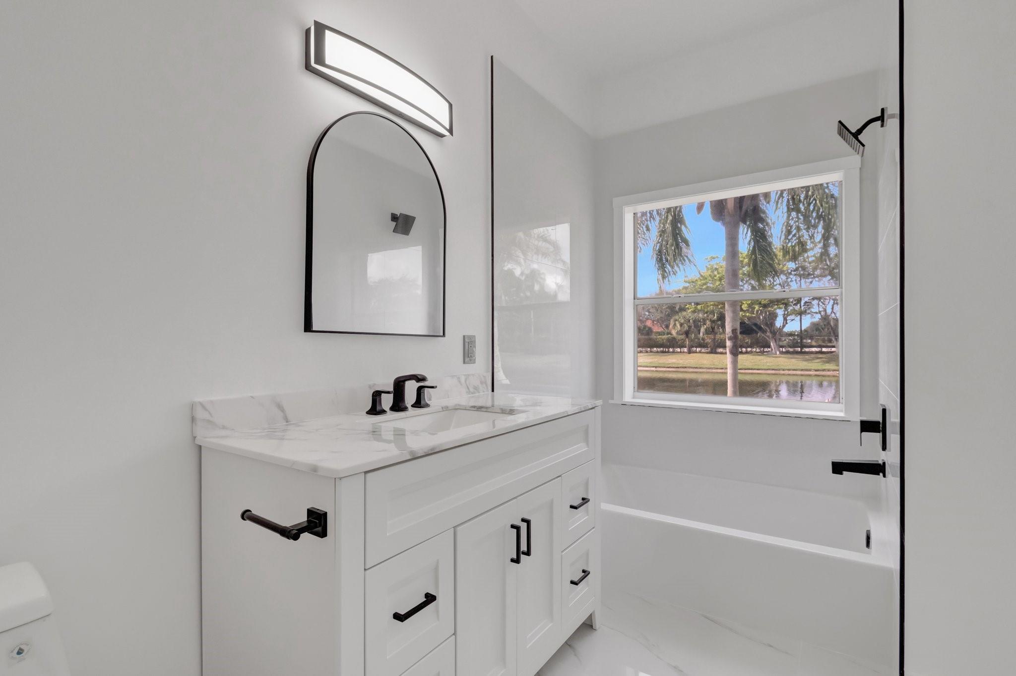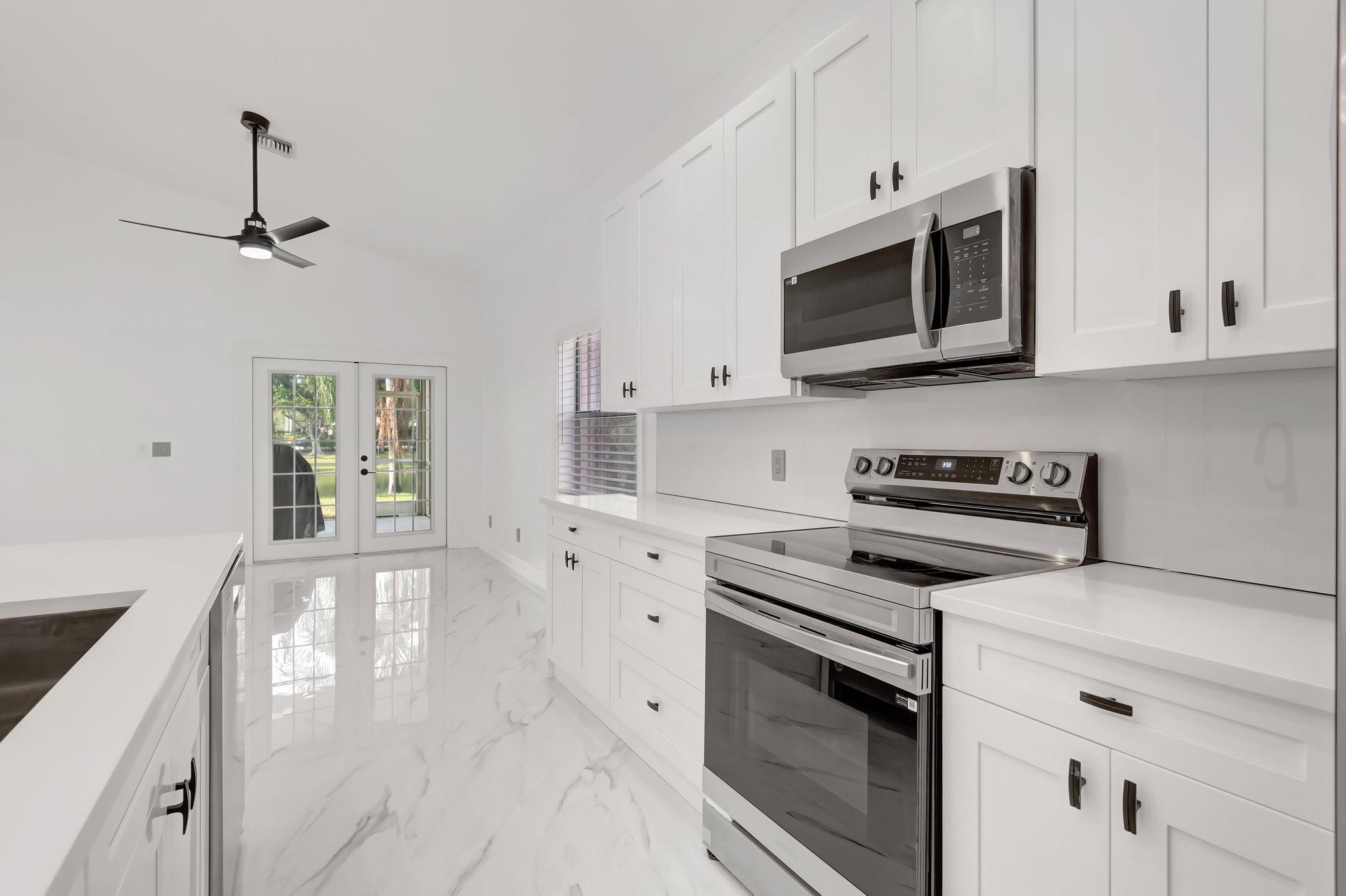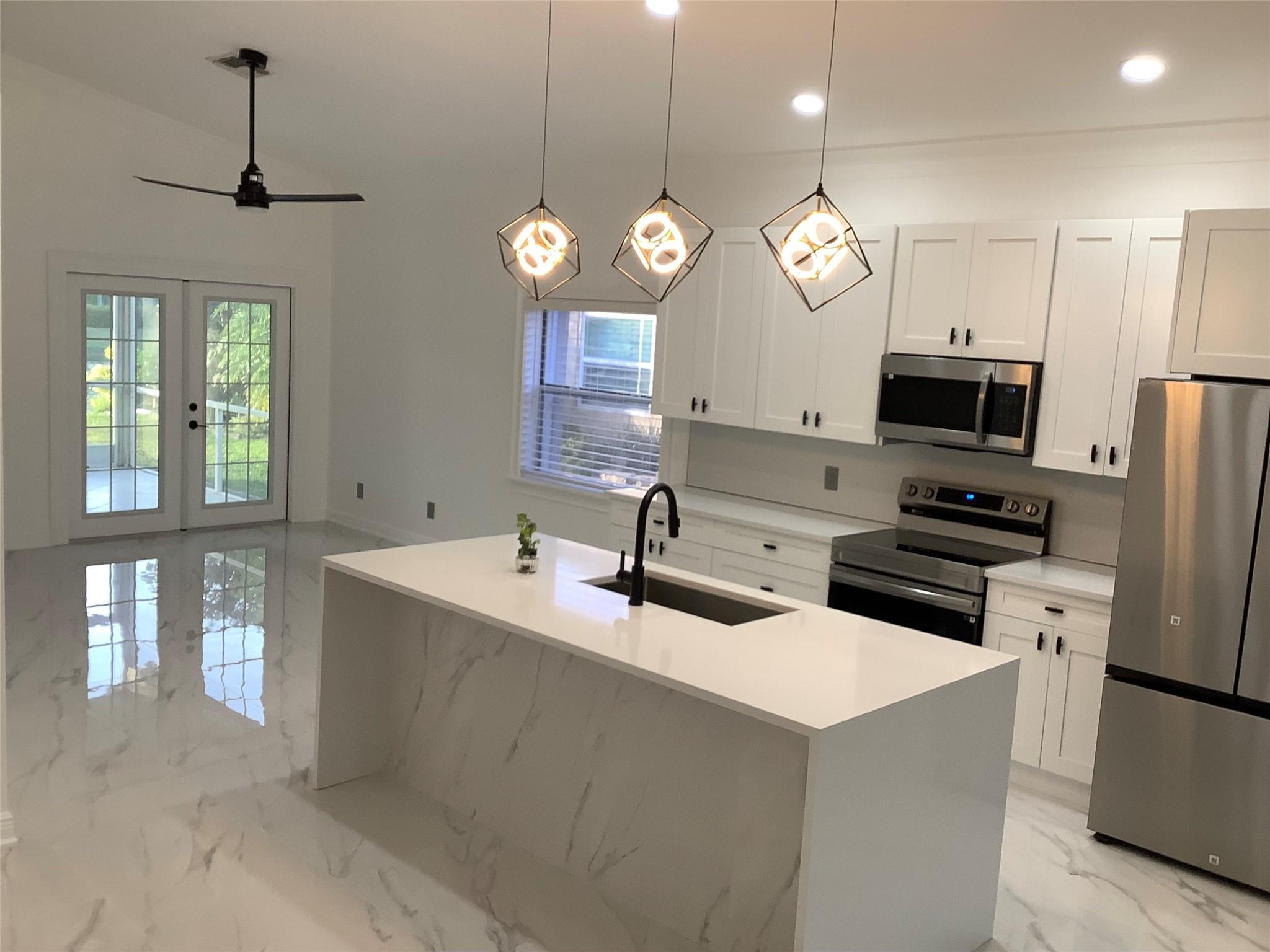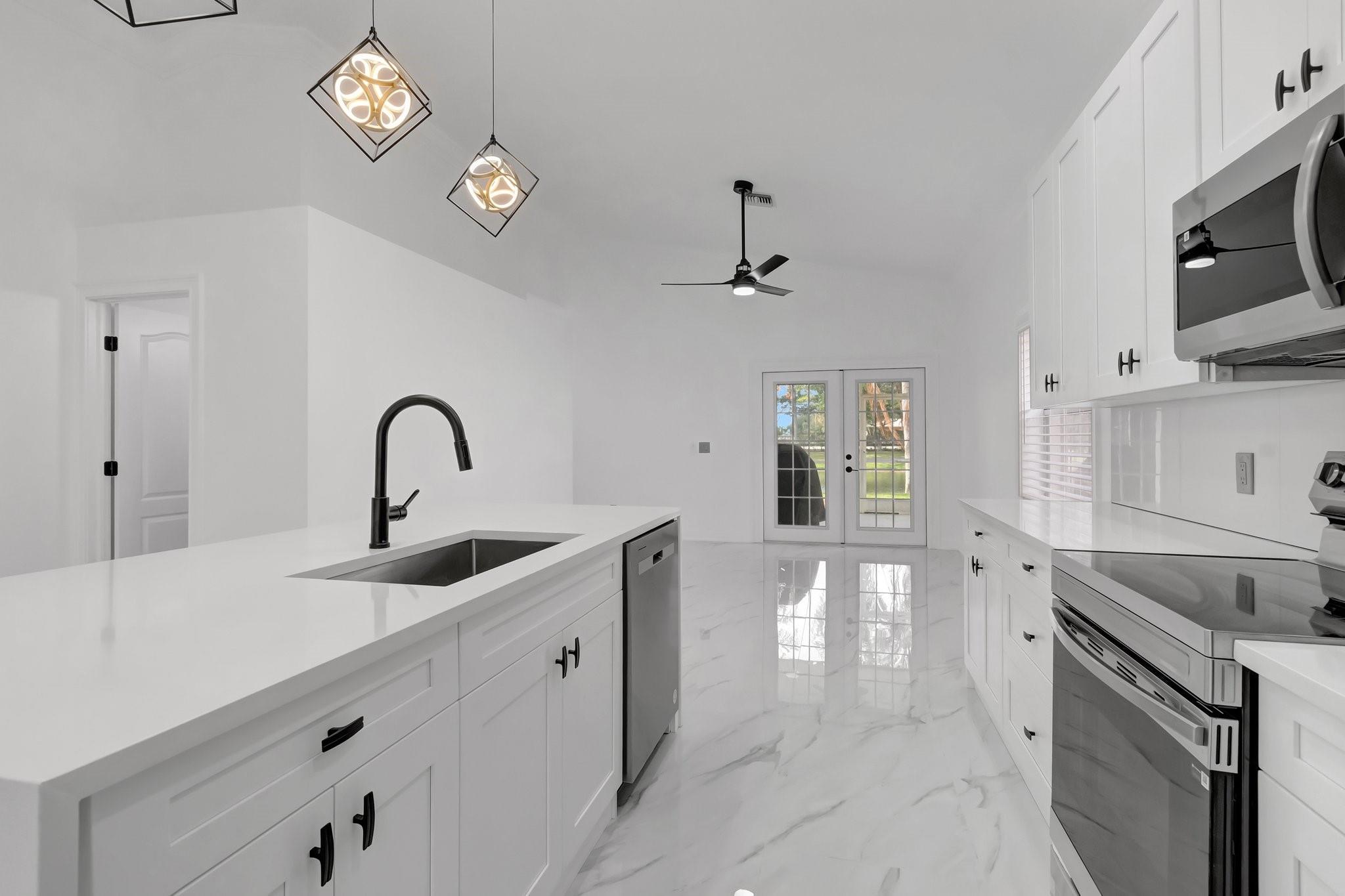 Investors dream. Stunning fully remodeled single-family home w/ 3 bedrooms & 2 new baths. This contemporary gem features white tile floors throughout the kitchen & living areas, granite countertops. Enjoy gatherings cooking in your new kitchen with state-of-the-art appliances, beautiful granite surfaces, & a stylish modern pendants lighting hanging over the Isle. Recessed lighting and fixtures, abundant natural light, new blinds, modern ceiling fans. Additional features include new back door, new front & back screen on patios, accordion shutters, & a 2017 roof. Private lot with a water view. Very low HOA and well-maintained community. Rated A school district. IN SOME ROOMS, THE FURNITURE HAVE BEEN VIRTUALLY STAGED. Seller opens to exchange this home for a smaller home as part of the deal.