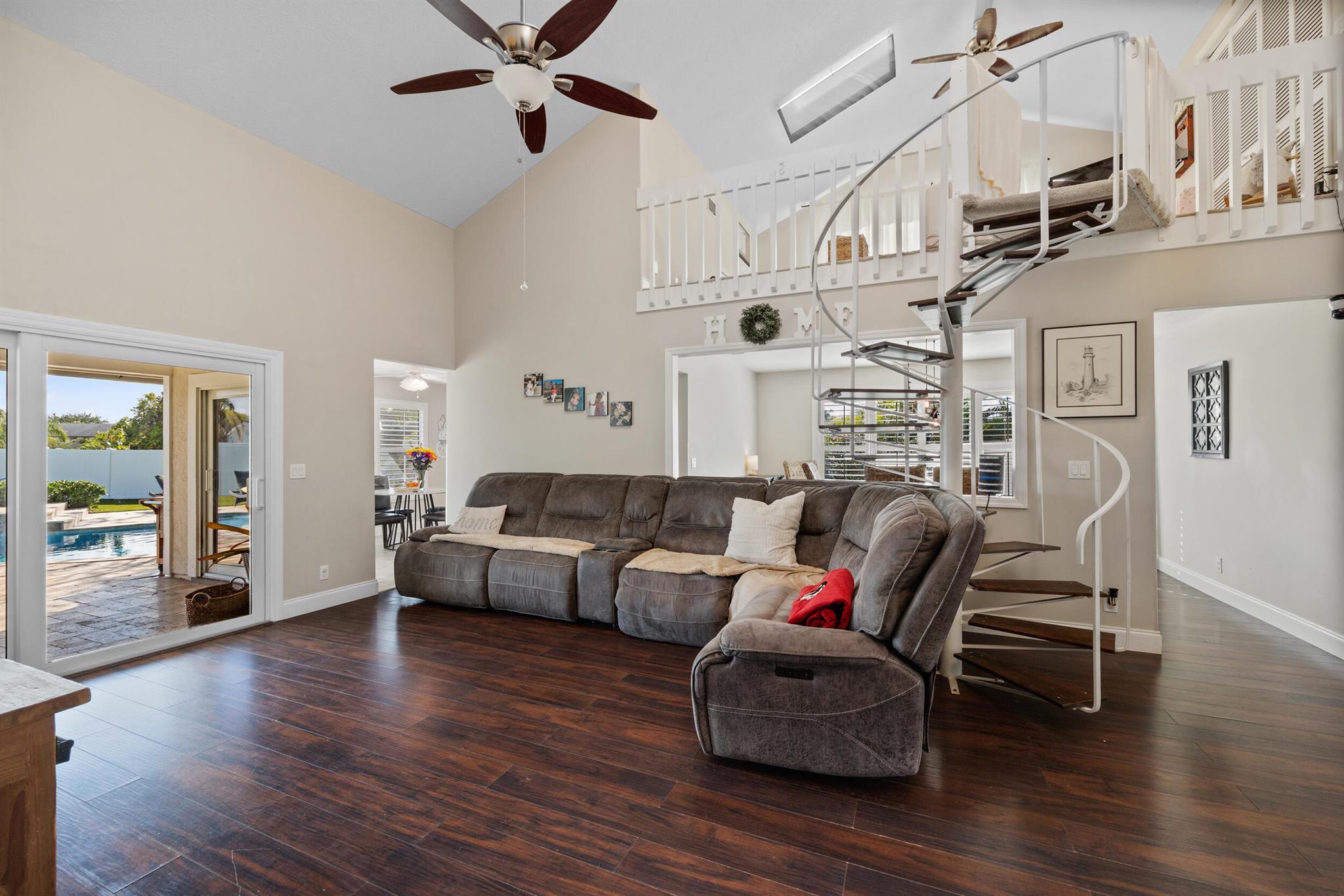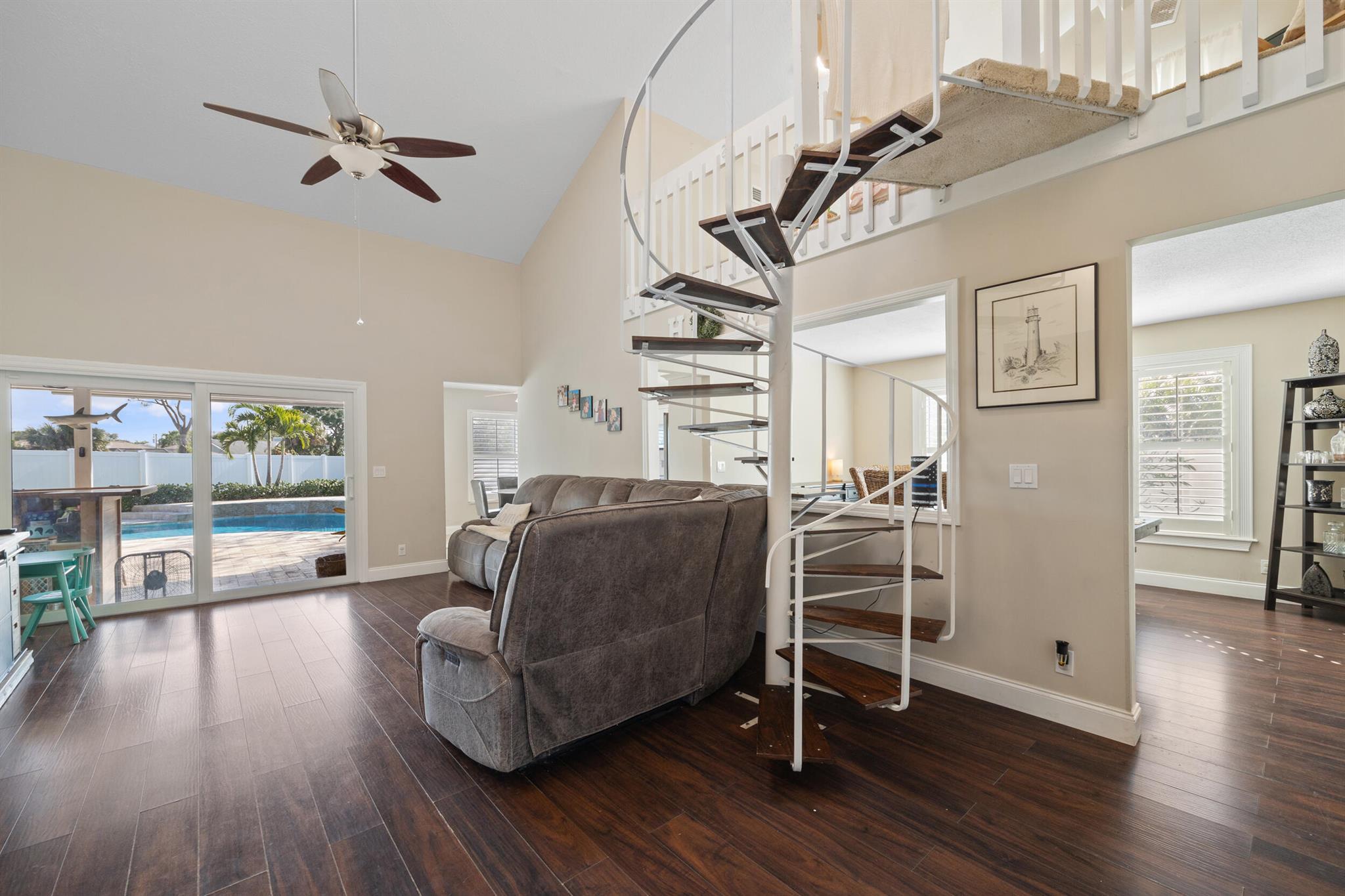 With an unparalleled location on a quiet cul-de-sac, this beautifully updated 3 bedroom pool-home is styled with elegance and ambiance. The home offers an abundance of character with volume ceilings, a formal dining room, plantation shutters and an expansive loft. Accessed via a spiral staircase, the finished loft can serve as an office, play-room or a potential 4th bedroom. The residence affords the owner an extensive list of recent upgrades. These include the comfort and security of impact windows & doors, a modern eat-in kitchen with quartz counters, custom cabinetry and stainless steel appliances, charming baths, an exquisite salt-water pool, pool deck and patio, an expansive synthetic turf rear yard, fencing and gutters.
