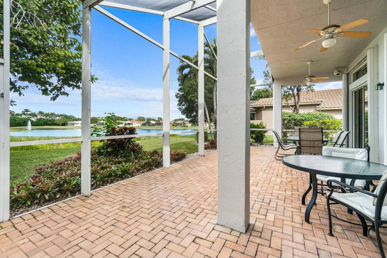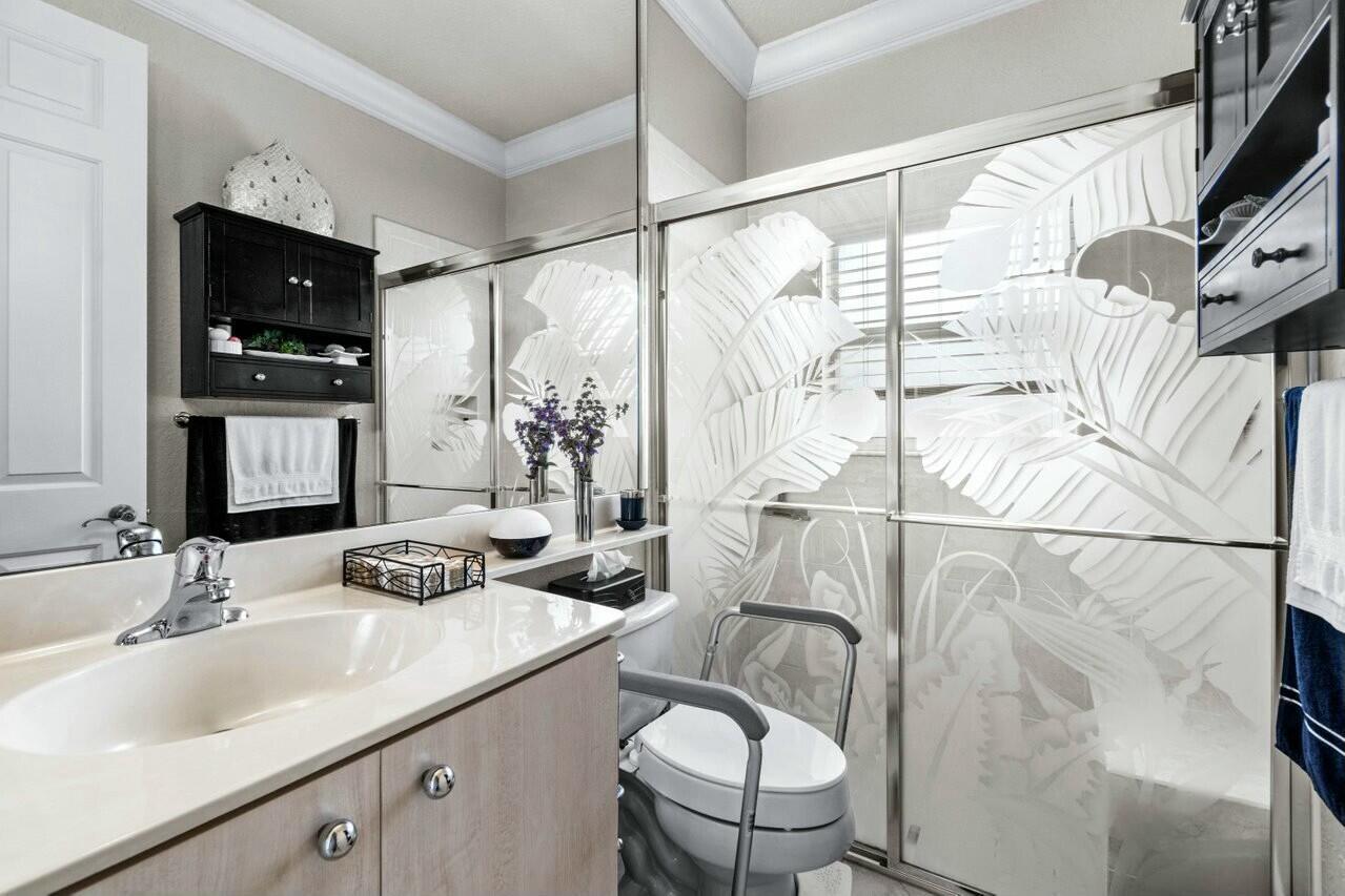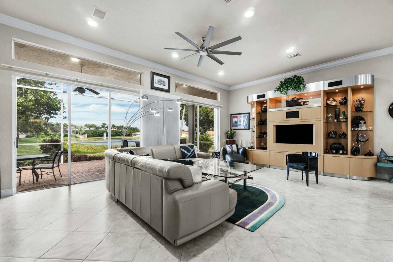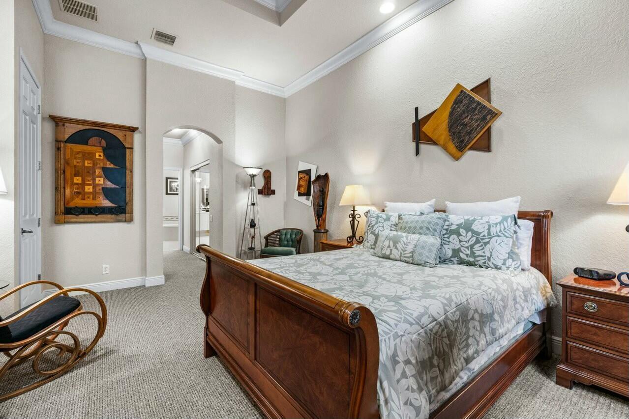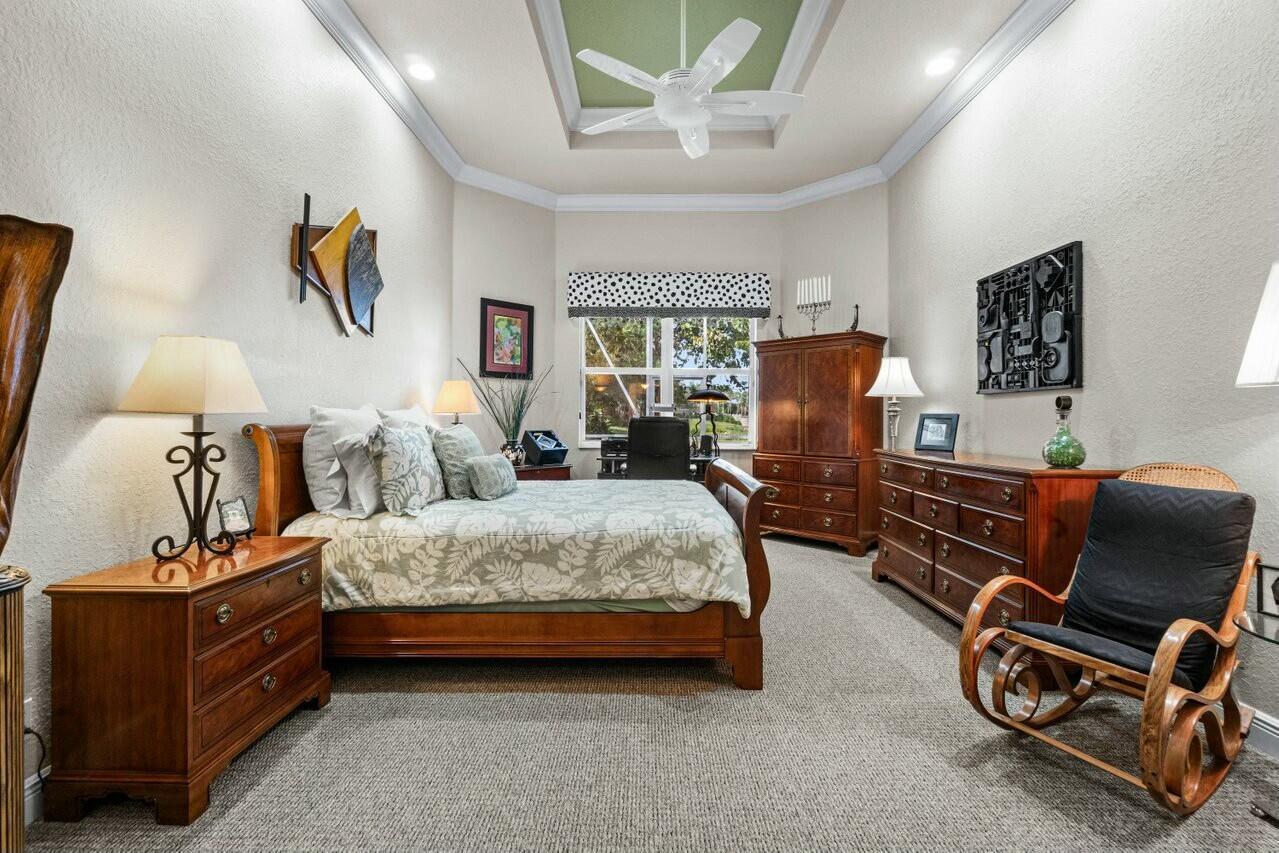 Welcome to your dream home in Bellaggio, an exclusive 55+ resort community. This stunning 2 bed+den, 2 bath lakefront home is a rare gem, nestled on a cul-de-sac with no neighbors on three sides. The elongated driveway leads to glass-etched doors opening into a roomy foyer. Tile on the diagonal thru all but the bedrooms. The spacious, open-concept floor plan features high ceilings, crown moldings, and trey ceiling in the primary. The large eat-in kitchen features stainless-steel appliances, half bevel-edge granite countertops and bar stool seating. The primary bedroom has two walk-in closets with custom shelving. The ensuite bathroom features dual vanity, jetted tub and separate shower. The guest bedroom has custom shelving and closets. Beautifully landscaped, this home is fully