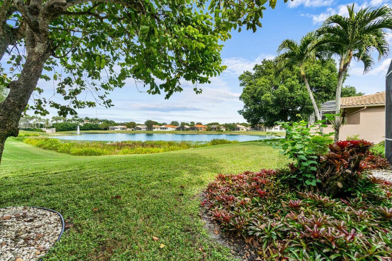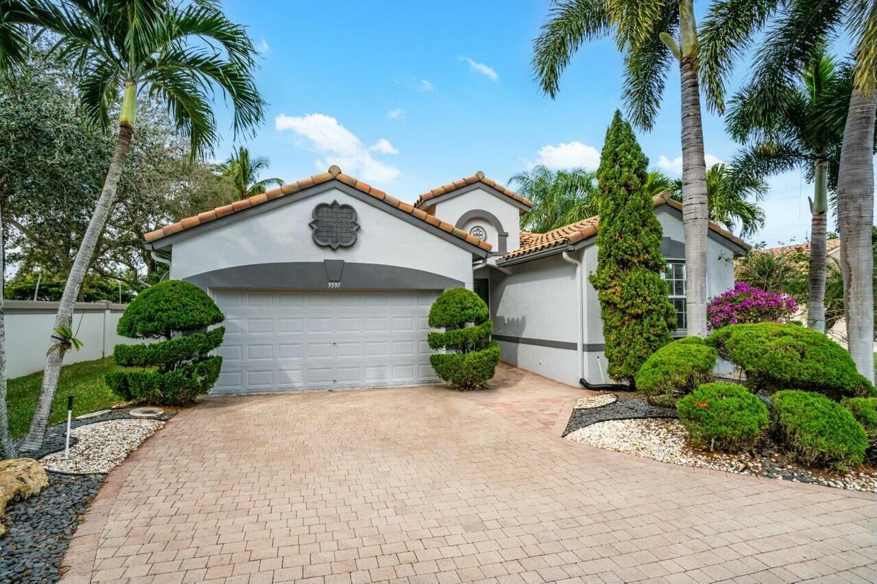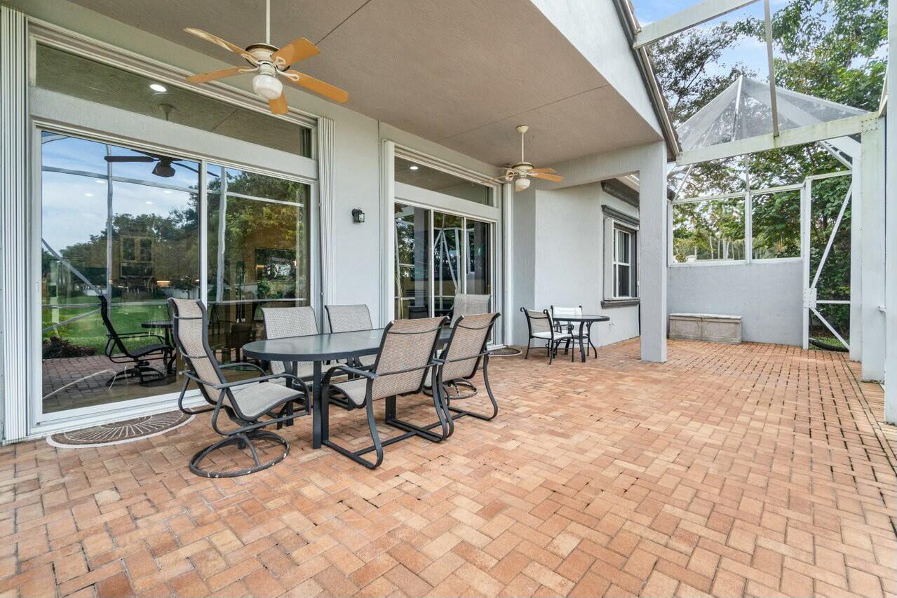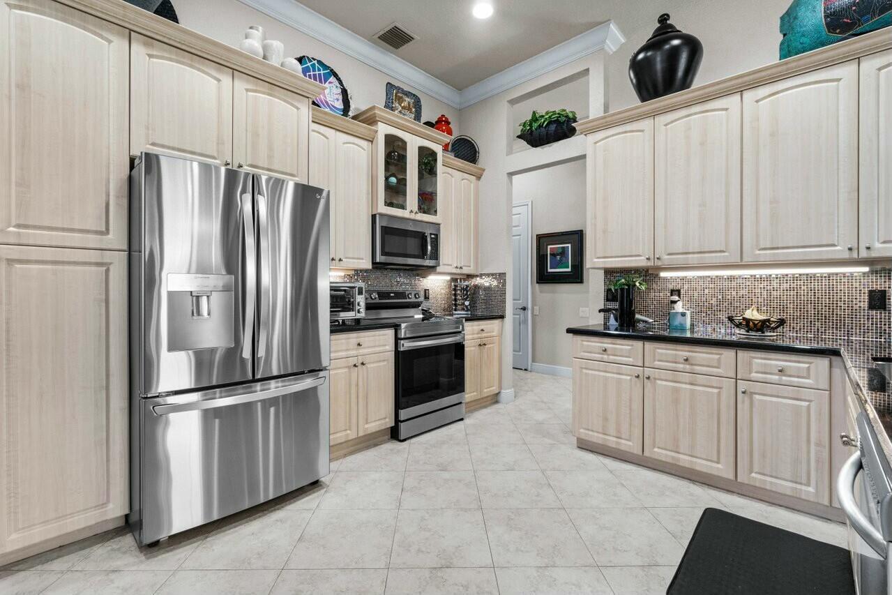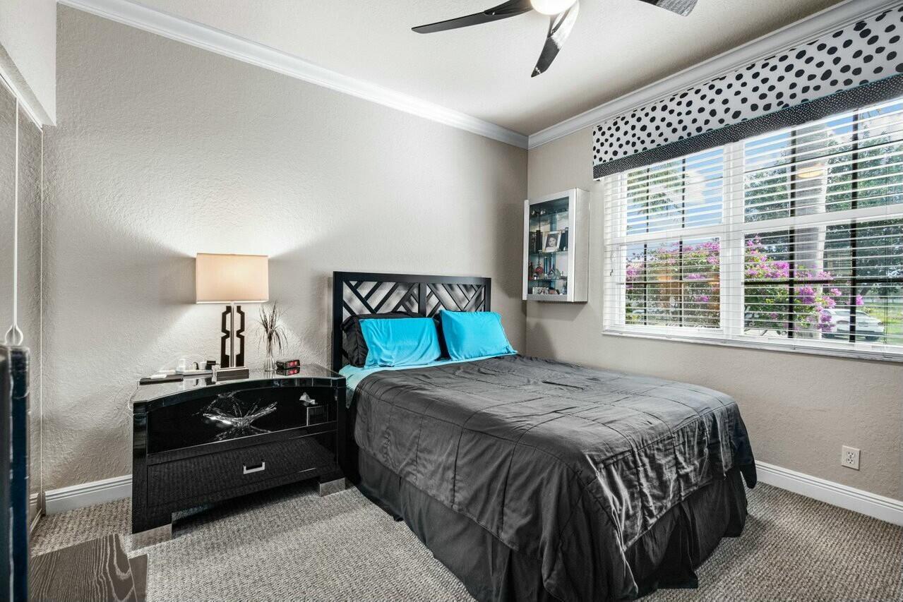 Welcome to your dream home in Bellaggio, an exclusive 55+ resort community. This stunning 2 bed+den, 2 bath lakefront home is a rare gem, nestled on a cul-de-sac with no neighbors on three sides. The elongated driveway leads to glass-etched doors opening into a roomy foyer. Tile on the diagonal thru all but the bedrooms. The spacious, open-concept floor plan features high ceilings, crown moldings, and trey ceiling in the primary. The large eat-in kitchen features stainless-steel appliances, half bevel-edge granite countertops and bar stool seating. The primary bedroom has two walk-in closets with custom shelving. The ensuite bathroom features dual vanity, jetted tub and separate shower. The guest bedroom has custom shelving and closets. Beautifully landscaped, this home is fully
