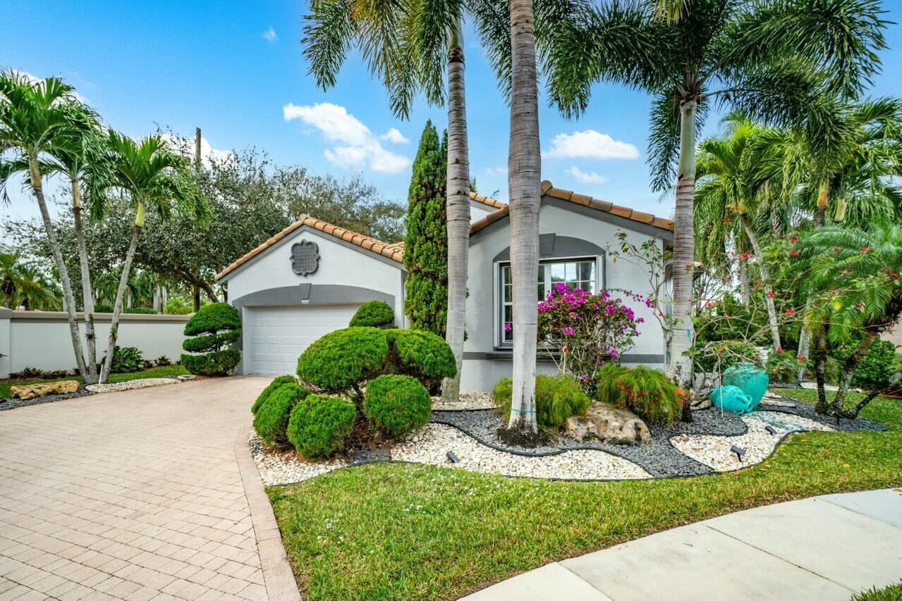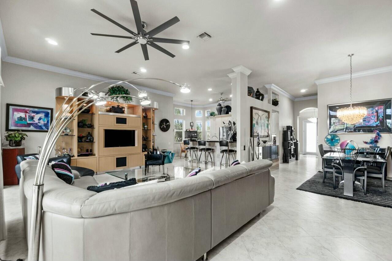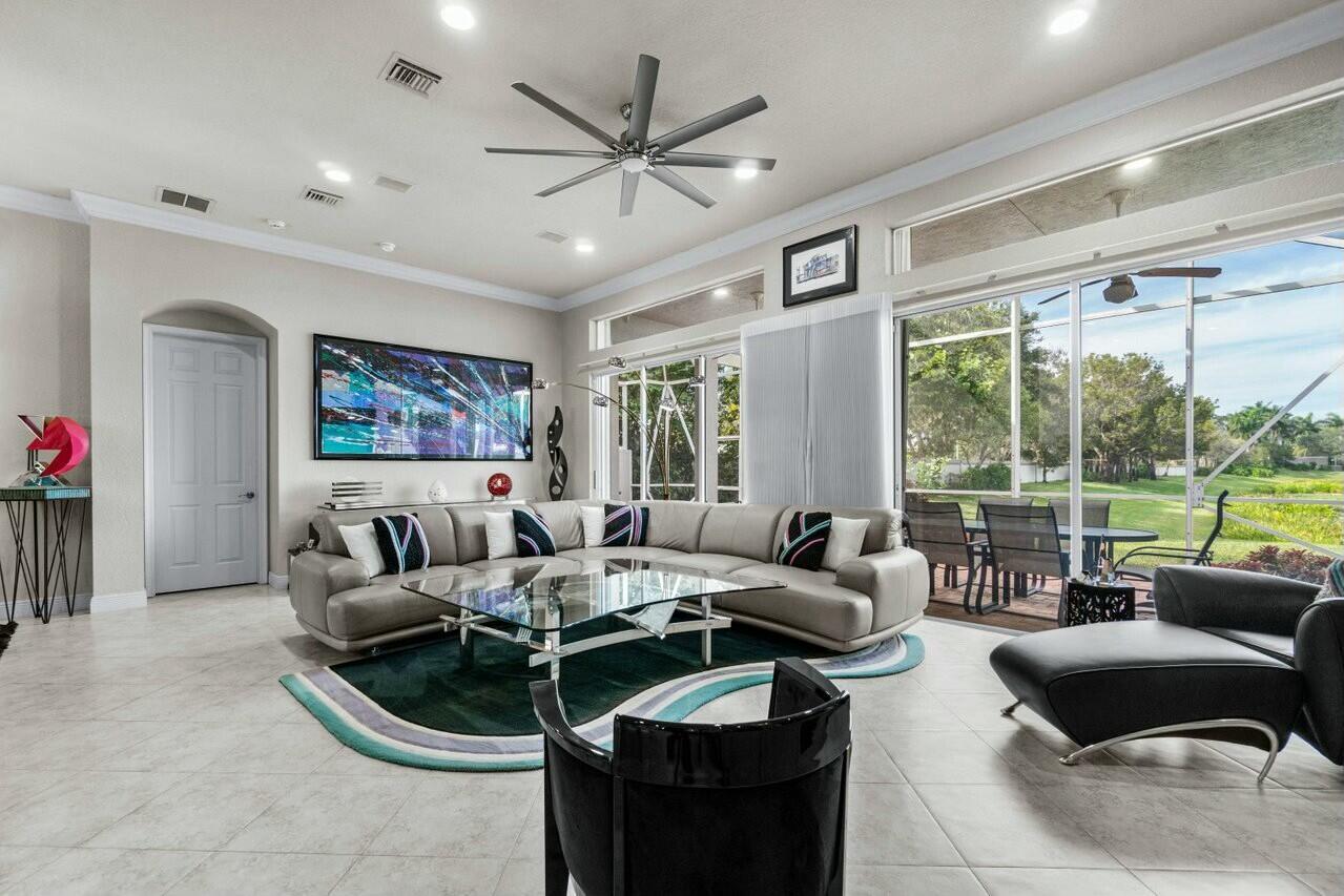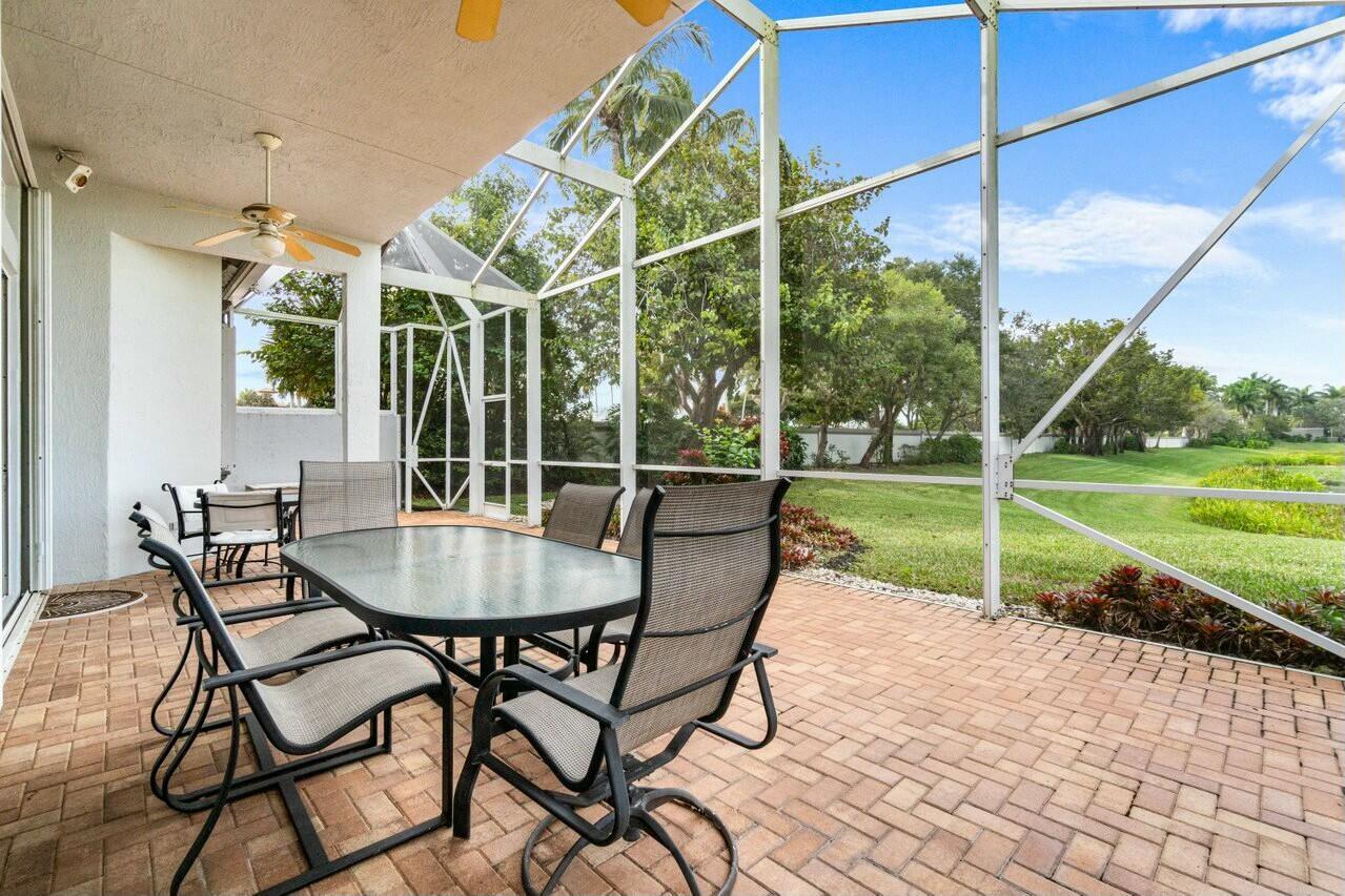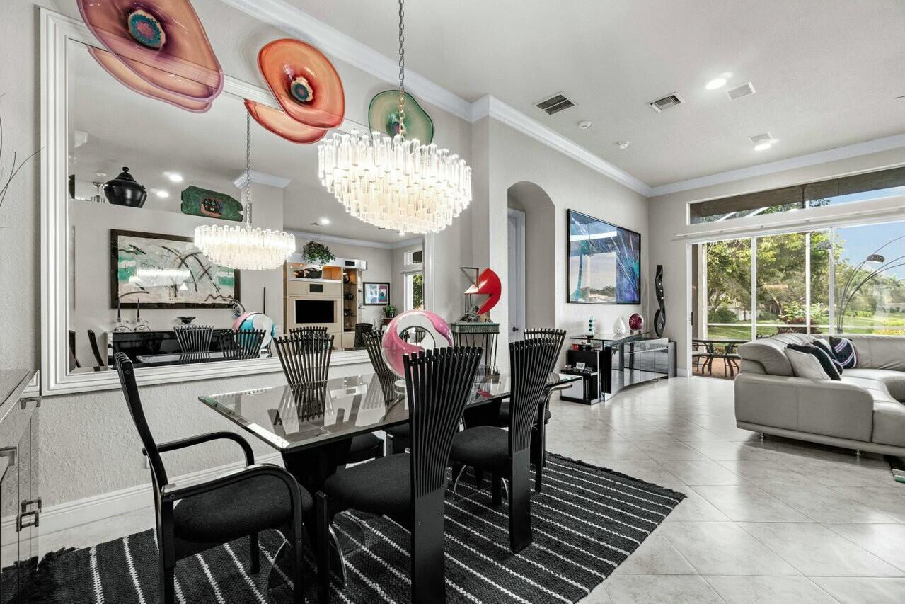 Welcome to your dream home in Bellaggio, an exclusive 55+ resort community. This stunning 2 bed+den, 2 bath lakefront home is a rare gem, nestled on a cul-de-sac with no neighbors on three sides. The elongated driveway leads to glass-etched doors opening into a roomy foyer. Tile on the diagonal thru all but the bedrooms. The spacious, open-concept floor plan features high ceilings, crown moldings, and trey ceiling in the primary. The large eat-in kitchen features stainless-steel appliances, half bevel-edge granite countertops and bar stool seating. The primary bedroom has two walk-in closets with custom shelving. The ensuite bathroom features dual vanity, jetted tub and separate shower. The guest bedroom has custom shelving and closets. Beautifully landscaped, this home is fully