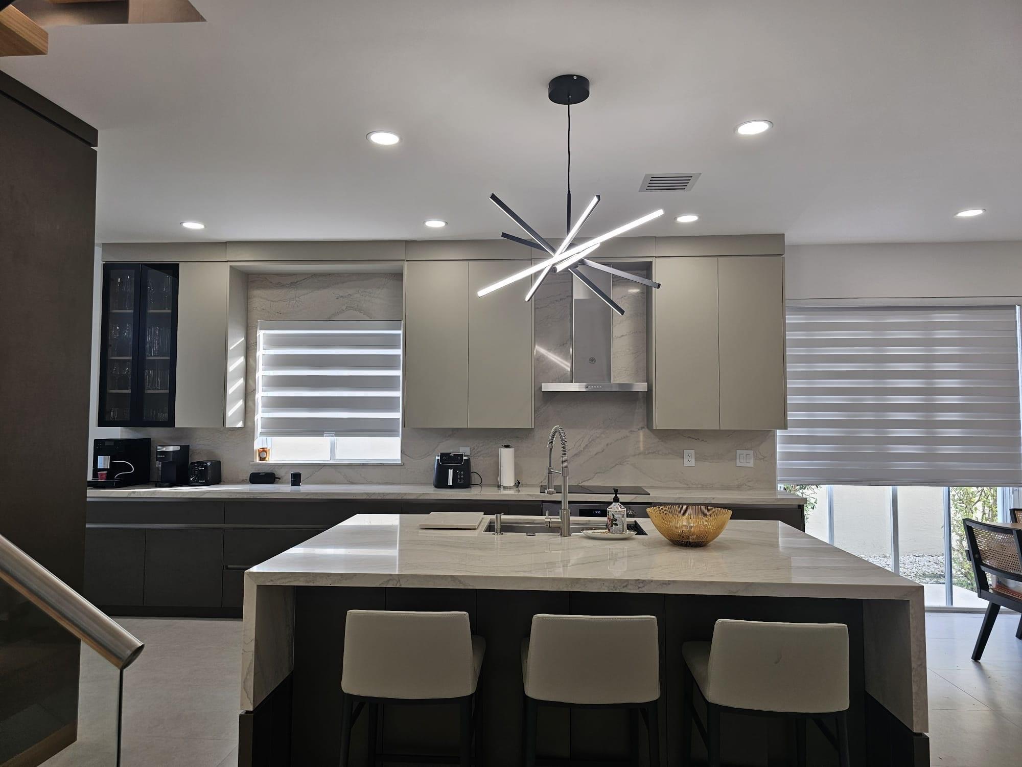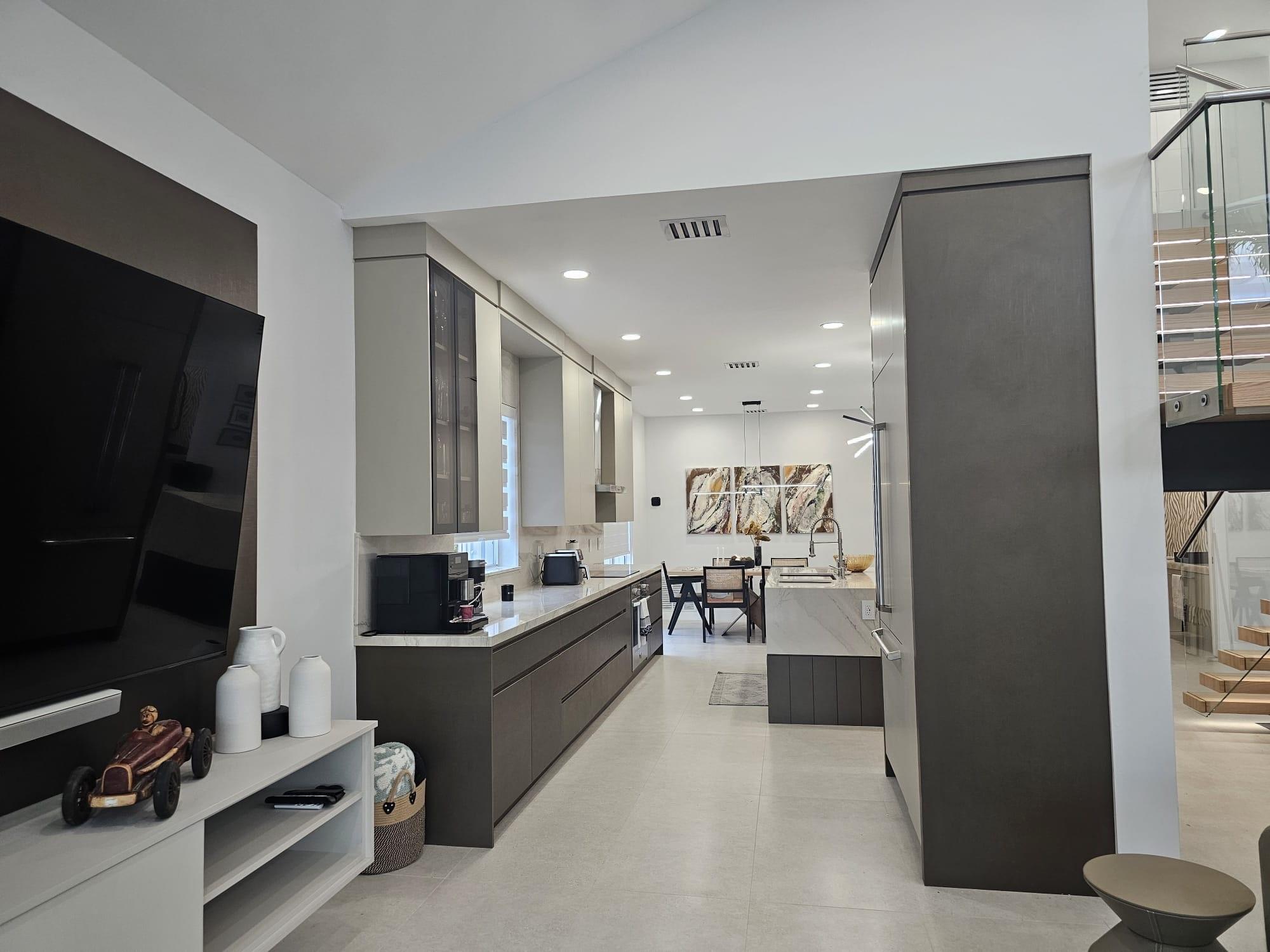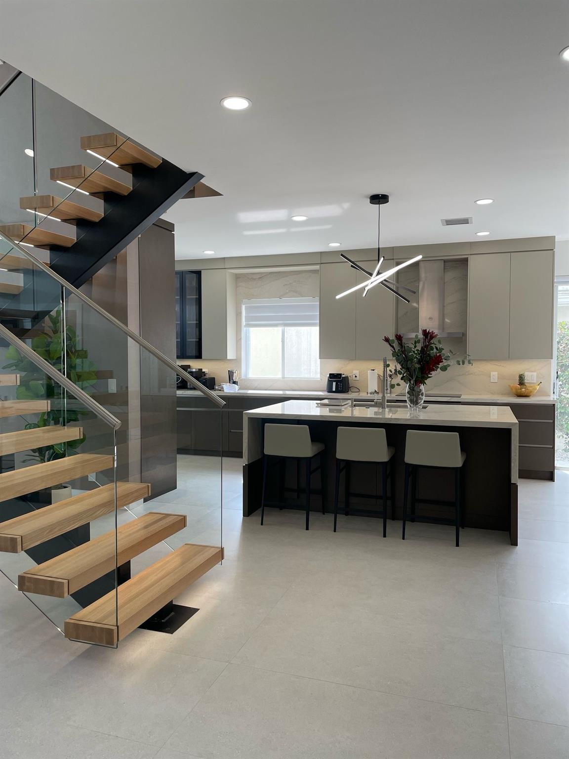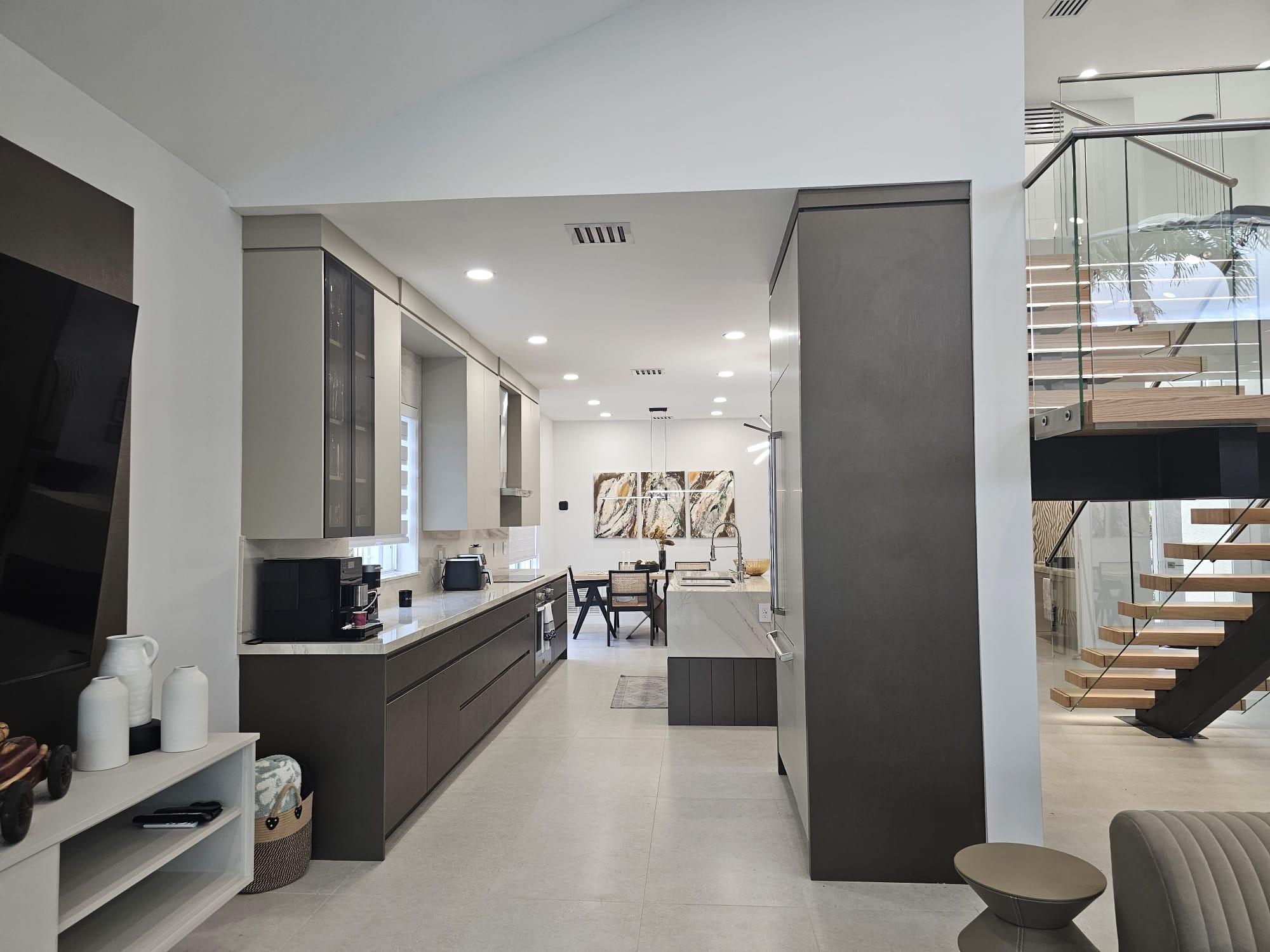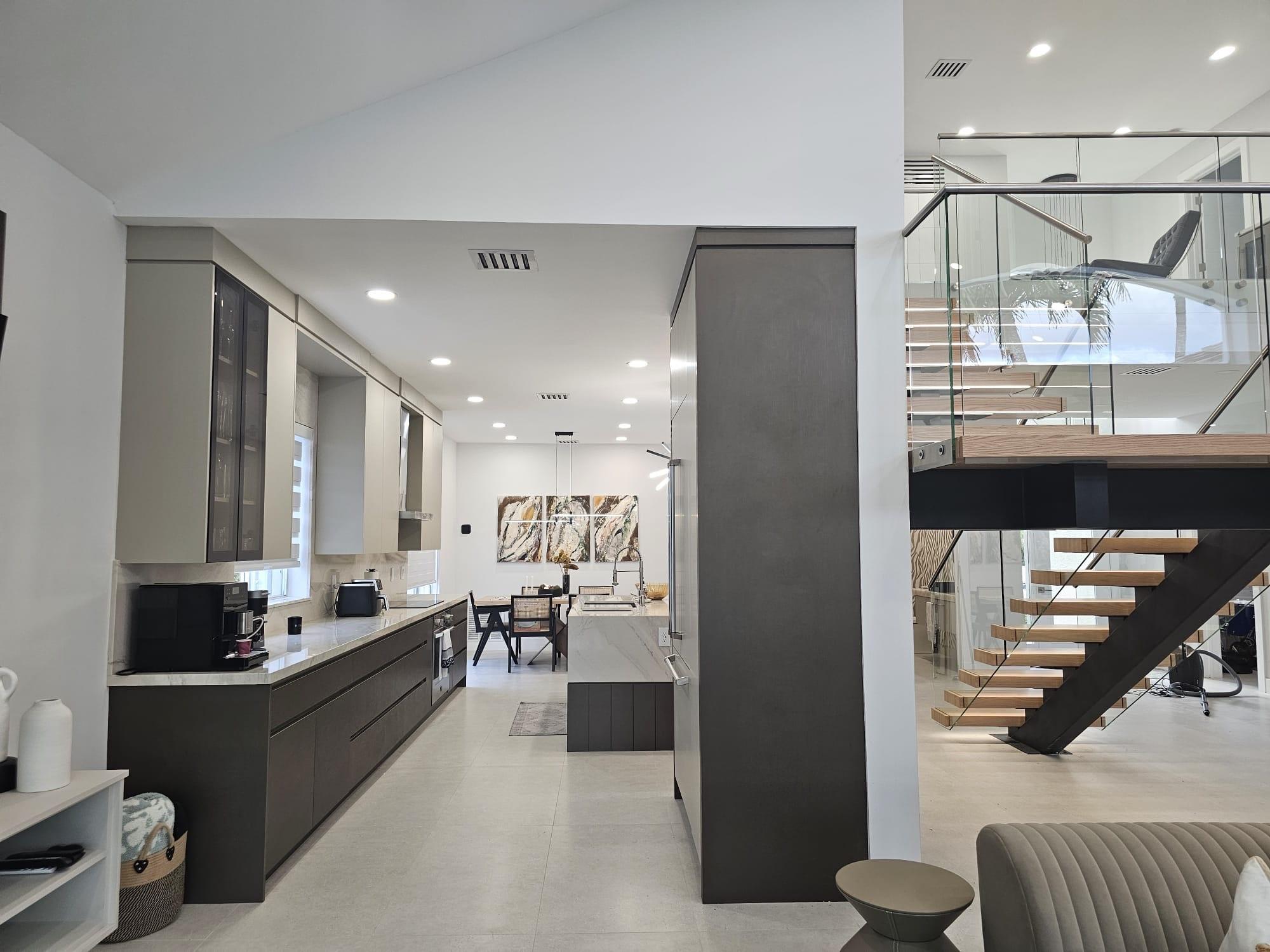 Experience modern luxury in this fully upgraded 4-bedroom, 4.5-bathroom home with a den, offering lake views & premium features throughout. The kitchen boasts Bertazzoni Italian appliances, quartz countertops, custom cabinetry & advanced lighting. The interior showcases large-format porcelain floors, recessed LED lighting, smart climate control & sleek finishes. The spacious living room includes a custom bar & a glass-railing staircase. Primary suite features custom closets, frameless showers & smart toilets, while guest bedrooms provide similar high-end finishes. The mezzanine includes a morning bar with a wine fridge. Additional amenities include hurricane shutters, an epoxy-finished garage, new exterior lighting, and updated plumbing fixtures. This home combines style & functionality.