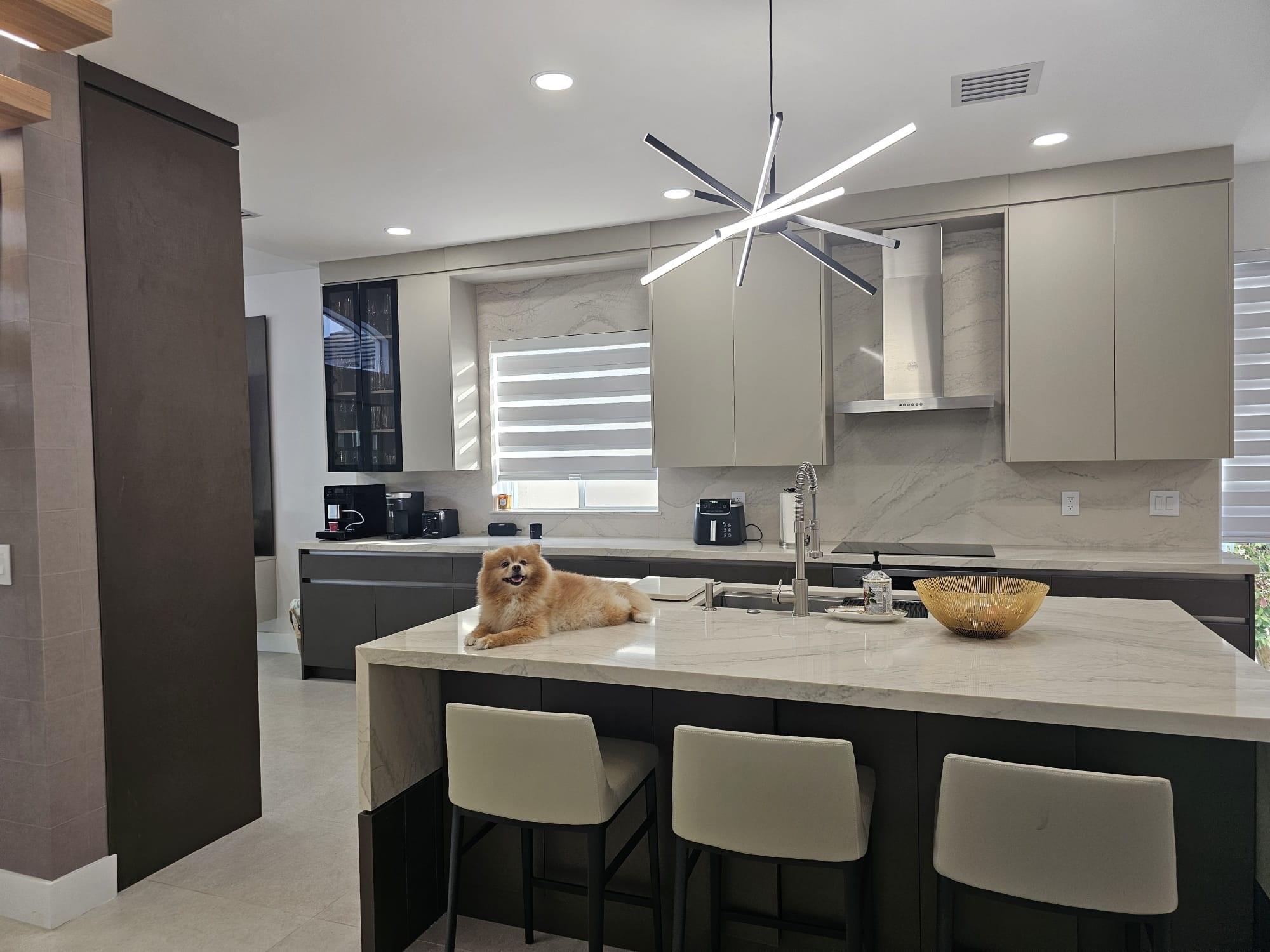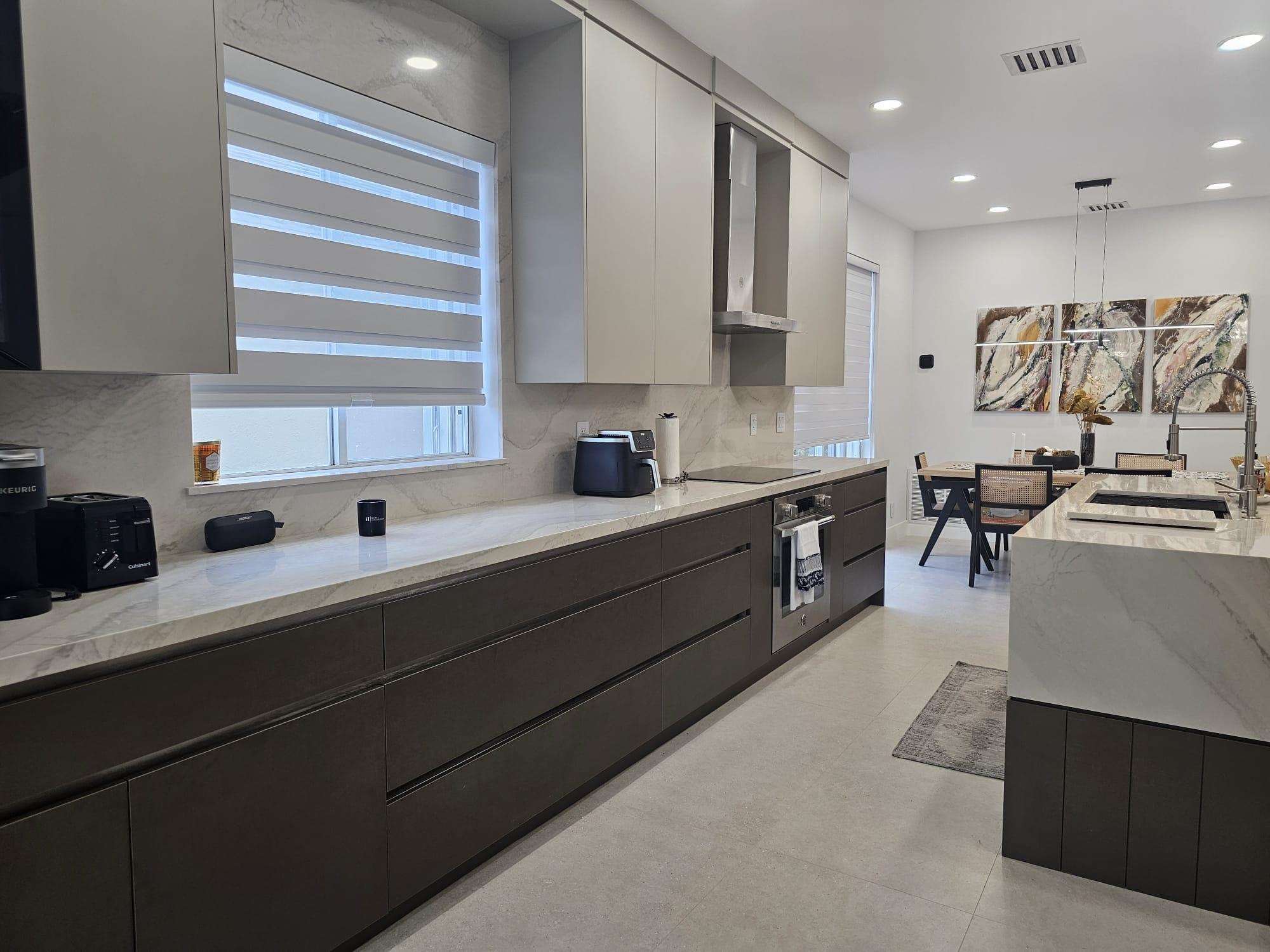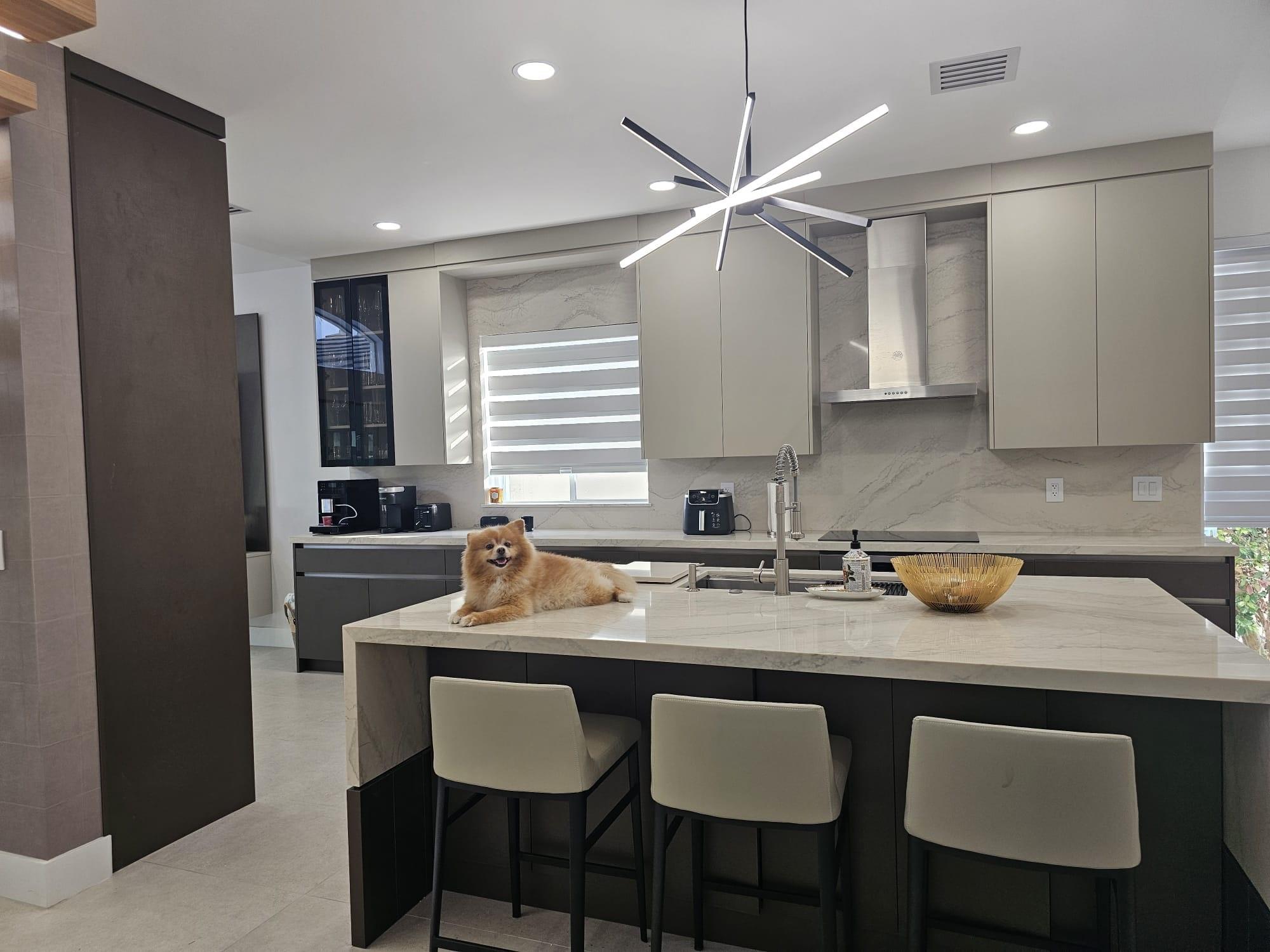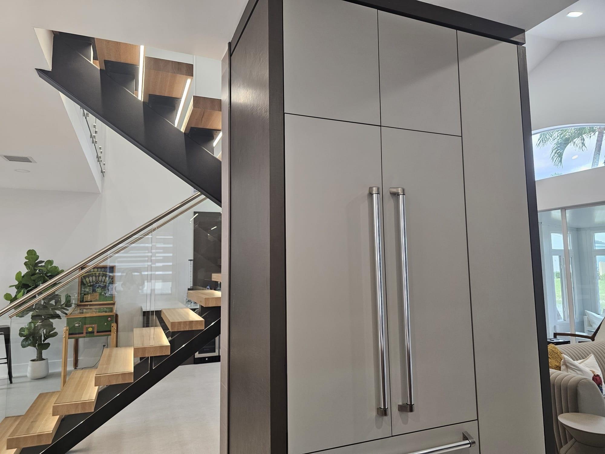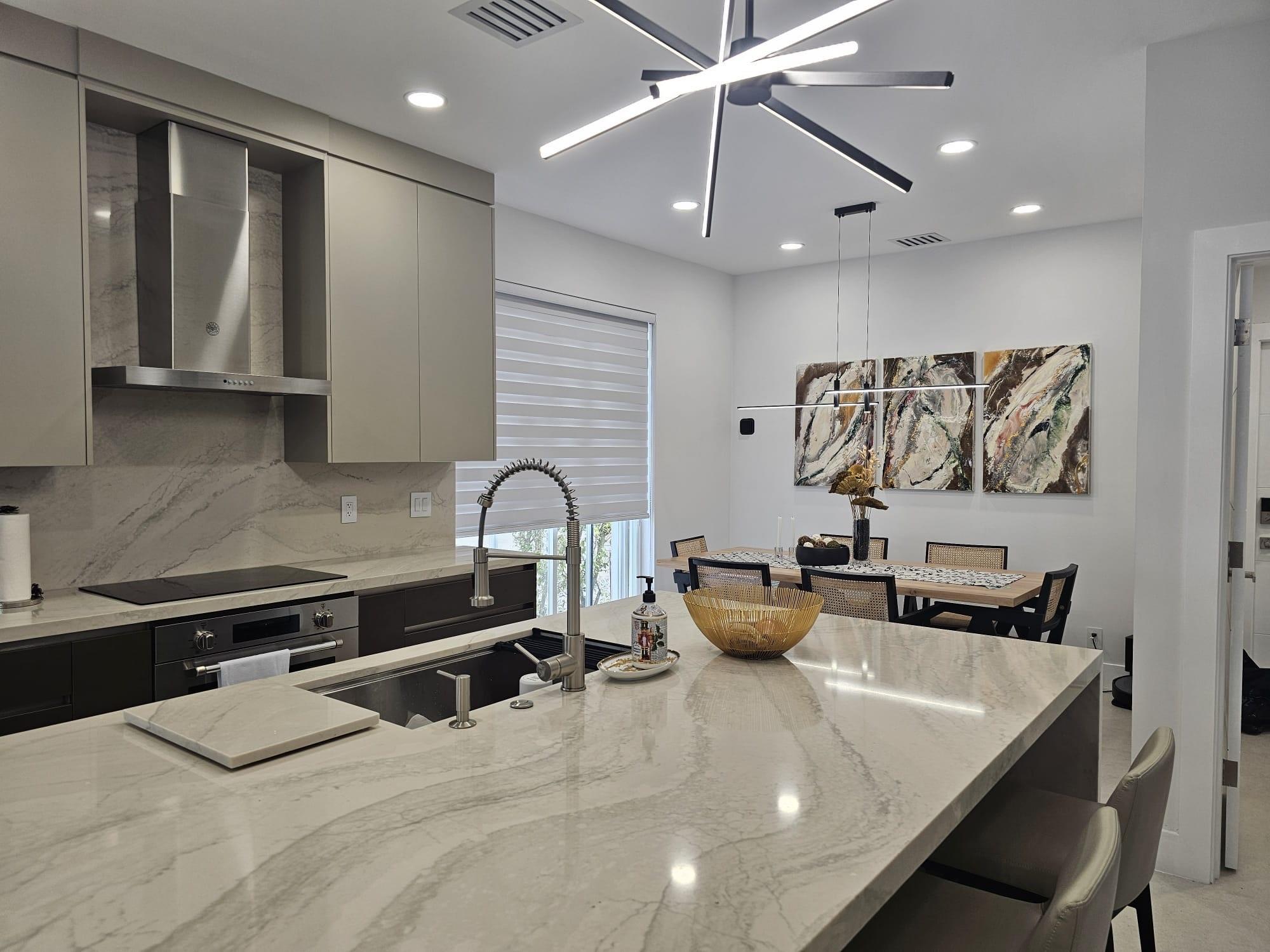Experience modern luxury in this fully upgraded 4-bedroom, 4.5-bathroom home with a den, offering lake views & premium features throughout. The kitchen boasts Bertazzoni Italian appliances, quartz countertops, custom cabinetry & advanced lighting. The interior showcases large-format porcelain floors, recessed LED lighting, smart climate control & sleek finishes. The spacious living room includes a custom bar & a glass-railing staircase. Primary suite features custom closets, frameless showers & smart toilets, while guest bedrooms provide similar high-end finishes. The mezzanine includes a morning bar with a wine fridge. Additional amenities include hurricane shutters, an epoxy-finished garage, new exterior lighting, and updated plumbing fixtures. This home combines style & functionality.