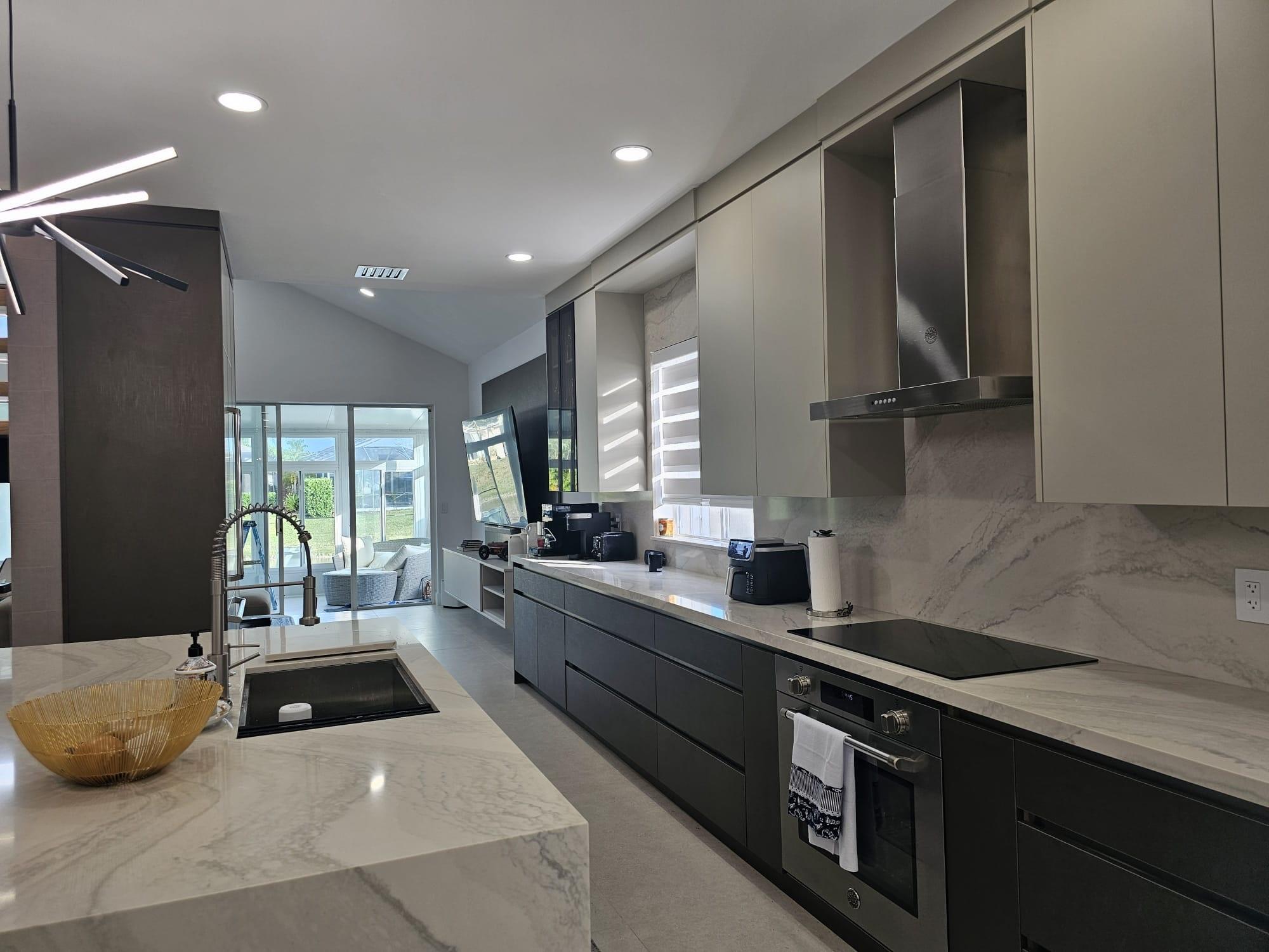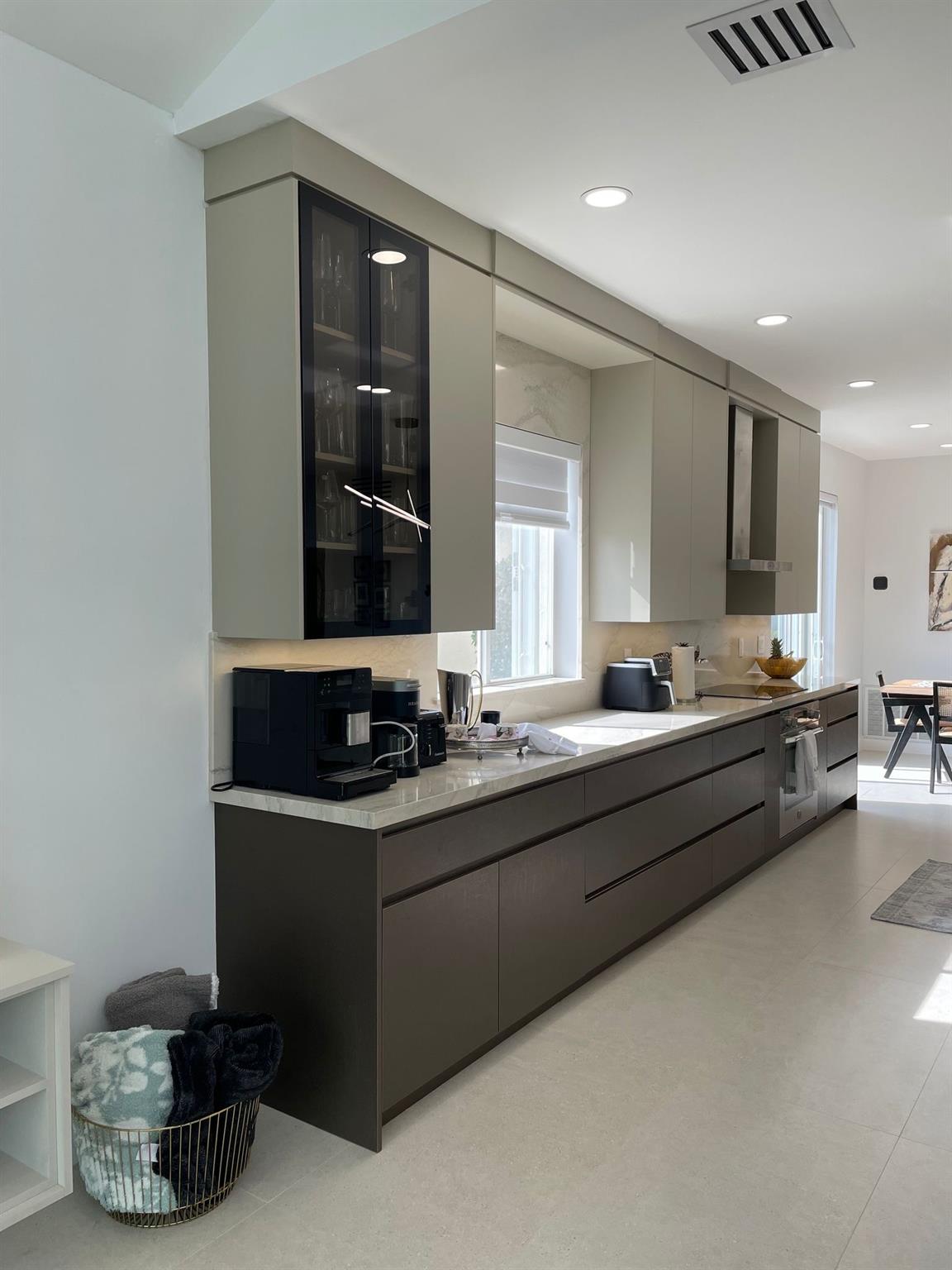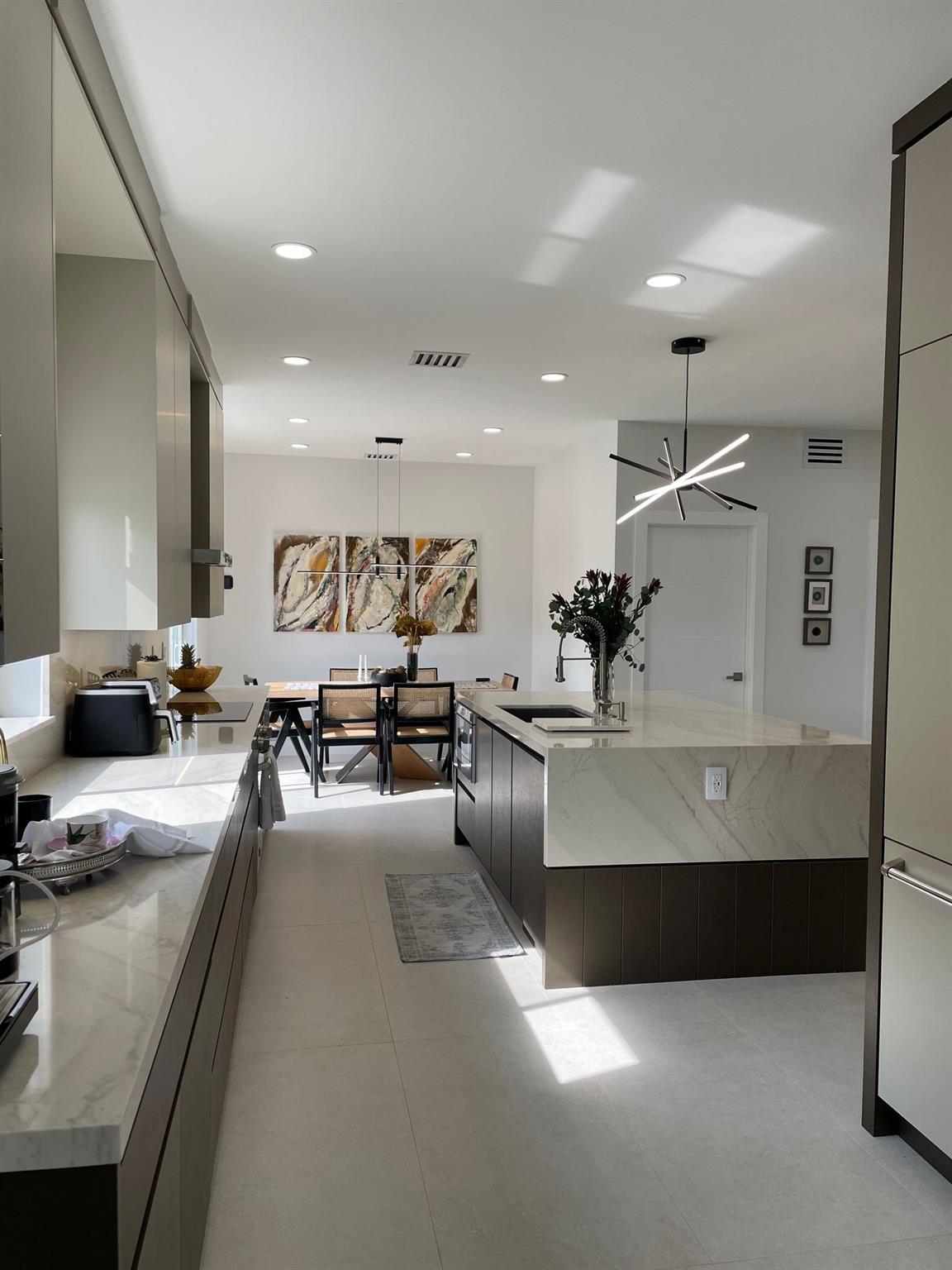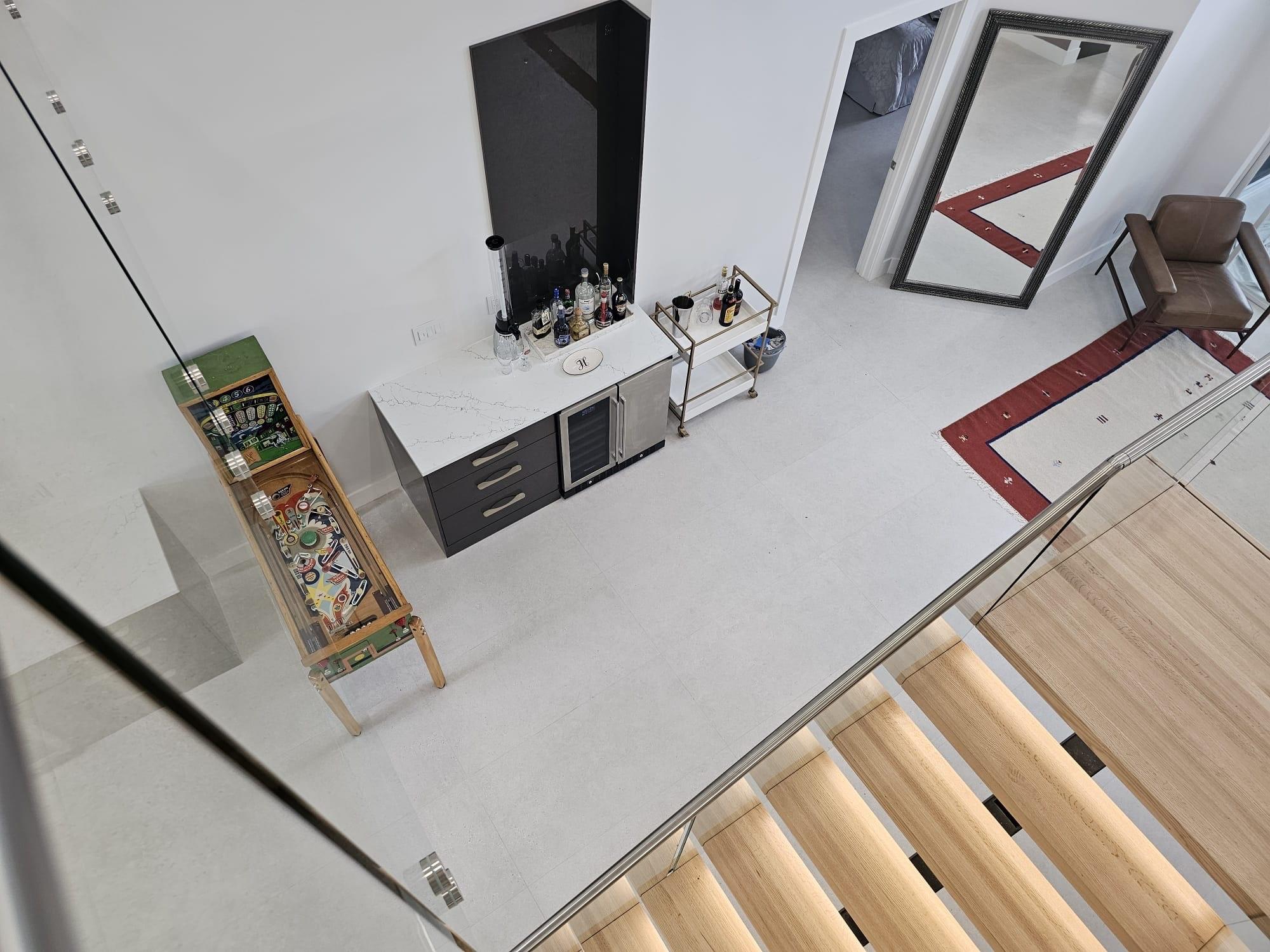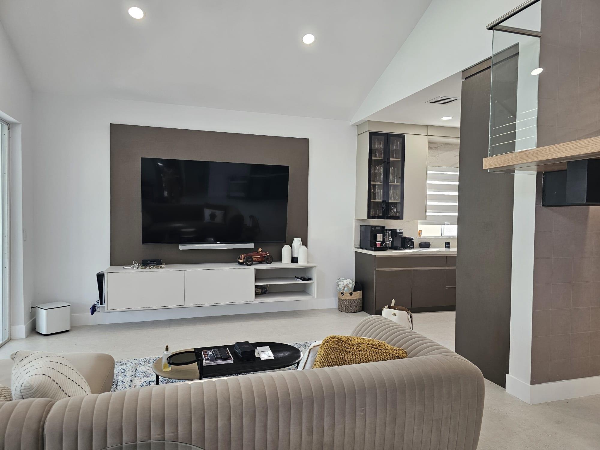 Experience modern luxury in this fully upgraded 4-bedroom, 4.5-bathroom home with a den, offering lake views & premium features throughout. The kitchen boasts Bertazzoni Italian appliances, quartz countertops, custom cabinetry & advanced lighting. The interior showcases large-format porcelain floors, recessed LED lighting, smart climate control & sleek finishes. The spacious living room includes a custom bar & a glass-railing staircase. Primary suite features custom closets, frameless showers & smart toilets, while guest bedrooms provide similar high-end finishes. The mezzanine includes a morning bar with a wine fridge. Additional amenities include hurricane shutters, an epoxy-finished garage, new exterior lighting, and updated plumbing fixtures. This home combines style & functionality.