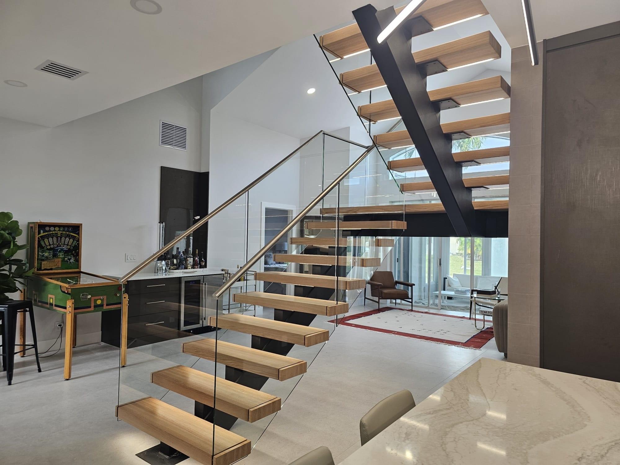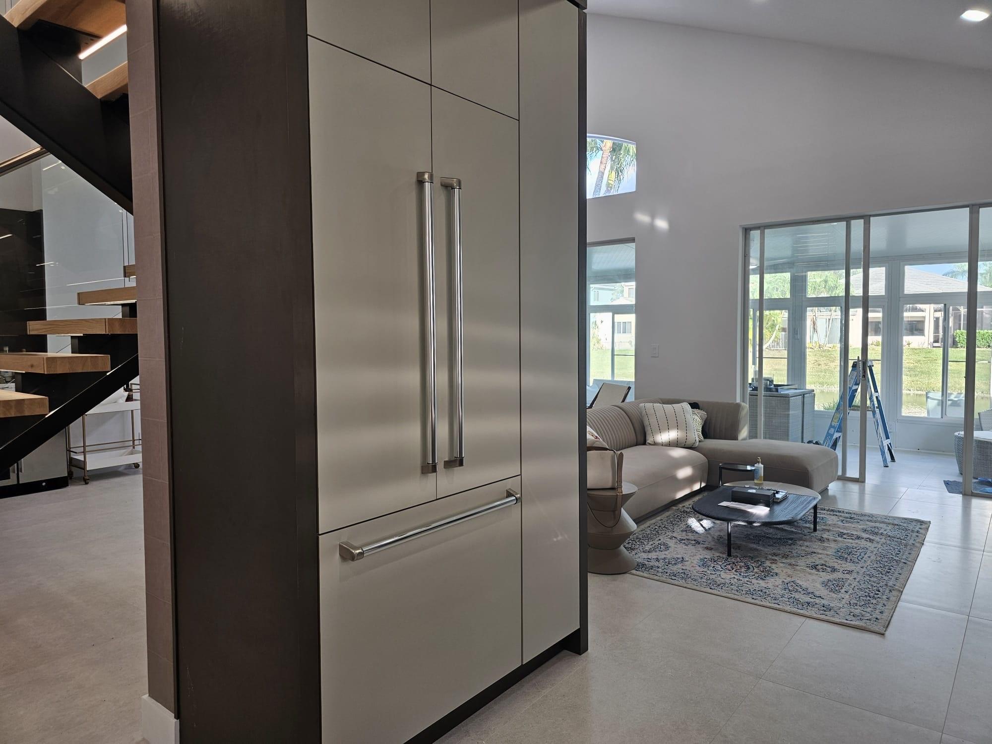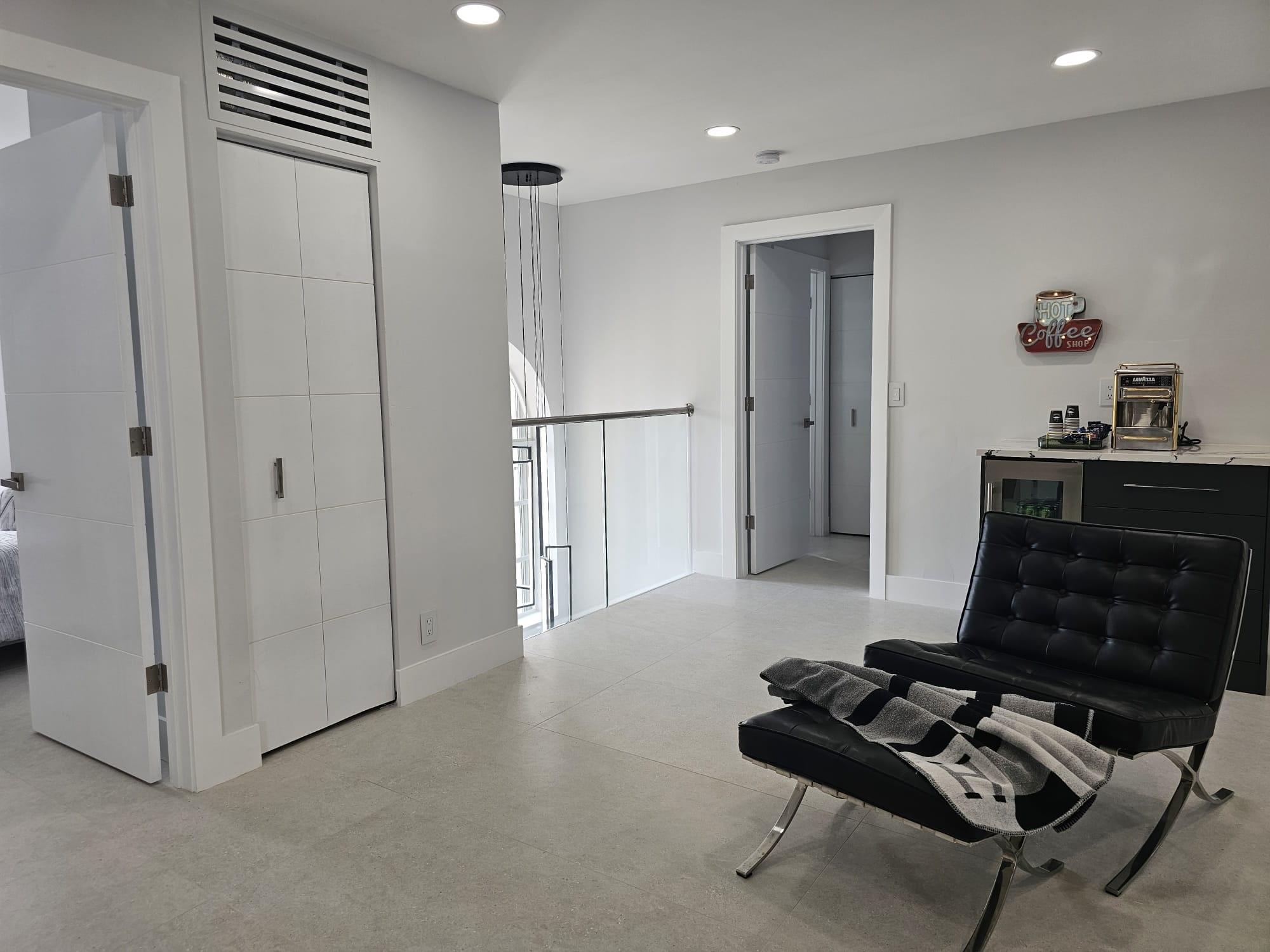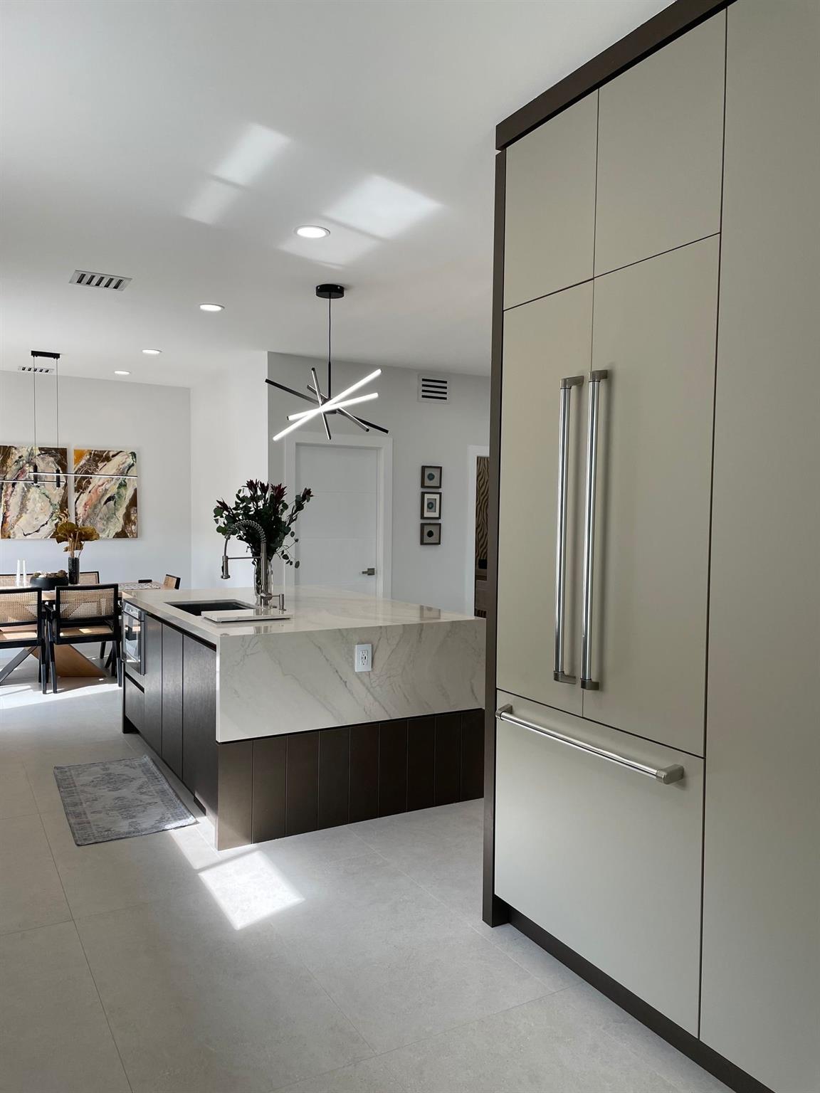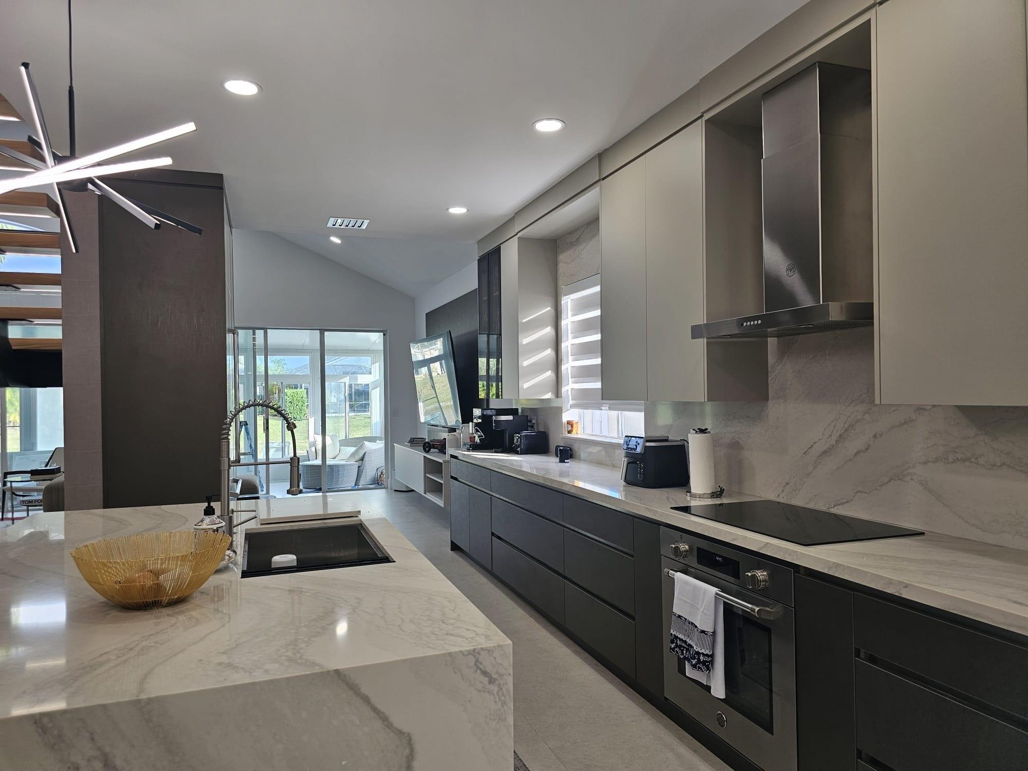 Experience modern luxury in this fully upgraded 4-bedroom, 4.5-bathroom home with a den, offering lake views & premium features throughout. The kitchen boasts Bertazzoni Italian appliances, quartz countertops, custom cabinetry & advanced lighting. The interior showcases large-format porcelain floors, recessed LED lighting, smart climate control & sleek finishes. The spacious living room includes a custom bar & a glass-railing staircase. Primary suite features custom closets, frameless showers & smart toilets, while guest bedrooms provide similar high-end finishes. The mezzanine includes a morning bar with a wine fridge. Additional amenities include hurricane shutters, an epoxy-finished garage, new exterior lighting, and updated plumbing fixtures. This home combines style & functionality.