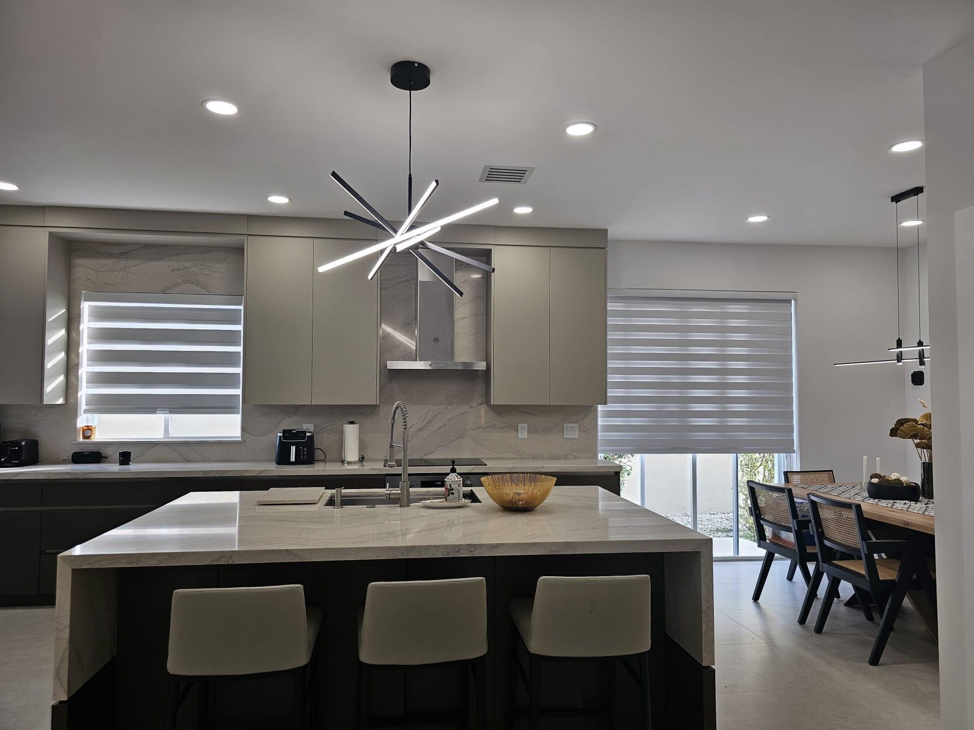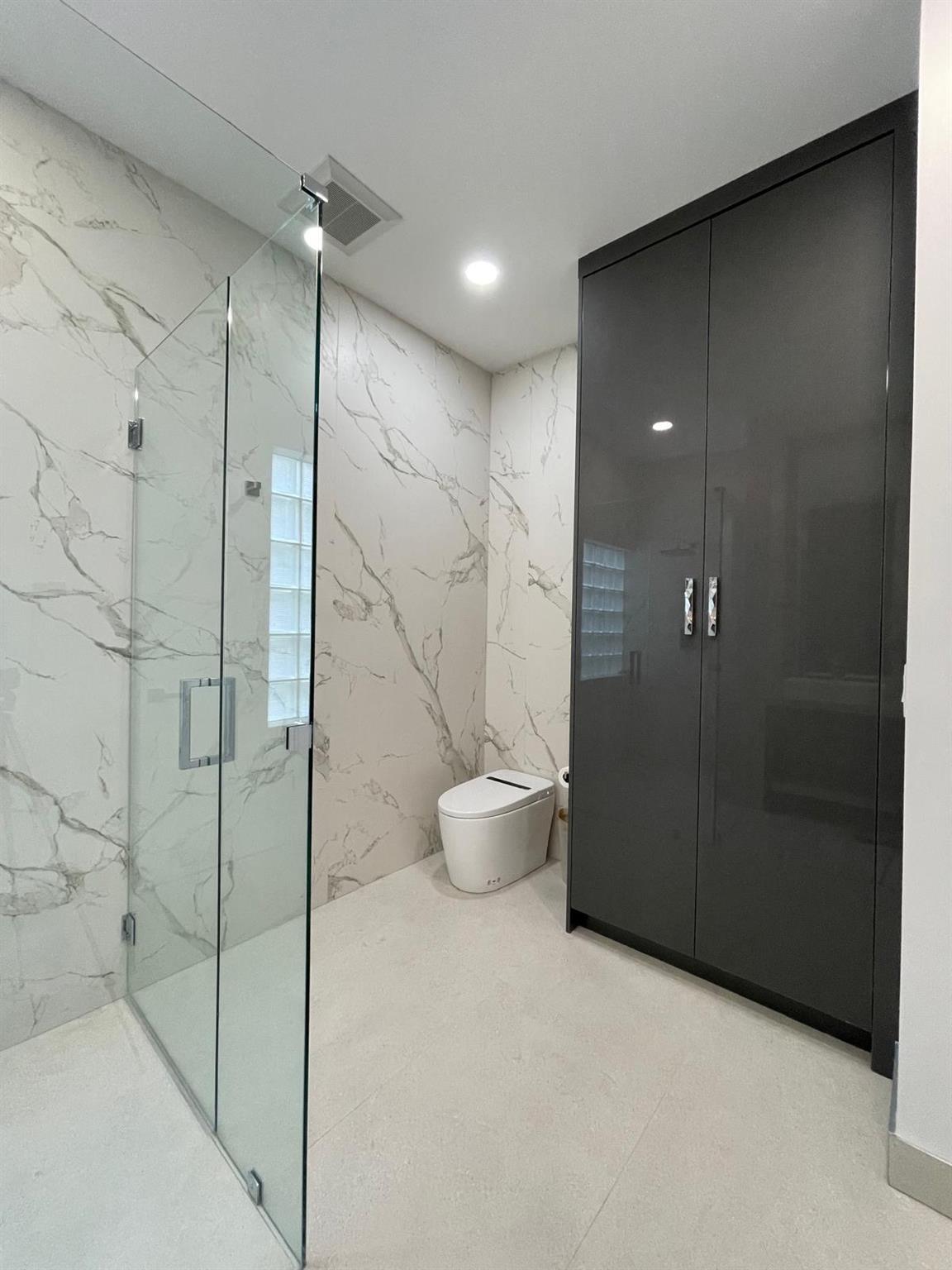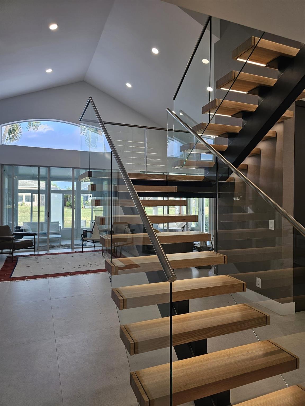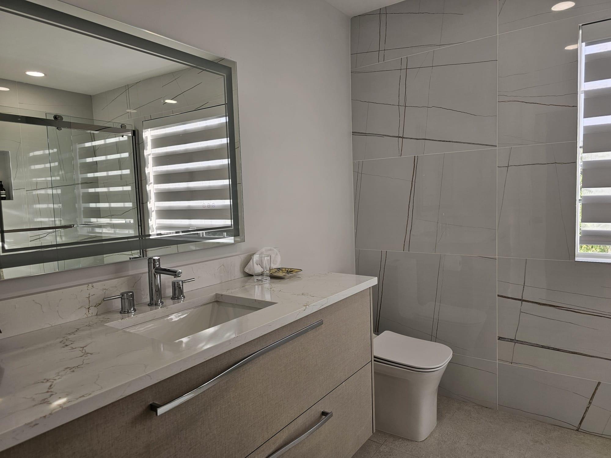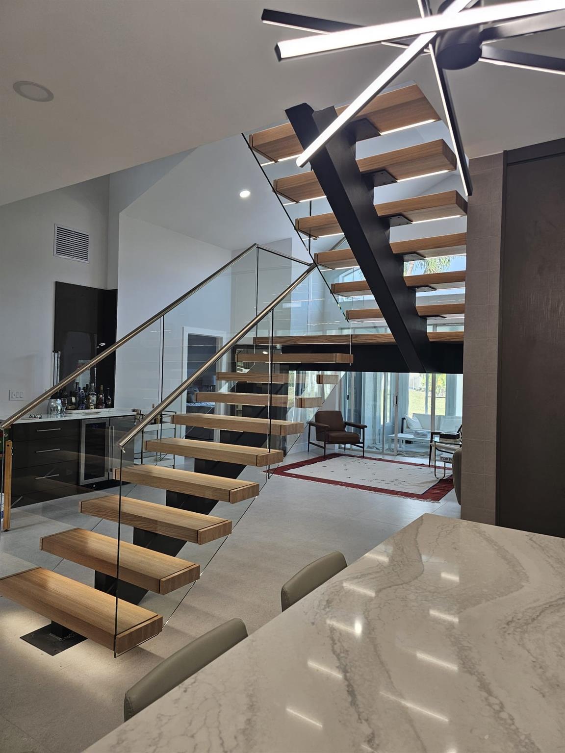 Experience modern luxury in this fully upgraded 4-bedroom, 4.5-bathroom home with a den, offering lake views & premium features throughout. The kitchen boasts Bertazzoni Italian appliances, quartz countertops, custom cabinetry & advanced lighting. The interior showcases large-format porcelain floors, recessed LED lighting, smart climate control & sleek finishes. The spacious living room includes a custom bar & a glass-railing staircase. Primary suite features custom closets, frameless showers & smart toilets, while guest bedrooms provide similar high-end finishes. The mezzanine includes a morning bar with a wine fridge. Additional amenities include hurricane shutters, an epoxy-finished garage, new exterior lighting, and updated plumbing fixtures. This home combines style & functionality.